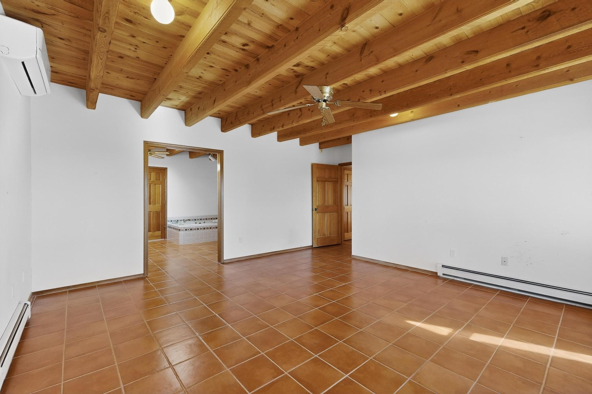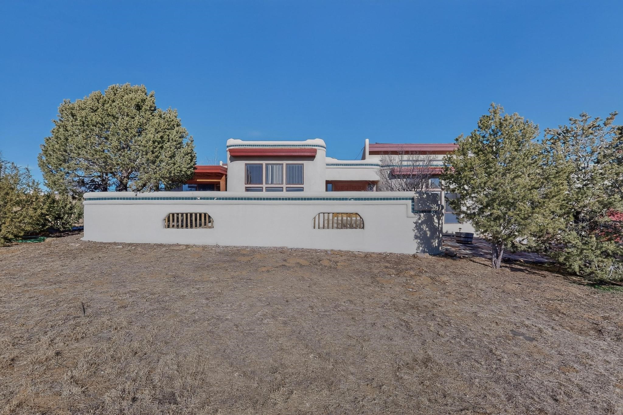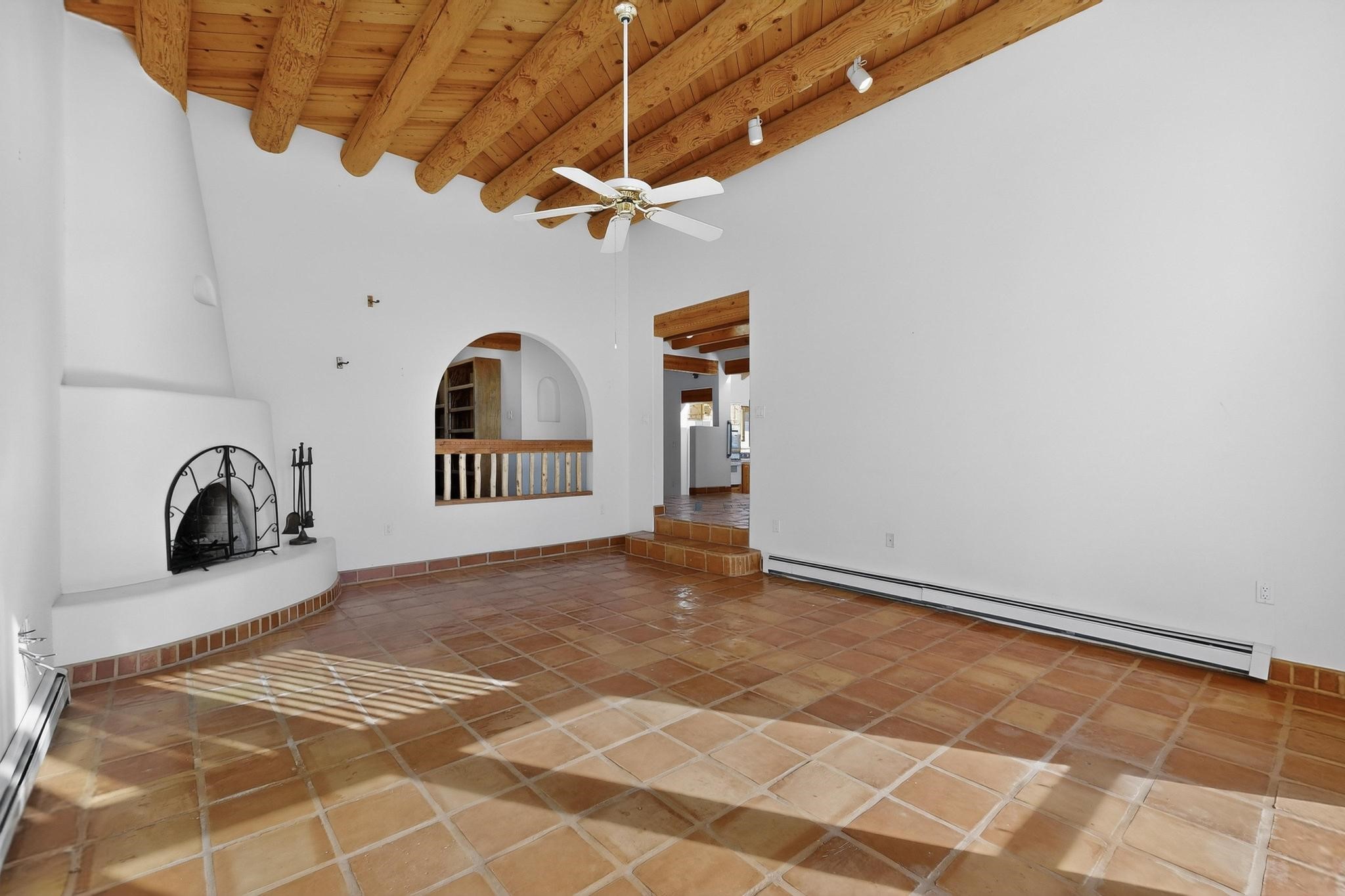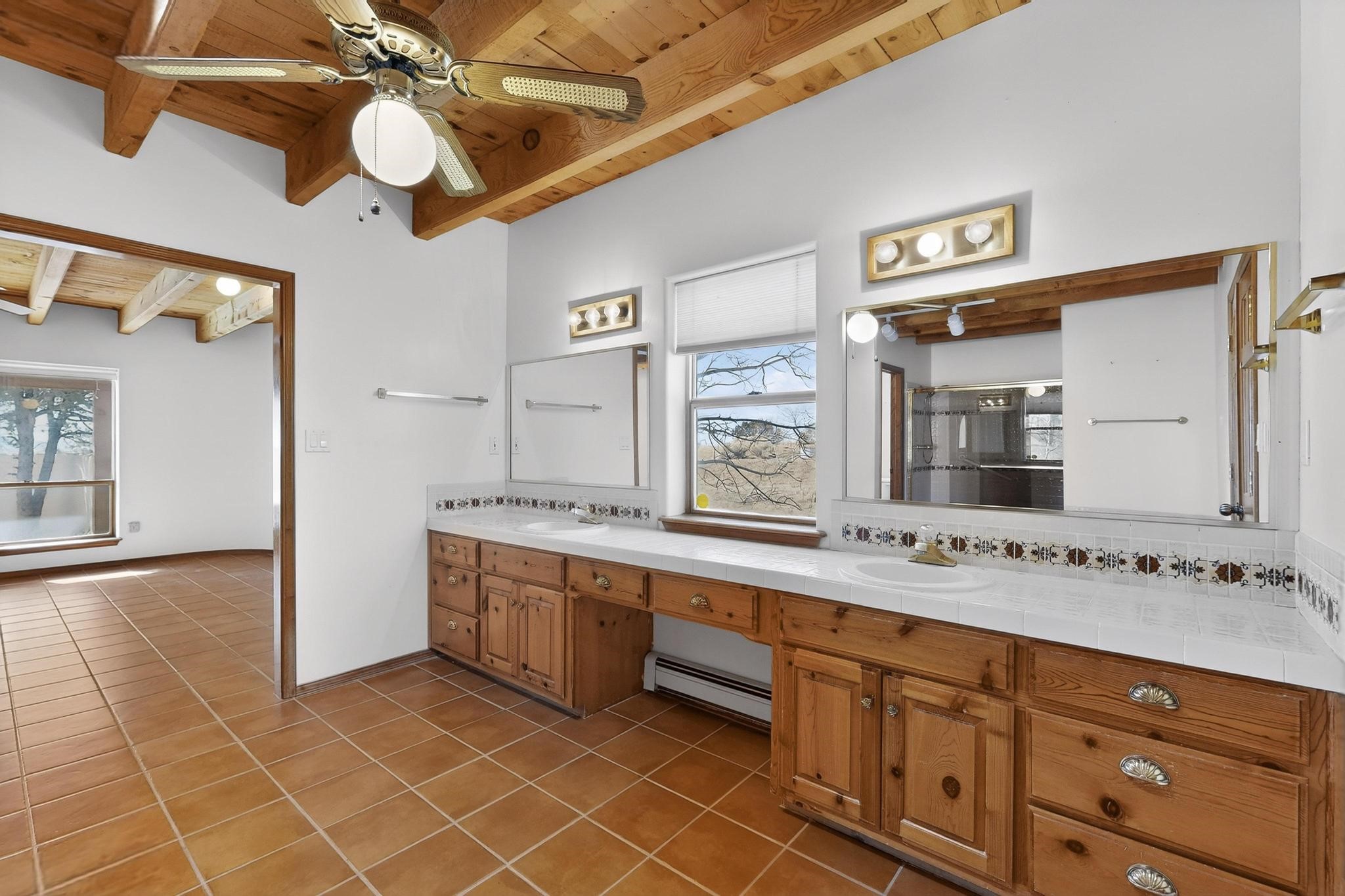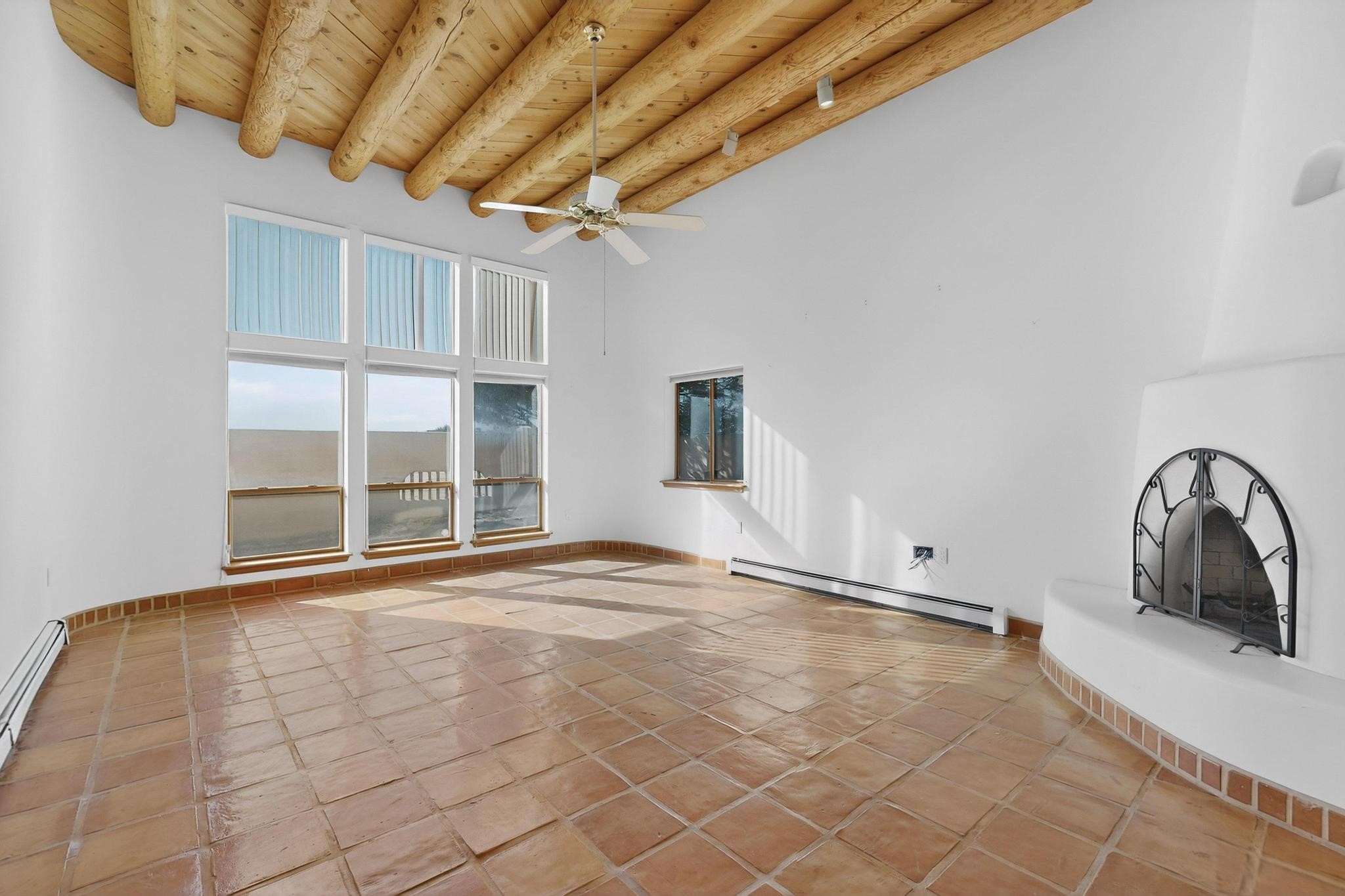 Remarkable opportunity to obtain a 3963sf multi generational 4 bedroom home in Eldorado. Born with a passive solar design and high ceilings with deep southern glazing this home is full of sunlight. Saltillo tile floors, beam and viga ceilings, high clerestories, nichos, 2 kiva fireplaces, mini splits and a brand new roof, this contemporary pueblo home is amazing. A spacious country style kitchen with large breakfast bar and breakfast nook will accommodate plenty of family entertainment. There is an adjoining family room, sunken living room and a formal dining room/den off the kitchen. the owners suite features a spacious bathroom and walk in closet, plus there are 3 guest bedrooms with a 3/4 and full bath. The laundry includes a tub and plenty of extra storage. On going through the 3 bay garage you can enter the studio/guest wing which includes a 2 large rooms, bath and a separate 4th garage. A walled private flagstoned courtyard and portal in front and to the rear offer plenty of outside enjoyment. The paved driveway also includes plenty of guest parking. This home is within easy reach of the Eldorado Community Center amenities, local shopping, school, library and senior center, and only minutes into Santa Fe.