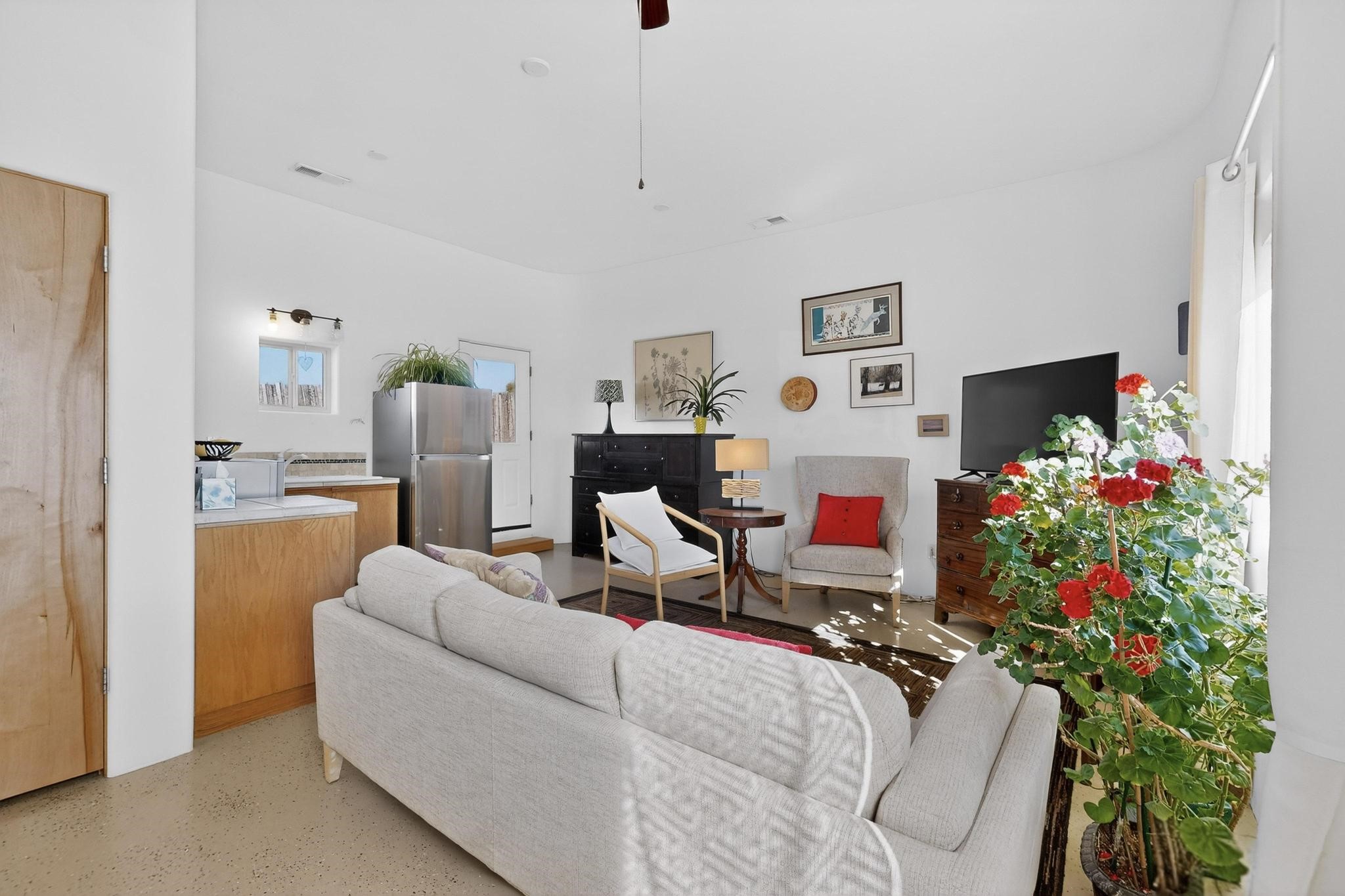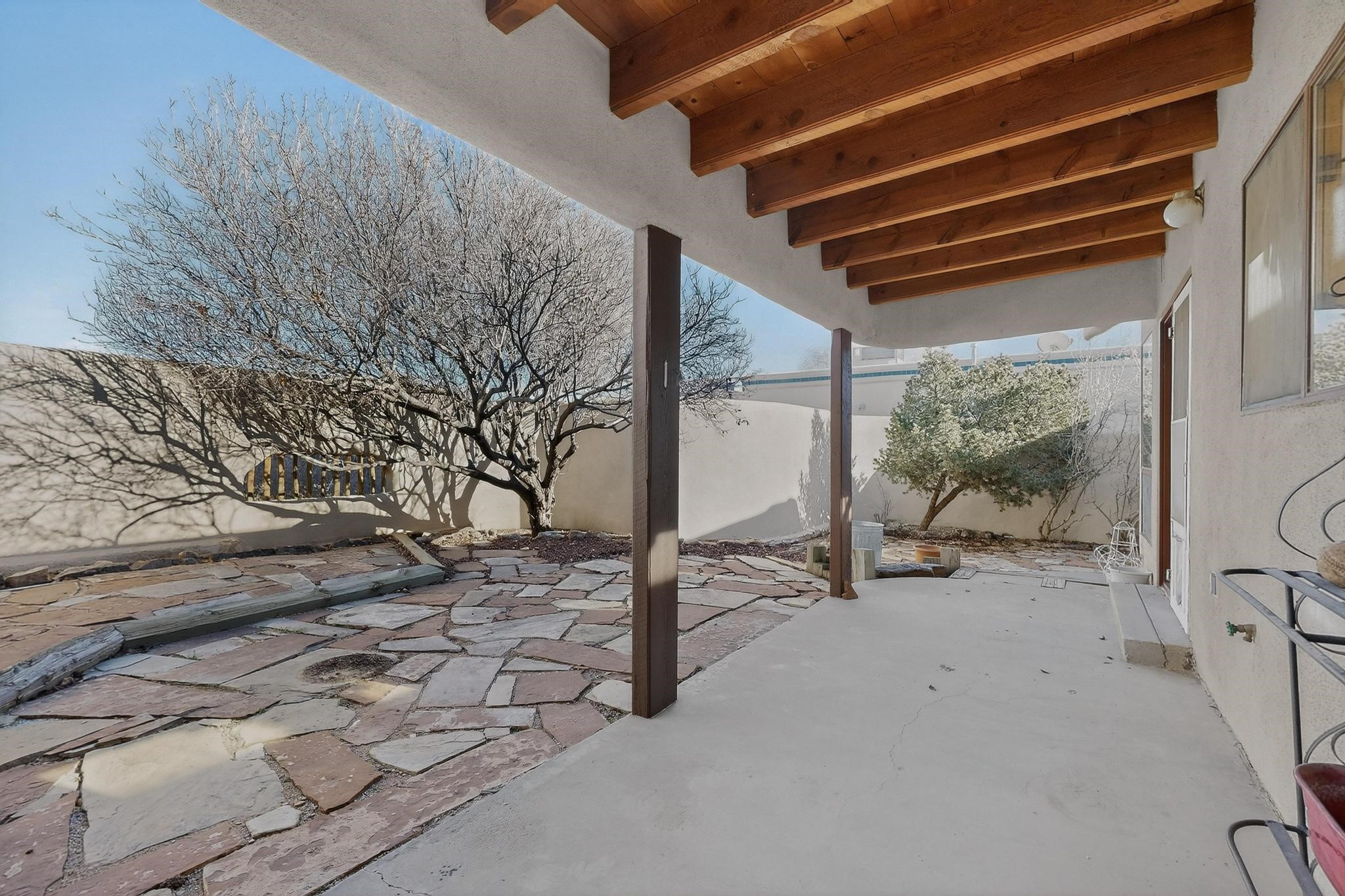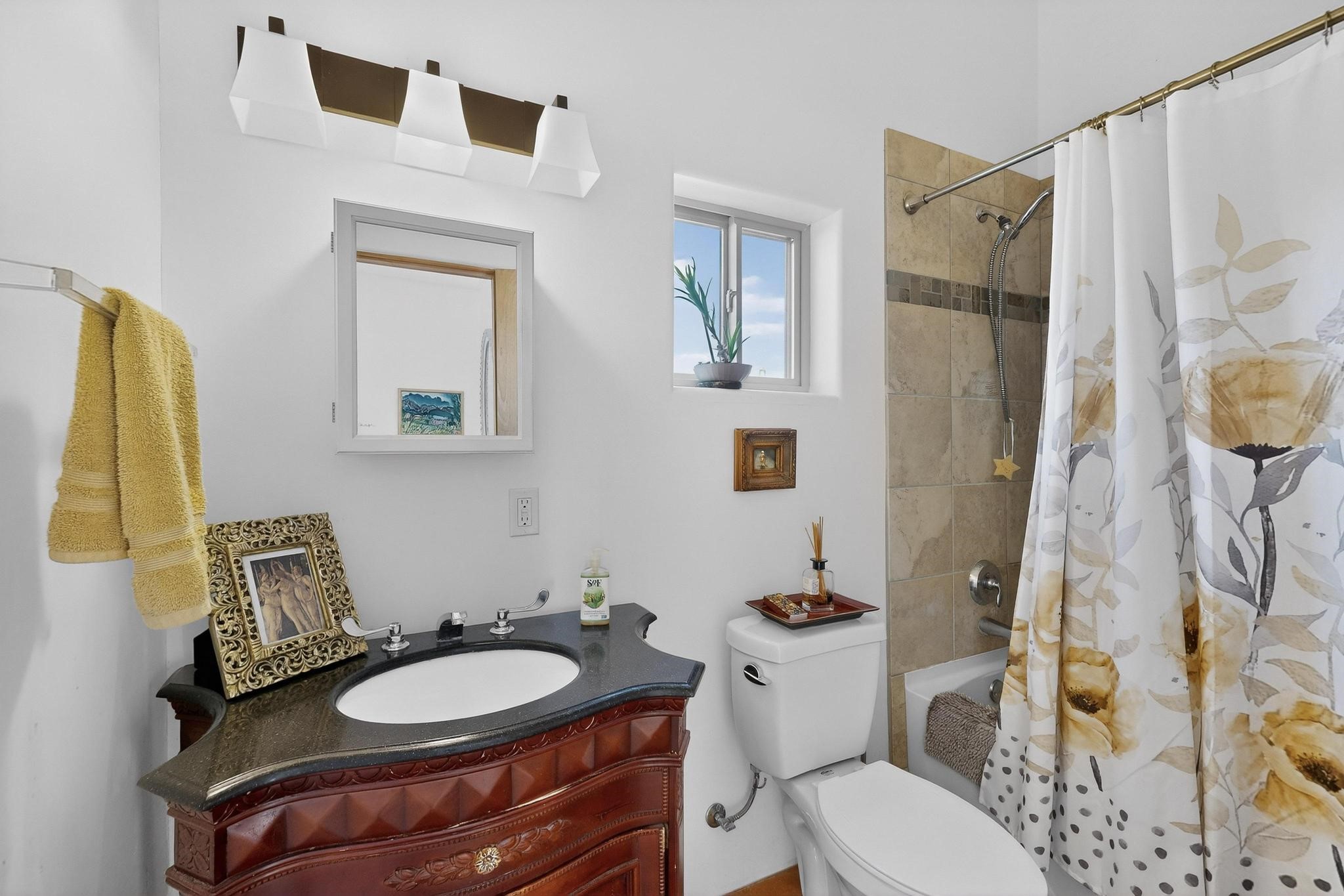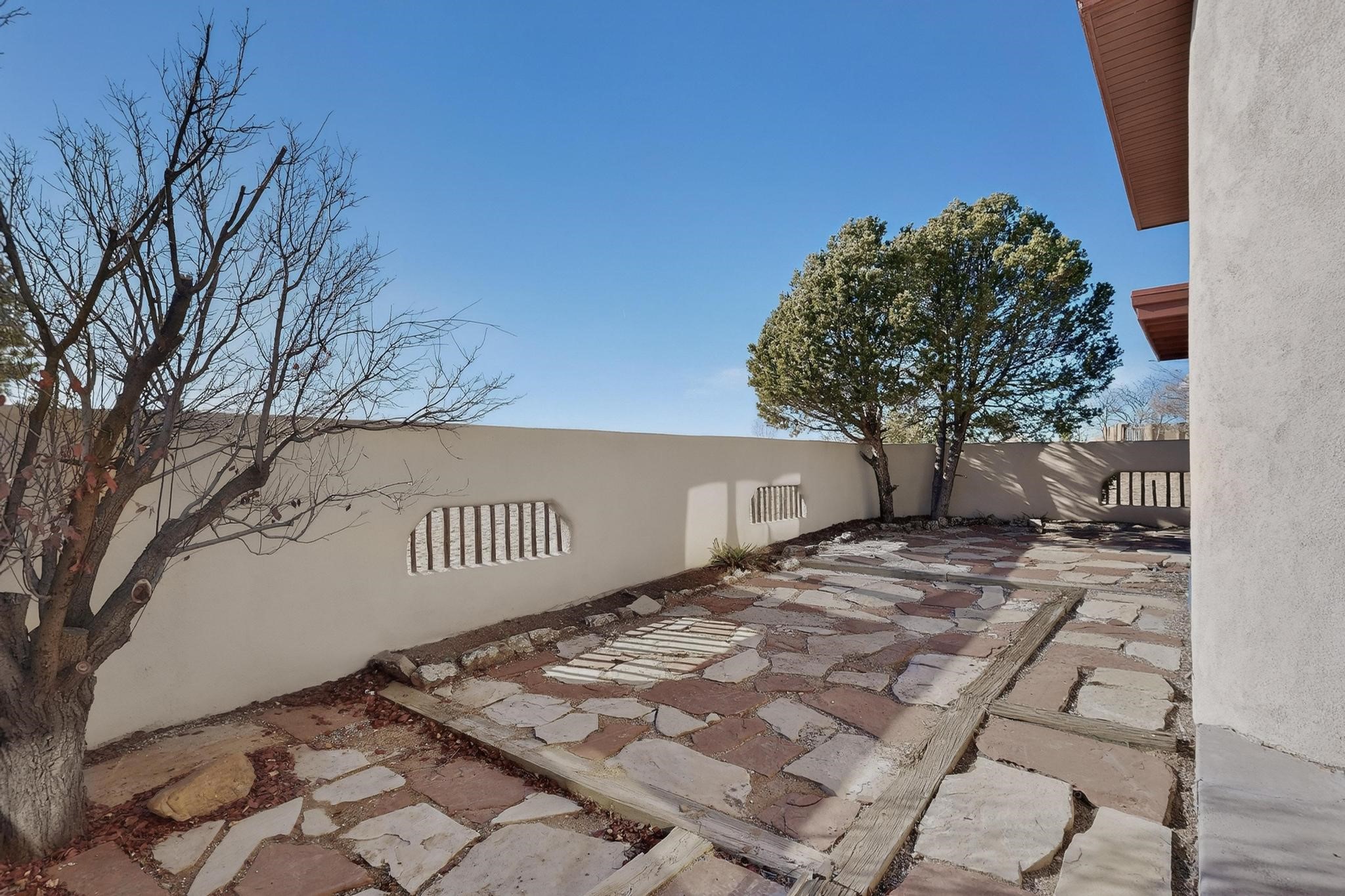 Remarkable opportunity to obtain a 3963sf multi generational 4 bedroom home in Eldorado. Born with a passive solar design and high ceilings with deep southern glazing this home is full of sunlight. Saltillo tile floors, beam and viga ceilings, high clerestories, nichos, 2 kiva fireplaces, mini splits and a brand new roof, this contemporary pueblo home is amazing. A spacious country style kitchen with large breakfast bar and breakfast nook will accommodate plenty of family entertainment. There is an adjoining family room, sunken living room and a formal dining room/den off the kitchen. the owners suite features a spacious bathroom and walk in closet, plus there are 3 guest bedrooms with a 3/4 and full bath. The laundry includes a tub and plenty of extra storage. On going through the 3 bay garage you can enter the studio/guest wing which includes a 2 large rooms, bath and a separate 4th garage. A walled private flagstoned courtyard and portal in front and to the rear offer plenty of outside enjoyment. The paved driveway also includes plenty of guest parking. This home is within easy reach of the Eldorado Community Center amenities, local shopping, school, library and senior center, and only minutes into Santa Fe.