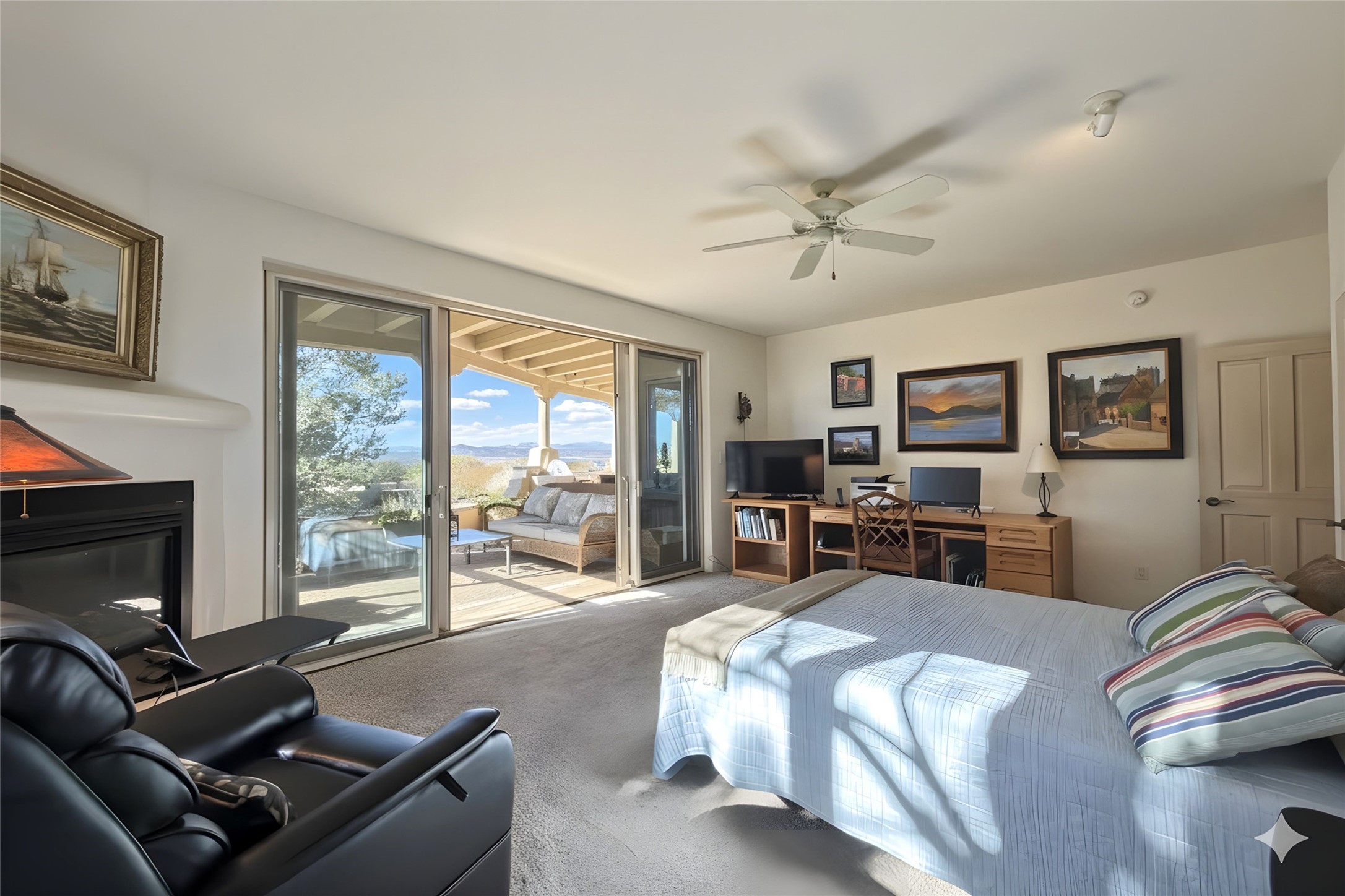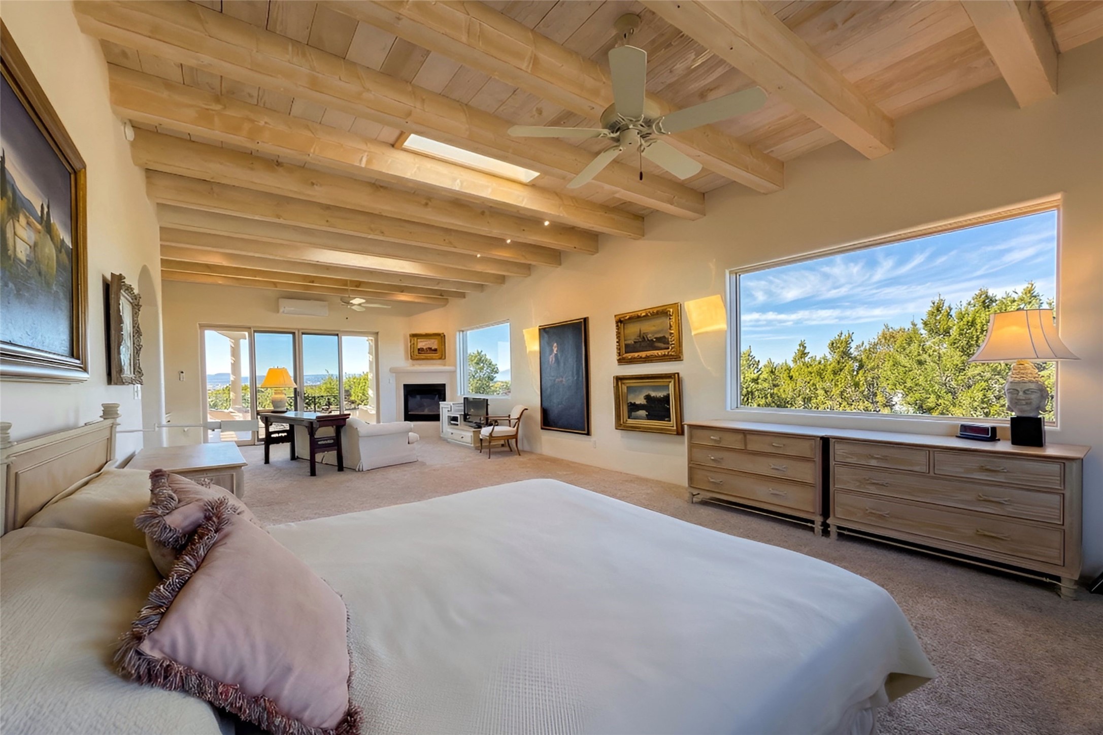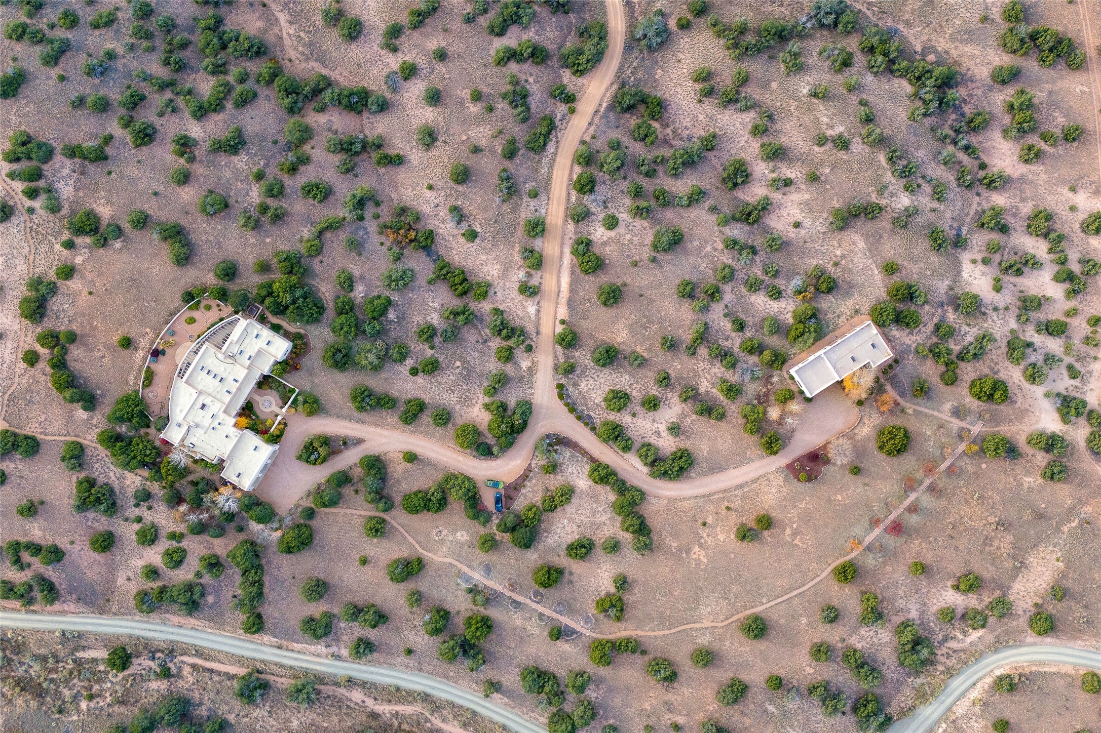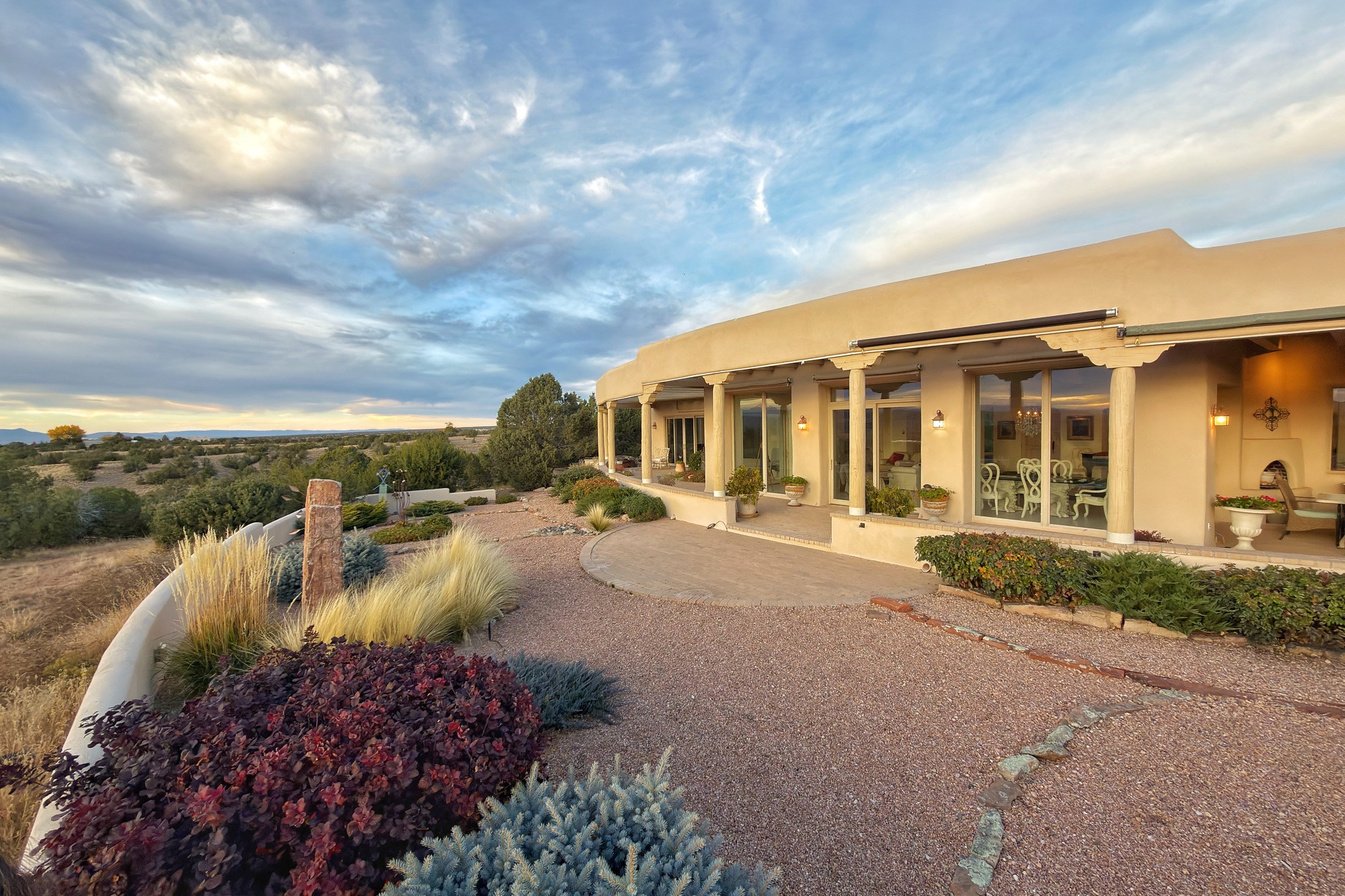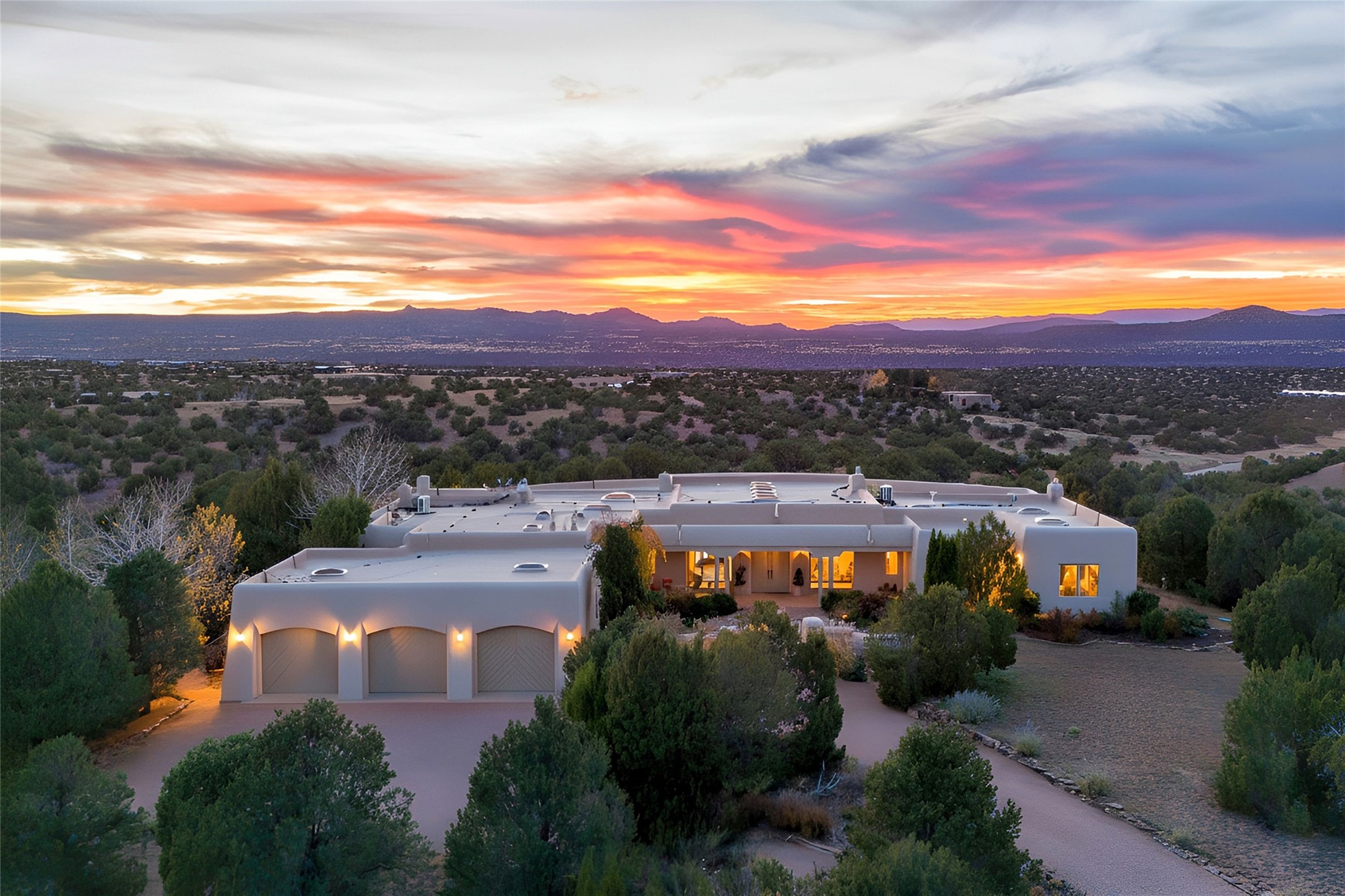 A long, private, winding driveway leads to this secluded, expansive hilltop retreat spanning 16.58 acre and showcasing unobstructed, panoramic sunrise & sunset views of the Jemez and Sangre de Cristo mountains- from inside and outside of the house. A sophisticated estate with detached studio/guest house and impressive 5 car garage encompasses 5,225 total sq ft in the equestrian friendly community of La Tiera Nueva. The 4,310 sq ft main home, with no steps, is introduced by a courtyard with a perennial garden, water feature and sculptures which leads inside to a dramatic galleria showcasing a great room with 10 floor-to-ceiling windows/doors, a gas fireplace and a entertainment center perfect for large gatherings plus a grand piano. The gourmet kitchen boasts a large center island, cozy eating area, gas fireplace and built-in bookcase. Perfect for large or intimate gatherings. The primary suite provides a quiet retreat with a sitting room, custom built-ins, dual walk in closets, picture windows and a spa-style bath with soaking tub and separate showers and views of the Jemez mountains. Two ensuite guest rooms, a powder room and laundry room complete the main home. Outside, an expansive portal spans the length of the home, and features two wood-burning fireplaces and semi-enclosed dining and seating areas capturing the views of the Jemez Mountains, ideal for year round enjoyment. The detached 915 sq ft. studio/guest house offers a flexible, light filled space with a fireplace, kitchen, walk-in closet, and 3/4 bath. All suitable for creative work, guests or multi-generational use. Two extra large bedrooms could be easily created in the studio. The landscaped grounds include sculptured gardens, water features, contemporary stone elements, and an orchard with a variety of trees, plus space for a horse barn to be built. Only 20 minutes to the Santa Fe airport and renowned Plaza, La Tierra Nueva provides manned security, gated privacy, and on-site tennis & pickleball.
