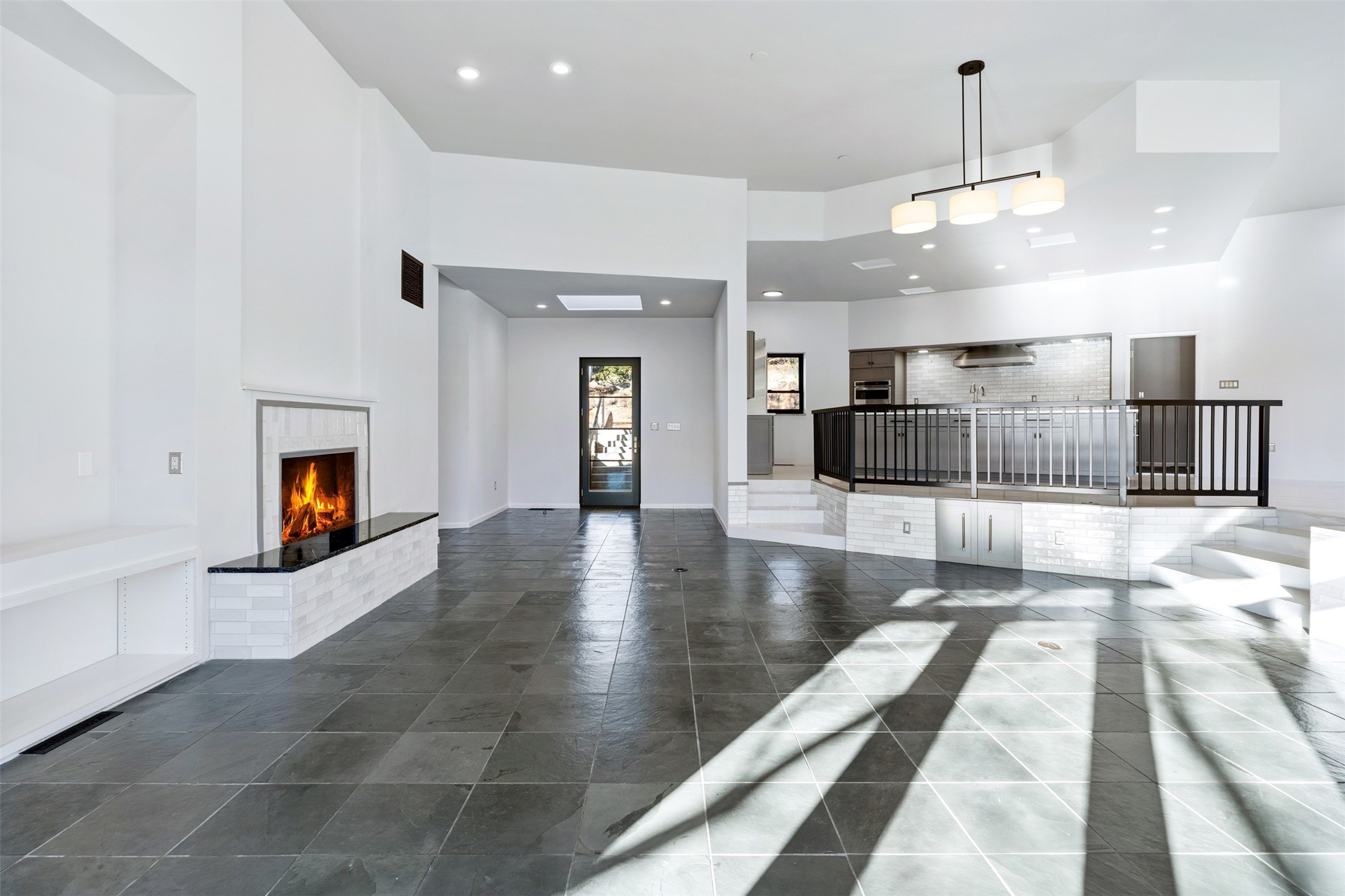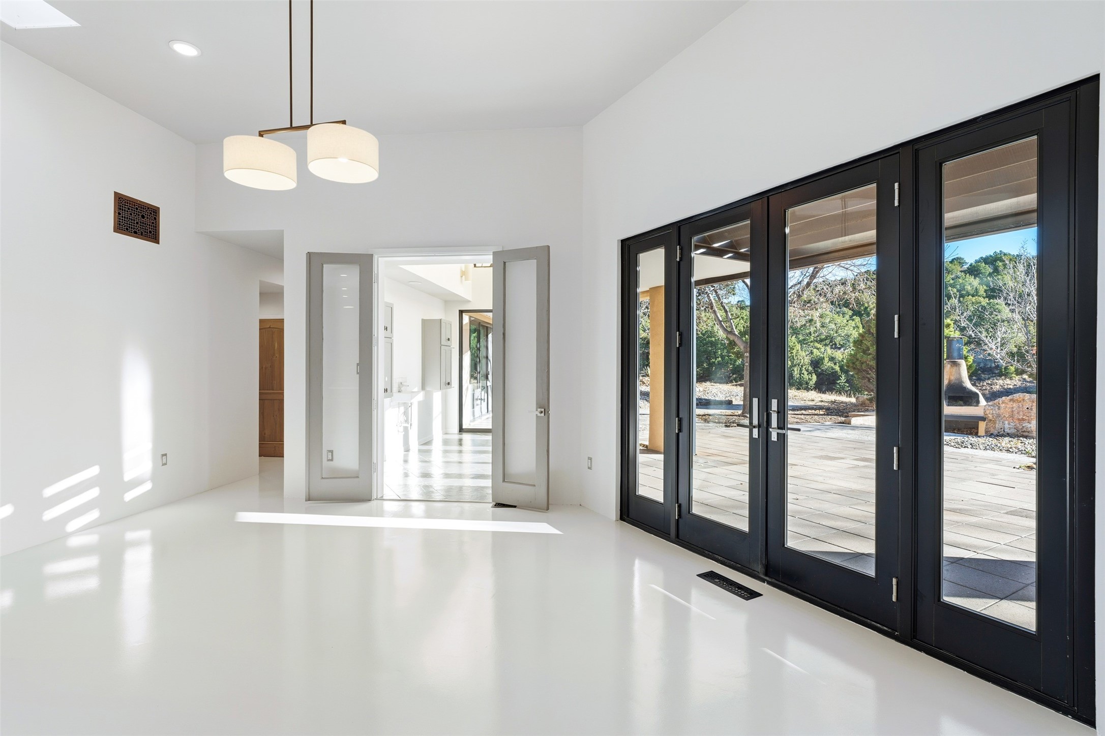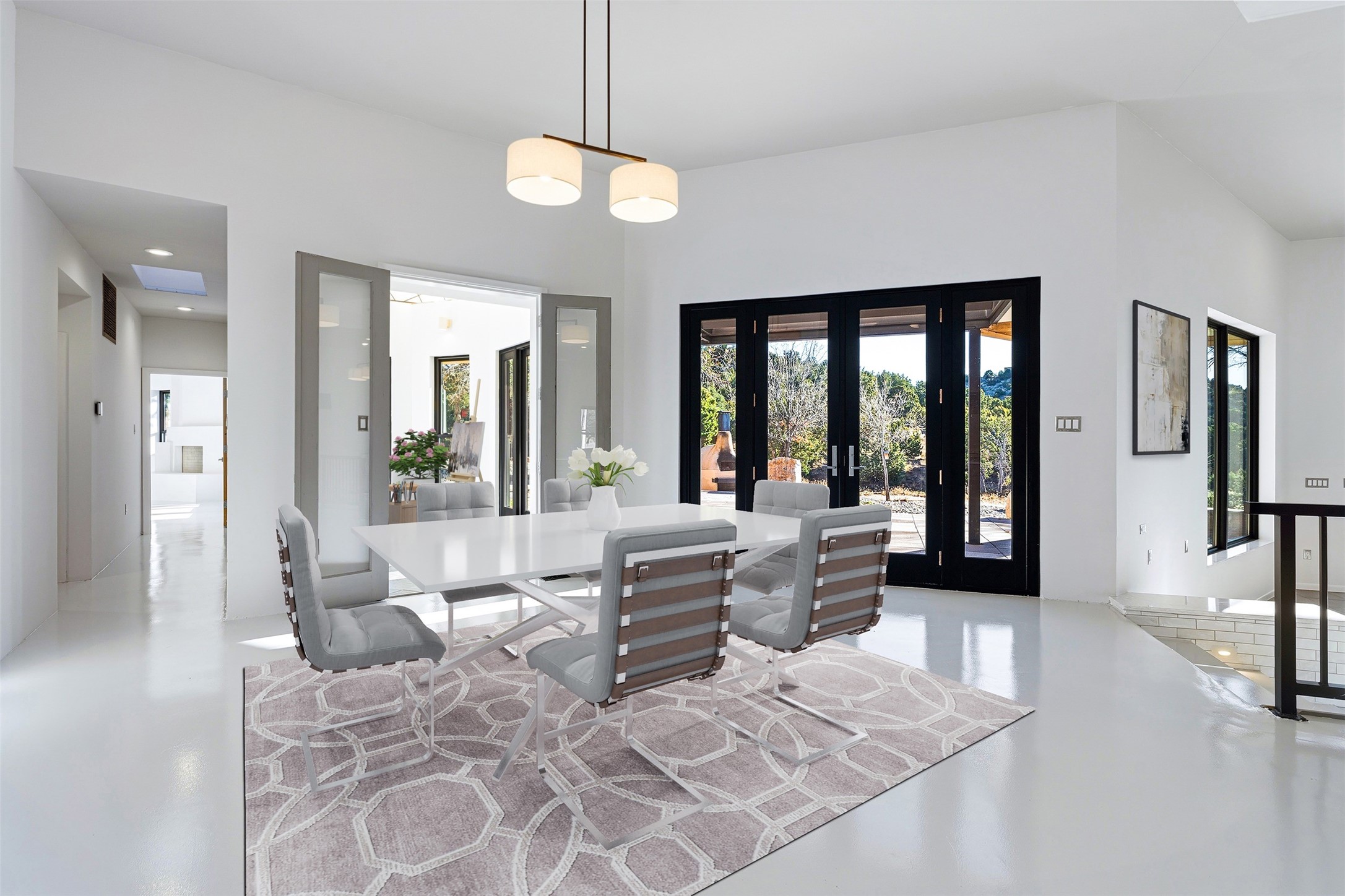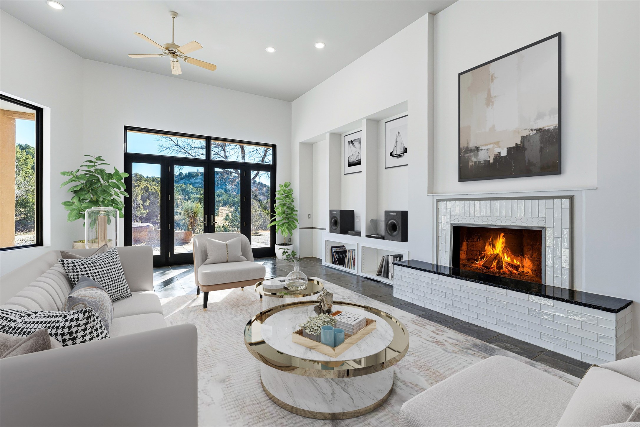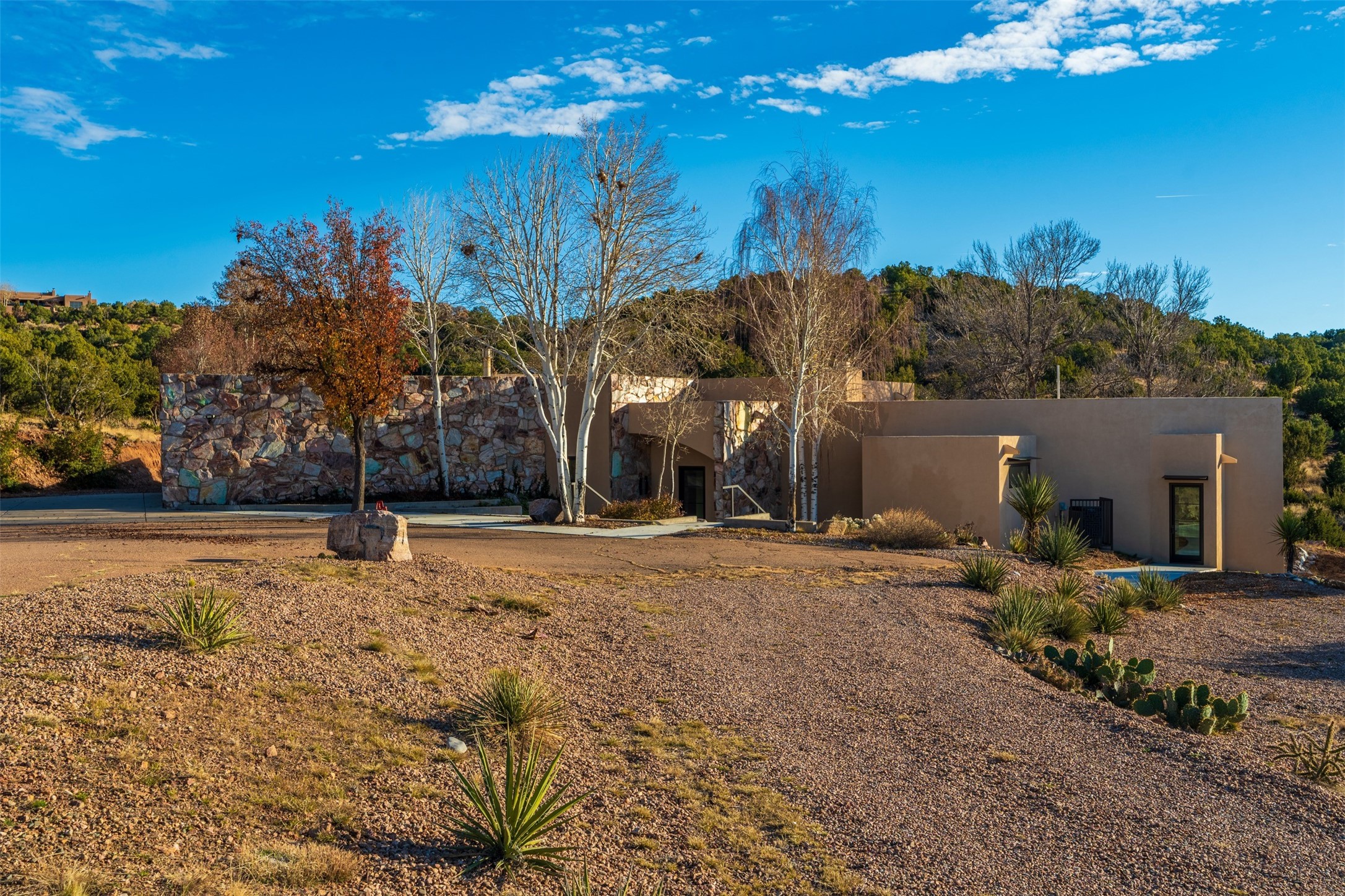 Designed by noted architect John Klee, this 4,300-square-foot 4 bedroom residence embodies the clean lines and luminous spaces of late-century modern design. The home rests gracefully within the contours of Arroyo Hondo Vistas, opening to generous portals and patios that frame sweeping mountain and high-desert views. A landscaped approach sets the tone--mature trees, natural stone, and a low-profile stucco and rock faade emerges as the home comes into sight. Tucked into the terrain, a series of descending steps leads to the front entry. Inside, an expansive great room unfolds beneath high ceilings, where slate floors, a fireplace, and a full wall of custom shelving anchor the space. Huge glass doors and windows dissolve the boundary between indoors and out, creating a luminous, seamless connection to the surrounding landscape. The grand kitchen features generous granite surfaces, a breakfast bar, and excellent flow for both cooking and entertaining. Nearby, the formal dining area offers the first view of one of the home's most distinctive architectural elements: a conservatory crowned by a softly arched, translucent ceiling. The expansive owner's suite includes a sitting area, a walk-in closet, large fireplace, and a well-appointed bath with free-standing tub, double vanity, and walk-in shower. Returning to the main living area, a gently sweeping hallway leads to a wing with two bedrooms, each with walk-in closets, a guest bathroom, and a flexible room that can be used as an office, studio, or exercise room. Nearly every room features large windows and/or patio doors opening to the expansive, view-rich outdoor spaces, creating a lifestyle centered on indoor-outdoor living and quiet retreat. Numerous skylights illuminate the interior throughout. Other features include central air conditioning, forced-air heating, and a gated entry. Some rooms have been digitally staged.