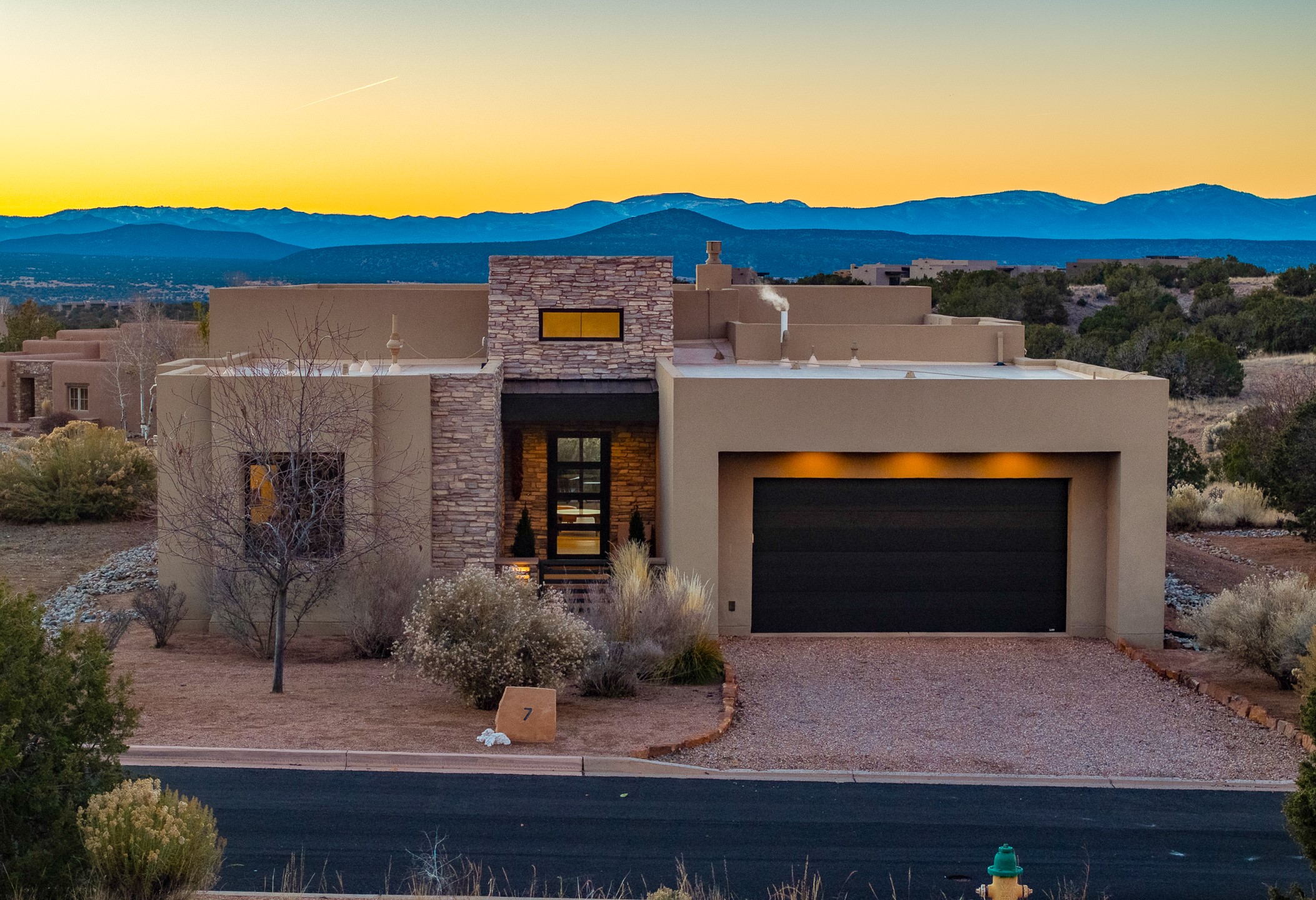 Experience the singular magic of Santa Fe living from this sophisticated, custom-designed contemporary residence. Completed in 2019 by Boss Builders, this single-level home is an artful composition of exquisite craftsmanship and intelligent design, thoughtfully curated for both entertaining and peaceful daily life. High ceilings, generous natural light, and beautiful plaster walls create a bright and welcoming aesthetic often reserved for more expensive homes. The heart of the residence is the expansive living space, where the entire western wall gives way to panoramic vistas via a dramatic Nanawall system. This seamless integration of indoors and out captures the high-desert light, transforming daily moments into an endless spectacle of stunning sunsets. The gourmet kitchen is a study in subtle elegance, featuring premium Viking appliances, a unique stone backsplash, and classic cabinetry. Functional luxury is paramount, evidenced by the dedicated wine cooler and a convenient pot filler at the stove. Designed for ultimate comfort, the floor plan provides exceptional sanctuary. The generous primary suite is a private retreat, offering direct patio access, commanding views, and a luxurious five-fixture bath complete with a deep soaking tub and a separate steam shower. Guest quarters are strategically separated, ensuring privacy for all. Year-round comfort is assured by a dual-system approach: responsive forced air heating for quick temperature adjustments, coupled with radiant heat in the floors for consistent, enveloping warmth. Additional high-end features include refrigerated air-conditioning and remote-controlled window treatments. Set within Santa Fe's premier gated community, this property promises effortless living, beautiful common area landscaping, well-maintained streets, and 24-hour security and paramedic services. With its direct-access garage and fully automated drip irrigation system, the home also caters to modern living with whole-home audio wiring and high-speed internet connections in every bedroom--an ideal, secure lock-and-leave lifestyle.
