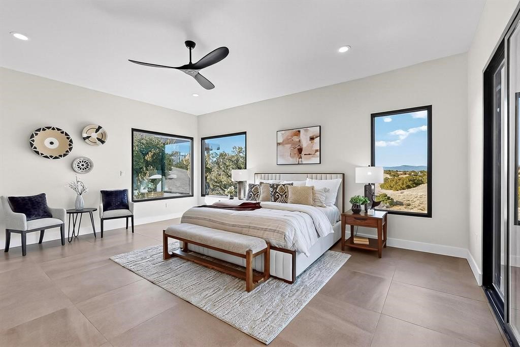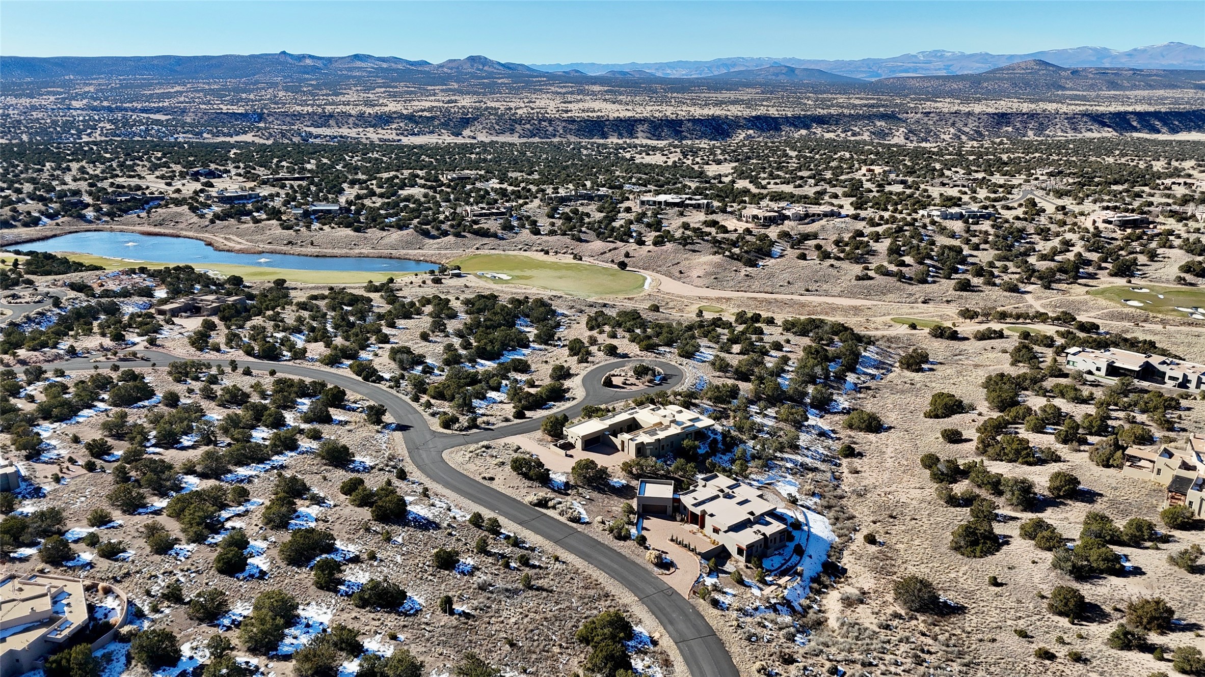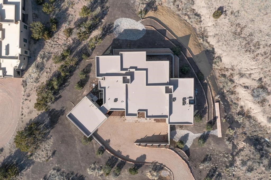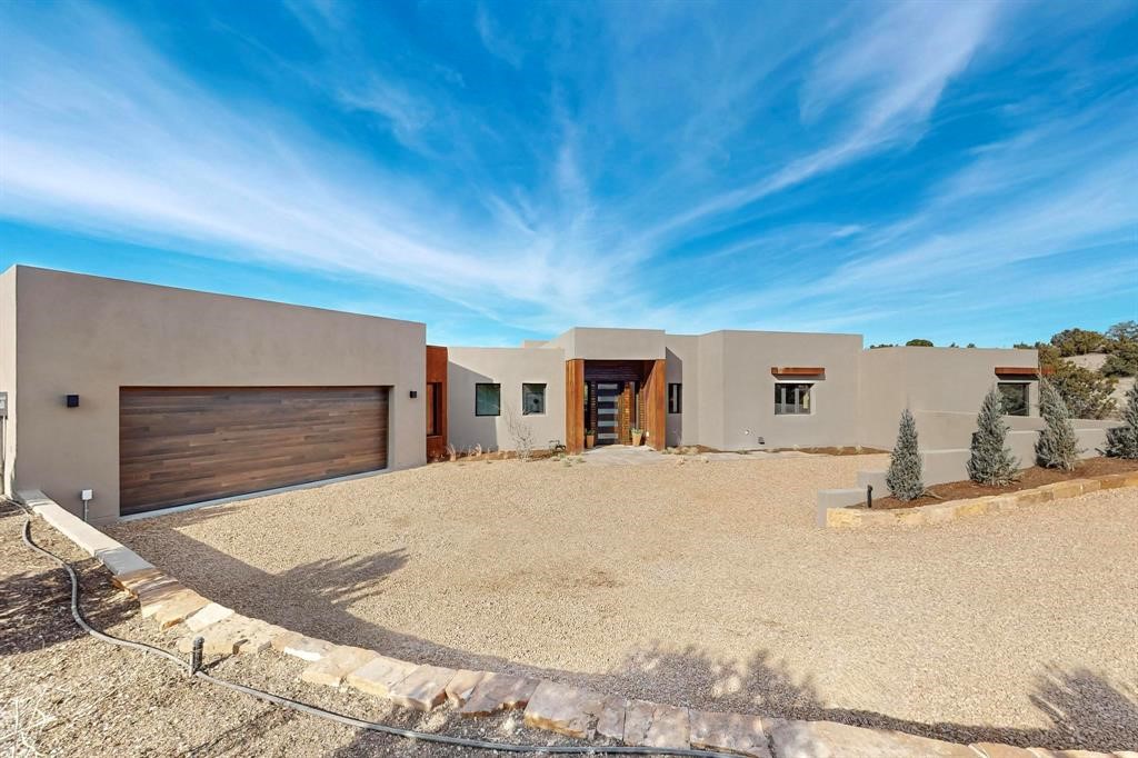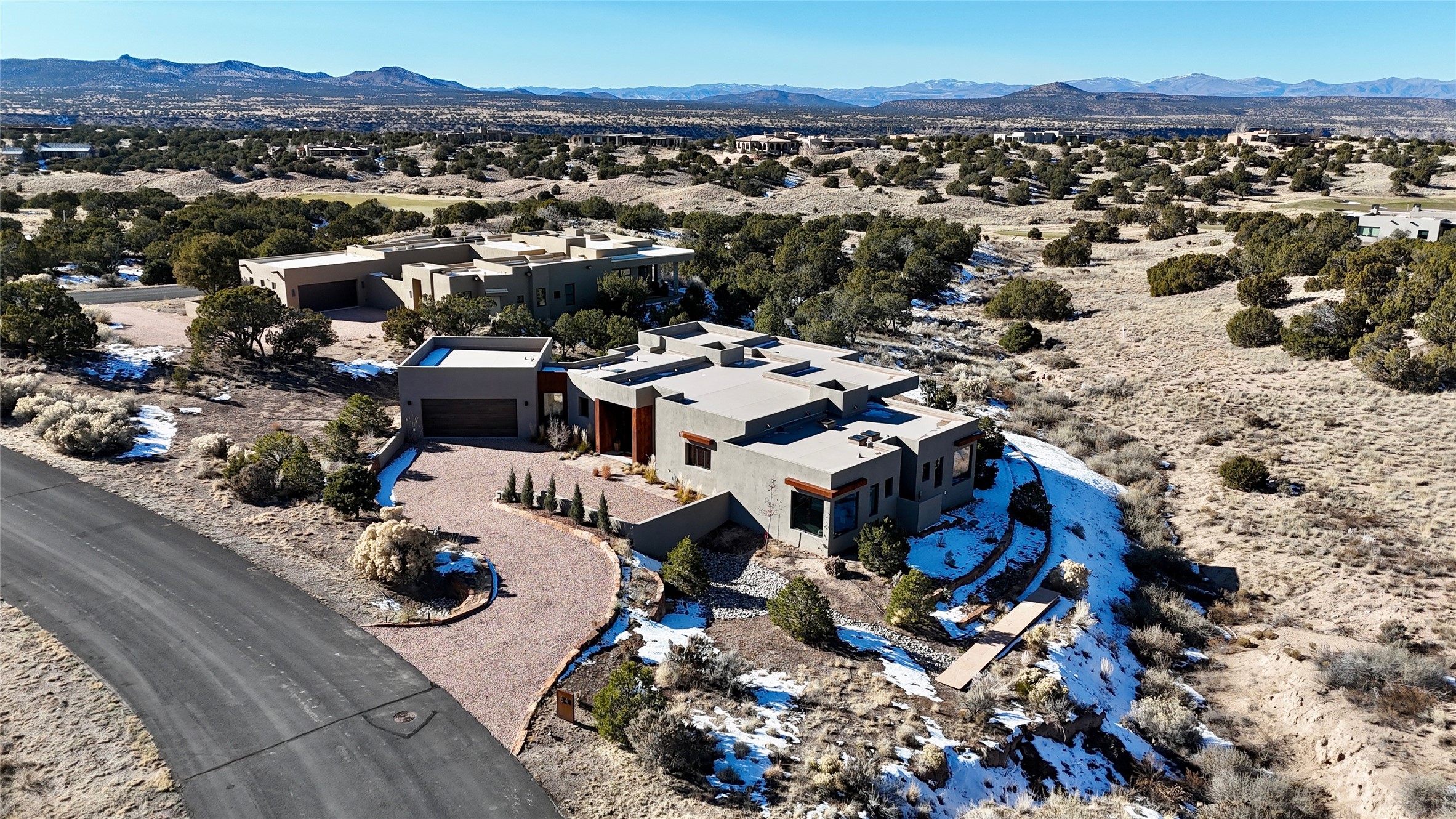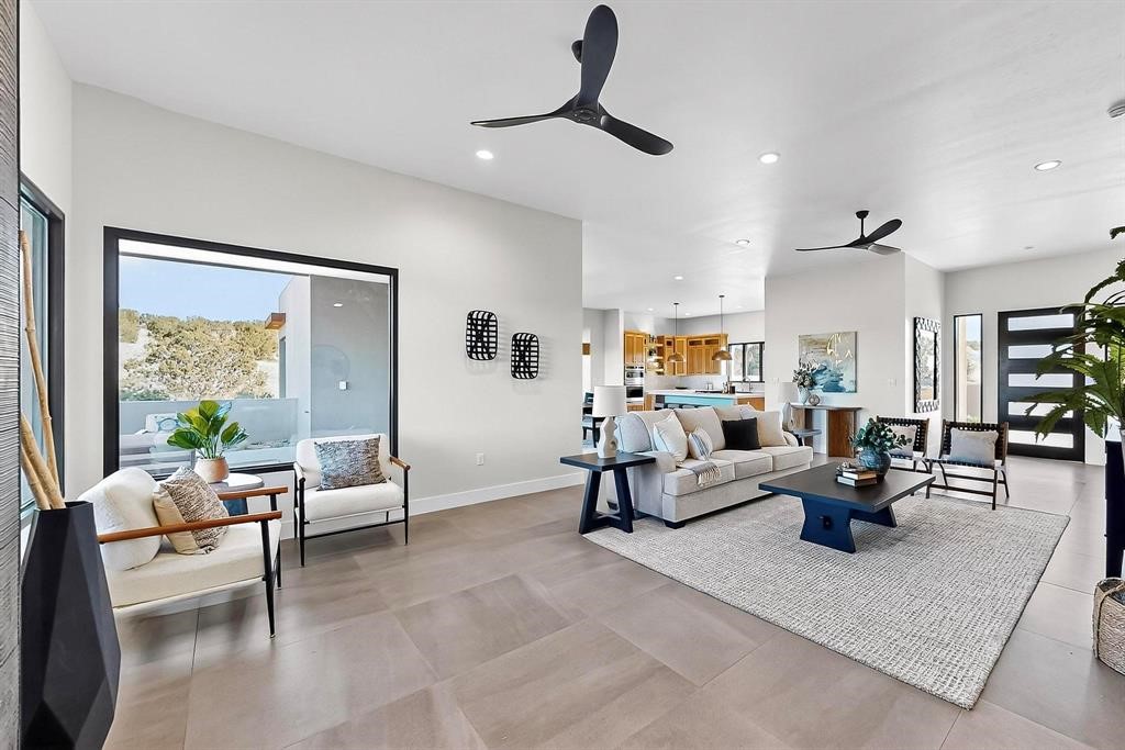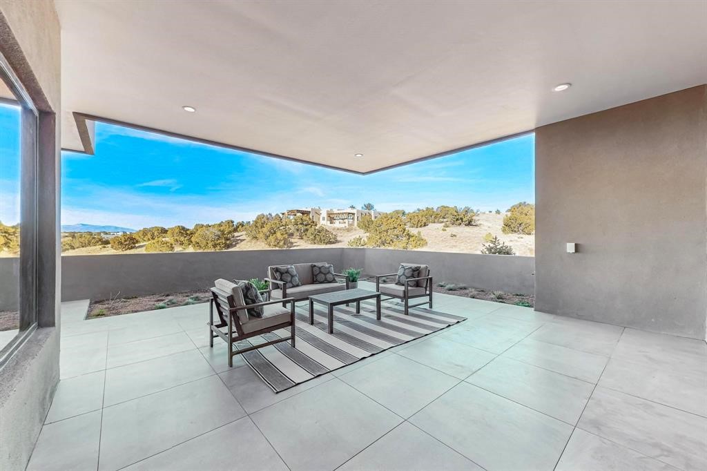 Set on an elevated 0.71-acre lot in Las Campanas, this brand-new soft contemporary home pairs clean modern lines with subtle Santa Fe style and far-reaching mountain and golf-course views. Built in 2024 by New Vista Property Solutions, the single-level 3,111 sq ft layout offers three en-suite bedrooms plus a powder room, a natural gas fireplace, and an attached two-car garage. Sculptural weathered-steel accents enrich the exterior, adding texture and architectural interest.Inside, the great room is filled with light and anchored by a generous cook's kitchen featuring handmade custom cabinetry crafted for both function and artistry. Open living and dining spaces flow easily to the outdoors, where a dramatic cantilevered rear porch creates a protected vantage point for sunrise, evening light, and year-round alfresco living.Each bedroom offers privacy and comfort with its own bath, while ductless mini-split systems provide efficient heating and cooling throughout. A membrane roof and no interior steps enhance ease of living.Located within the gated community of Las Campanas, residents enjoy beautifully maintained surroundings and 24-hour security. Membership to The Club is optional and provides access to two Jack Nicklaus Signature golf courses, a full fitness and spa center with indoor and outdoor pools, tennis and pickleball, dining at the Hacienda Clubhouse, an exceptional Equestrian Center, and miles of biking, hiking, and riding trails.
