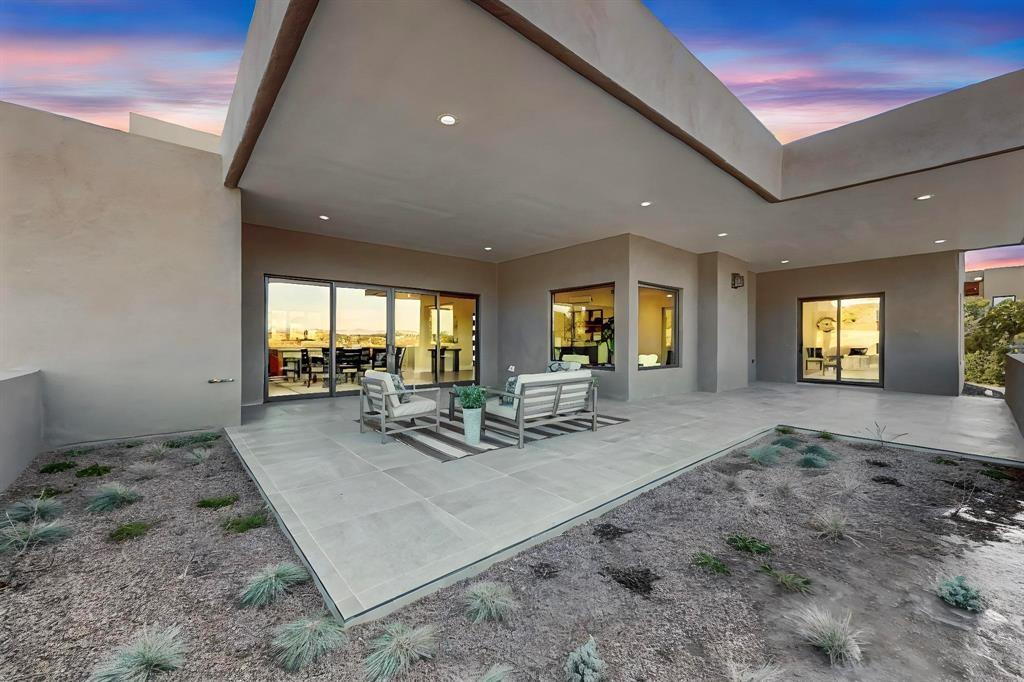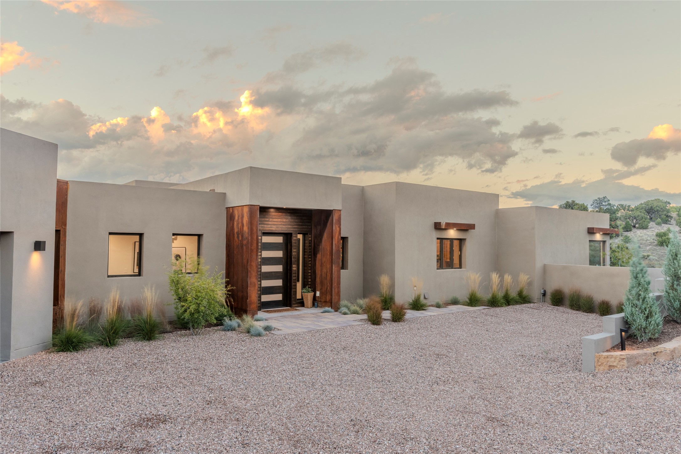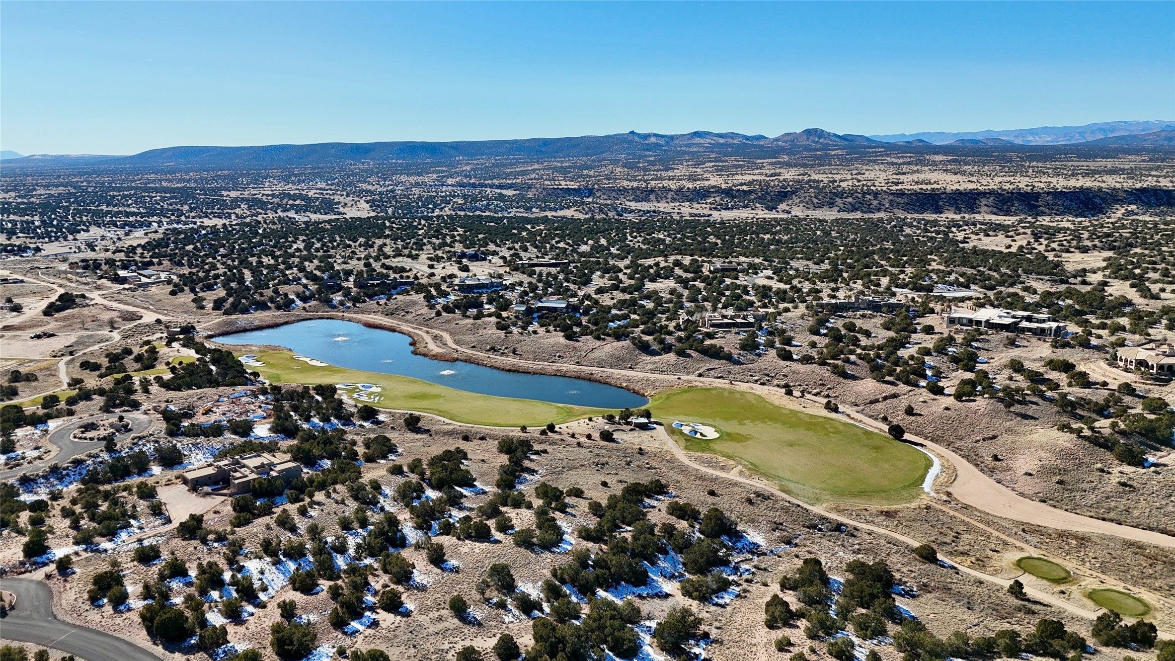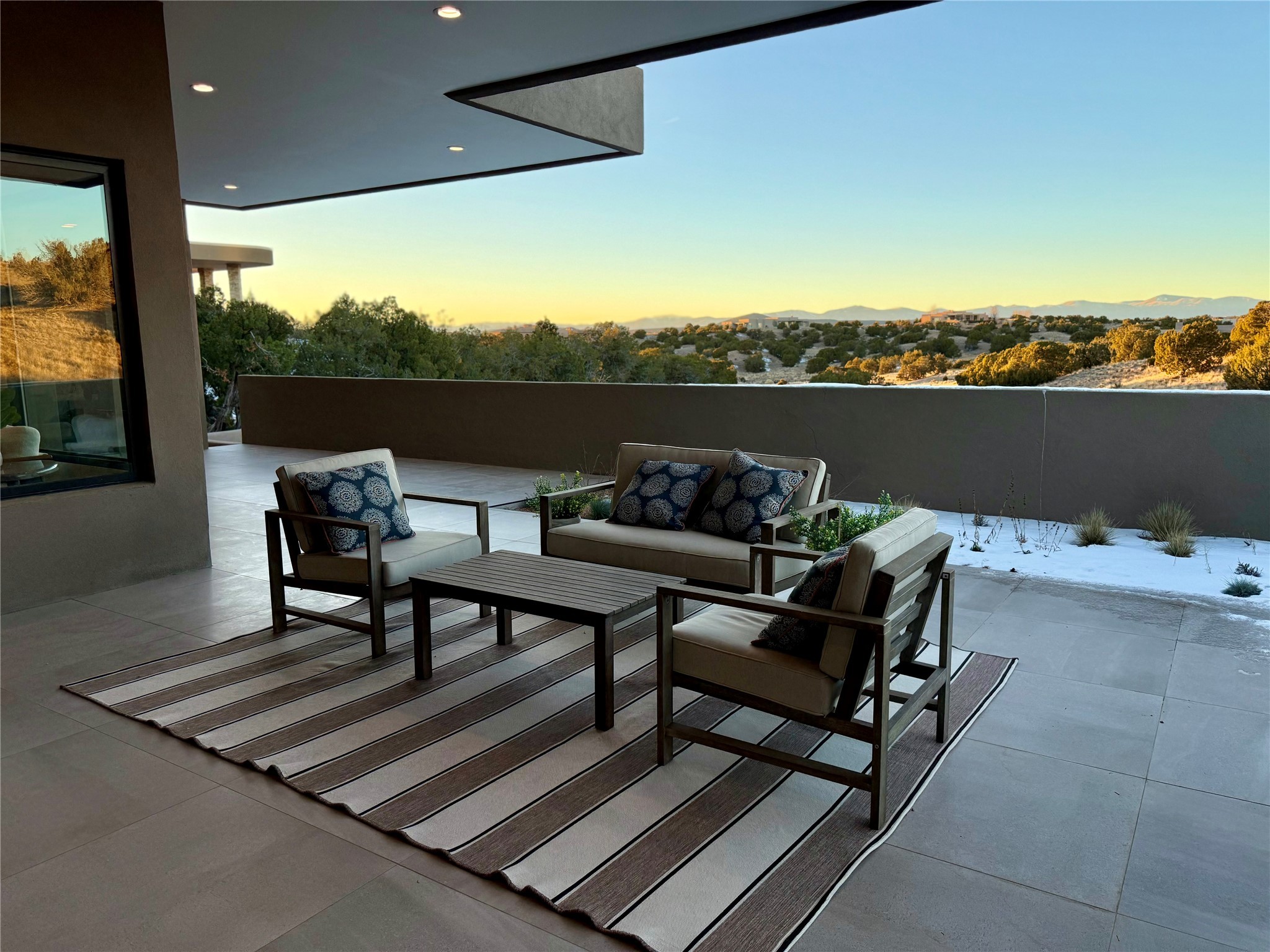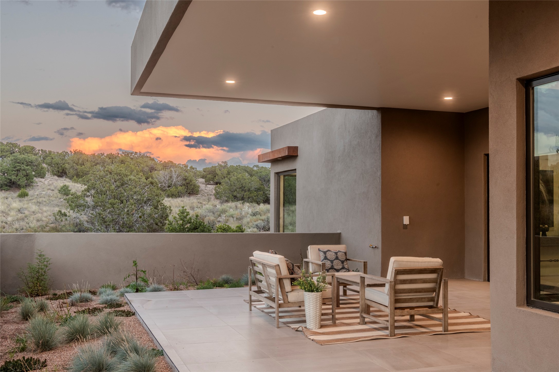 Set on an elevated 0.71-acre lot in Las Campanas, this brand-new soft contemporary home pairs clean modern lines with subtle Santa Fe style and far-reaching mountain and golf-course views. Built in 2024 by New Vista Property Solutions, the single-level 3,111 sq ft layout offers three en-suite bedrooms plus a powder room, a natural gas fireplace, and an attached two-car garage. Sculptural weathered-steel accents enrich the exterior, adding texture and architectural interest.Inside, the great room is filled with light and anchored by a generous cook's kitchen featuring handmade custom cabinetry crafted for both function and artistry. Open living and dining spaces flow easily to the outdoors, where a dramatic cantilevered rear porch creates a protected vantage point for sunrise, evening light, and year-round alfresco living.Each bedroom offers privacy and comfort with its own bath, while ductless mini-split systems provide efficient heating and cooling throughout. A membrane roof and no interior steps enhance ease of living.Located within the gated community of Las Campanas, residents enjoy beautifully maintained surroundings and 24-hour security. Membership to The Club is optional and provides access to two Jack Nicklaus Signature golf courses, a full fitness and spa center with indoor and outdoor pools, tennis and pickleball, dining at the Hacienda Clubhouse, an exceptional Equestrian Center, and miles of biking, hiking, and riding trails.
