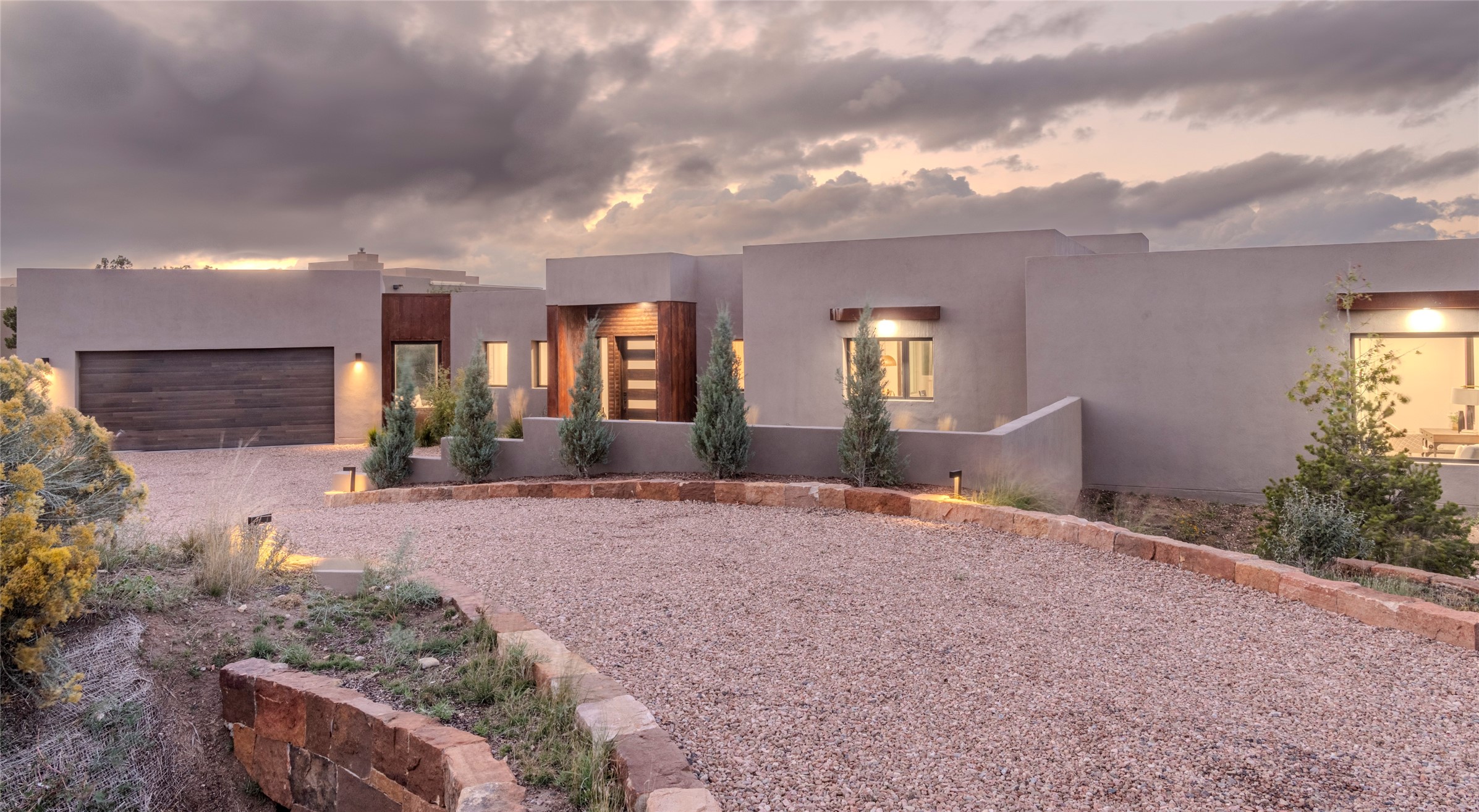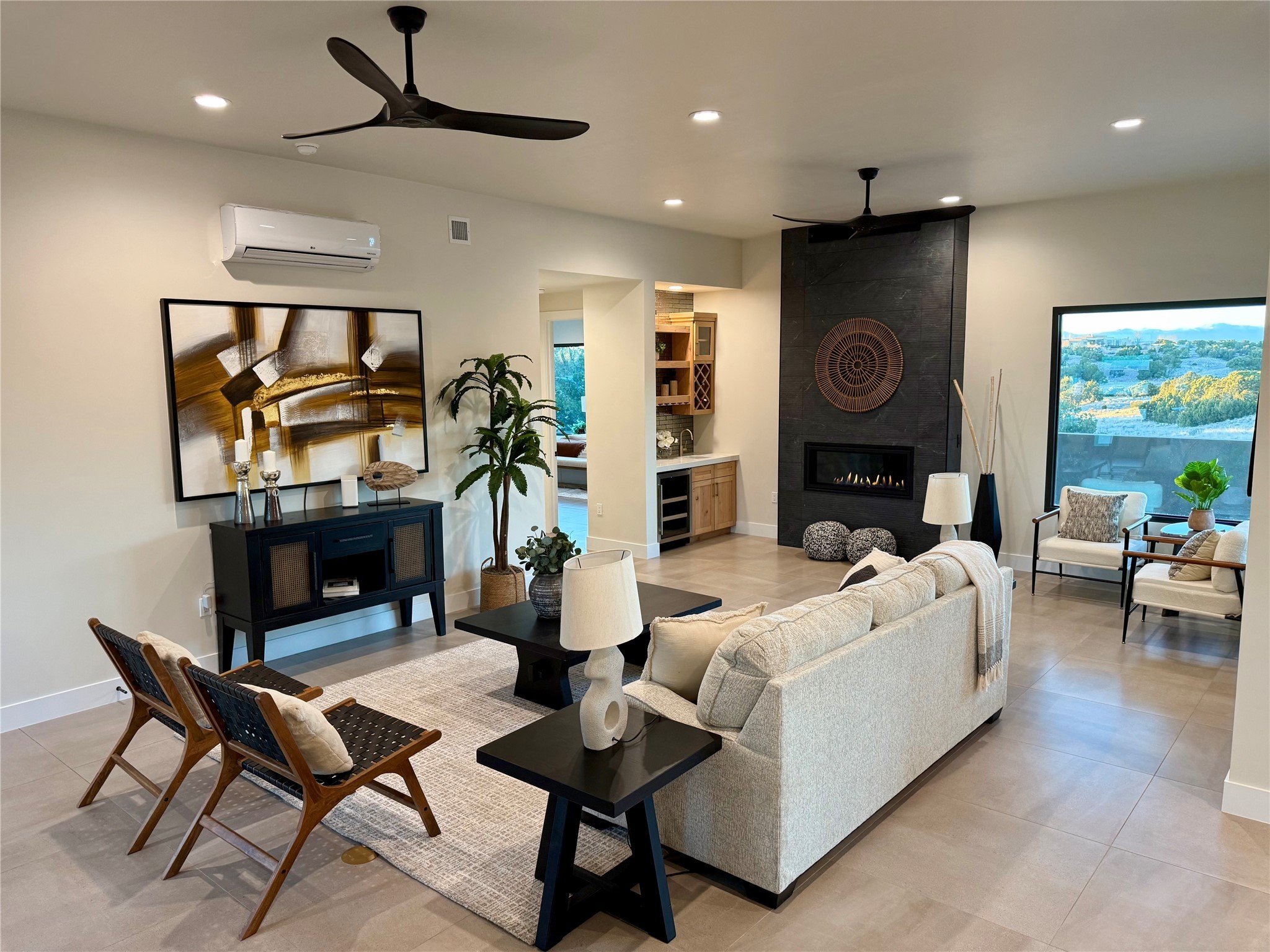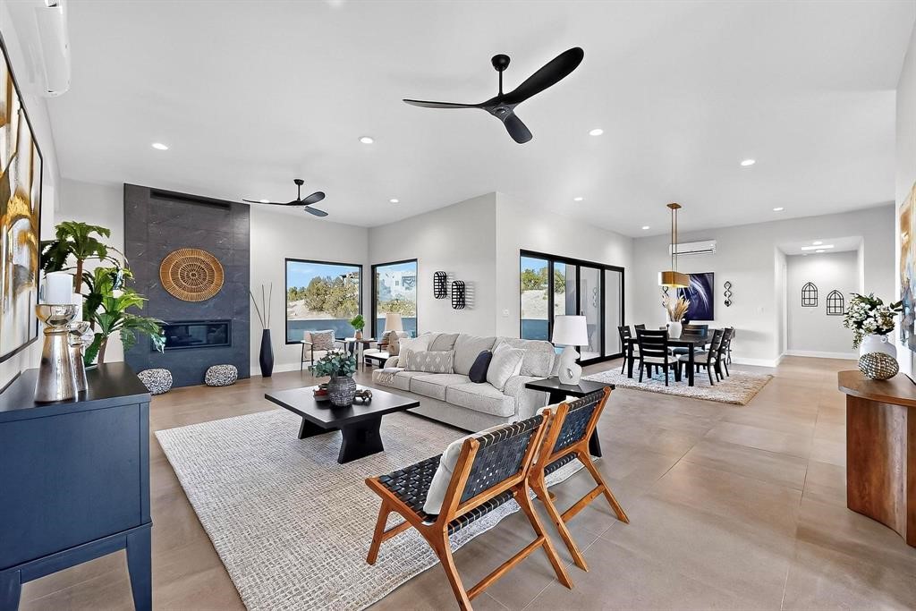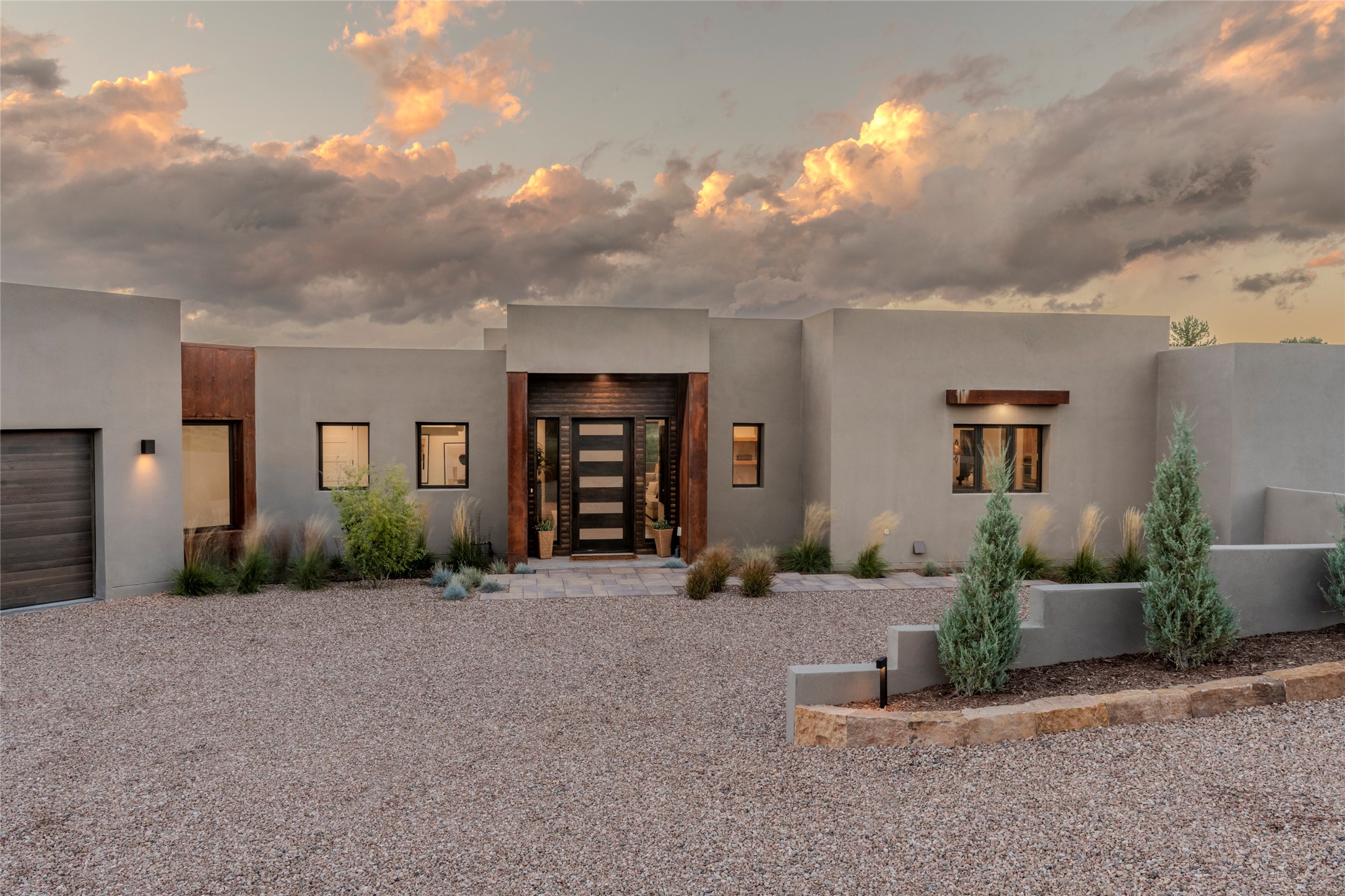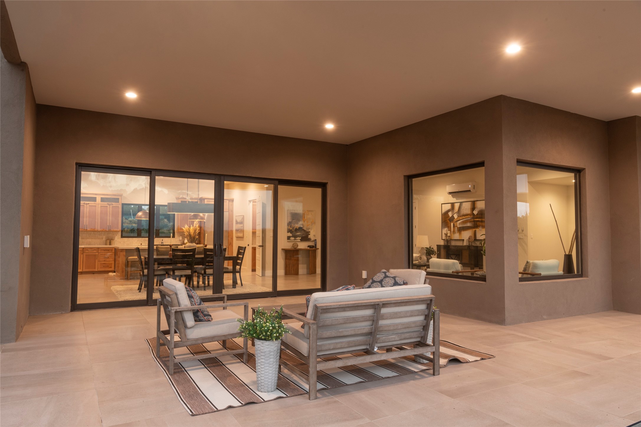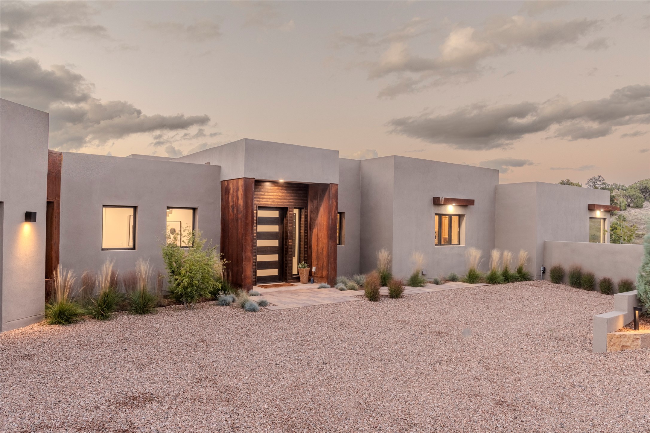 Set on an elevated 0.71-acre lot in Las Campanas, this brand-new soft contemporary home pairs clean modern lines with subtle Santa Fe style and far-reaching mountain and golf-course views. Built in 2024 by New Vista Property Solutions, the single-level 3,111 sq ft layout offers three en-suite bedrooms plus a powder room, a natural gas fireplace, and an attached two-car garage. Sculptural weathered-steel accents enrich the exterior, adding texture and architectural interest.Inside, the great room is filled with light and anchored by a generous cook's kitchen featuring handmade custom cabinetry crafted for both function and artistry. Open living and dining spaces flow easily to the outdoors, where a dramatic cantilevered rear porch creates a protected vantage point for sunrise, evening light, and year-round alfresco living.Each bedroom offers privacy and comfort with its own bath, while ductless mini-split systems provide efficient heating and cooling throughout. A membrane roof and no interior steps enhance ease of living.Located within the gated community of Las Campanas, residents enjoy beautifully maintained surroundings and 24-hour security. Membership to The Club is optional and provides access to two Jack Nicklaus Signature golf courses, a full fitness and spa center with indoor and outdoor pools, tennis and pickleball, dining at the Hacienda Clubhouse, an exceptional Equestrian Center, and miles of biking, hiking, and riding trails.