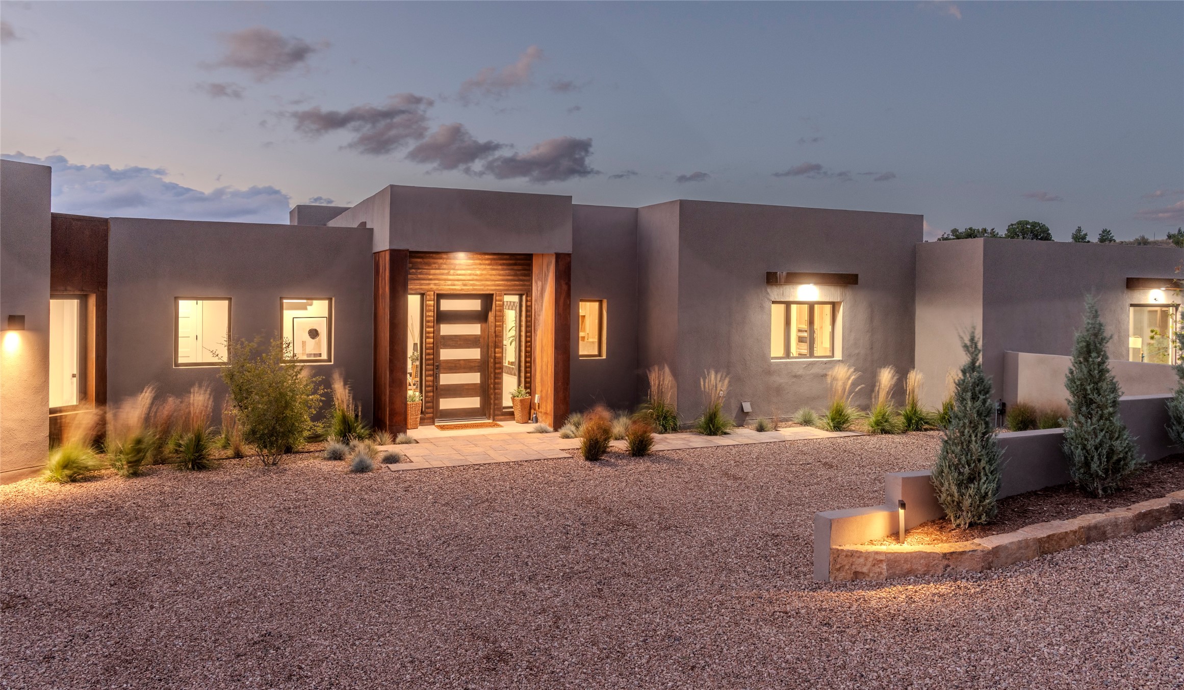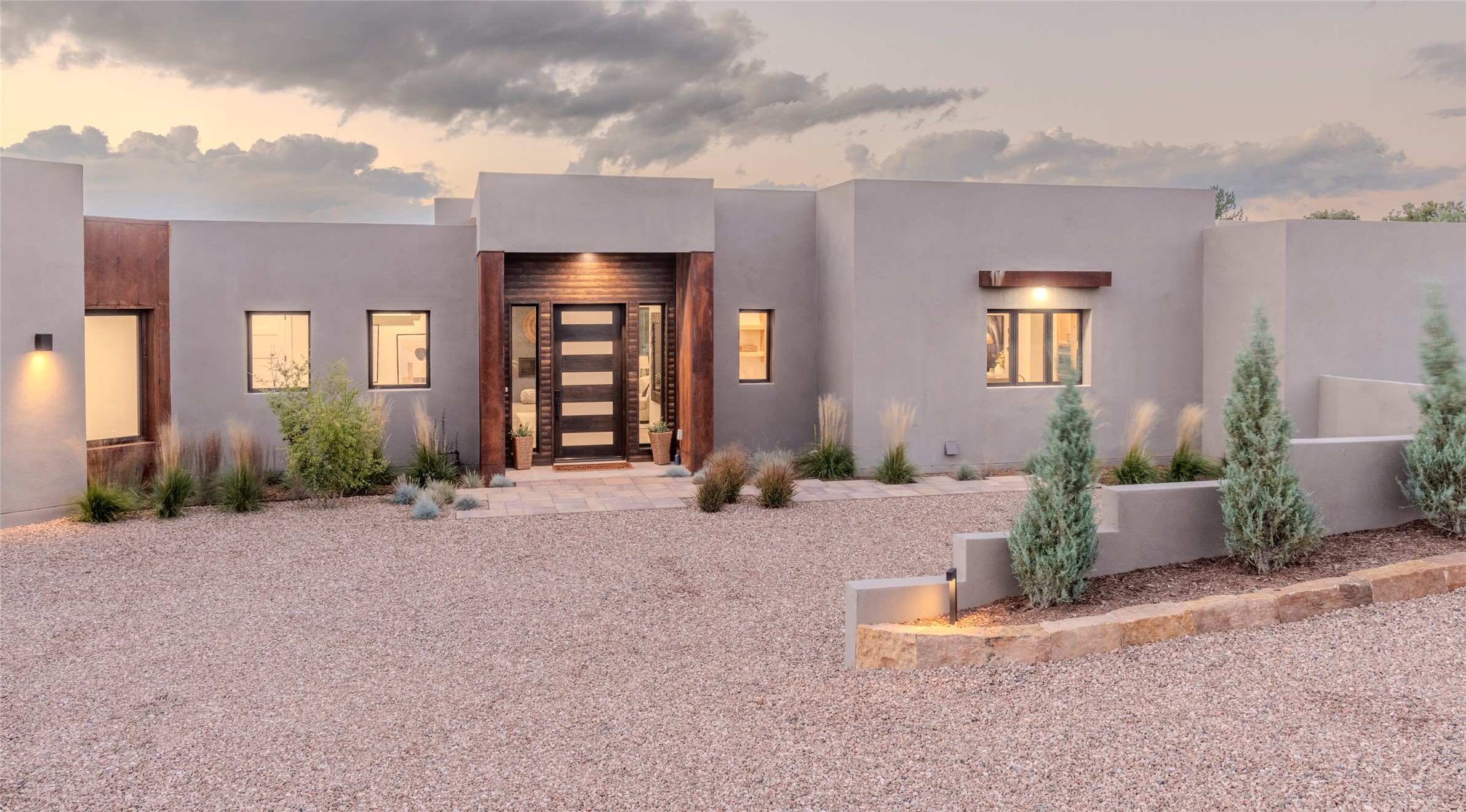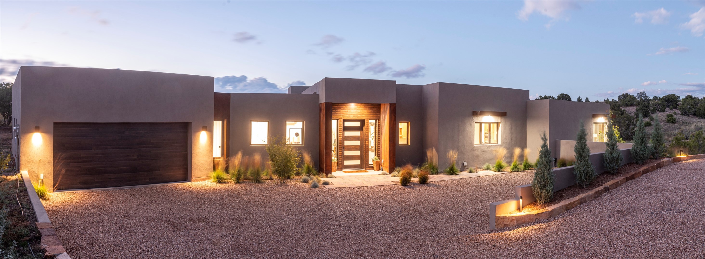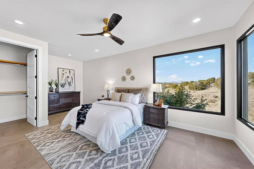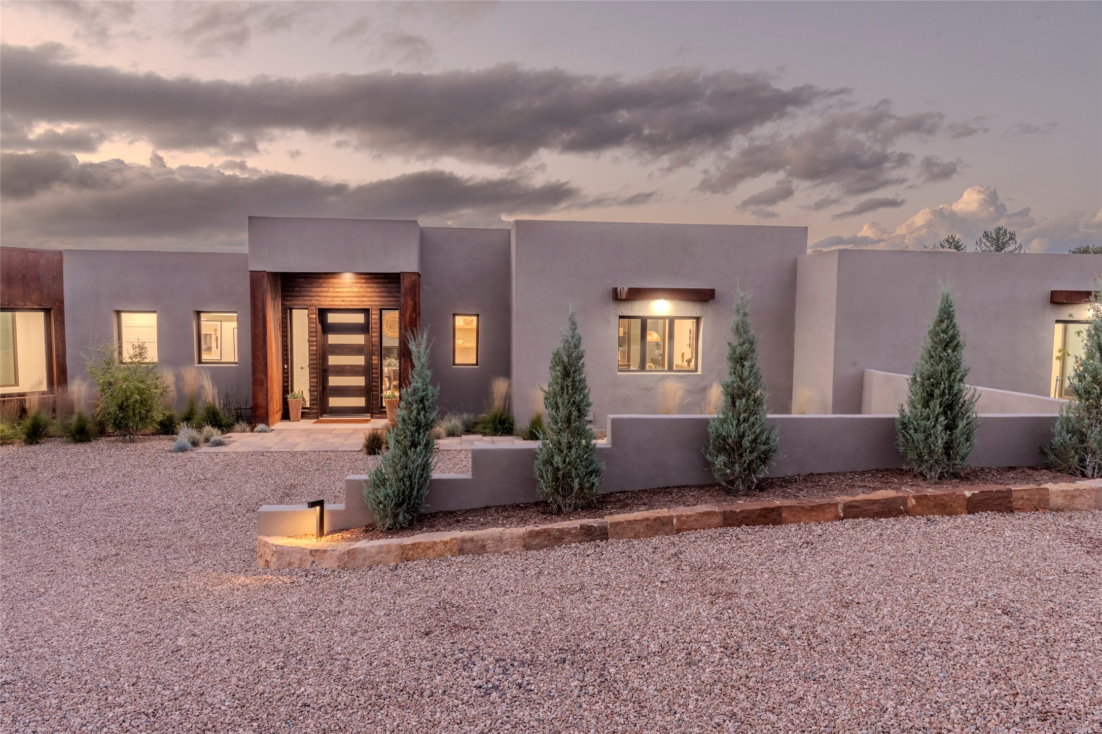 Set on an elevated 0.71-acre lot in Las Campanas, this brand-new soft contemporary home pairs clean modern lines with subtle Santa Fe style and far-reaching mountain and golf-course views. Built in 2024 by New Vista Property Solutions, the single-level 3,111 sq ft layout offers three en-suite bedrooms plus a powder room, a natural gas fireplace, and an attached two-car garage. Sculptural weathered-steel accents enrich the exterior, adding texture and architectural interest.Inside, the great room is filled with light and anchored by a generous cook's kitchen featuring handmade custom cabinetry crafted for both function and artistry. Open living and dining spaces flow easily to the outdoors, where a dramatic cantilevered rear porch creates a protected vantage point for sunrise, evening light, and year-round alfresco living.Each bedroom offers privacy and comfort with its own bath, while ductless mini-split systems provide efficient heating and cooling throughout. A membrane roof and no interior steps enhance ease of living.Located within the gated community of Las Campanas, residents enjoy beautifully maintained surroundings and 24-hour security. Membership to The Club is optional and provides access to two Jack Nicklaus Signature golf courses, a full fitness and spa center with indoor and outdoor pools, tennis and pickleball, dining at the Hacienda Clubhouse, an exceptional Equestrian Center, and miles of biking, hiking, and riding trails.