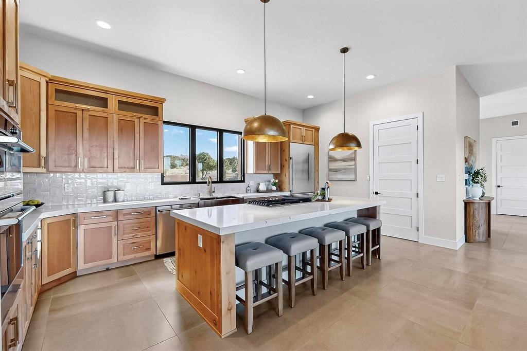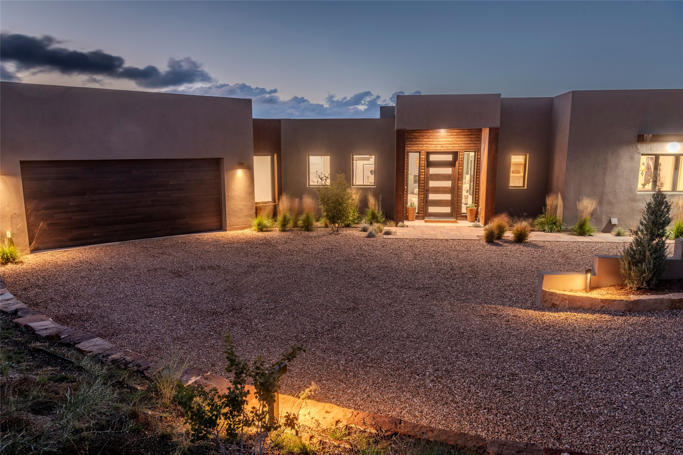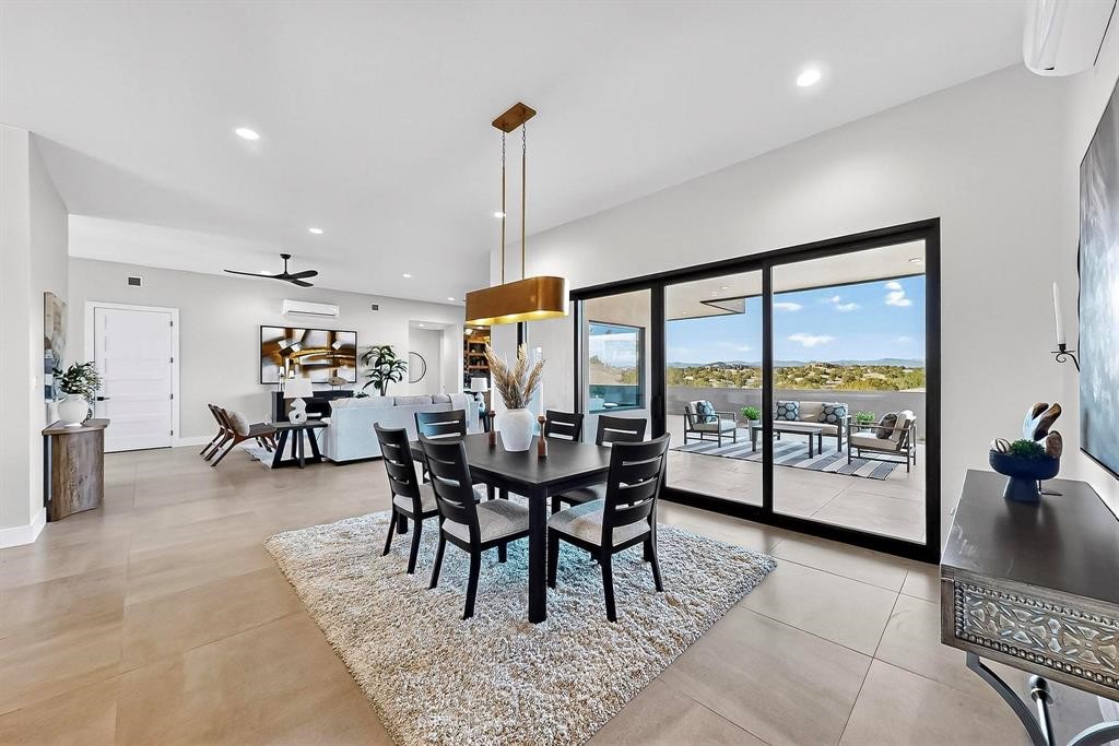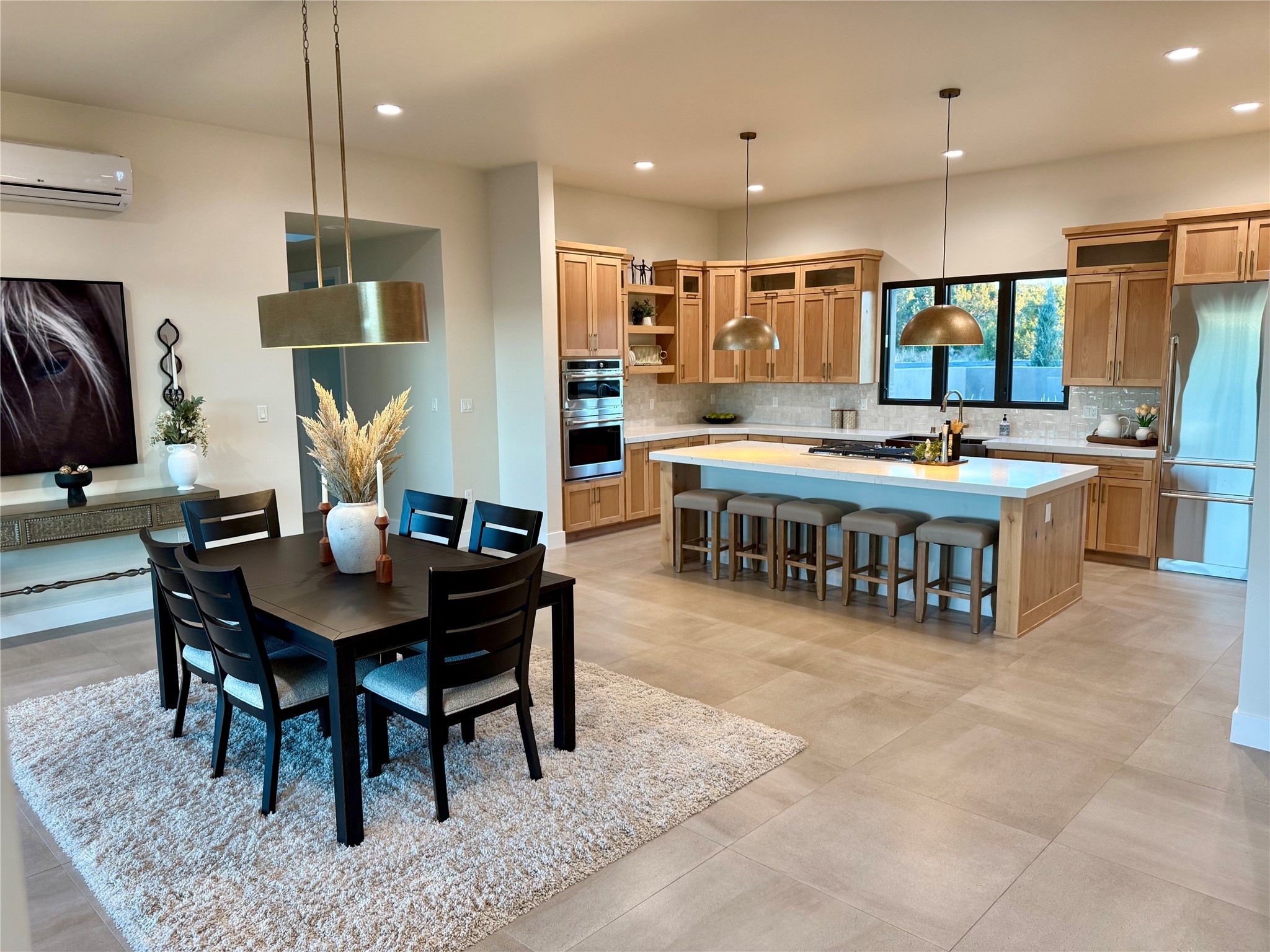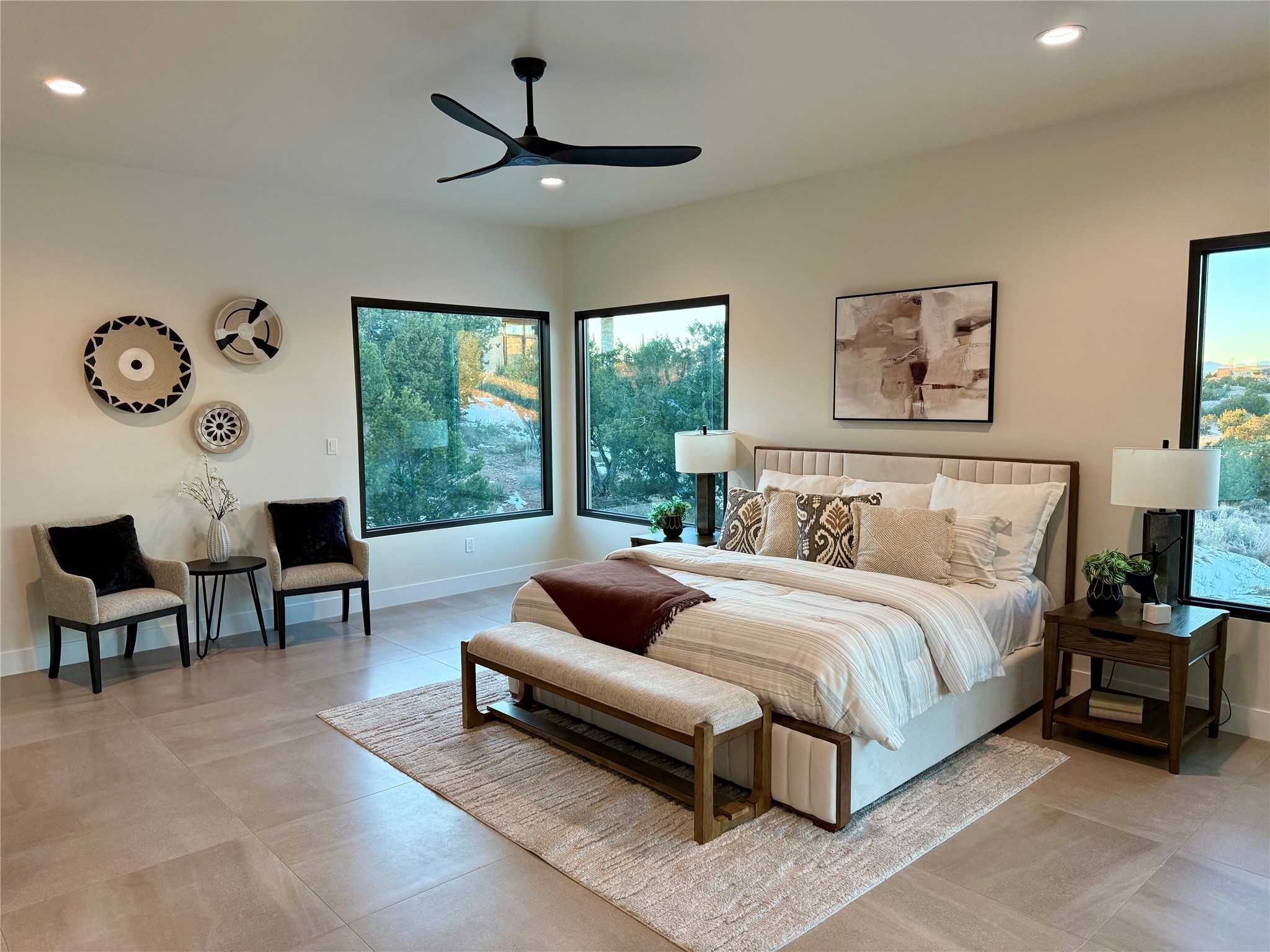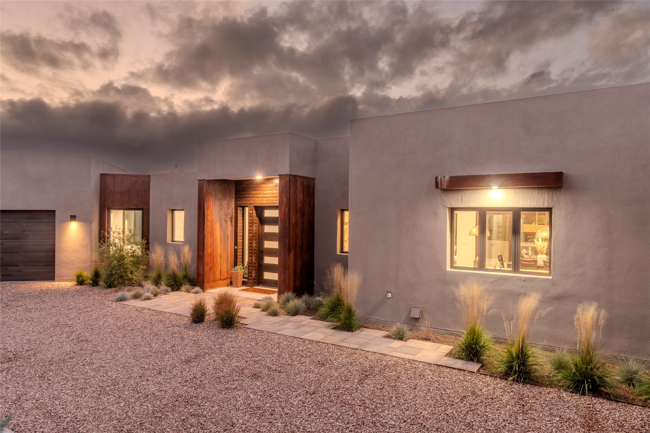 Set on an elevated 0.71-acre lot in Las Campanas, this brand-new soft contemporary home pairs clean modern lines with subtle Santa Fe style and far-reaching mountain and golf-course views. Built in 2024 by New Vista Property Solutions, the single-level 3,111 sq ft layout offers three en-suite bedrooms plus a powder room, a natural gas fireplace, and an attached two-car garage. Sculptural weathered-steel accents enrich the exterior, adding texture and architectural interest.Inside, the great room is filled with light and anchored by a generous cook's kitchen featuring handmade custom cabinetry crafted for both function and artistry. Open living and dining spaces flow easily to the outdoors, where a dramatic cantilevered rear porch creates a protected vantage point for sunrise, evening light, and year-round alfresco living.Each bedroom offers privacy and comfort with its own bath, while ductless mini-split systems provide efficient heating and cooling throughout. A membrane roof and no interior steps enhance ease of living.Located within the gated community of Las Campanas, residents enjoy beautifully maintained surroundings and 24-hour security. Membership to The Club is optional and provides access to two Jack Nicklaus Signature golf courses, a full fitness and spa center with indoor and outdoor pools, tennis and pickleball, dining at the Hacienda Clubhouse, an exceptional Equestrian Center, and miles of biking, hiking, and riding trails.
