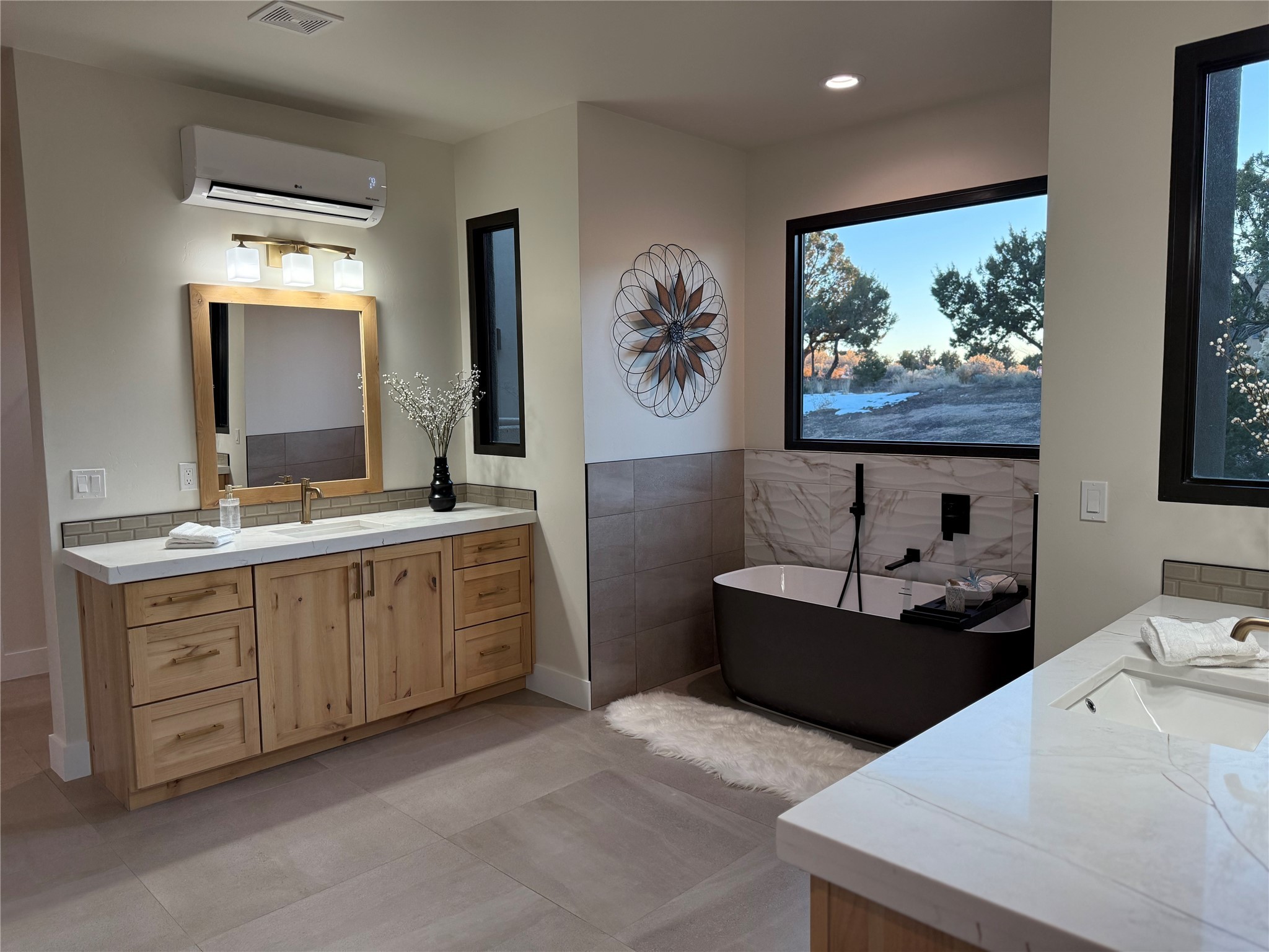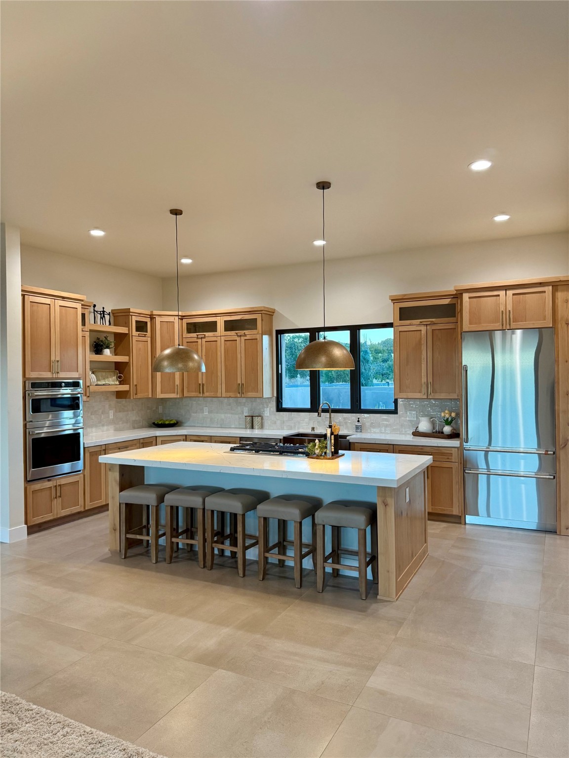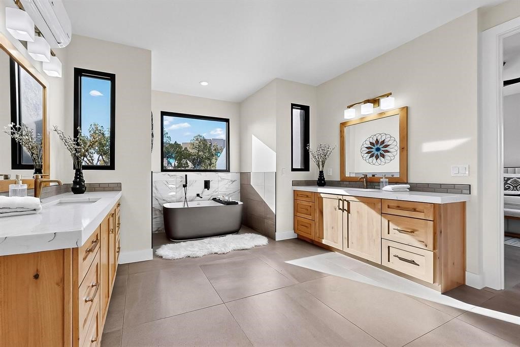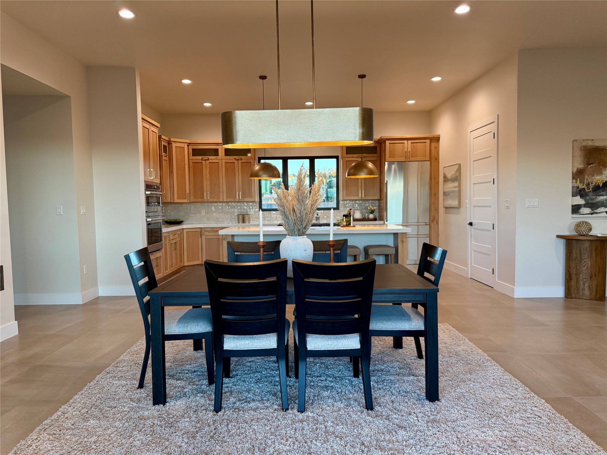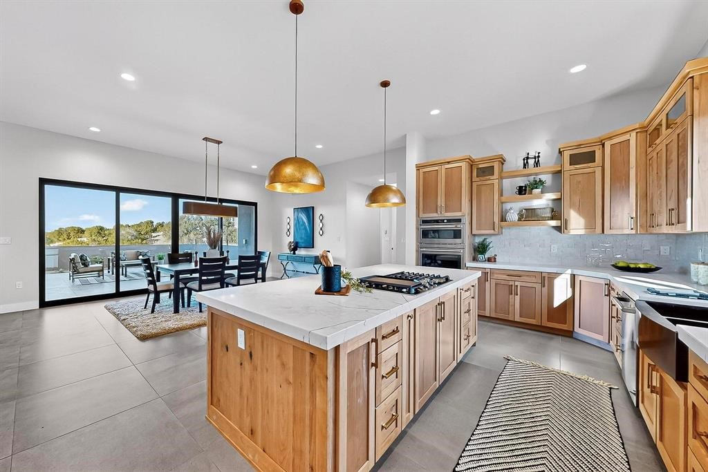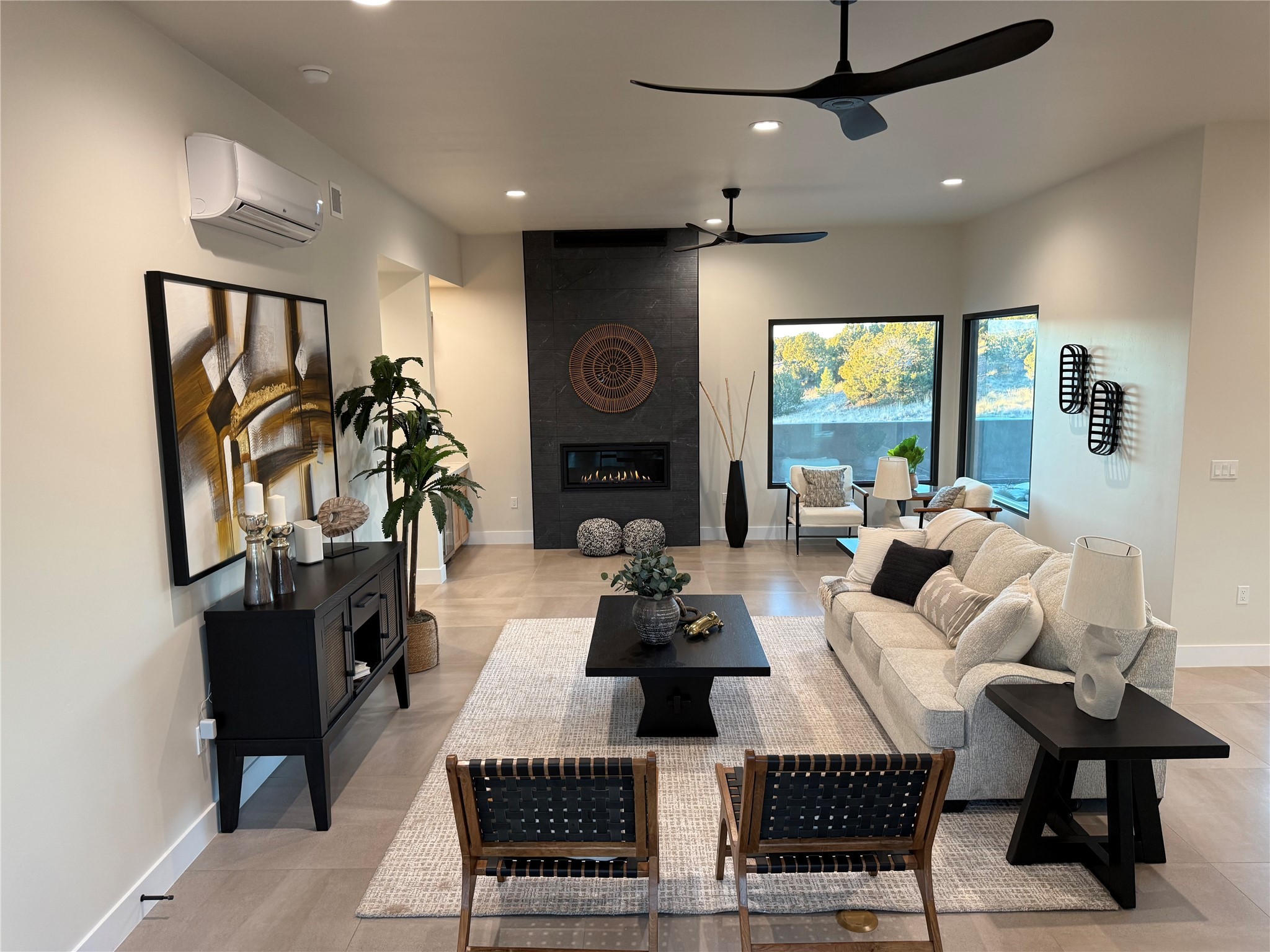 Set on an elevated 0.71-acre lot in Las Campanas, this brand-new soft contemporary home pairs clean modern lines with subtle Santa Fe style and far-reaching mountain and golf-course views. Built in 2024 by New Vista Property Solutions, the single-level 3,111 sq ft layout offers three en-suite bedrooms plus a powder room, a natural gas fireplace, and an attached two-car garage. Sculptural weathered-steel accents enrich the exterior, adding texture and architectural interest.Inside, the great room is filled with light and anchored by a generous cook's kitchen featuring handmade custom cabinetry crafted for both function and artistry. Open living and dining spaces flow easily to the outdoors, where a dramatic cantilevered rear porch creates a protected vantage point for sunrise, evening light, and year-round alfresco living.Each bedroom offers privacy and comfort with its own bath, while ductless mini-split systems provide efficient heating and cooling throughout. A membrane roof and no interior steps enhance ease of living.Located within the gated community of Las Campanas, residents enjoy beautifully maintained surroundings and 24-hour security. Membership to The Club is optional and provides access to two Jack Nicklaus Signature golf courses, a full fitness and spa center with indoor and outdoor pools, tennis and pickleball, dining at the Hacienda Clubhouse, an exceptional Equestrian Center, and miles of biking, hiking, and riding trails.