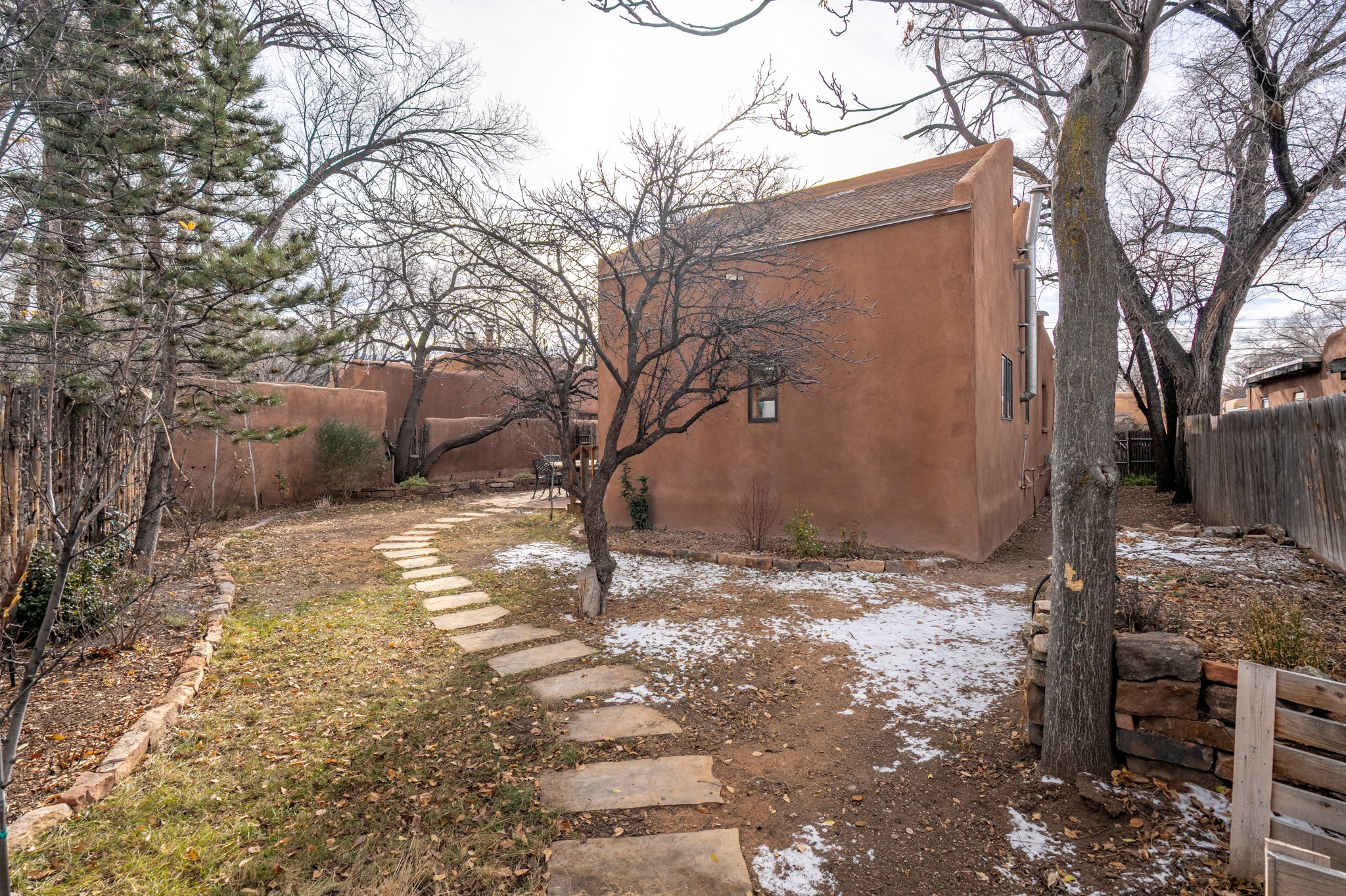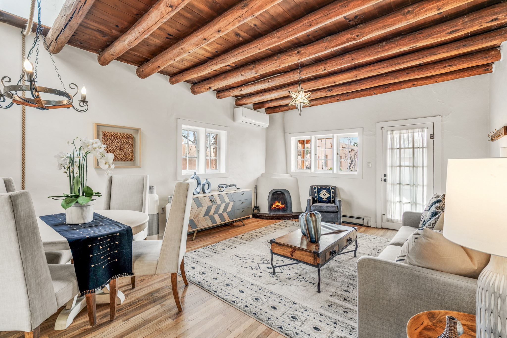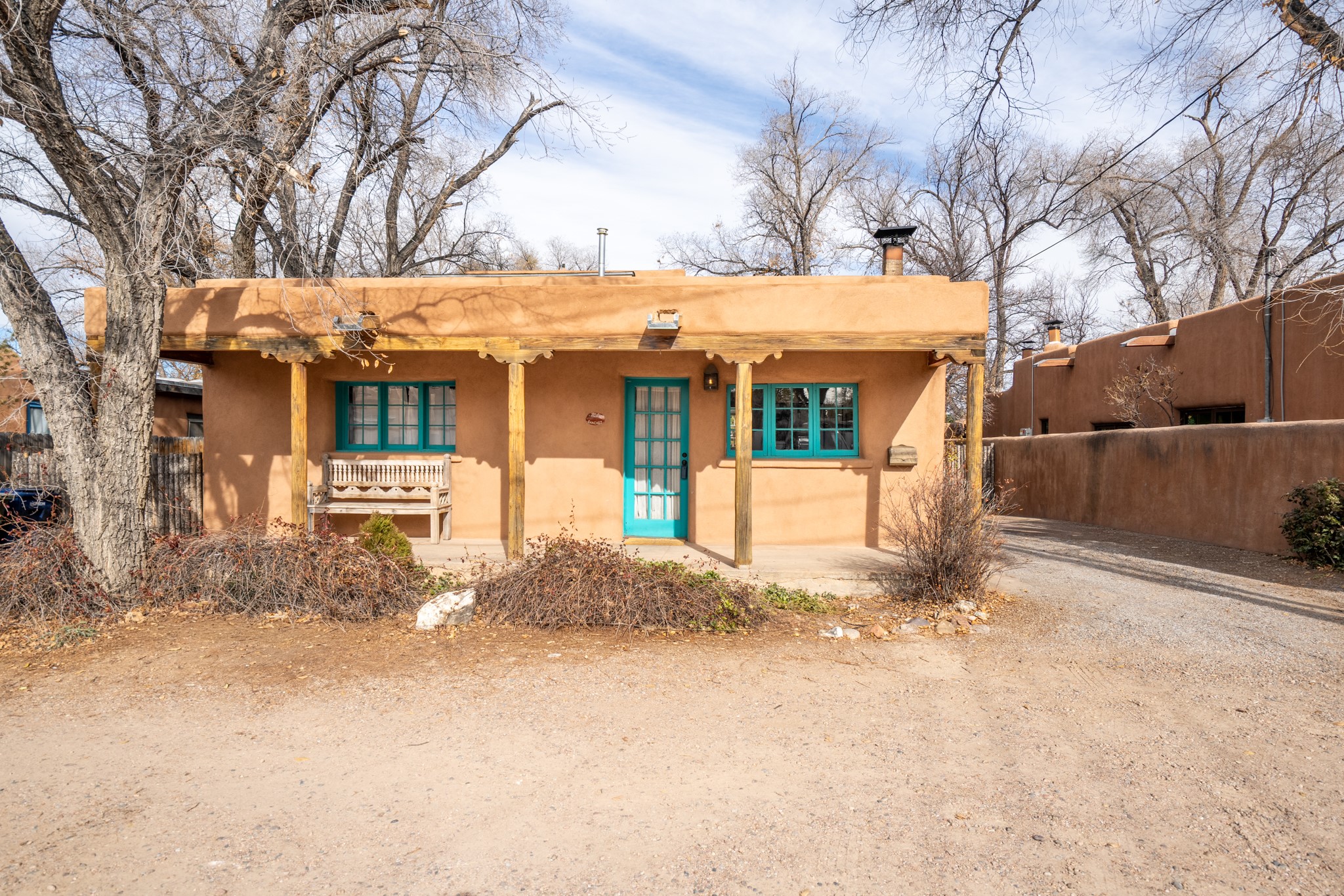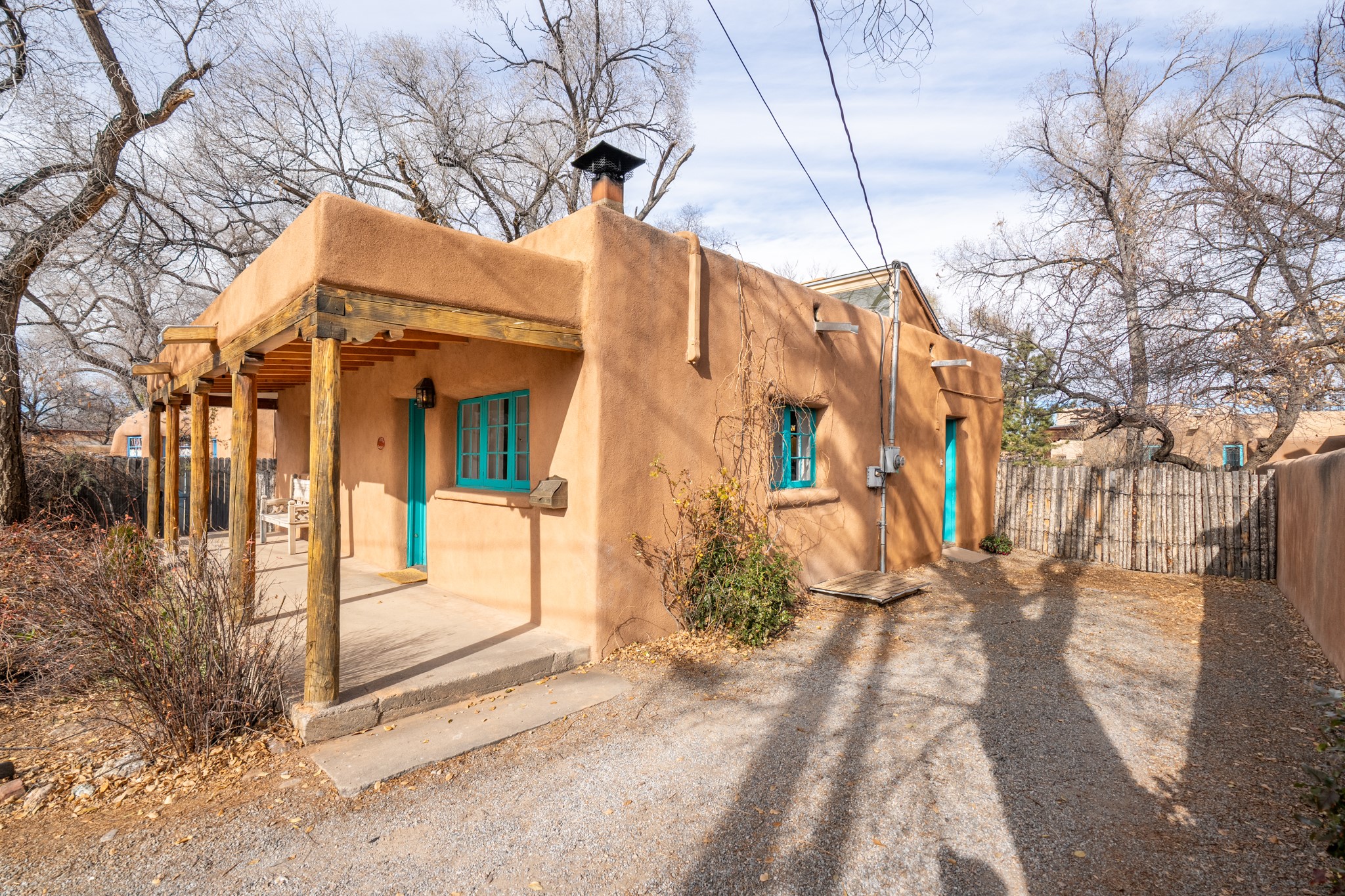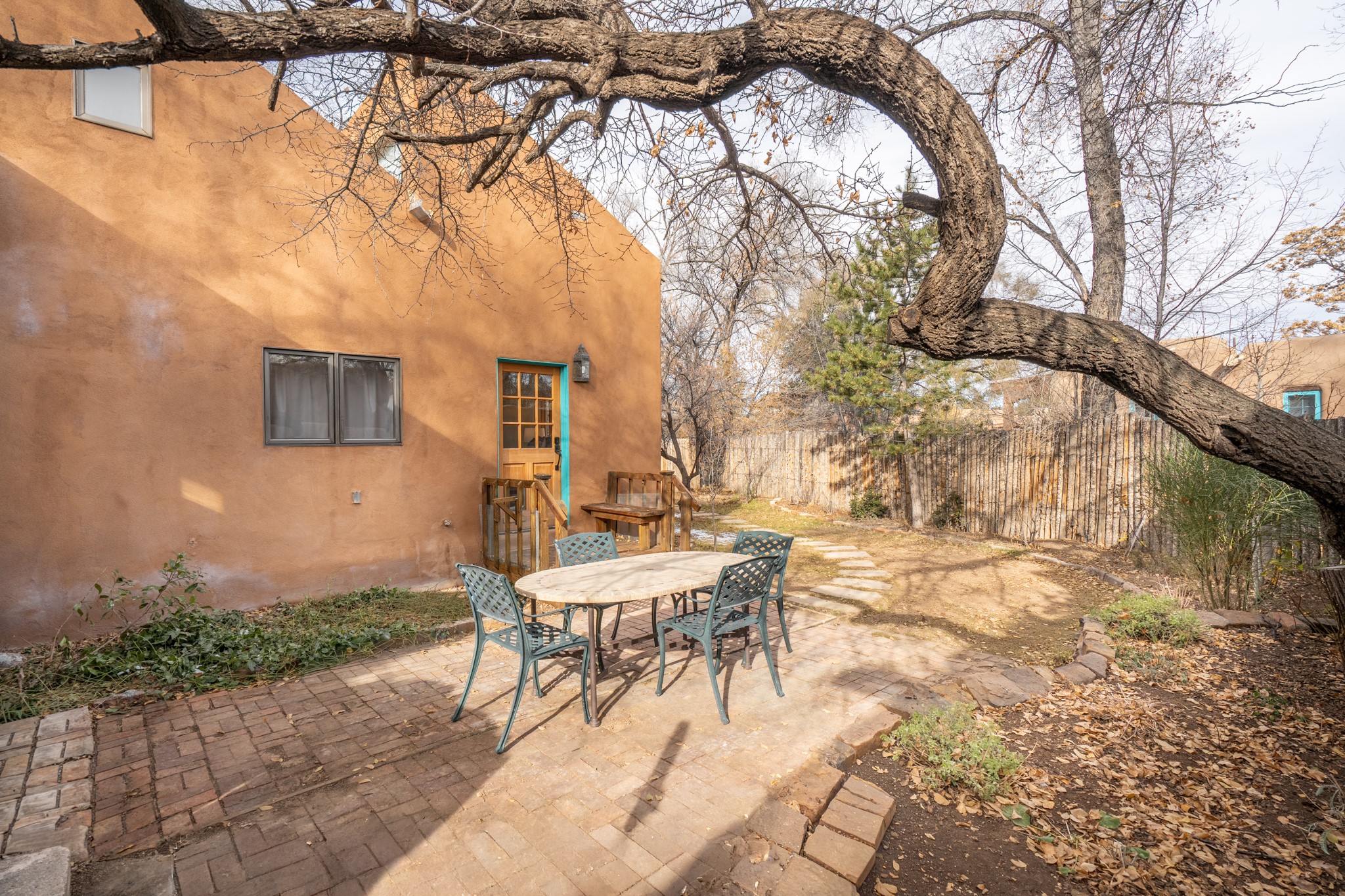Discover authentic Santa Fe charm and exceptional walkability in this sweet downtown property, perfectly situated in the heart of the Historic District. Set on a quiet, dead-end street, this inviting home offers a rare blend of privacy, character, and proximity--just moments from Canyon Road, the Plaza, grocery, neighborhood cafs, food trucks, galleries, and everyday conveniences.A lush, fully landscaped backyard provides direct access to the treasured Acequia Madre pathway, creating a serene oasis filled with mature fruit trees, including apricot, pear, and apple, all maintained by a drip-irrigation system. Enjoy a spacious, shaded back patio ideal for relaxing or entertaining, along with a welcoming front patio perfect for morning coffee.Inside, the home features 3 bedrooms and 2 baths, with classic Santa Fe finishes throughout, including newly refinished hardwood floors, divided-light windows, vigas and beams, adobe walls, and a cozy kiva fireplace. The updated kitchen offers granite countertops, new cabinetry, and newer appliances, and the primary bathroom has been tastefully remodeled. A rear addition includes a loft-style bedroom that opens directly to the backyard, creating a flexible and airy retreat.Recent improvements include fresh interior paint, a new roof with a transferable warranty, new stucco, and new mini-splits for year-round comfort. Light, bright, and thoughtfully maintained, this home captures the essence of Santa Fe living.Cozy, comfortable, and move-in ready--make this charming downtown retreat yours today.