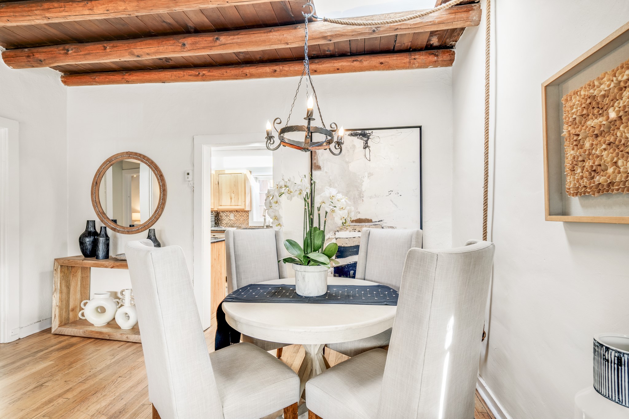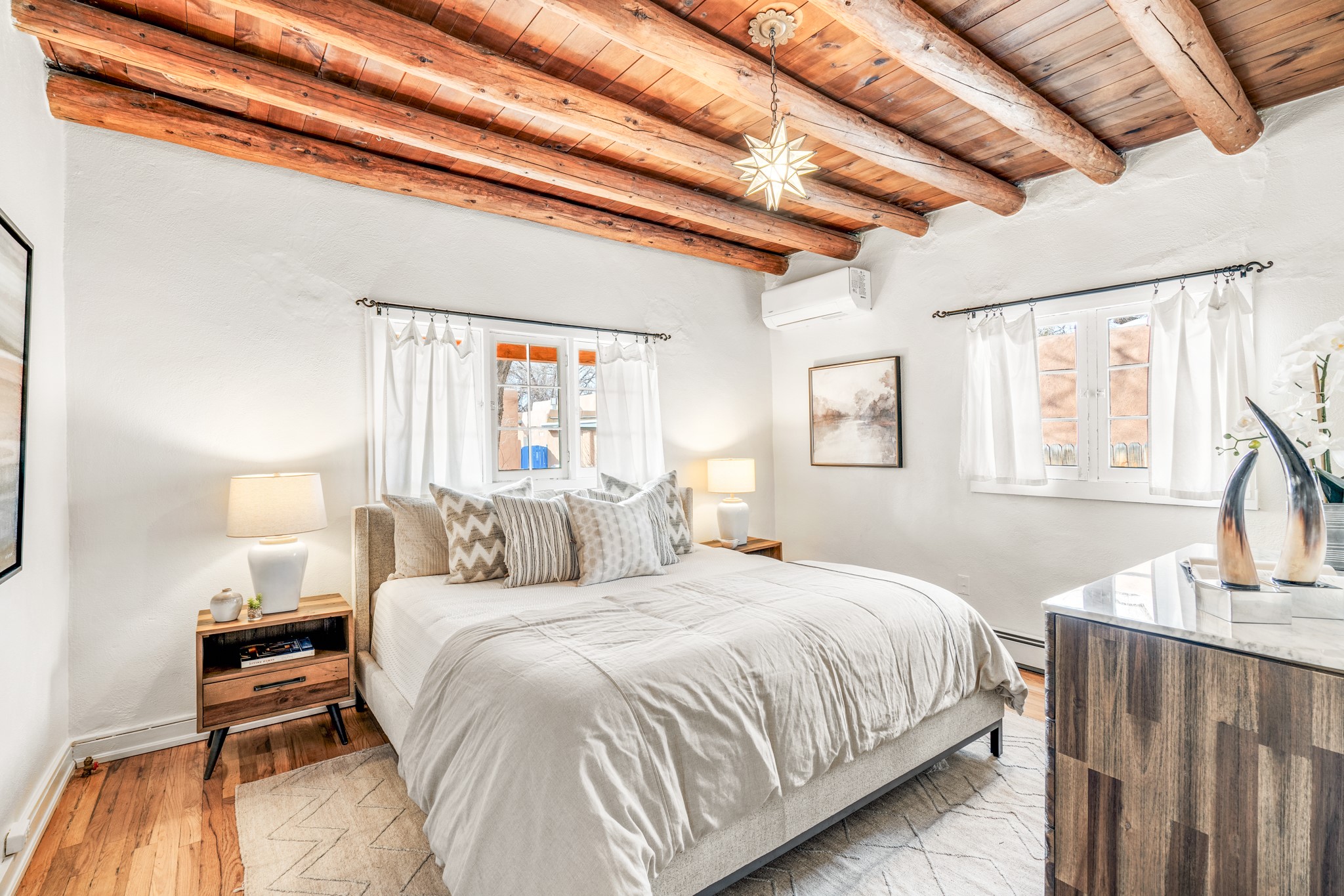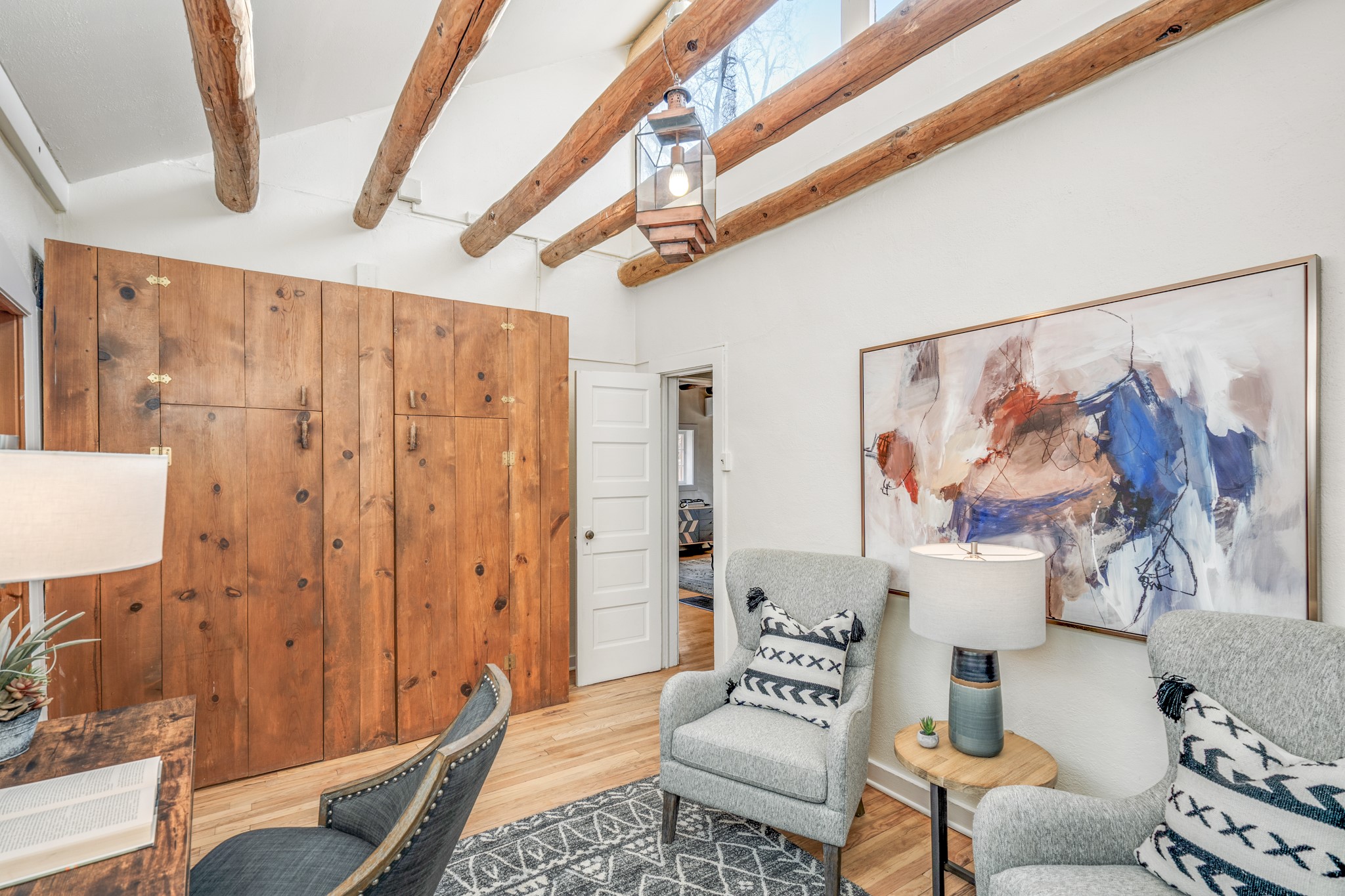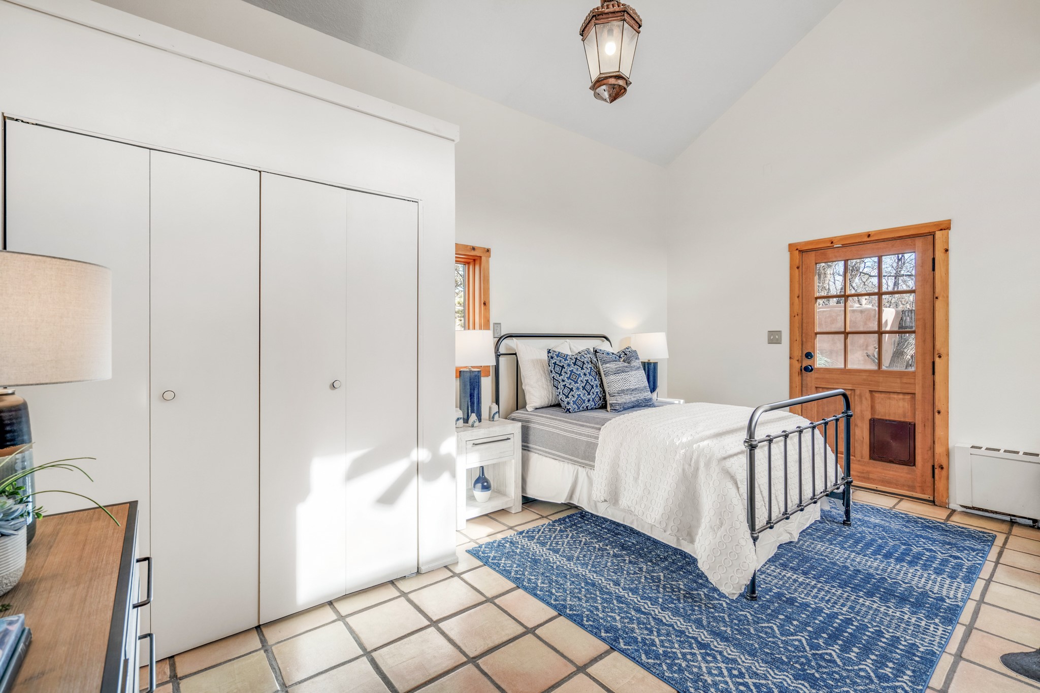 Discover authentic Santa Fe charm and exceptional walkability in this sweet downtown property, perfectly situated in the heart of the Historic District. Set on a quiet, dead-end street, this inviting home offers a rare blend of privacy, character, and proximity--just moments from Canyon Road, the Plaza, grocery, neighborhood cafs, food trucks, galleries, and everyday conveniences.A lush, fully landscaped backyard provides direct access to the treasured Acequia Madre pathway, creating a serene oasis filled with mature fruit trees, including apricot, pear, and apple, all maintained by a drip-irrigation system. Enjoy a spacious, shaded back patio ideal for relaxing or entertaining, along with a welcoming front patio perfect for morning coffee.Inside, the home features 3 bedrooms and 2 baths, with classic Santa Fe finishes throughout, including newly refinished hardwood floors, divided-light windows, vigas and beams, adobe walls, and a cozy kiva fireplace. The updated kitchen offers granite countertops, new cabinetry, and newer appliances, and the primary bathroom has been tastefully remodeled. A rear addition includes a loft-style bedroom that opens directly to the backyard, creating a flexible and airy retreat.Recent improvements include fresh interior paint, a new roof with a transferable warranty, new stucco, and new mini-splits for year-round comfort. Light, bright, and thoughtfully maintained, this home captures the essence of Santa Fe living.Cozy, comfortable, and move-in ready--make this charming downtown retreat yours today.