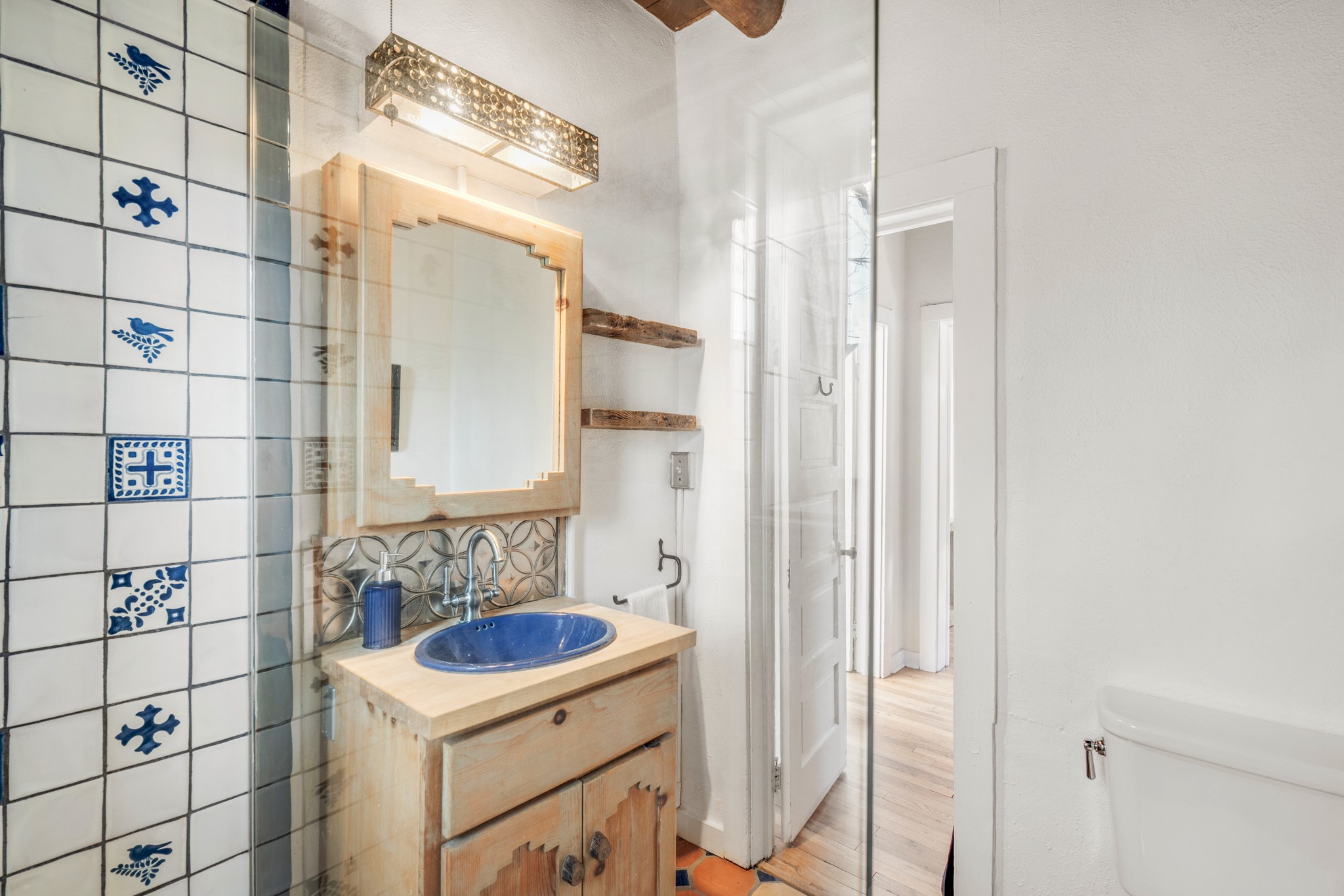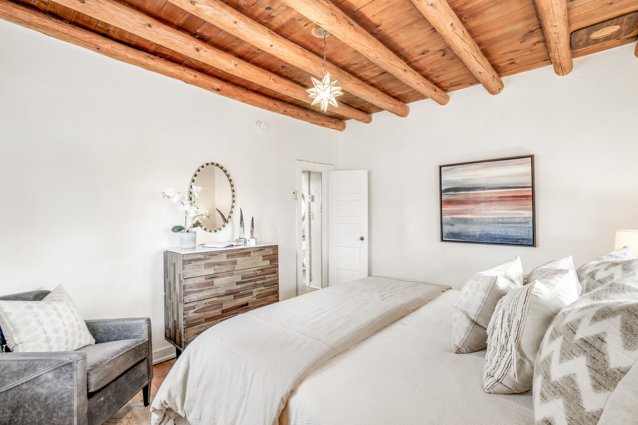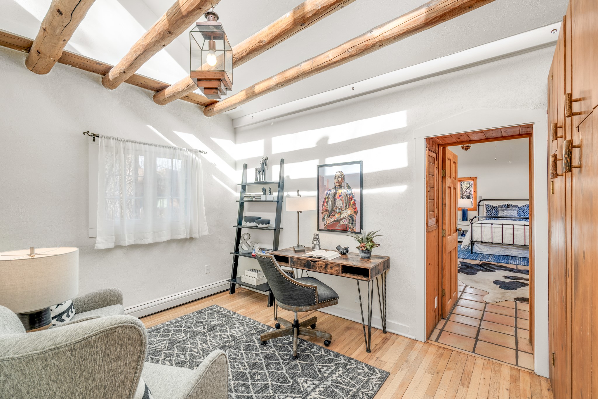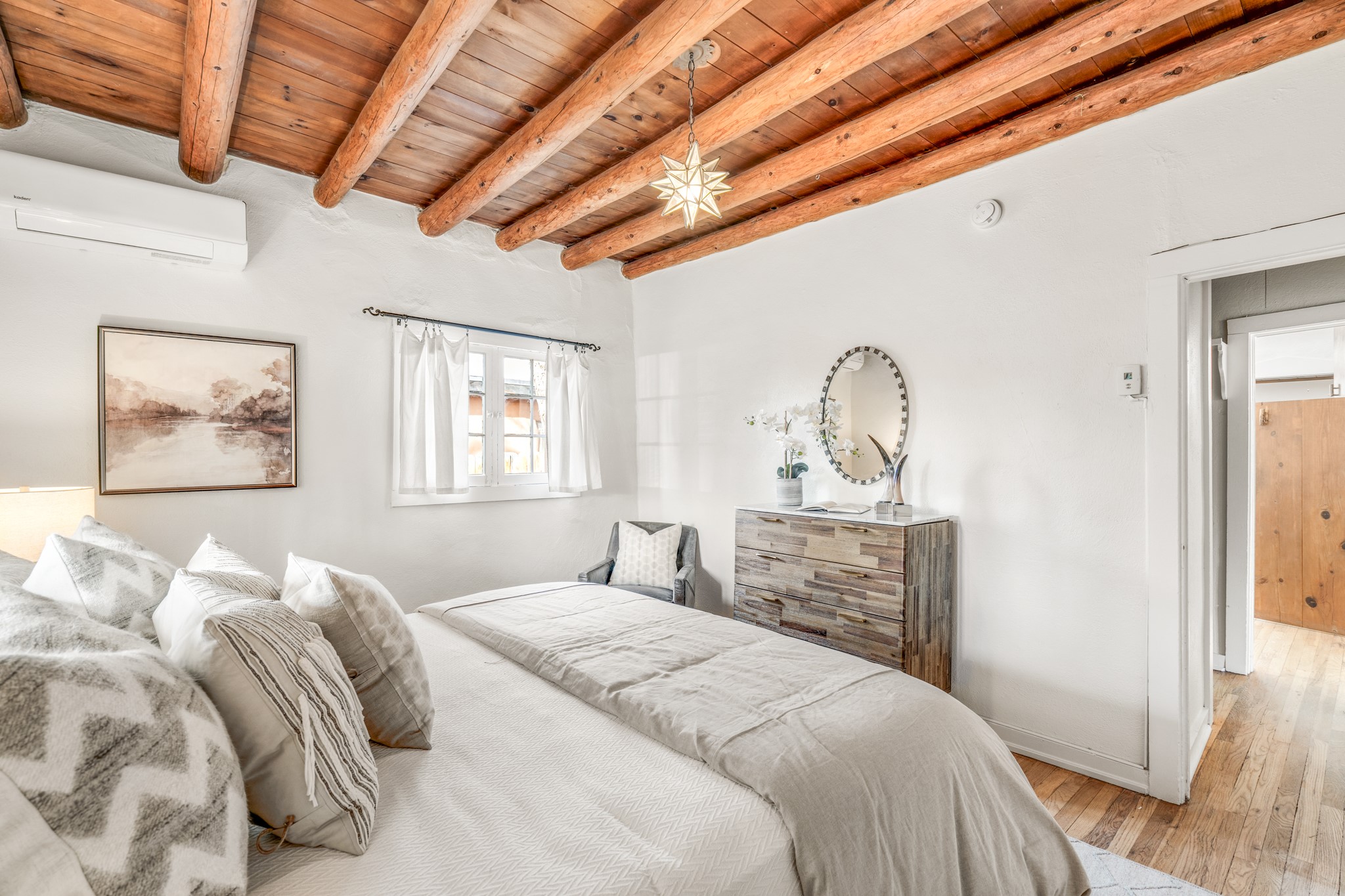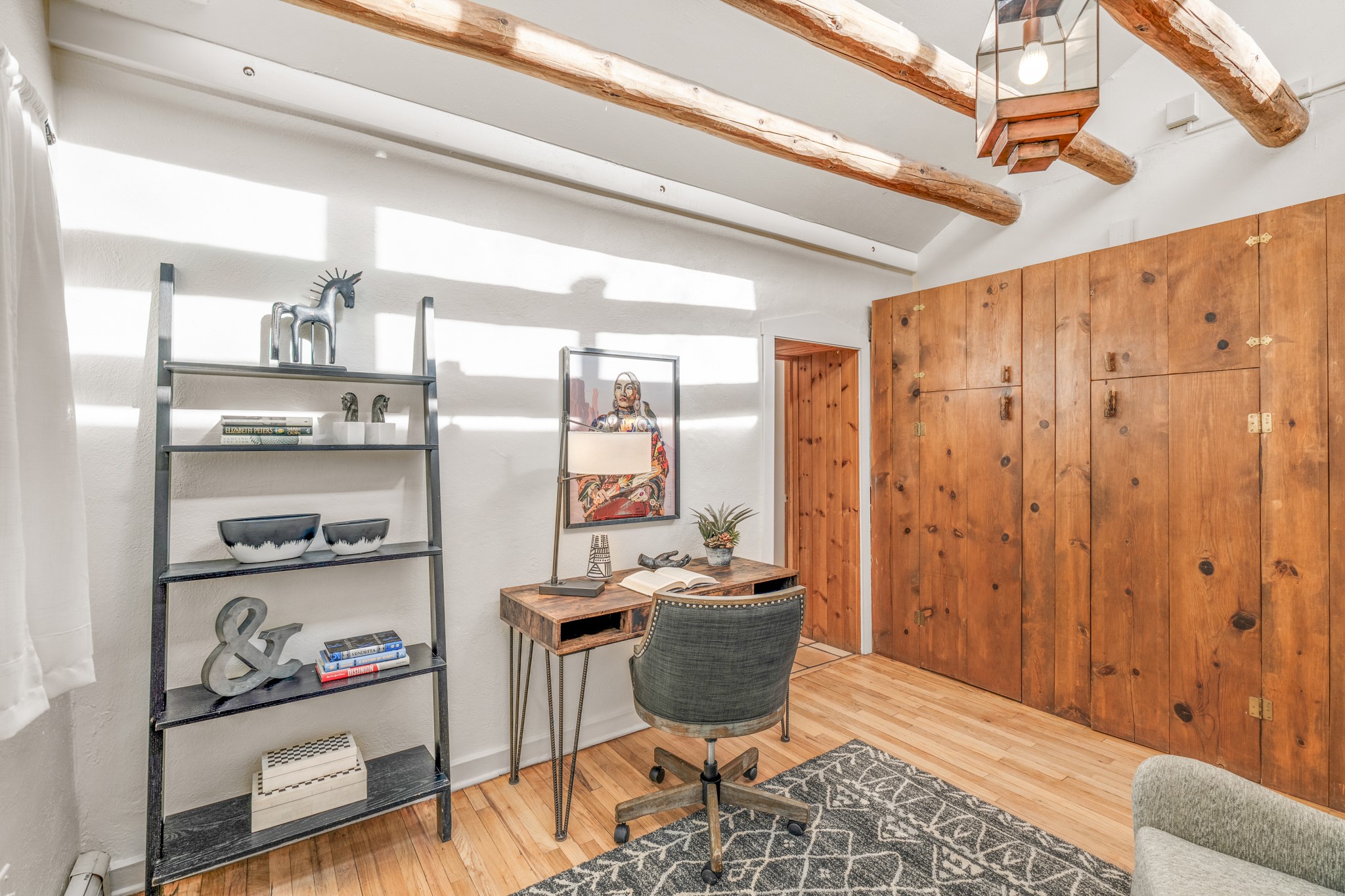 Discover authentic Santa Fe charm and exceptional walkability in this sweet downtown property, perfectly situated in the heart of the Historic District. Set on a quiet, dead-end street, this inviting home offers a rare blend of privacy, character, and proximity--just moments from Canyon Road, the Plaza, grocery, neighborhood cafs, food trucks, galleries, and everyday conveniences.A lush, fully landscaped backyard provides direct access to the treasured Acequia Madre pathway, creating a serene oasis filled with mature fruit trees, including apricot, pear, and apple, all maintained by a drip-irrigation system. Enjoy a spacious, shaded back patio ideal for relaxing or entertaining, along with a welcoming front patio perfect for morning coffee.Inside, the home features 3 bedrooms and 2 baths, with classic Santa Fe finishes throughout, including newly refinished hardwood floors, divided-light windows, vigas and beams, adobe walls, and a cozy kiva fireplace. The updated kitchen offers granite countertops, new cabinetry, and newer appliances, and the primary bathroom has been tastefully remodeled. A rear addition includes a loft-style bedroom that opens directly to the backyard, creating a flexible and airy retreat.Recent improvements include fresh interior paint, a new roof with a transferable warranty, new stucco, and new mini-splits for year-round comfort. Light, bright, and thoughtfully maintained, this home captures the essence of Santa Fe living.Cozy, comfortable, and move-in ready--make this charming downtown retreat yours today.