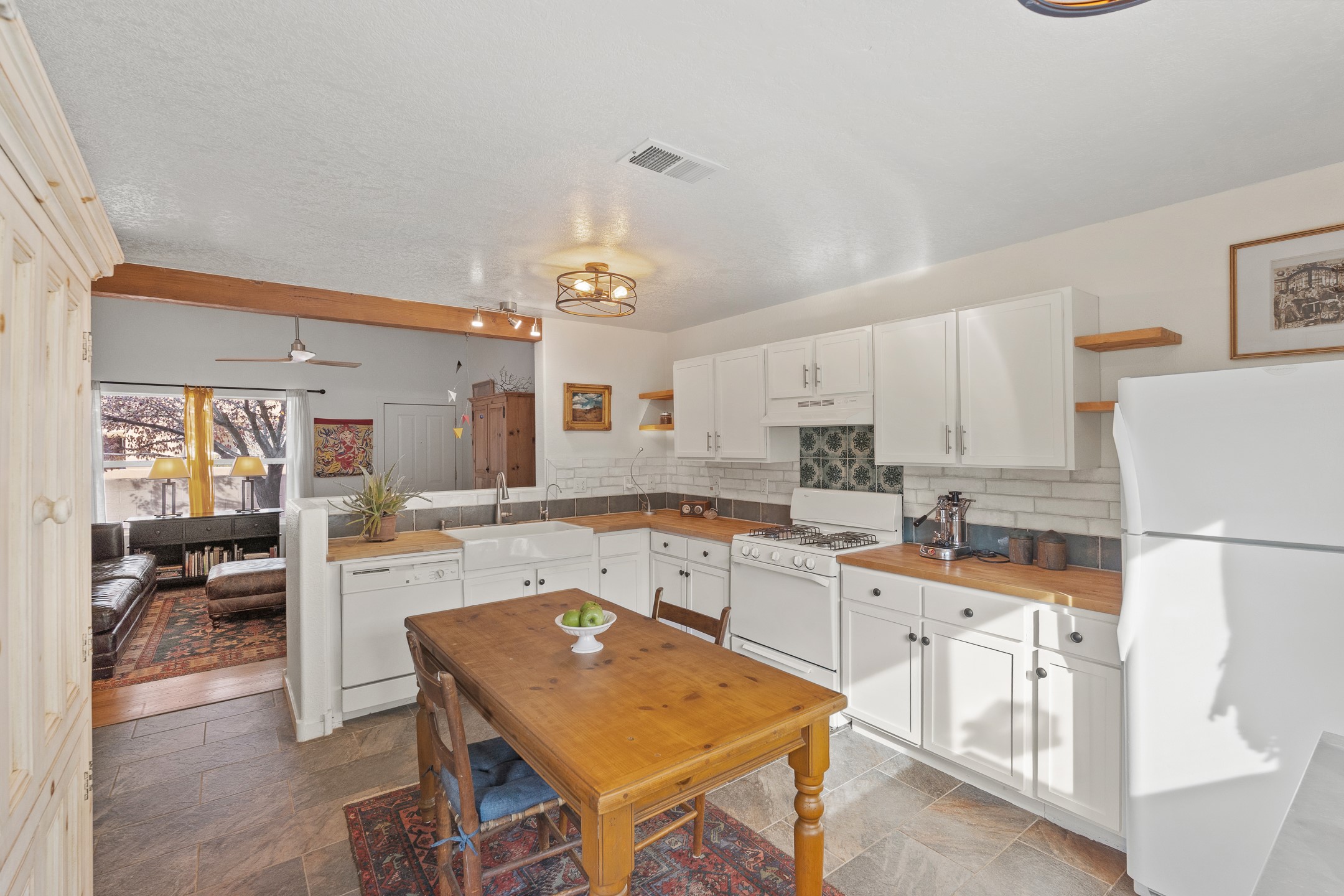 This Pueblo-style home is offered at under $400,000 and is located on an oversized corner lot in the Tierra Contenta community. The property features mature trees, native landscaping, and full fencing/walls that provide additional privacy. Inside, the home includes modern light fixtures, contemporary ceiling fans, and newer plank-style flooring. The bright eat-in kitchen includes a spacious farm sink, filtered water system, dishwasher, stove, refrigerator, stone flooring, abundant cabinetry, and room for a generously sized dining table. The insulated double garage includes a 5' double-pane window that brings in natural north light, offering versatility for various types of work or creative use. The home also features double-pane windows throughout and a membrane roof. The backyard wraps around the home and includes a flagstone patio, lavender plants, and raised beds suitable for gardening. A finished shed with a pitched roof, skylights, and French doors provides additional usable space. The shed is insulated, air-conditioned, and designed for year-round functionality. Nearby community amenities include walking and hiking trails, recreational areas, and local facilities such as the Southside Library, Swan Park, and a nearby golf course. Access to these features is convenient from the property. This home offers flexibility for a variety of uses and lifestyles, with thoughtful indoor and outdoor spaces throughout.