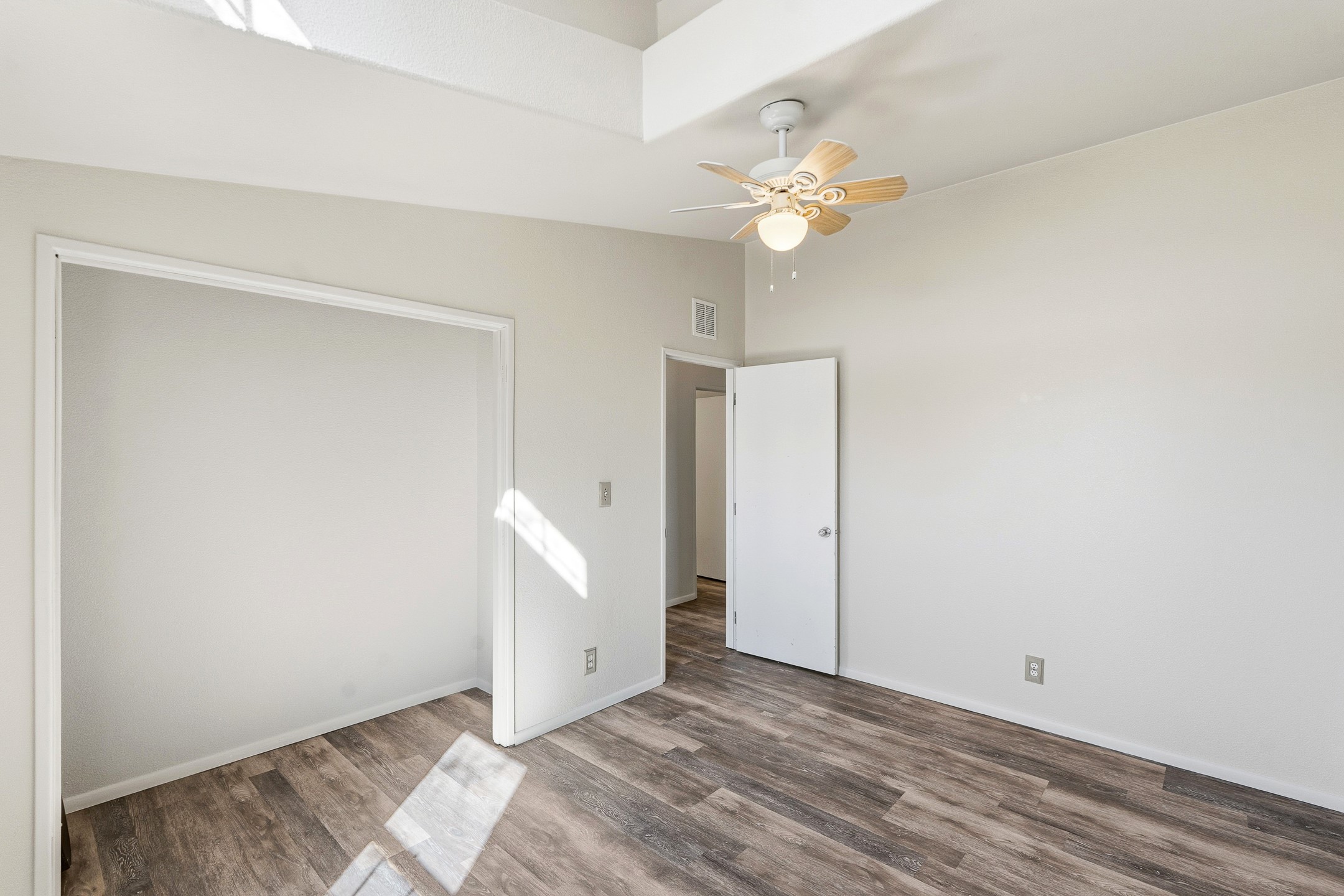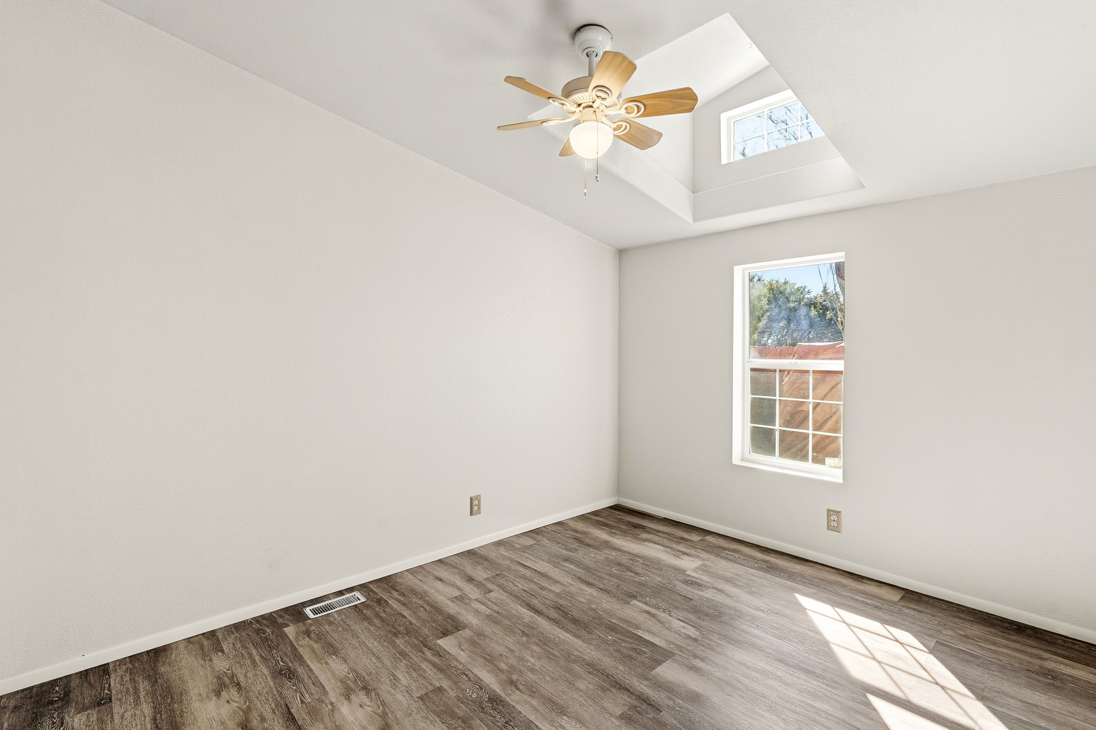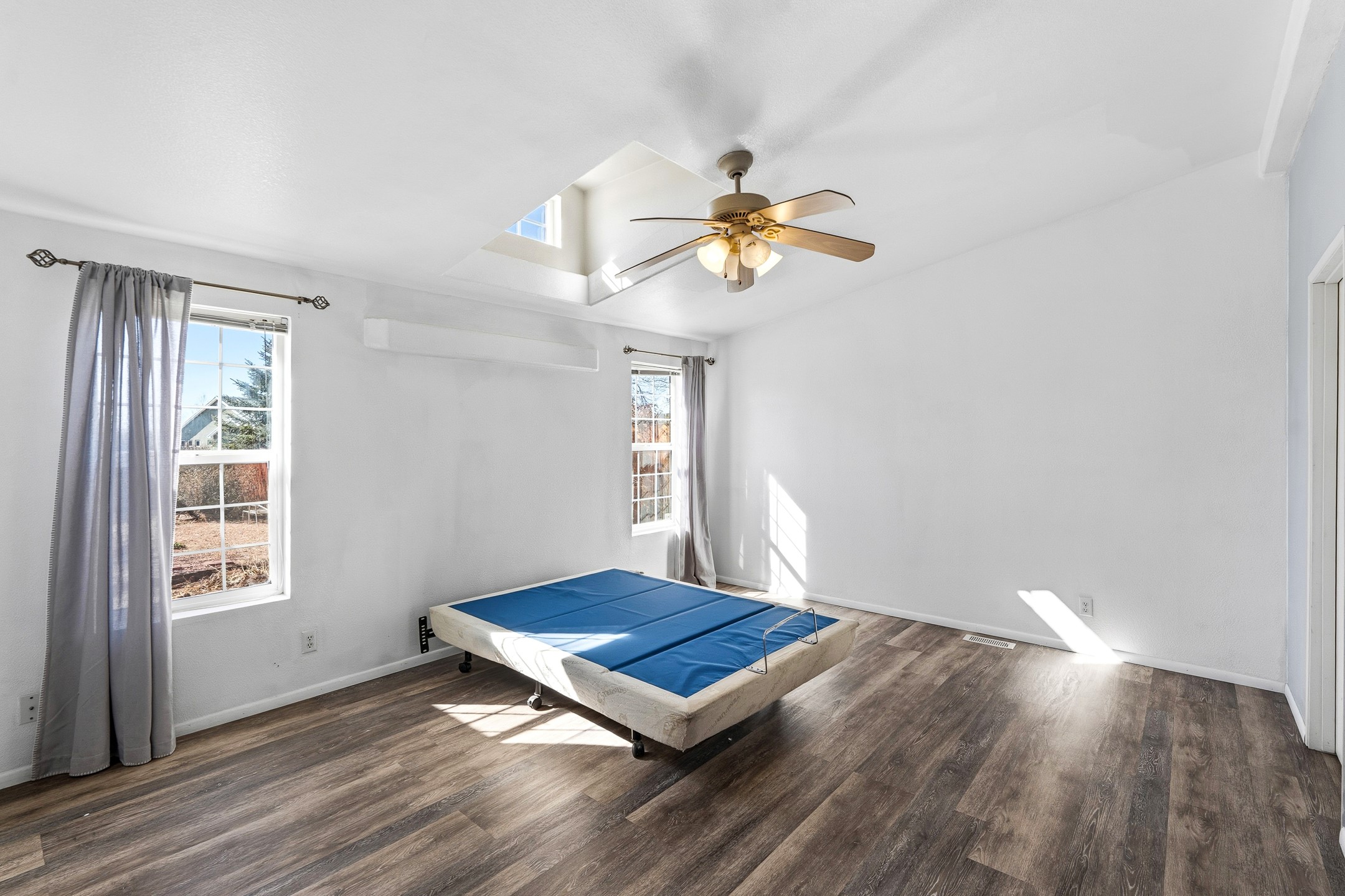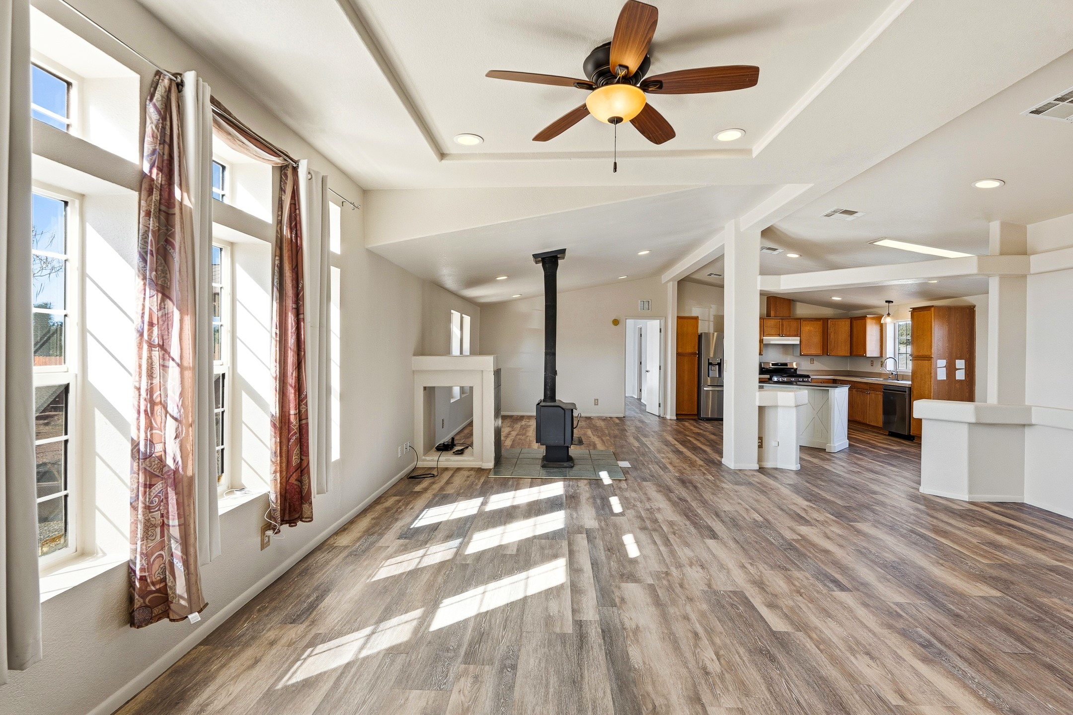 Peaceful private home in a rural setting with easy access to amenities and downtown Santa Fe. Enclosed front yard, metal roofing, refrigerated ac. Large new shop building for all your creative activities and storage. Large lot is fully fenced for your privacy and enjoyment.