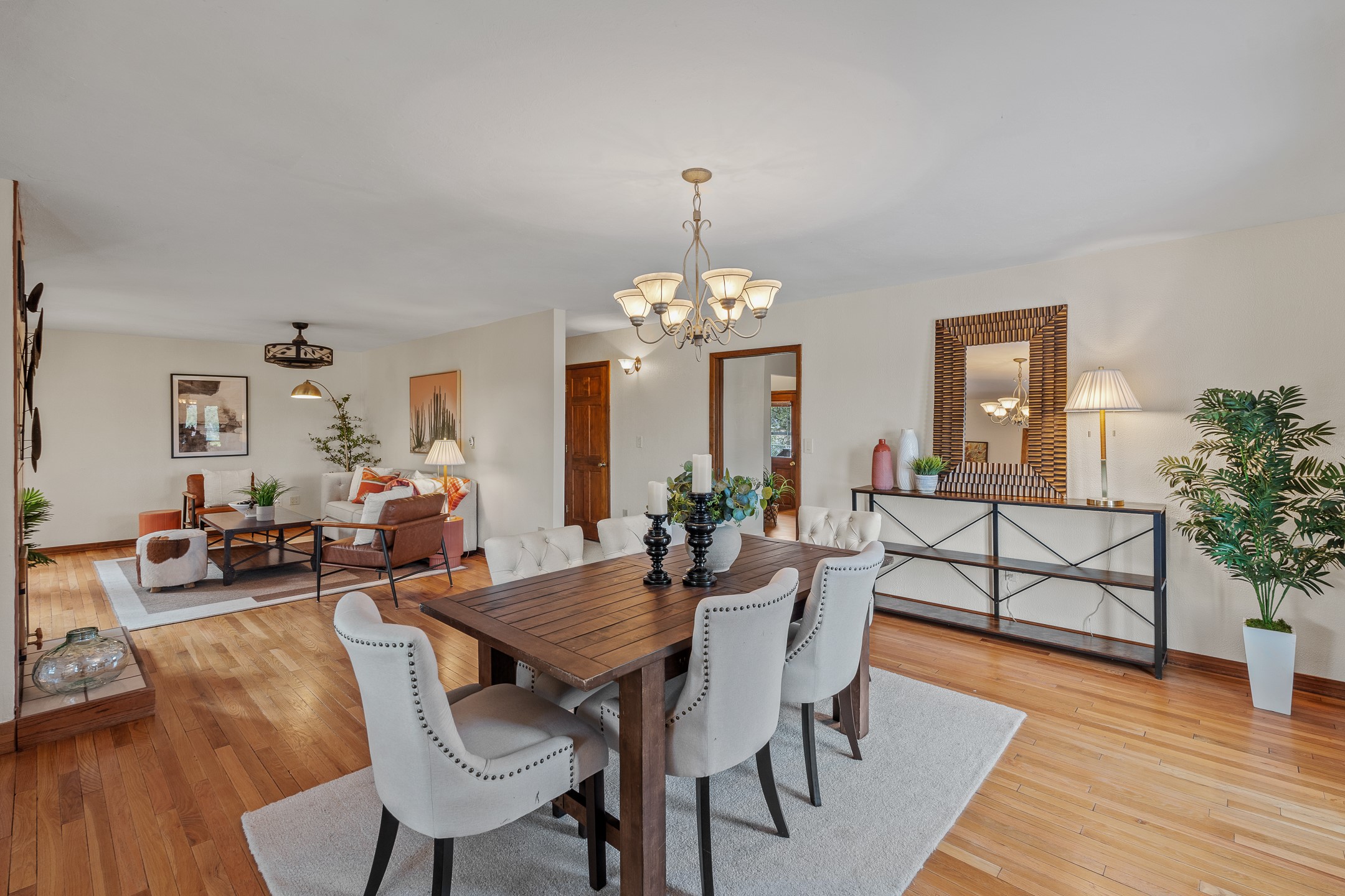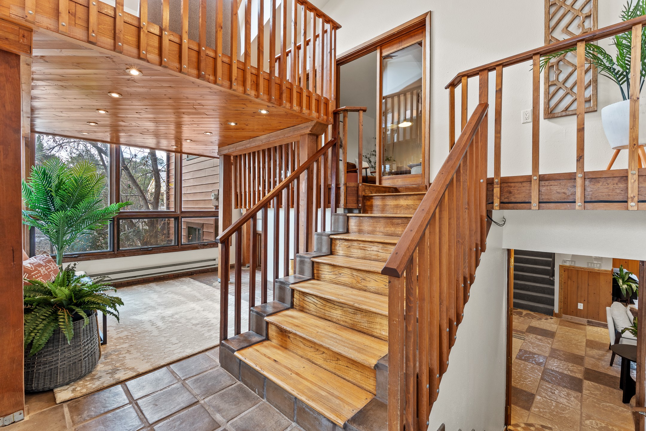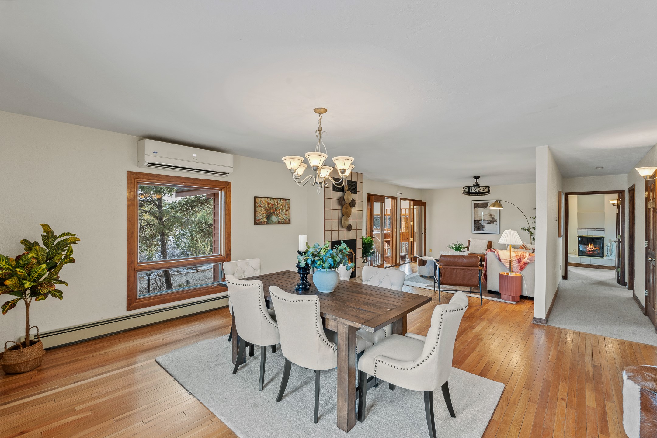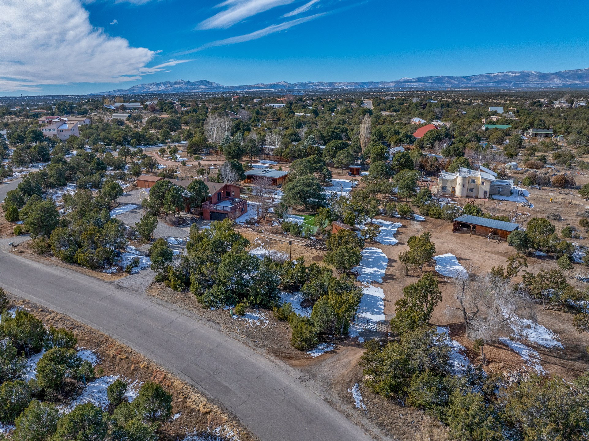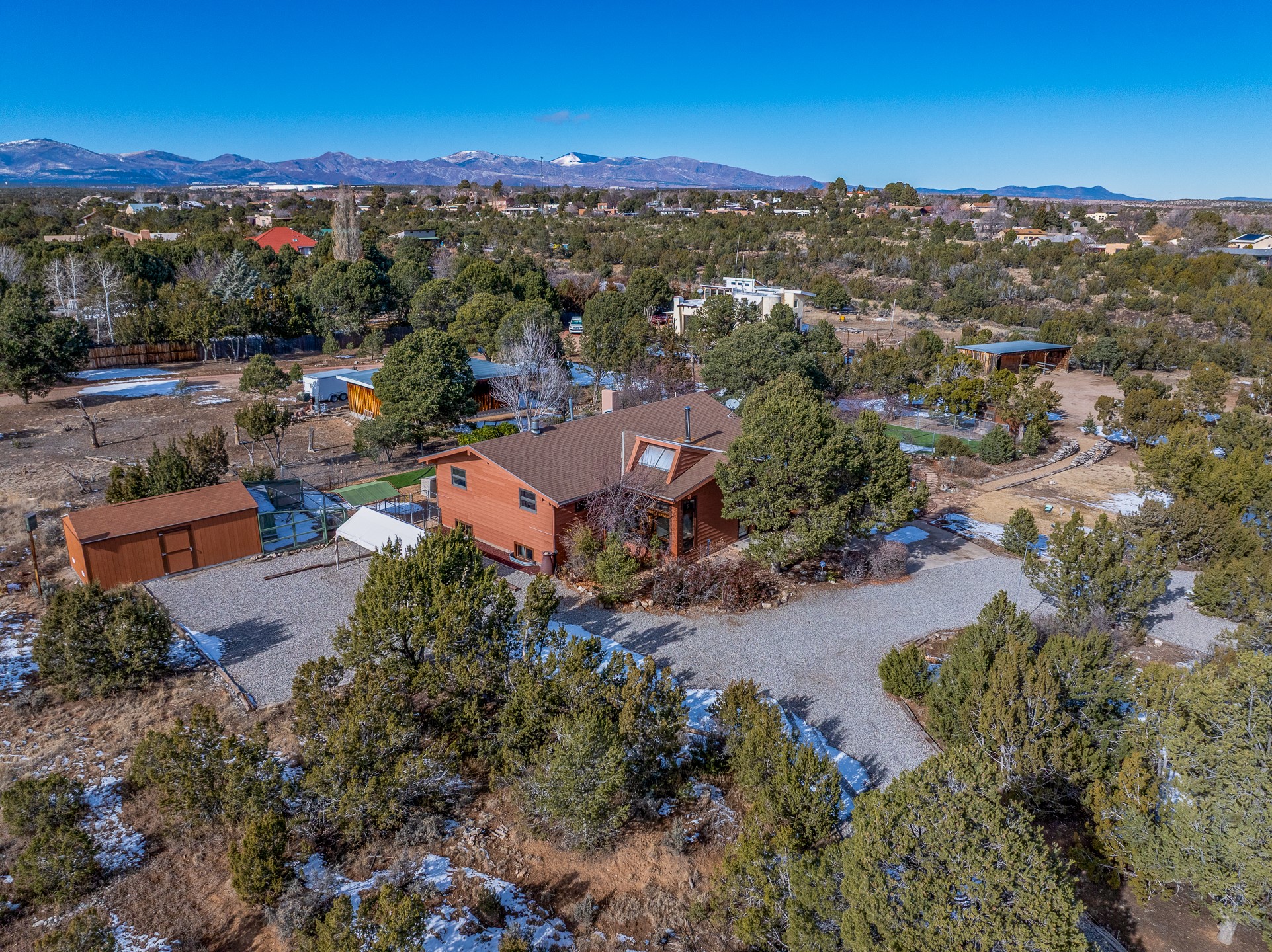 Beautifully upgraded 3,280-sq-ft home with a floor plan that provides two homes in one, set on 2+ acres, and showcasing breathtaking views of the Sangres. Welcome to 129 Piedra Loop!As you open the front door, you're immediately immersed in natural light pouring through overhead skylights, and greeted by a cheerful atrium/solarium just off the foyer. Upstairs, a loft with stunning interior views offers the perfect cozy reading retreat or flex space. Rich hardwood floors flow into the upper living area, where an ornate wood-burning fireplace anchors the open-concept layout. Adjacent to the living room is a spacious formal dining area that opens to a large Trex deck with hot tub--ideal for both summer entertaining and dark-sky stargazing.The chef's kitchen is both warm and functional, featuring a breakfast nook, custom oak cabinetry, granite countertops, a Wolf gas range, Sub-Zero refrigerator, and a corner sink positioned to take in the incredible view while preparing your gourmet meals.The south wing of the upper level is devoted to a generously-sized primary suite, thoughtfully divided by a partial wall and a stunning inset double fireplace encased in glass on three sides. The bedroom offers west- and south-facing windows to capture sunsets and mountain light, while the adjoining space--with east- and south-facing windows--makes an ideal office, gym, or private retreat. The updated ensuite bath includes a modern walk-in shower. A full guest bathroom on the main level provides added convenience for everyday living and entertaining.The lower level contains a kitchenette, laundry room, two bedrooms, and a full bathroom, providing you with multi-generational living options. Recessed lighting, stone tile, and radiant in-floor heating for quiet comfort extend throughout the lower level. A large open-concept living area features a stacked-stone hearth with wood-burning fireplace and the kitchenette, and a wine cellar is adjacent to the kitchenette. The south wing houses two generously sized bedrooms and a full bathroom with dual vanities. An extra-wide garage rounds out the lower level.Outside, enjoy privacy among mature trees and juniper, complemented by low-maintenance zero-scape landscaping. Two dog runs with synthetic turf keep pets comfortable and clean. The back of the property includes a spacious barn plus multiple outbuildings, parking areas for RVs and large trailers, and storage sheds--rounding out an exceptional package for those seeking space, views, and versatility. A carport with a Tesla charger is also available for your electric vehicles. Schedule your showing today before this one is gone!