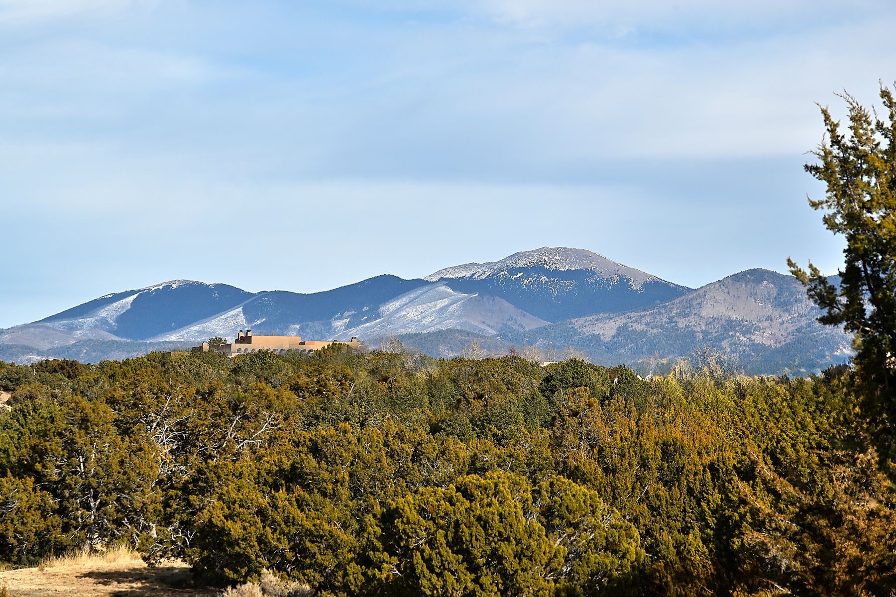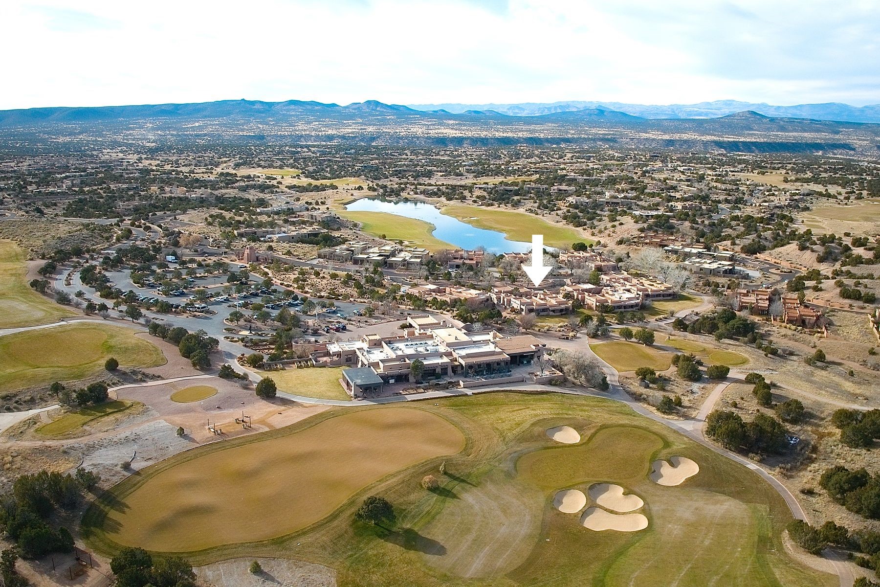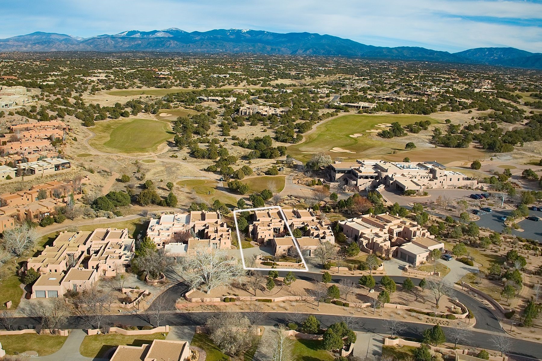 LOCATED IN THE COVETED CLUB CASITAS OF LAS CAMPANAS, THIS EXCEPTIONAL SINGLE-FAMILY RESIDENCE OFFERS THE VERY BEST OF THE LAS CAMPANAS LIFESTYLE. Situated directly across from the Sunrise Golf Course's first tee and the Las Campanas Clubhouse, this single level home provides effortless access to a very special enclave within Las Campanas, plenty of walking on trails, and world-class amenities available through Las Campanas membership (sold separately), making it ideal for those seeking both community and convenience. Designed with timeless Santa Fe style, the residence features two spacious bedroom suites, each with its own en-suite bathroom and walk-in closet, abundant built-in drawers plus shelving a built-in desk area, with a 2.5-bath layout well-suited for both primary and secondary living. A detached two-car garage is thoughtfully connected via a private, enclosed courtyard that leads to the inviting entry. Adobe/masonry construction anchors the home with authenticity and warmth, complemented by plastered walls, flagstone and wood flooring, vigas, and herringbone latilla ceiling treatments. Four traditional kiva fireplaces enhance comfort and character throughout, while a deep, covered rear portal invites year-round enjoyment of Santa Fe's temperate climate. Enjoy views of the Sangre de Cristo Mountains and the golf course, providing a serene and picturesque backdrop from the owners' suite. A refined lock-and-leave retreat or a full-time residence, this Club Casita presents a rare opportunity to experience one of Santa Fe's most desirable communities at its finest.