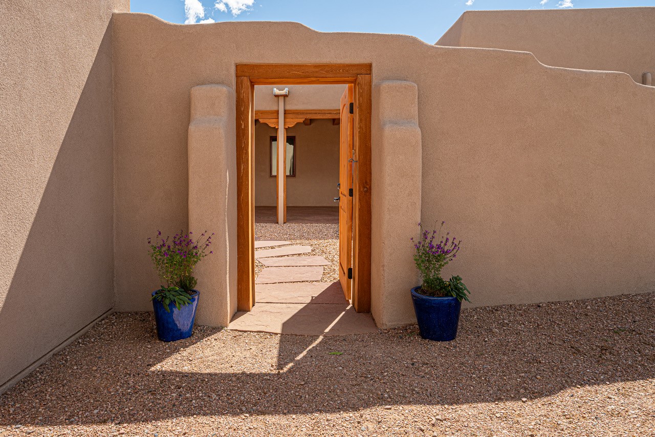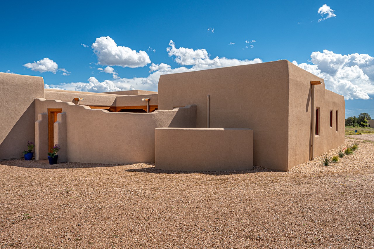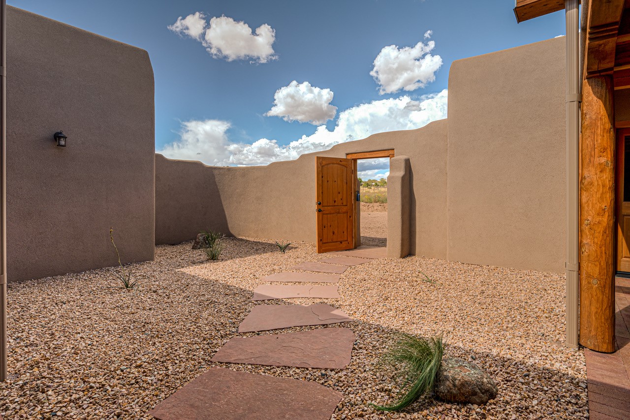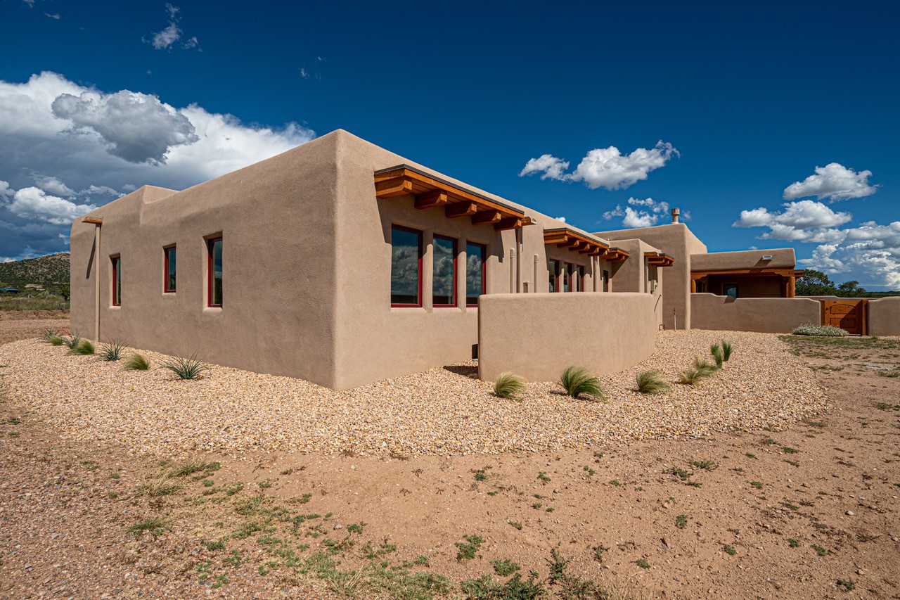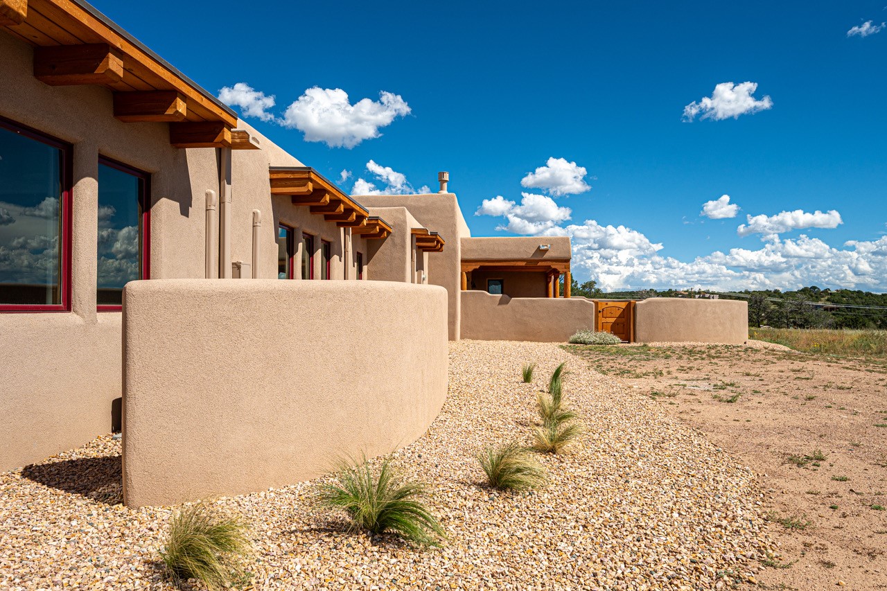 Outstanding quality in this Adobe contemporary pueblo masterpiece built by one of Santa Fe's premier adobe builders, Jeff Fagley of Shaylube Construction. This home has never been lived in, is waiting for the first owner to enjoy. Open plan design with dramatic corbelled beam ceiling and Kiva fireplace in great room, tiled floors and gleaming thick smooth plastered walls throughout complement the classic elements of Santa Fe style. Spacious bright and light feel with high ceilings throughout. Large owners suite with walk in closet, separate office/den and private walled portal. The separate guest guest suite includes a large den which accesses to the portalled private courtyard. Natural gas radiant heat plus 5 mini splits for heating and cooling complement the radiant in floor heating and passive solar design. A sunny chefs kitchen with butlers pantry and large central island, a large formal dining area opens to the wrap-around portal for private outside dining and entertainment. The walled courtyard entry also provides access to both main home and guest quarters. There is a second privacy walled south courtyard with bricked portals accessed from living room and master suite also excellent for sunset mountain viewing. Roof drainage to 2 cisterns already installed underground which catches the rainfall for landscaping. A large 3 car garage for lots of toys or hobbies, plenty of guest parking and lovely views with 7+acres to enjoy. Horses allowed. Enjoy access to local Eldorado area shopping, schools, senior center and library plus only minutes into Santa Fe.