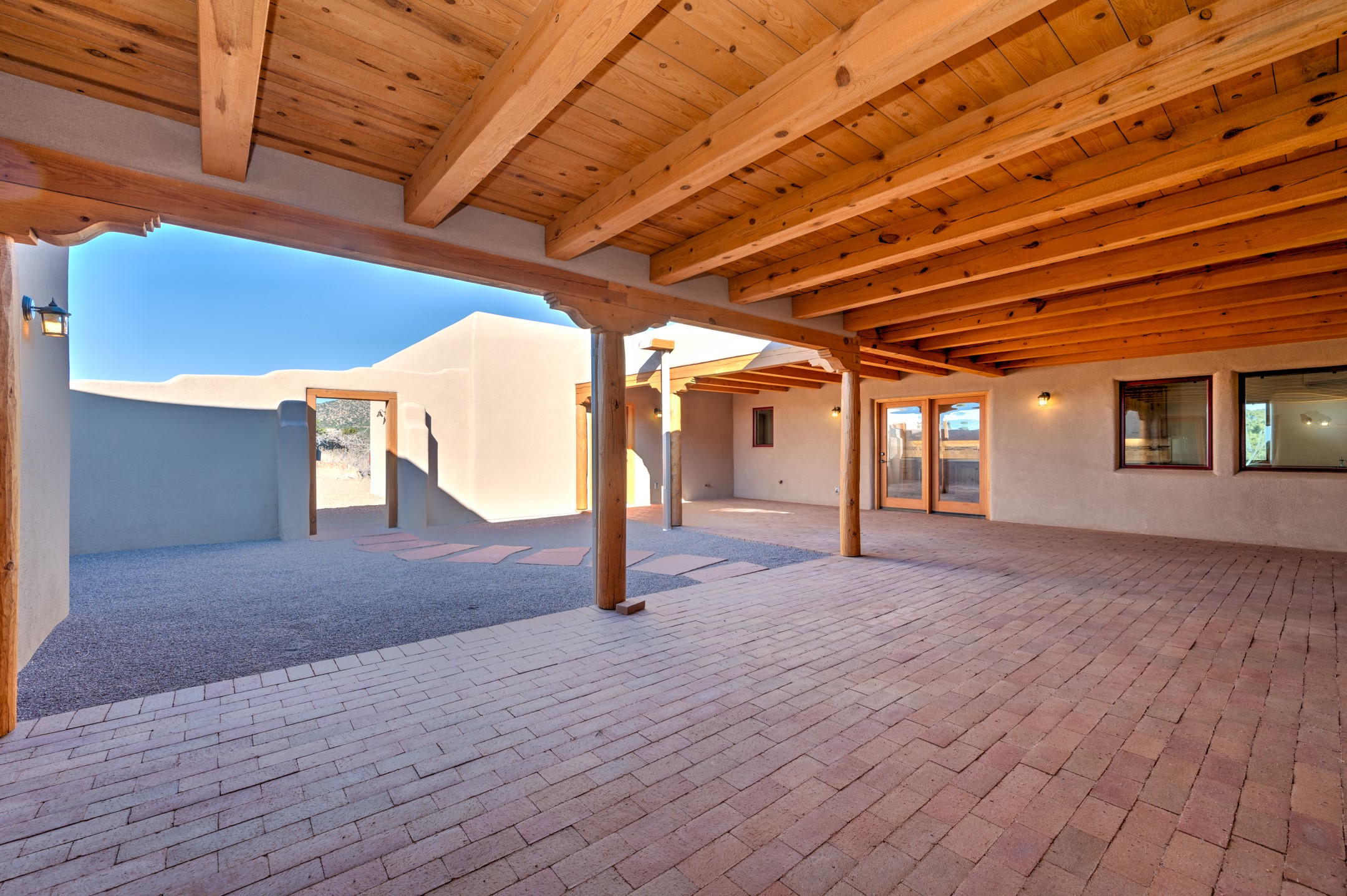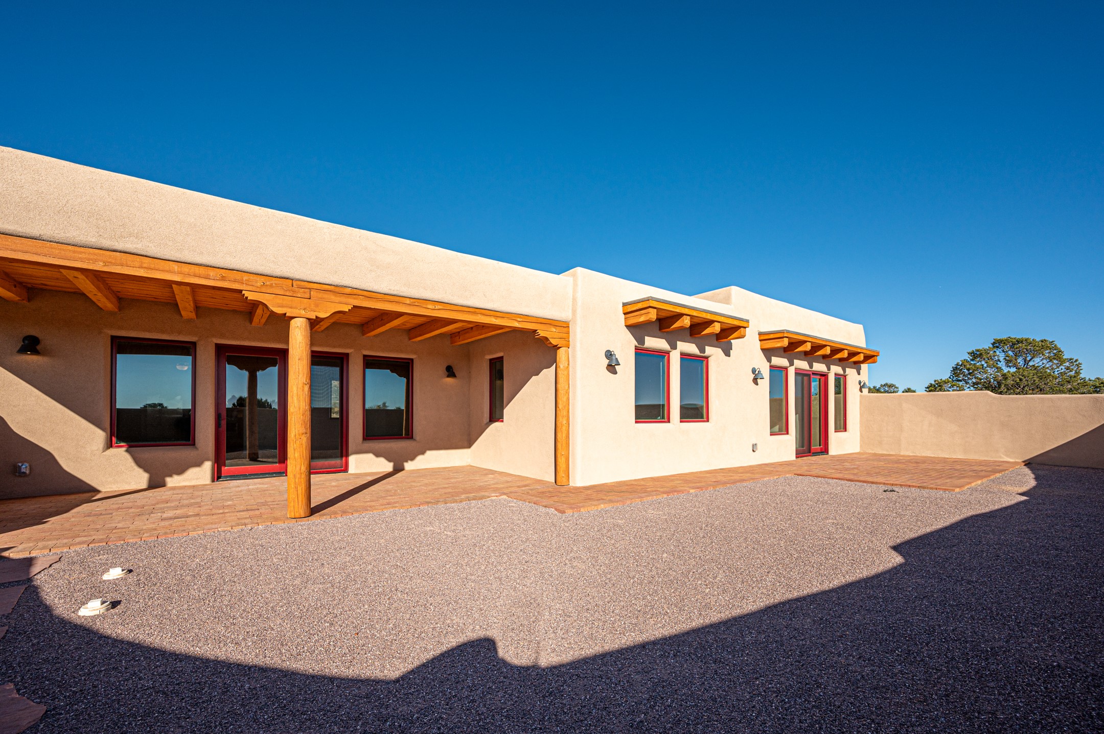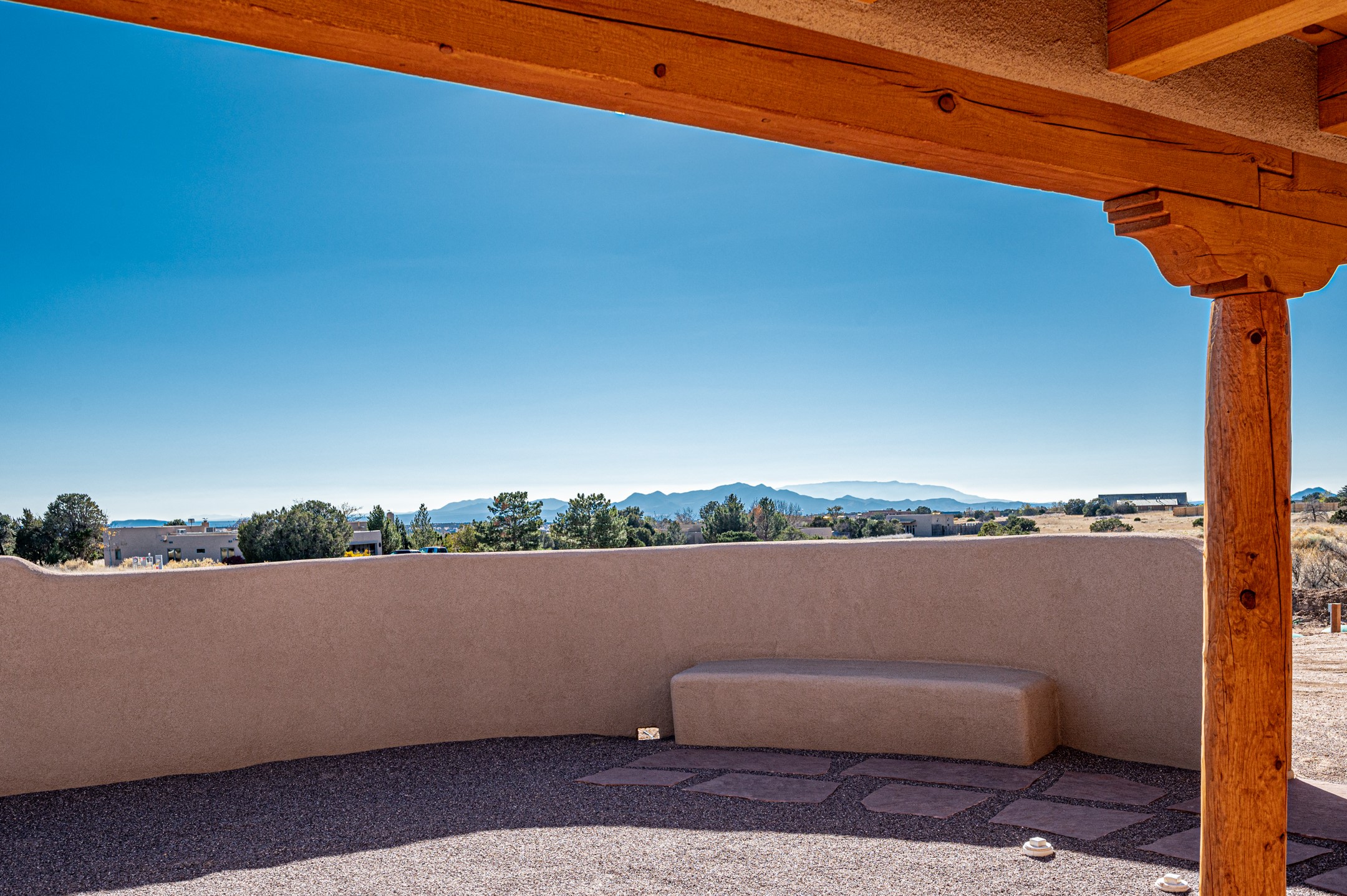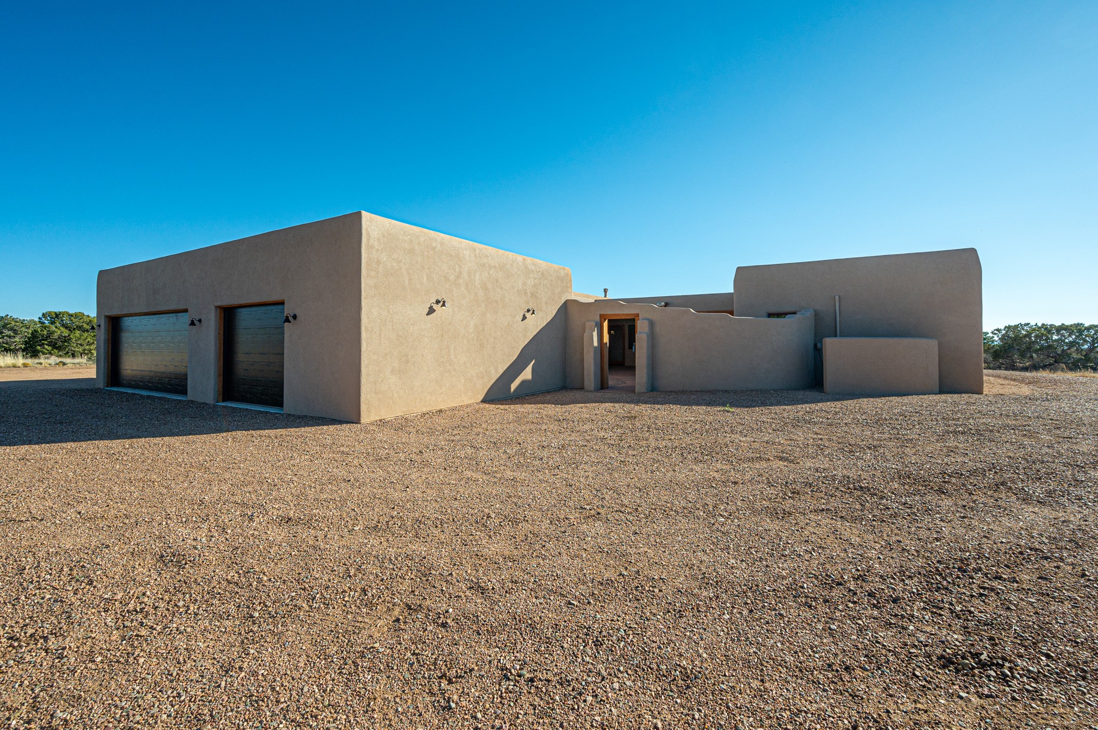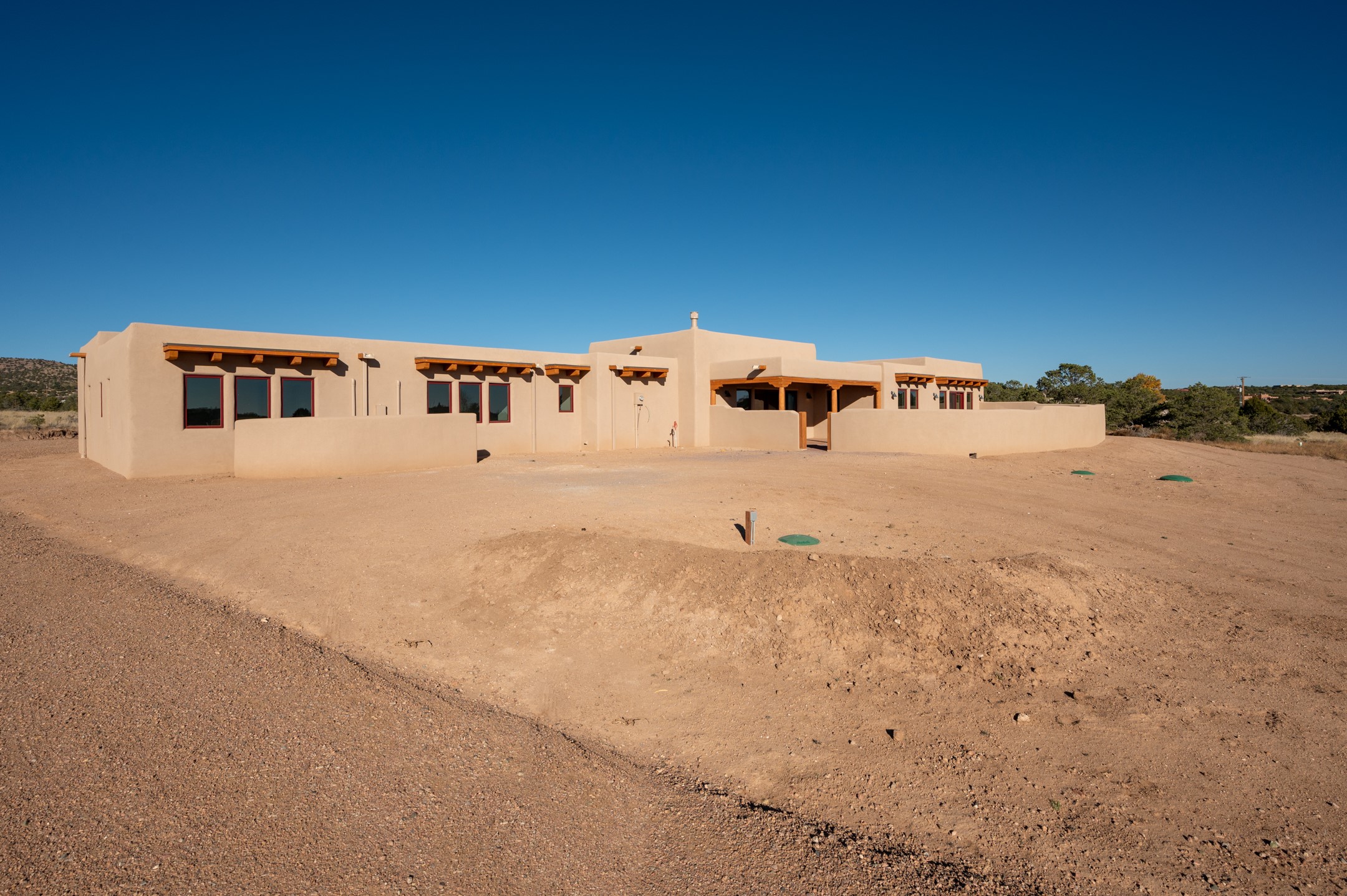Outstanding quality in this Adobe contemporary pueblo masterpiece built by one of Santa Fe's premier adobe builders, Jeff Fagley of Shaylube Construction. This home has never been lived in, is waiting for the first owner to enjoy. Open plan design with dramatic corbelled beam ceiling and Kiva fireplace in great room, tiled floors and gleaming thick smooth plastered walls throughout complement the classic elements of Santa Fe style. Spacious bright and light feel with high ceilings throughout. Large owners suite with walk in closet, separate office/den and private walled portal. The separate guest guest suite includes a large den which accesses to the portalled private courtyard. Natural gas radiant heat plus 5 mini splits for heating and cooling complement the radiant in floor heating and passive solar design. A sunny chefs kitchen with butlers pantry and large central island, a large formal dining area opens to the wrap-around portal for private outside dining and entertainment. The walled courtyard entry also provides access to both main home and guest quarters. There is a second privacy walled south courtyard with bricked portals accessed from living room and master suite also excellent for sunset mountain viewing. Roof drainage to 2 cisterns already installed underground which catches the rainfall for landscaping. A large 3 car garage for lots of toys or hobbies, plenty of guest parking and lovely views with 7+acres to enjoy. Horses allowed. Enjoy access to local Eldorado area shopping, schools, senior center and library plus only minutes into Santa Fe.