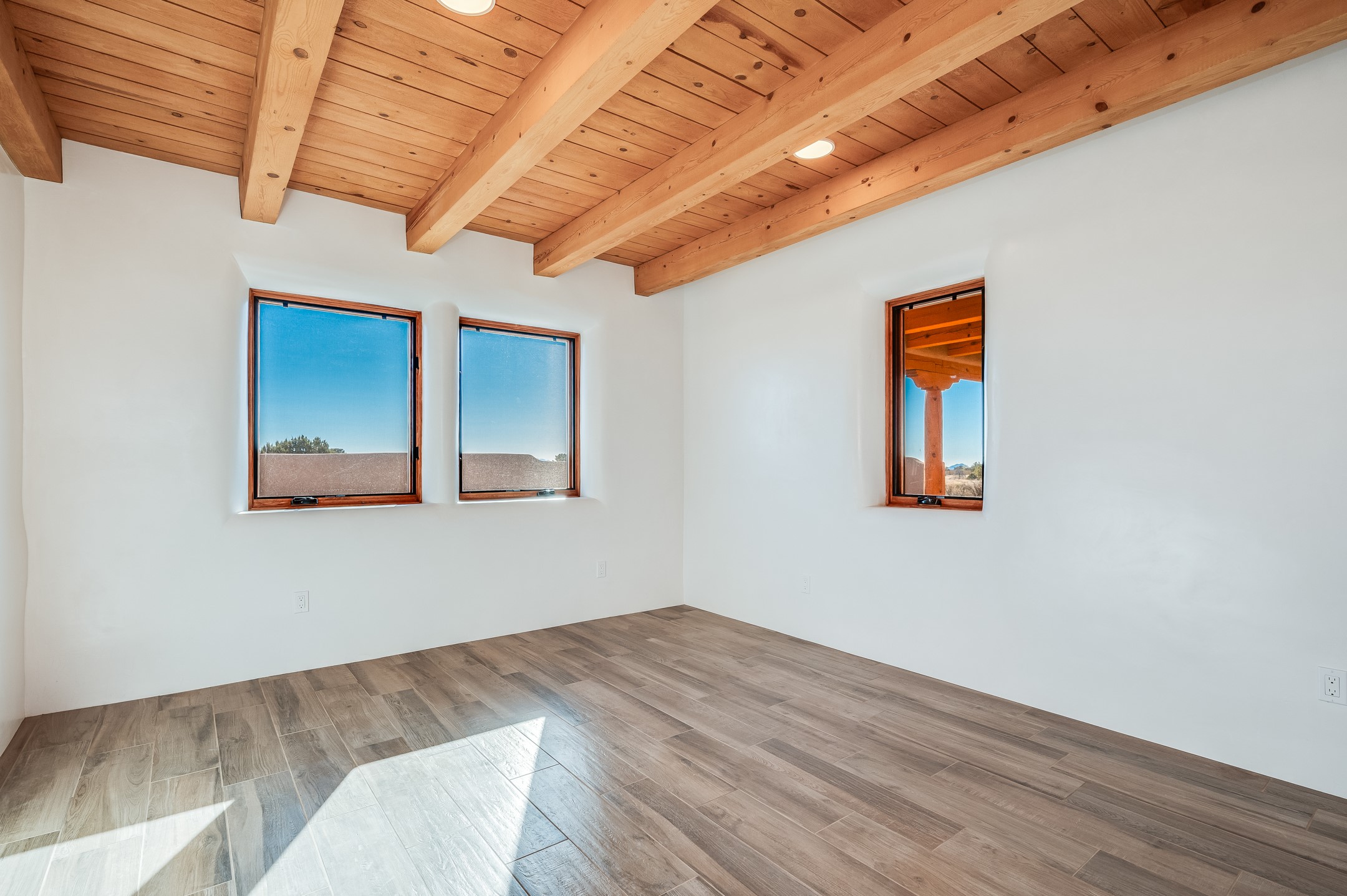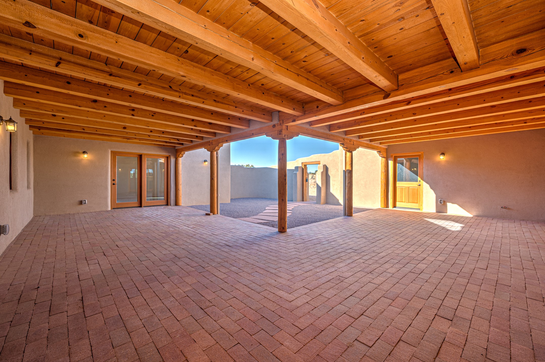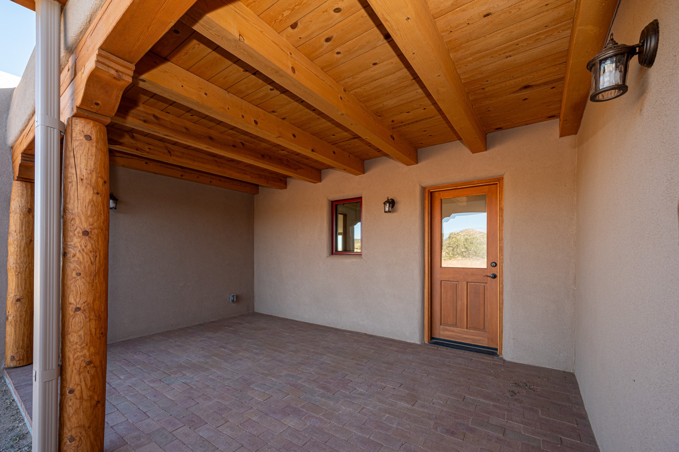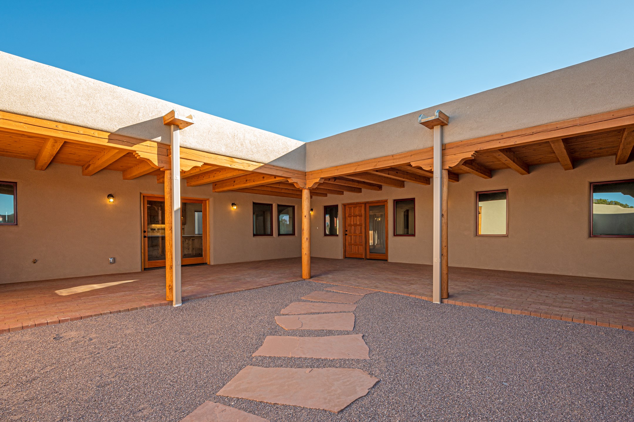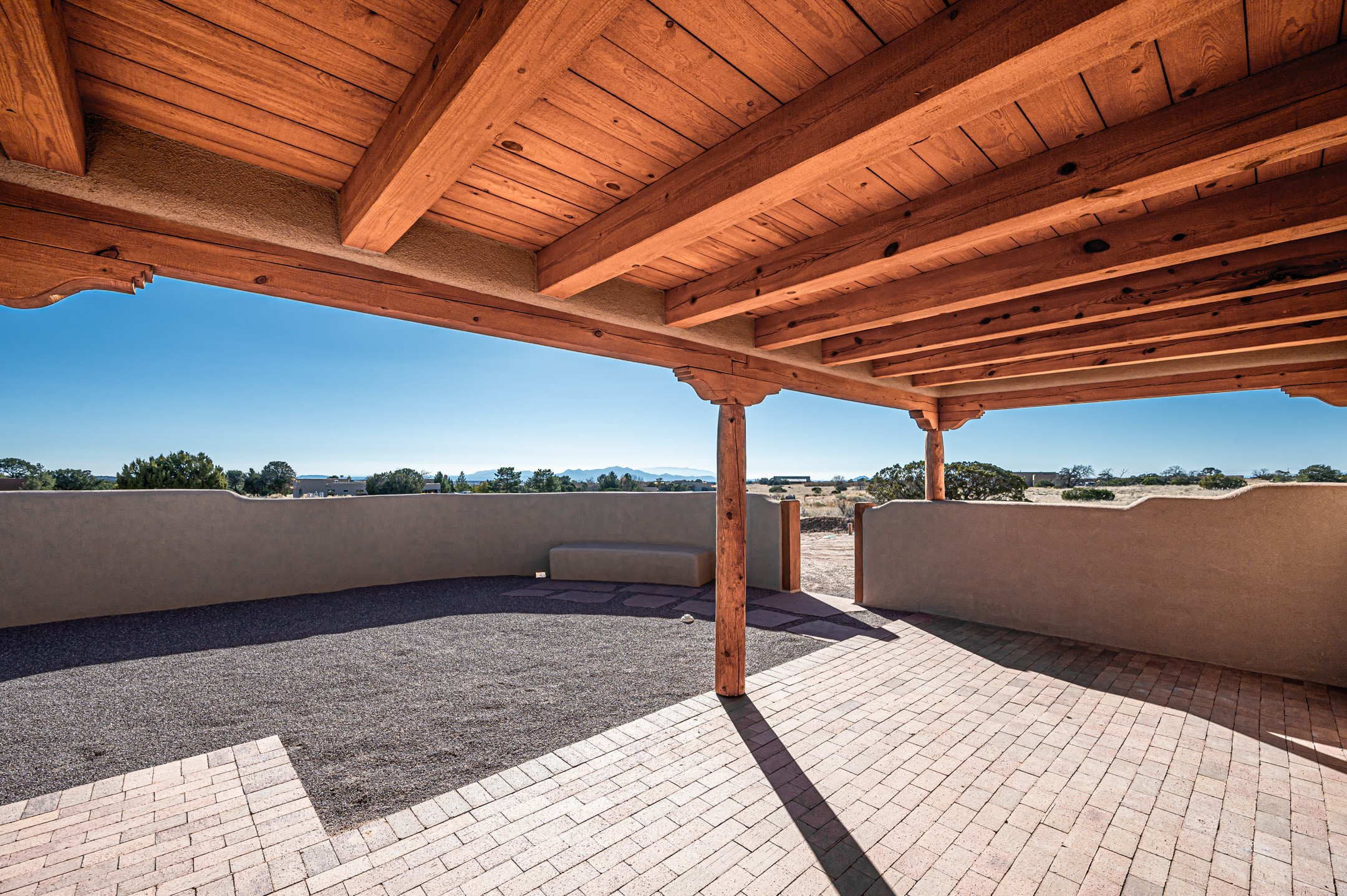 Outstanding quality in this Adobe contemporary pueblo masterpiece built by one of Santa Fe's premier adobe builders, Jeff Fagley of Shaylube Construction. This home has never been lived in, is waiting for the first owner to enjoy. Open plan design with dramatic corbelled beam ceiling and Kiva fireplace in great room, tiled floors and gleaming thick smooth plastered walls throughout complement the classic elements of Santa Fe style. Spacious bright and light feel with high ceilings throughout. Large owners suite with walk in closet, separate office/den and private walled portal. The separate guest guest suite includes a large den which accesses to the portalled private courtyard. Natural gas radiant heat plus 5 mini splits for heating and cooling complement the radiant in floor heating and passive solar design. A sunny chefs kitchen with butlers pantry and large central island, a large formal dining area opens to the wrap-around portal for private outside dining and entertainment. The walled courtyard entry also provides access to both main home and guest quarters. There is a second privacy walled south courtyard with bricked portals accessed from living room and master suite also excellent for sunset mountain viewing. Roof drainage to 2 cisterns already installed underground which catches the rainfall for landscaping. A large 3 car garage for lots of toys or hobbies, plenty of guest parking and lovely views with 7+acres to enjoy. Horses allowed. Enjoy access to local Eldorado area shopping, schools, senior center and library plus only minutes into Santa Fe.