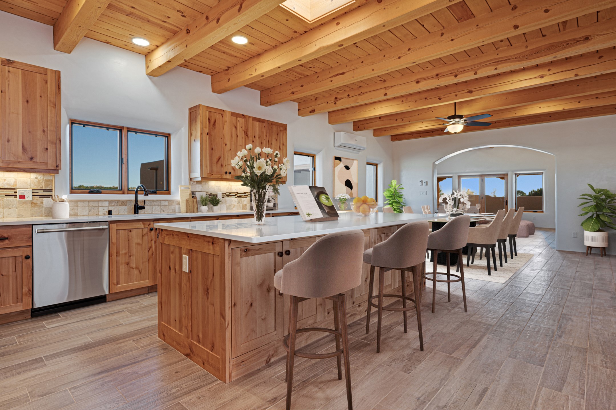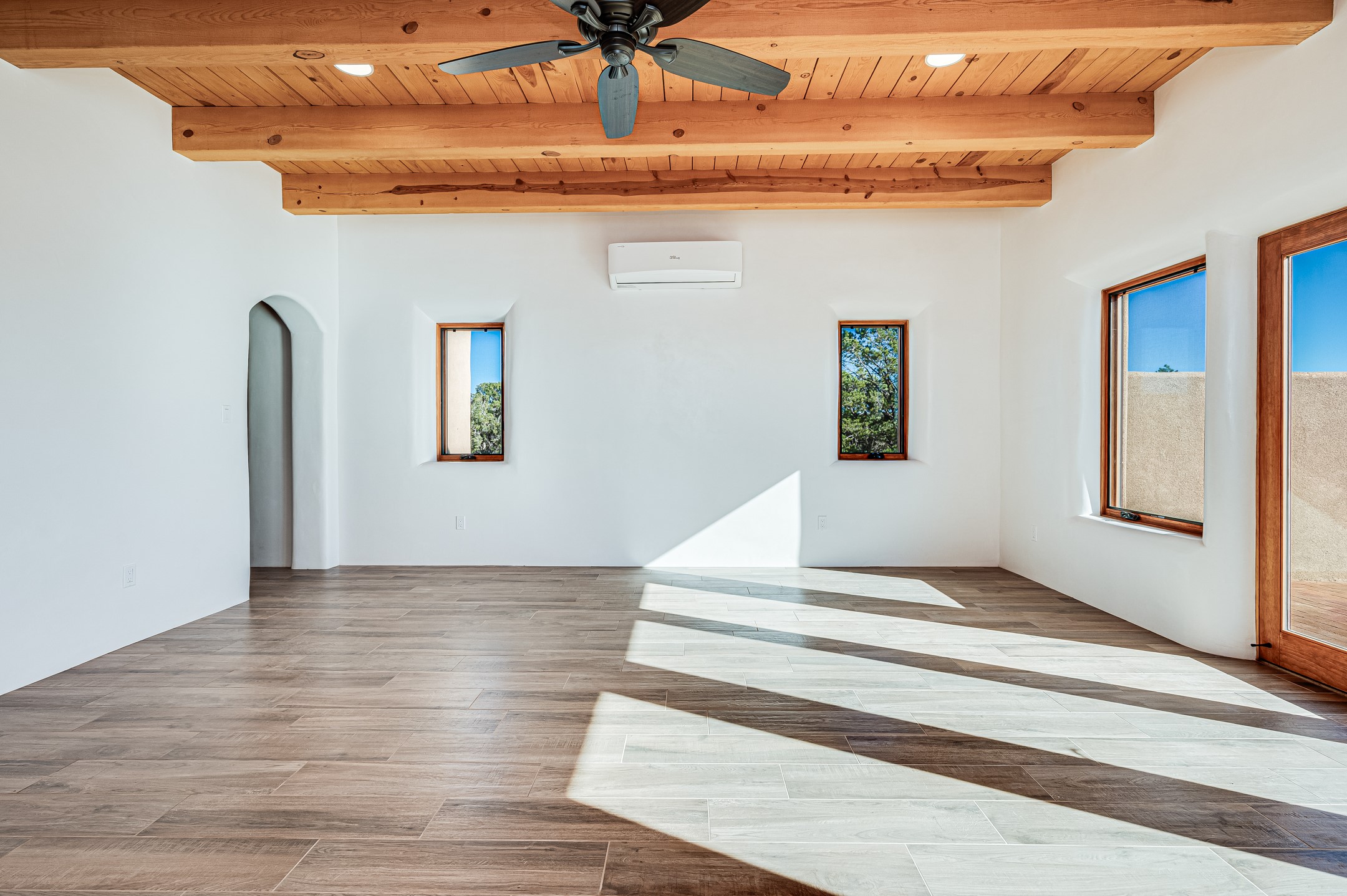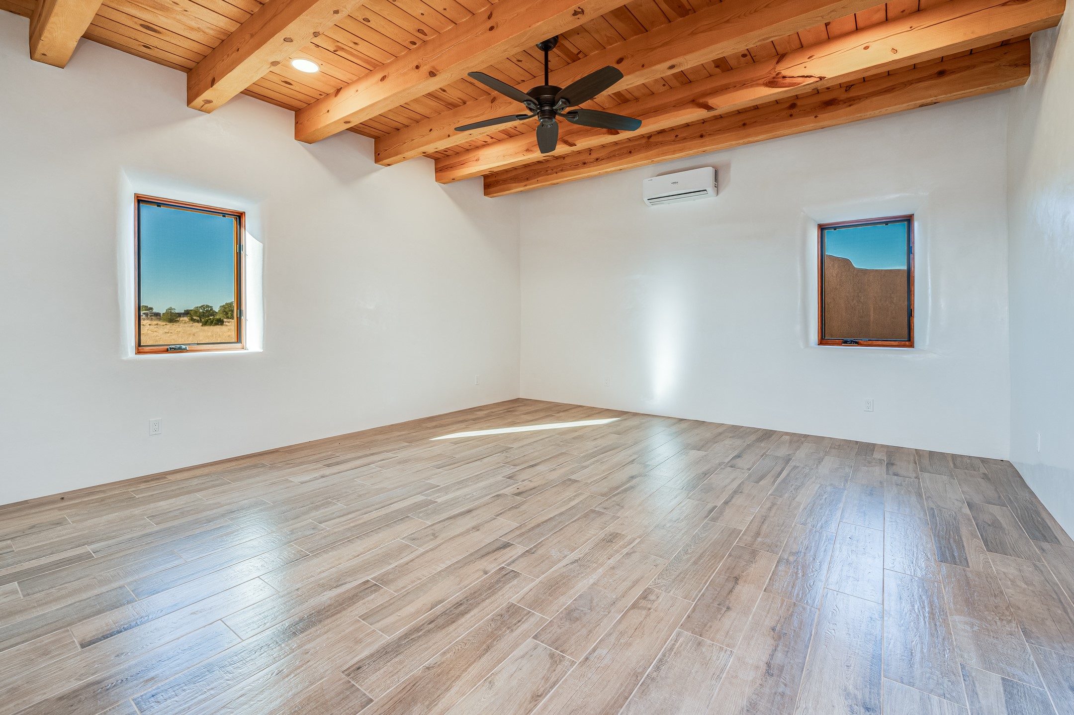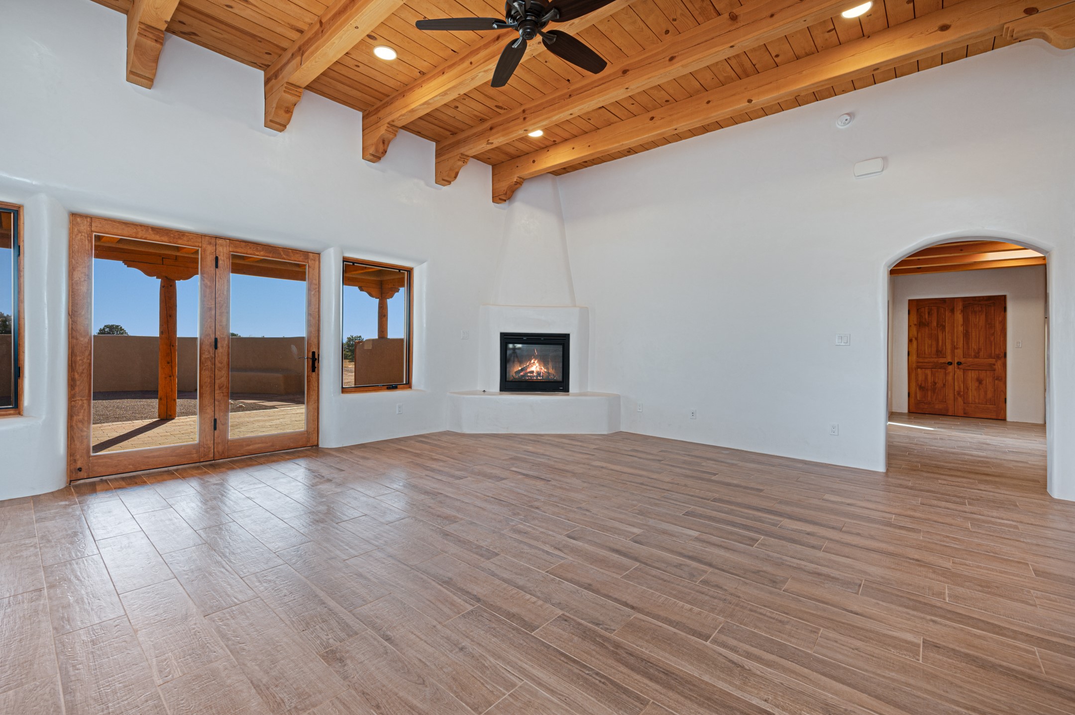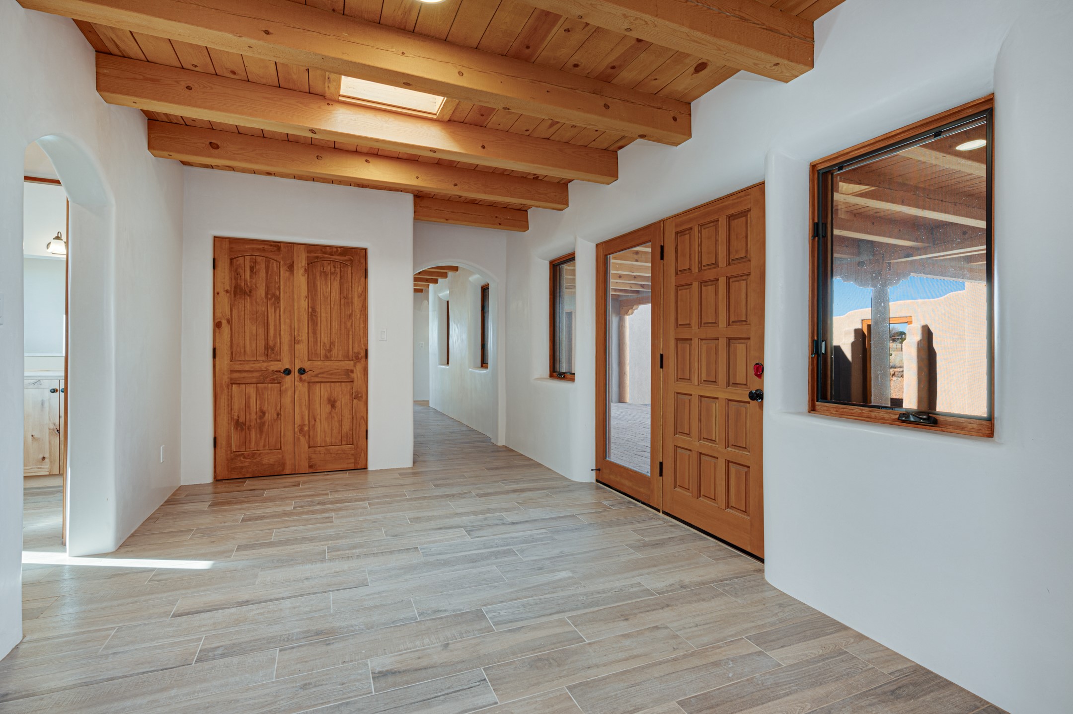 Outstanding quality in this Adobe contemporary pueblo masterpiece built by one of Santa Fe's premier adobe builders, Jeff Fagley of Shaylube Construction. This home has never been lived in, is waiting for the first owner to enjoy. Open plan design with dramatic corbelled beam ceiling and Kiva fireplace in great room, tiled floors and gleaming thick smooth plastered walls throughout complement the classic elements of Santa Fe style. Spacious bright and light feel with high ceilings throughout. Large owners suite with walk in closet, separate office/den and private walled portal. The separate guest guest suite includes a large den which accesses to the portalled private courtyard. Natural gas radiant heat plus 5 mini splits for heating and cooling complement the radiant in floor heating and passive solar design. A sunny chefs kitchen with butlers pantry and large central island, a large formal dining area opens to the wrap-around portal for private outside dining and entertainment. The walled courtyard entry also provides access to both main home and guest quarters. There is a second privacy walled south courtyard with bricked portals accessed from living room and master suite also excellent for sunset mountain viewing. Roof drainage to 2 cisterns already installed underground which catches the rainfall for landscaping. A large 3 car garage for lots of toys or hobbies, plenty of guest parking and lovely views with 7+acres to enjoy. Horses allowed. Enjoy access to local Eldorado area shopping, schools, senior center and library plus only minutes into Santa Fe.