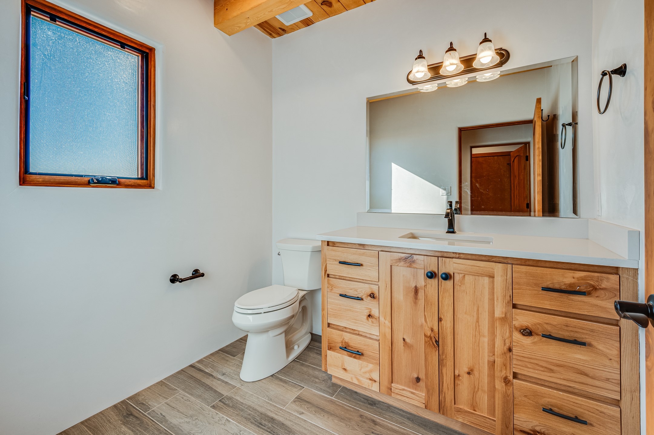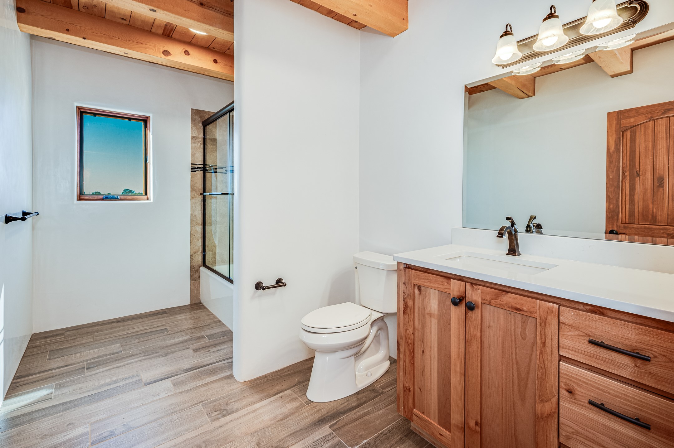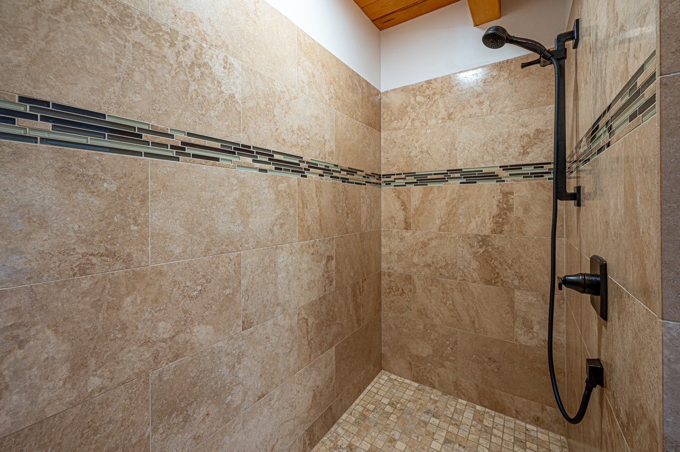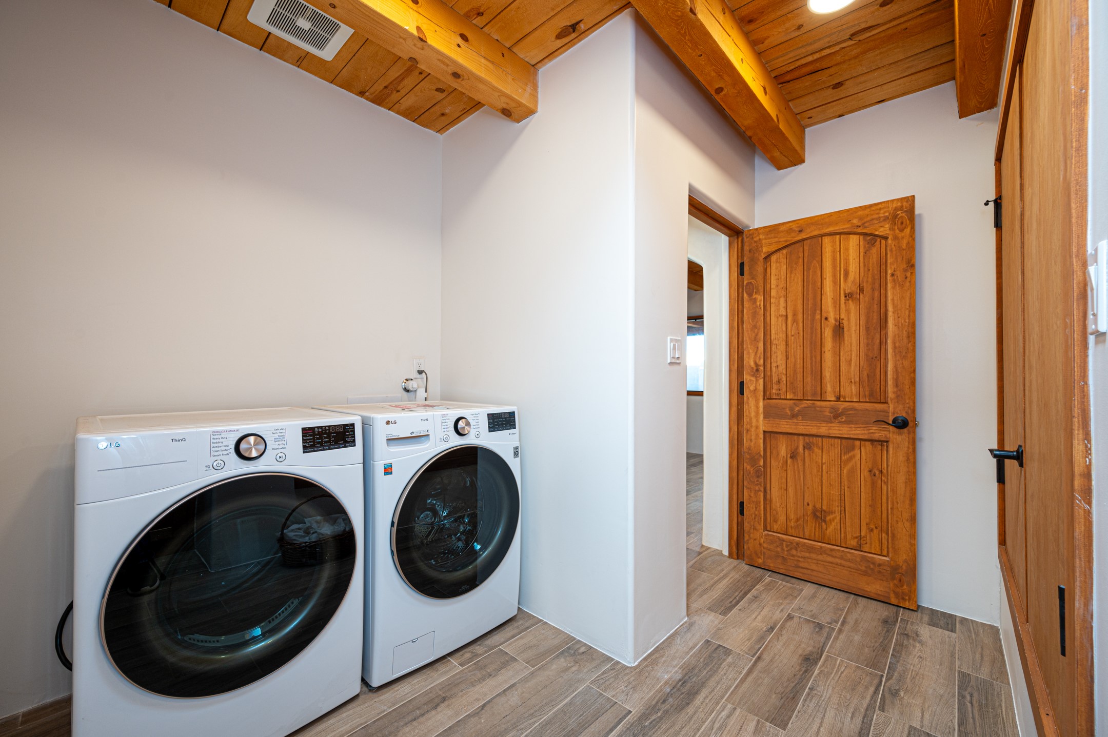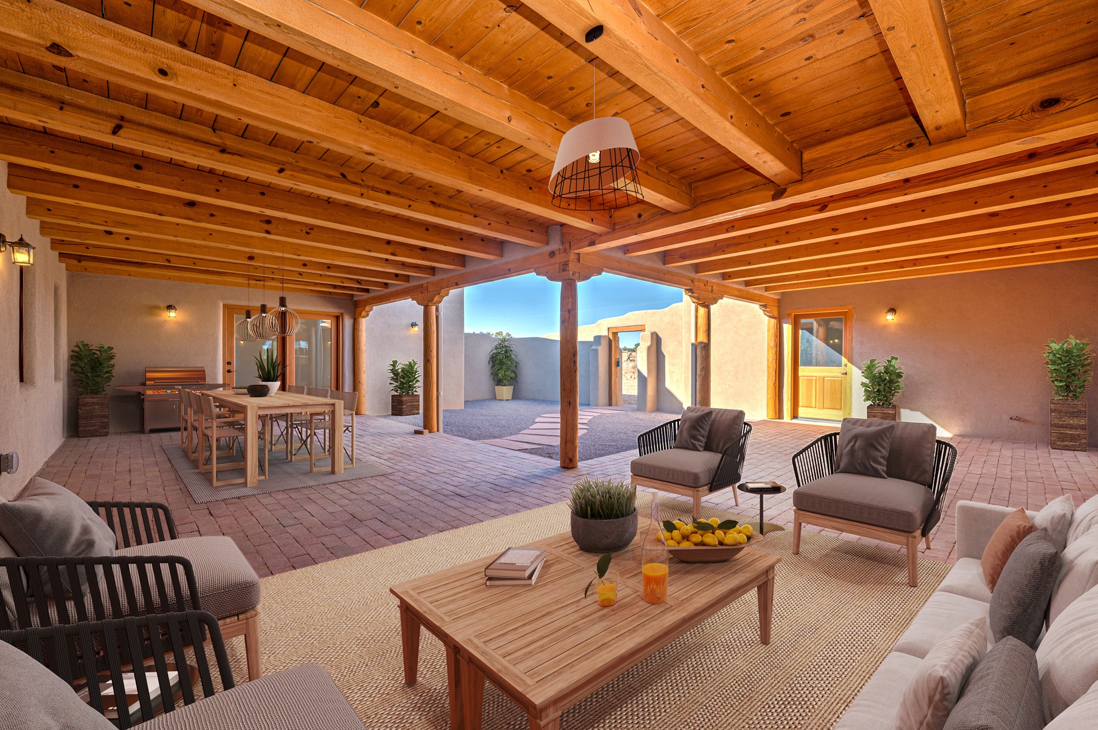 Outstanding quality in this Adobe contemporary pueblo masterpiece built by one of Santa Fe's premier adobe builders, Jeff Fagley of Shaylube Construction. This home has never been lived in, is waiting for the first owner to enjoy. Open plan design with dramatic corbelled beam ceiling and Kiva fireplace in great room, tiled floors and gleaming thick smooth plastered walls throughout complement the classic elements of Santa Fe style. Spacious bright and light feel with high ceilings throughout. Large owners suite with walk in closet, separate office/den and private walled portal. The separate guest guest suite includes a large den which accesses to the portalled private courtyard. Natural gas radiant heat plus 5 mini splits for heating and cooling complement the radiant in floor heating and passive solar design. A sunny chefs kitchen with butlers pantry and large central island, a large formal dining area opens to the wrap-around portal for private outside dining and entertainment. The walled courtyard entry also provides access to both main home and guest quarters. There is a second privacy walled south courtyard with bricked portals accessed from living room and master suite also excellent for sunset mountain viewing. Roof drainage to 2 cisterns already installed underground which catches the rainfall for landscaping. A large 3 car garage for lots of toys or hobbies, plenty of guest parking and lovely views with 7+acres to enjoy. Horses allowed. Enjoy access to local Eldorado area shopping, schools, senior center and library plus only minutes into Santa Fe.