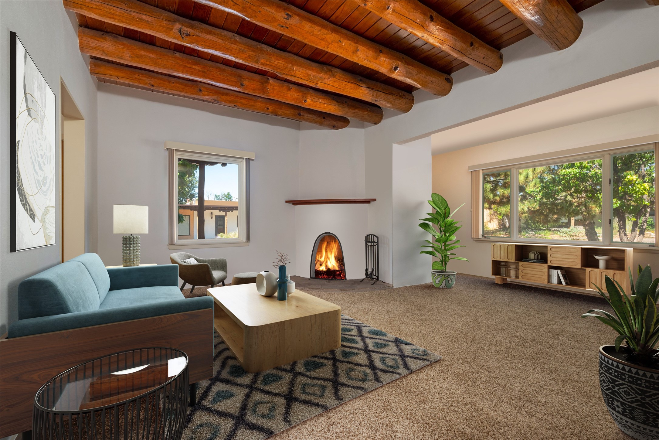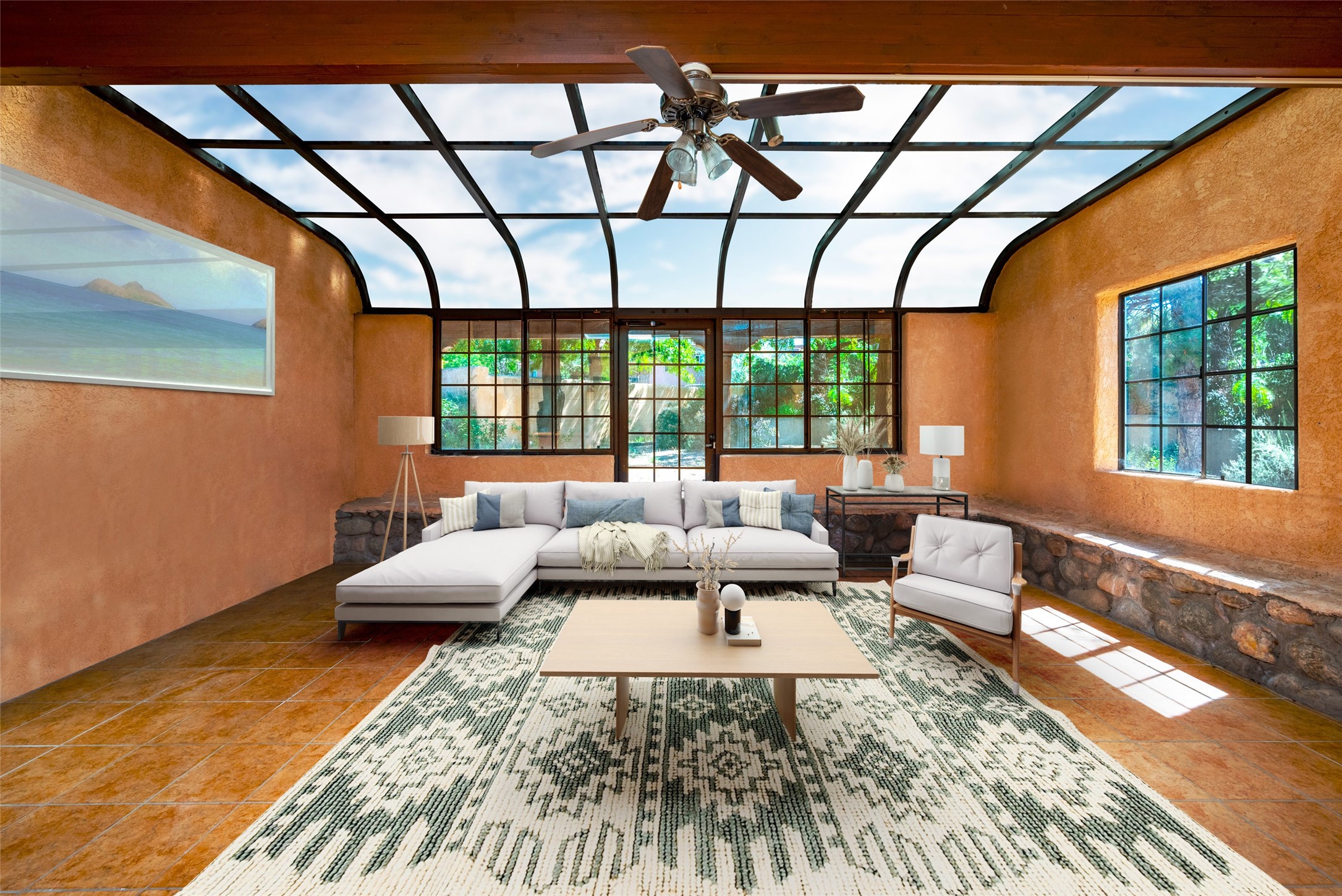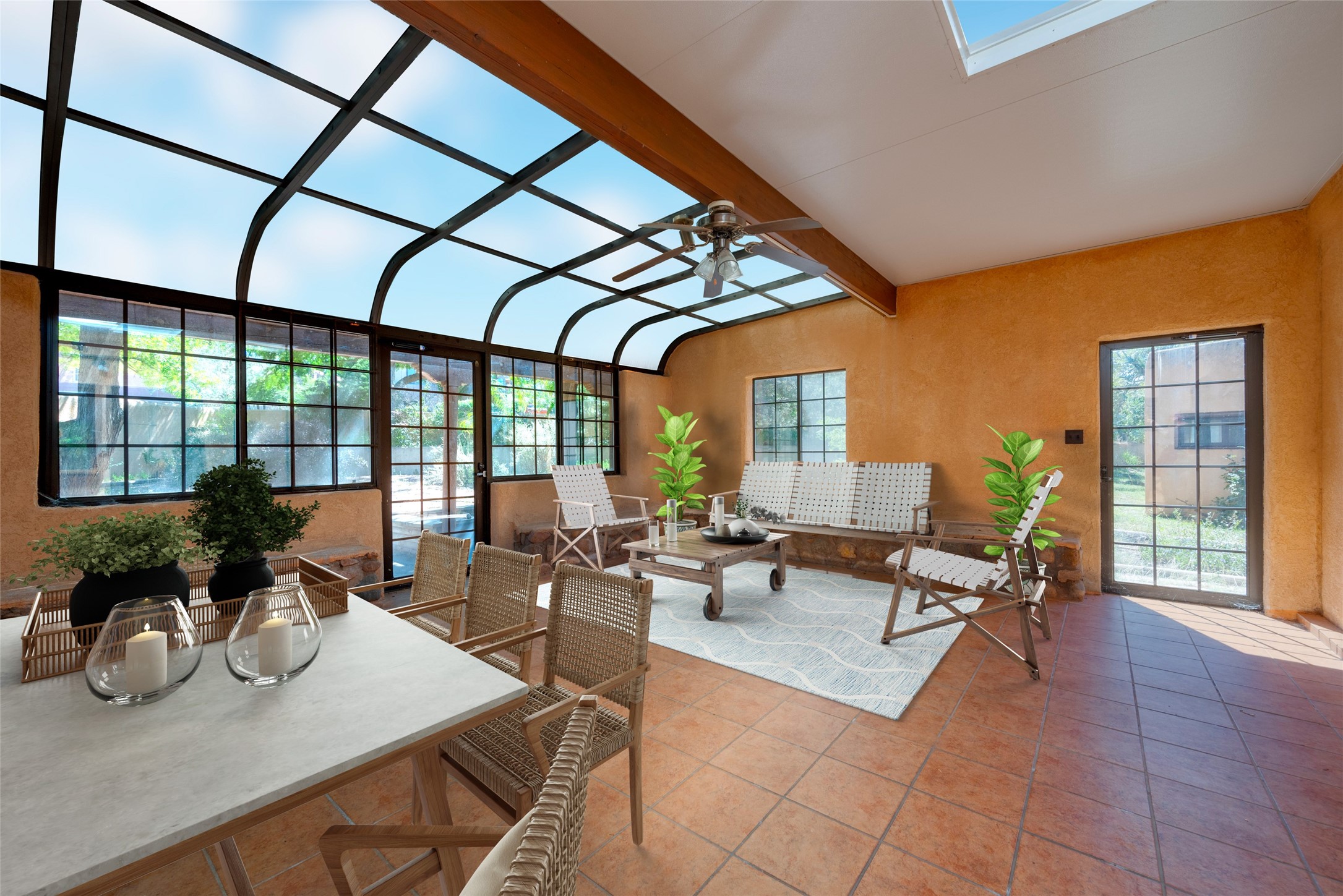 The finest of the remaining single-family homes in this downtown core district gated communities. Plaza del Monte represents a lifestyle that is seldom found on the east or north side of the City Different. Get in on the ground floor of this unique opportunity. It will only get better as time goes on. Mid-Century Modern with a contemporary twist. This 2 bedroom, 2 bath home has a sun filled main living area, a sunroom that opens onto a fabulous large outdoor yard, waiting to be landscaped to complete the masterpiece this home offers. Some photos have been virtually staged.