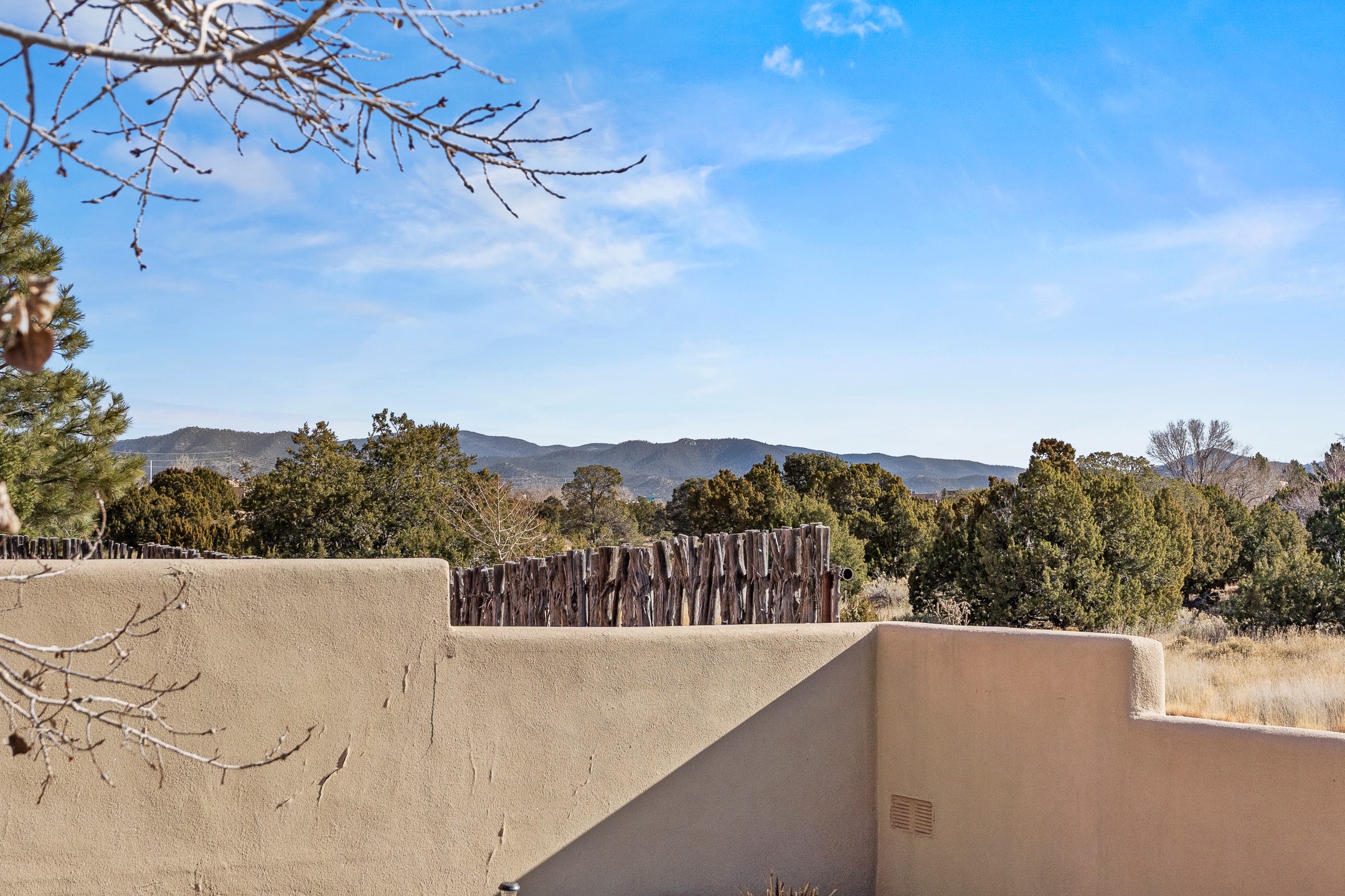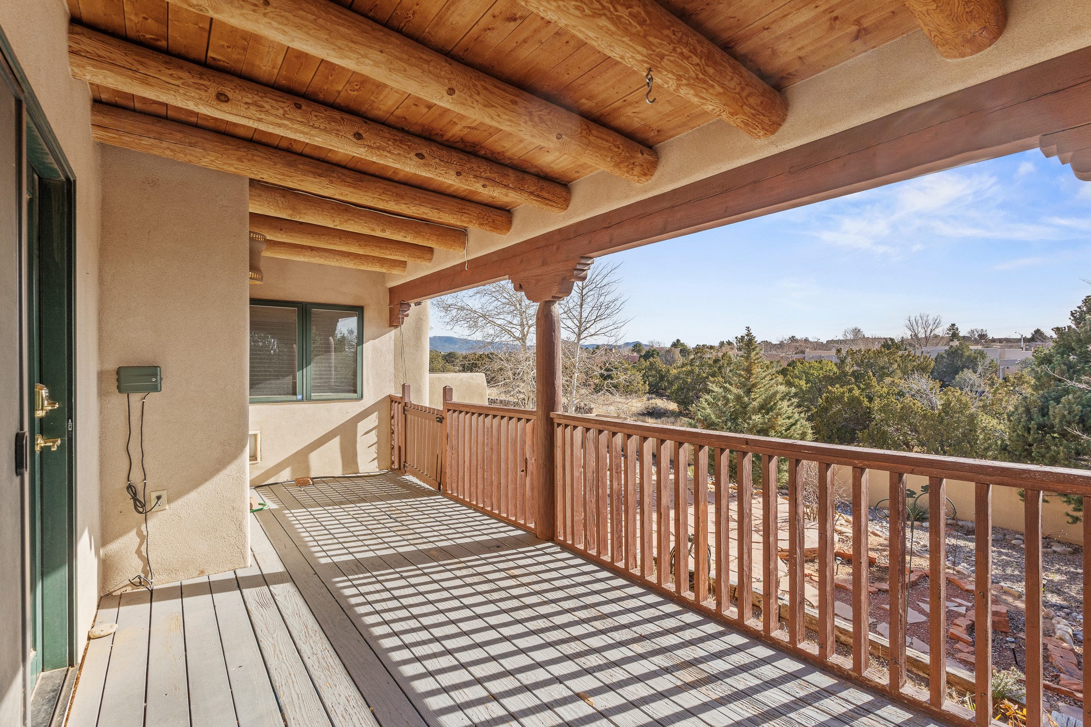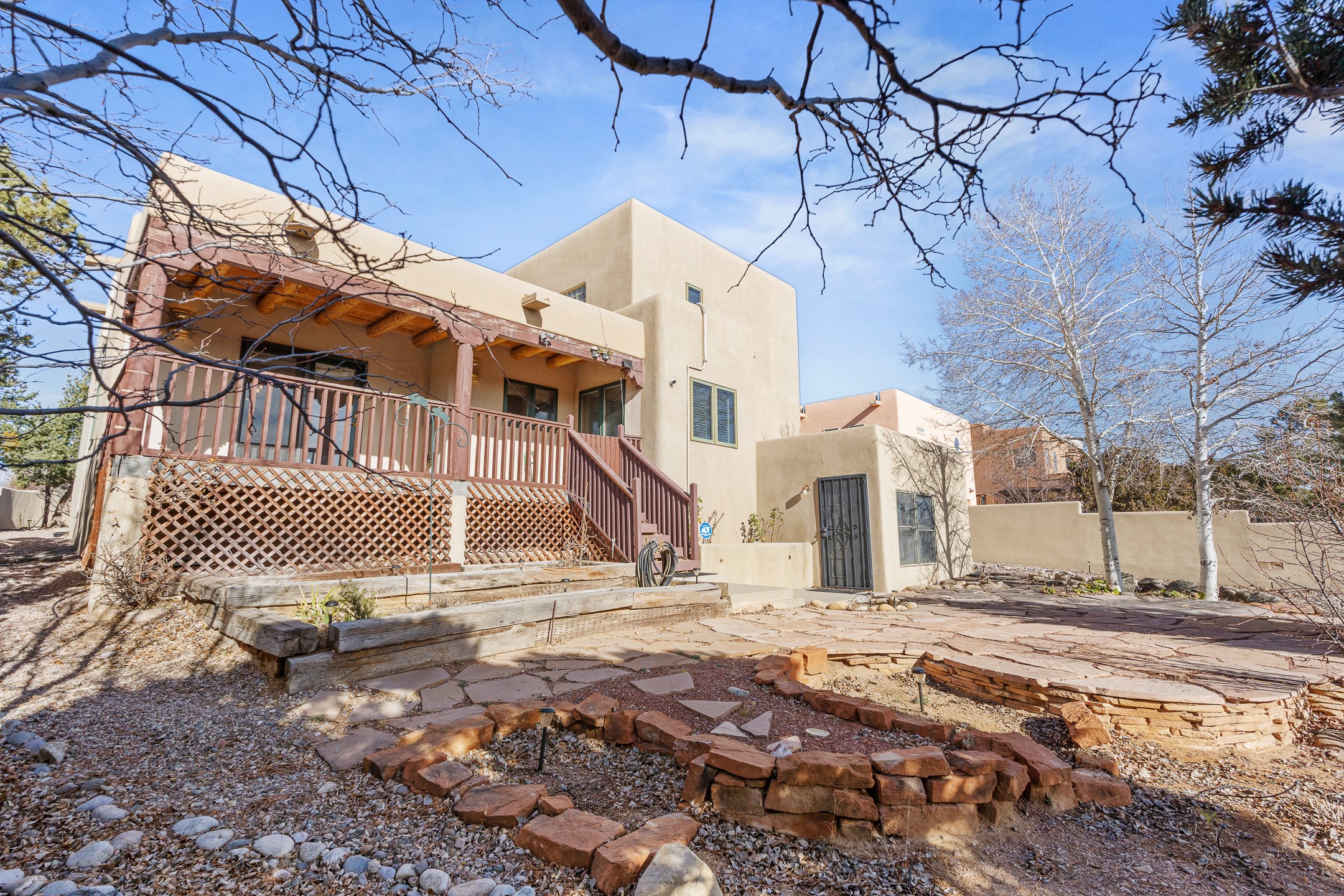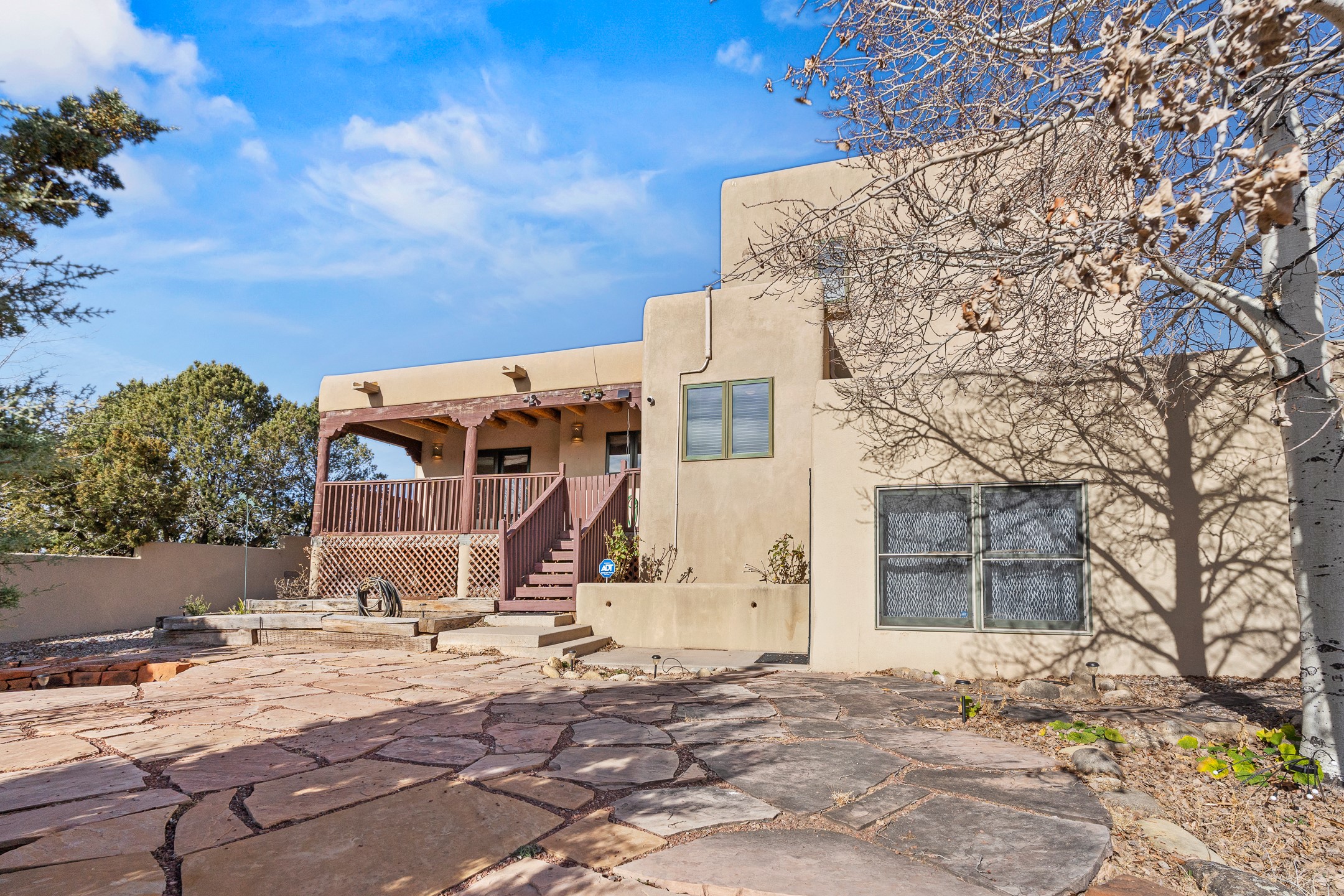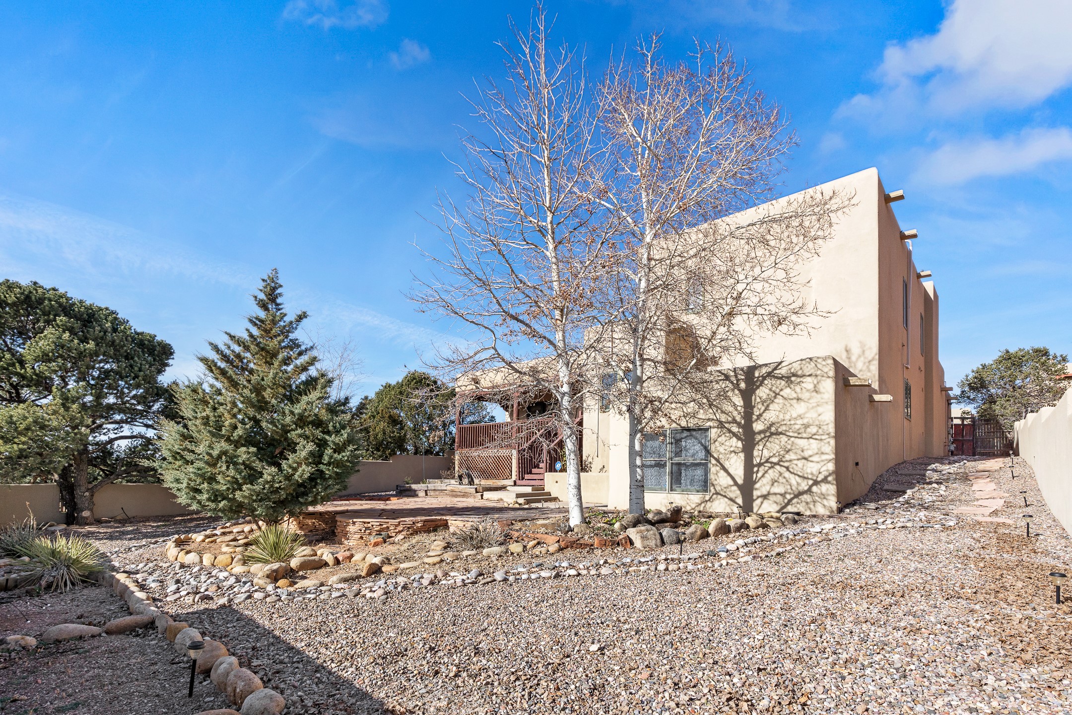 Custom home located in the sought-after Pueblos de Sol subdivision, offering comfortable living and sweeping sunrise andsunset views. Situated on a nicely sized corner lot, this home features a covered portal and rear deck--perfect for relaxingand enjoying the scenery. The kitchen showcases newer cabinetry, stainless steel appliances, granite countertops, and acoordinating backsplash. A formal dining room and a separate breakfast nook provide flexible dining options. ClassicSouthwestern details shine throughout, including tongue-and-groove ceilings with vigas and a Kiva wood-burning fireplace. The oversized primary bedroom offers a true retreat, complete with a spa-like en suite bathroom featuring a standalone soaking tub, separate shower, and access to a private deck. Recent upgrades include a TPO roof installed in 2022 and a new boiler for radiant heating installed in 2024. Year-round comfort is ensured with five mini-split systems. Outdoor spaces include a charming landscaped courtyard with flagstone, mature trees, drip irrigation, and a pet-friendly layout. The rear deck is ideal for outdoor entertaining. The property backs to a walking trail, with a community park conveniently located across the street. A separate-entry studio/guesthouse with a full bath completes this exceptional offering--perfect for guests or rental income potential.