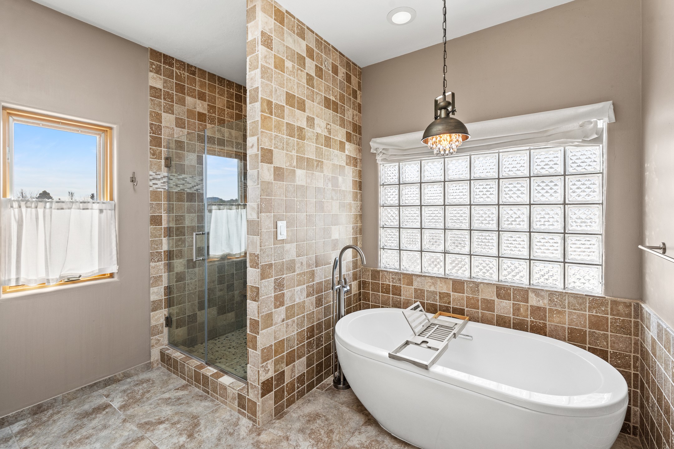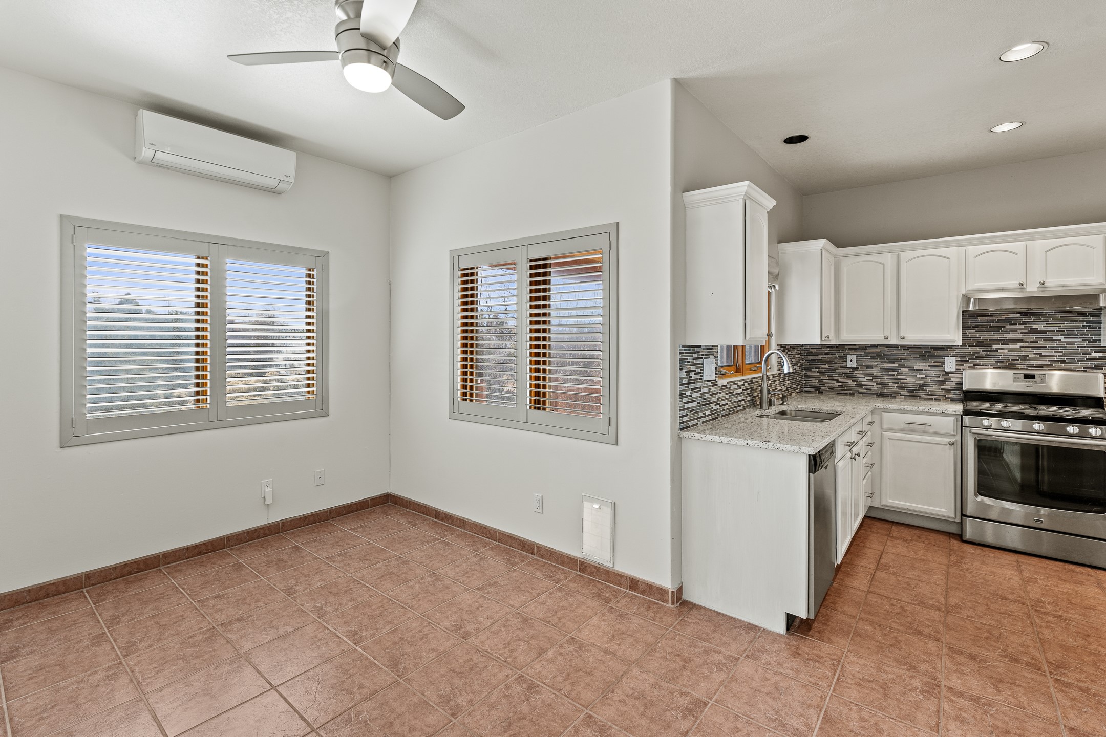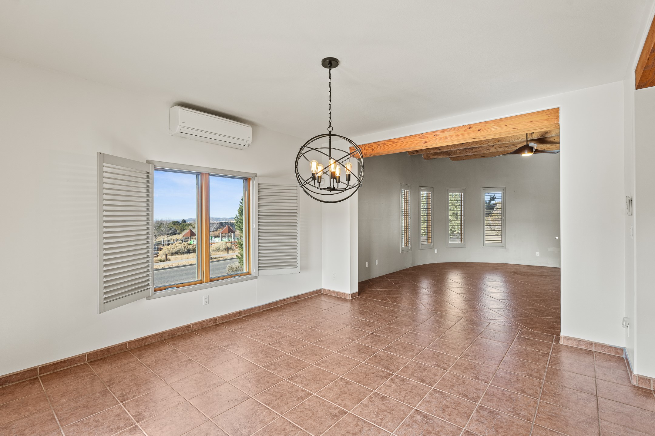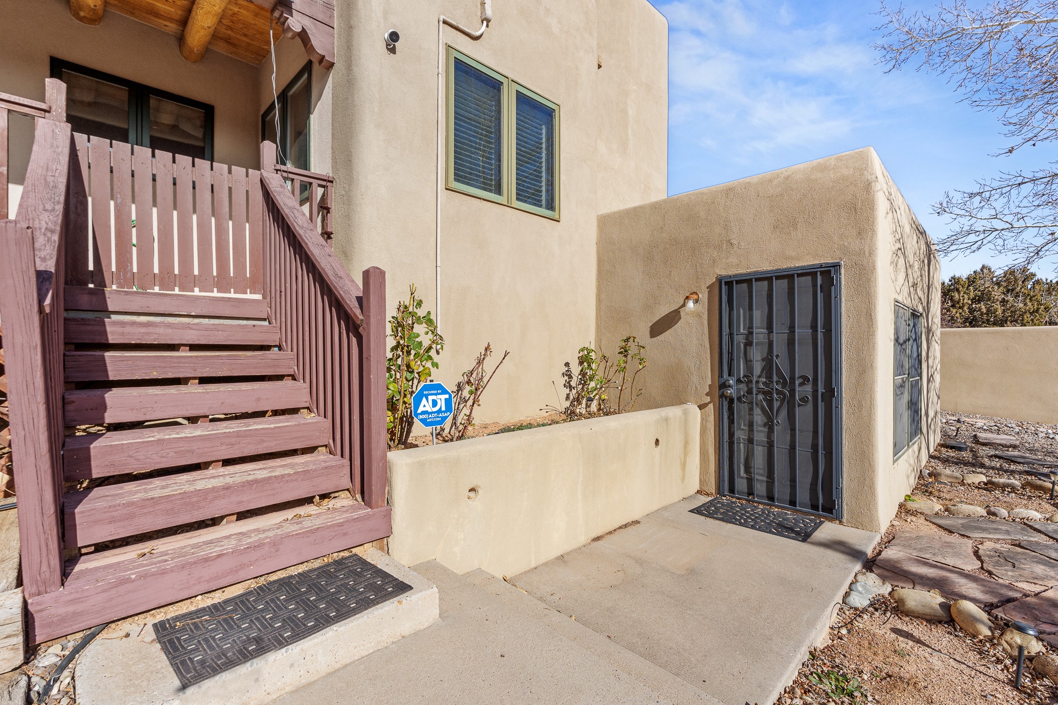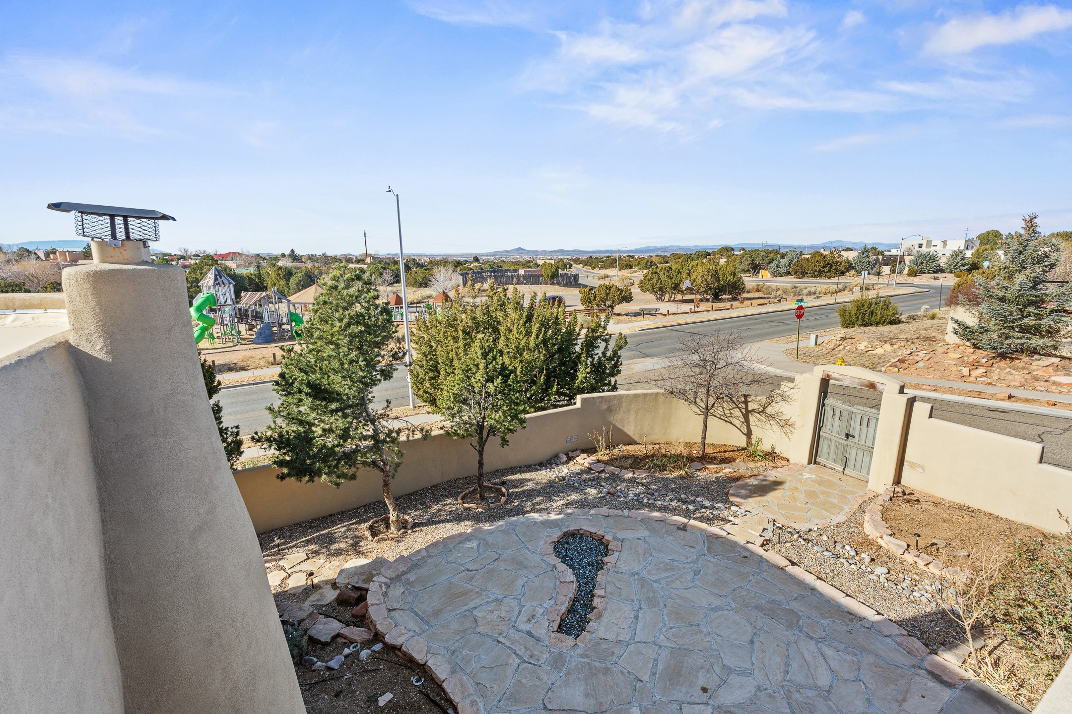 Custom home located in the sought-after Pueblos de Sol subdivision, offering comfortable living and sweeping sunrise andsunset views. Situated on a nicely sized corner lot, this home features a covered portal and rear deck--perfect for relaxingand enjoying the scenery. The kitchen showcases newer cabinetry, stainless steel appliances, granite countertops, and acoordinating backsplash. A formal dining room and a separate breakfast nook provide flexible dining options. ClassicSouthwestern details shine throughout, including tongue-and-groove ceilings with vigas and a Kiva wood-burning fireplace. The oversized primary bedroom offers a true retreat, complete with a spa-like en suite bathroom featuring a standalone soaking tub, separate shower, and access to a private deck. Recent upgrades include a TPO roof installed in 2022 and a new boiler for radiant heating installed in 2024. Year-round comfort is ensured with five mini-split systems. Outdoor spaces include a charming landscaped courtyard with flagstone, mature trees, drip irrigation, and a pet-friendly layout. The rear deck is ideal for outdoor entertaining. The property backs to a walking trail, with a community park conveniently located across the street. A separate-entry studio/guesthouse with a full bath completes this exceptional offering--perfect for guests or rental income potential.
