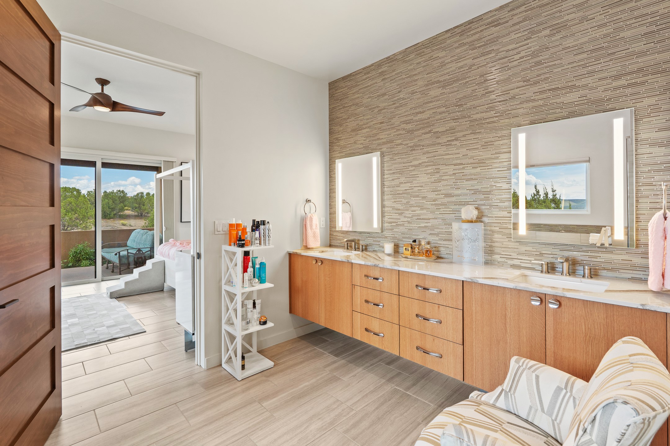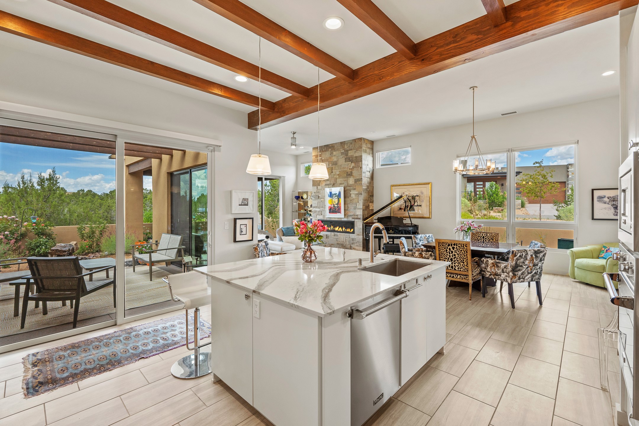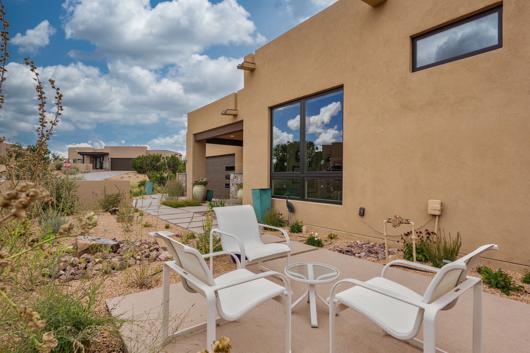 Discover the perfect blend of modern luxury and Southwest charm in this newer home built in 2022 and located in Las Campanas, a premier gated community located just 8 miles from town. Designed in a striking contemporary Pueblo style, the home boasts an open-concept floor plan that seamlessly connects indoor and outdoor spaces, all while framing the mountain views and famous sunsets of Santa. Enjoy multiple professionally landscaped outdoor living areas, thoughtfully designed with water features for relaxation and ambiance. Whether it's morning coffee, dining al fresco, entertaining or unwinding, this home offers serene outdoor retreats in every direction. Inside, the layout is open and light-filled, with high-end finishes and thoughtful details throughout. The spacious primary suite is a true sanctuary, featuring a generous seating area, a luxurious spa-like bath with a soaking tub, walk-in shower, dual vanities, and an expansive closet complete with built-in organizers. Eco-conscious amenities include solar panels and two electric vehicle charging hookups, offering both sustainability and convenience. The home also includes natural gas, central heating, and air conditioning to ensure year-round comfort. Perfect for full-time living or as a lock-and-leave second home, this property offers the ideal combination of style, efficiency, and tranquility. HOA fees cover road and common area maintenance, 24-hour roaming security, and on-site emergency medical technicians. Membership to The Club at Las Campanas is optional, offering amenities such as indoor and outdoor swimming pools, tennis courts, a fitness center, equestrian facilities, fine dining options, and two Jack Nicklaus Signature Golf Courses.