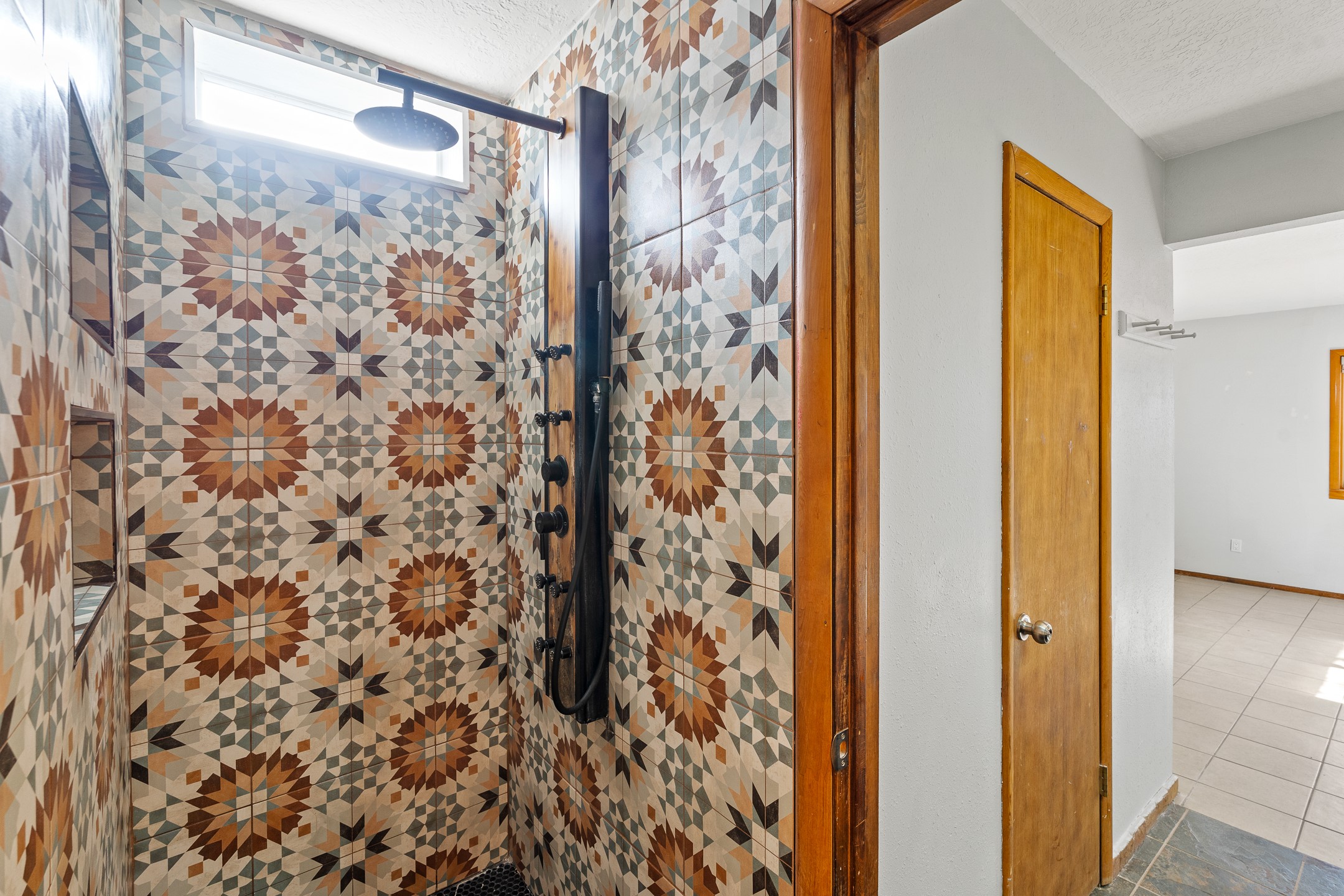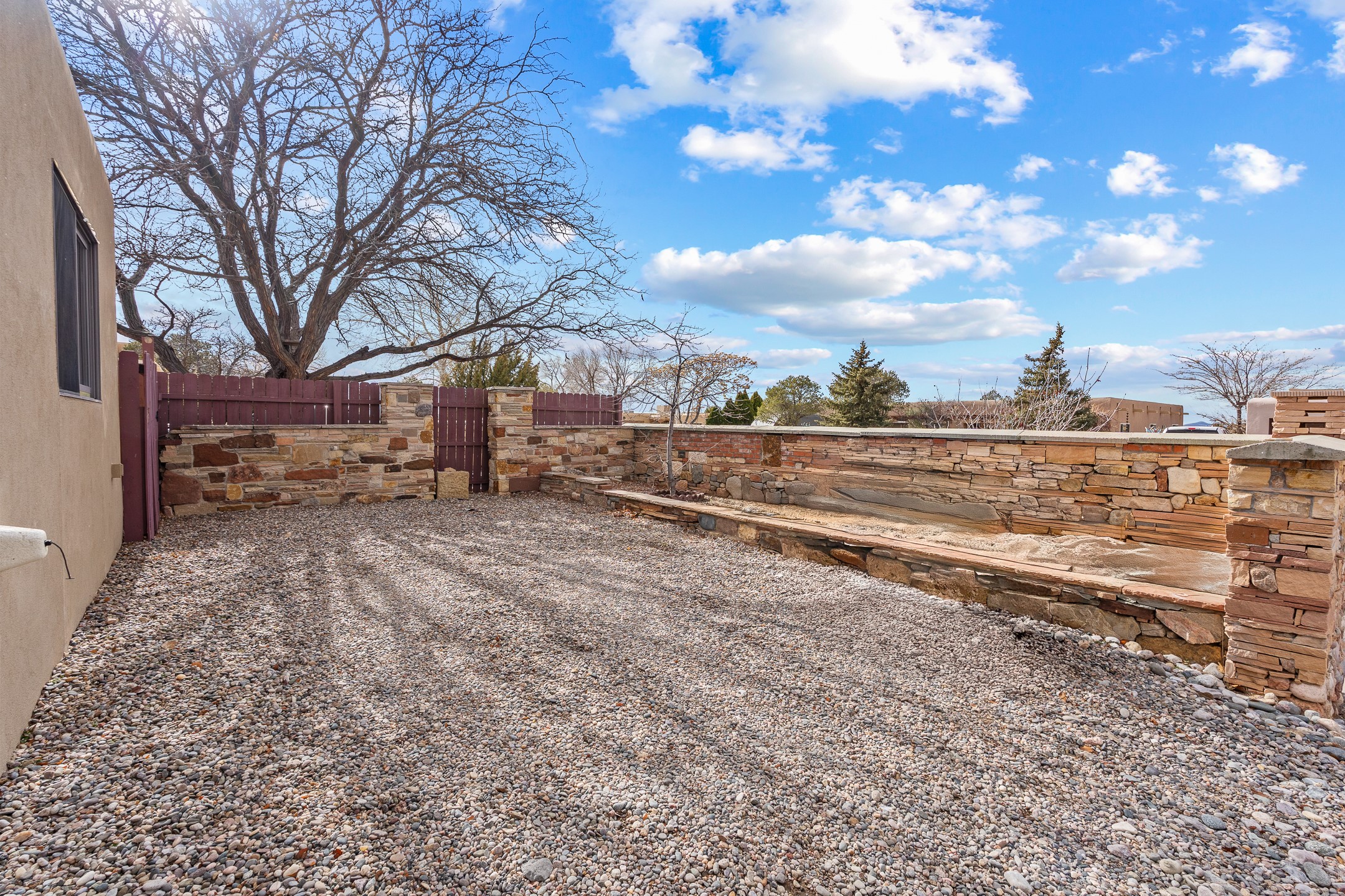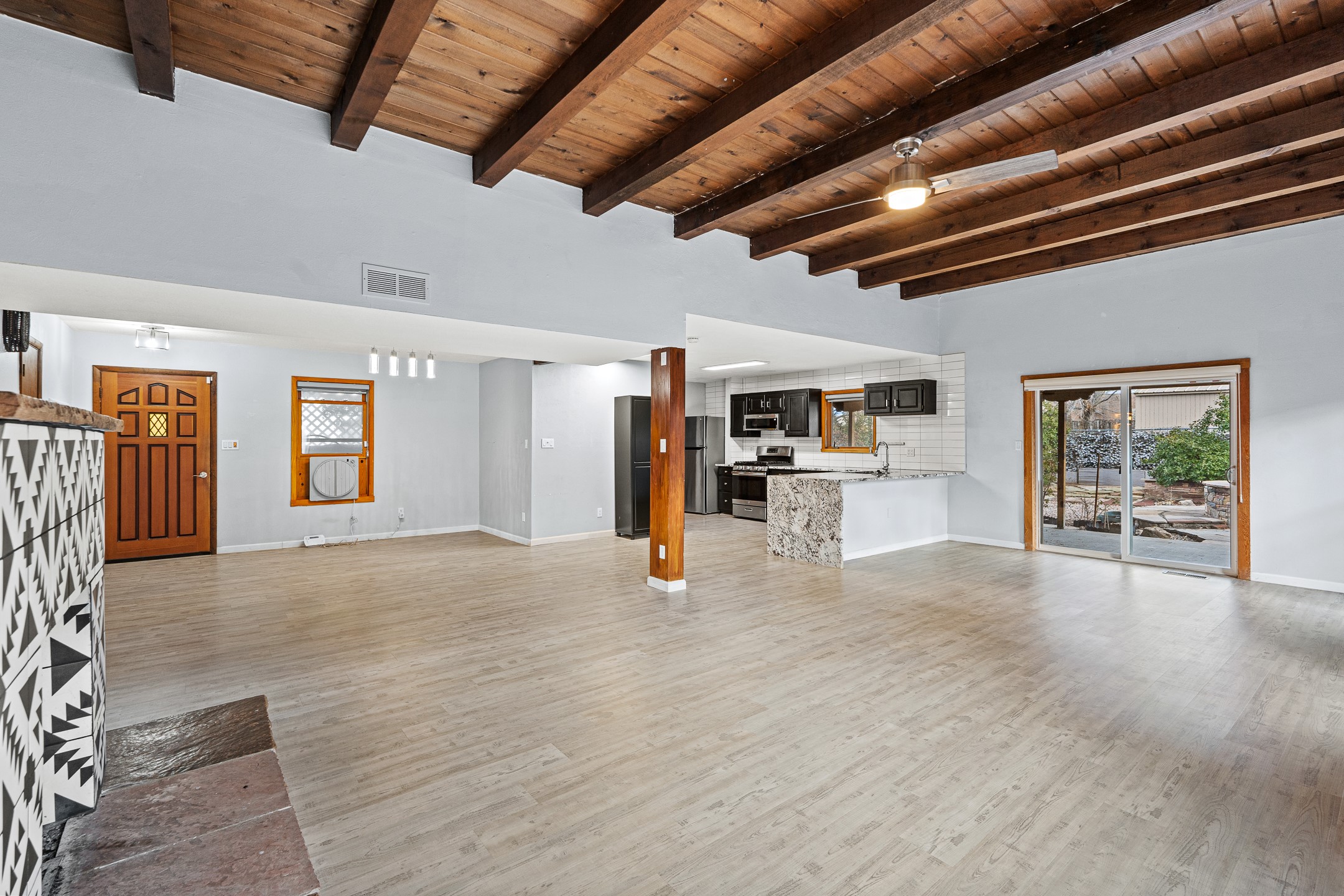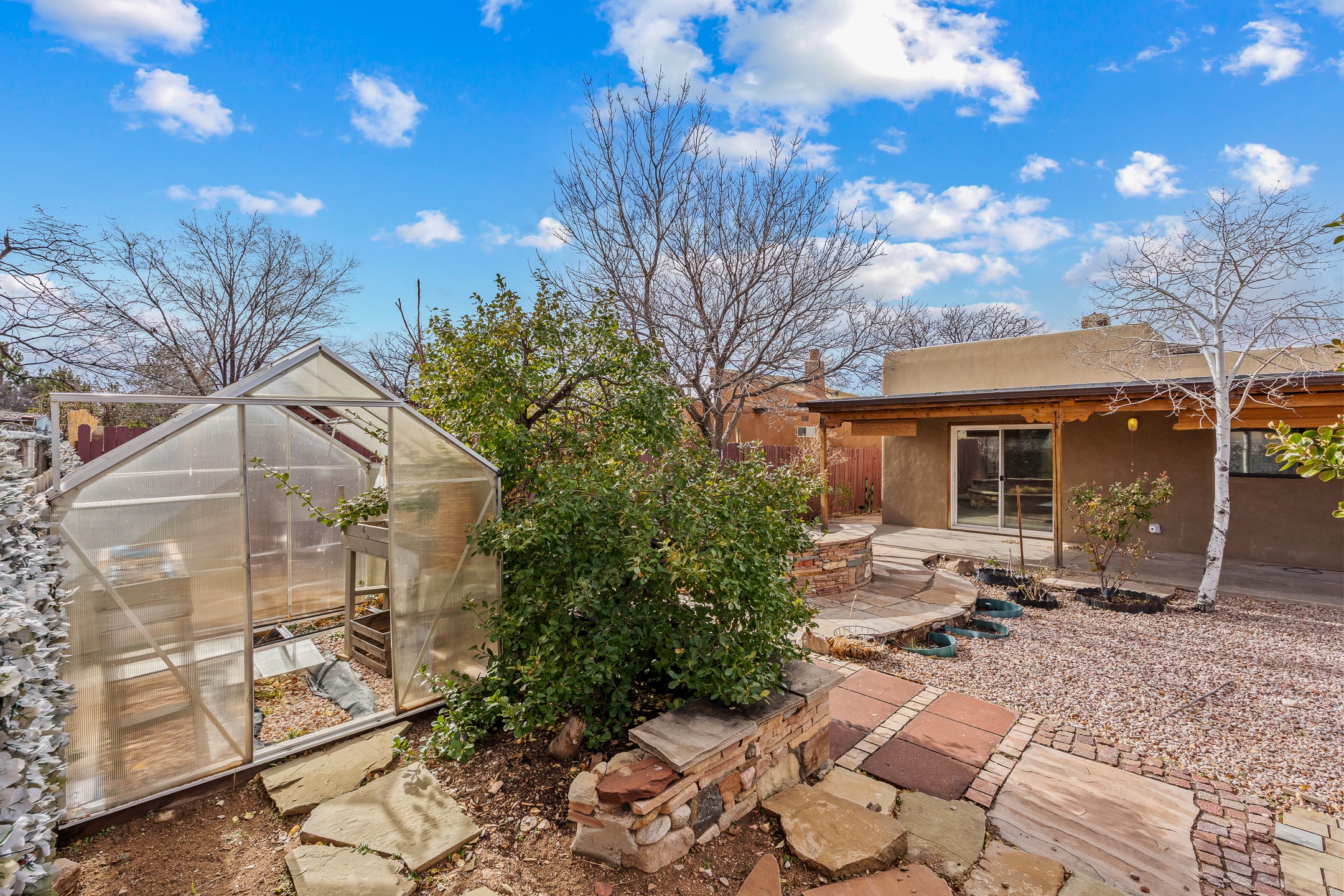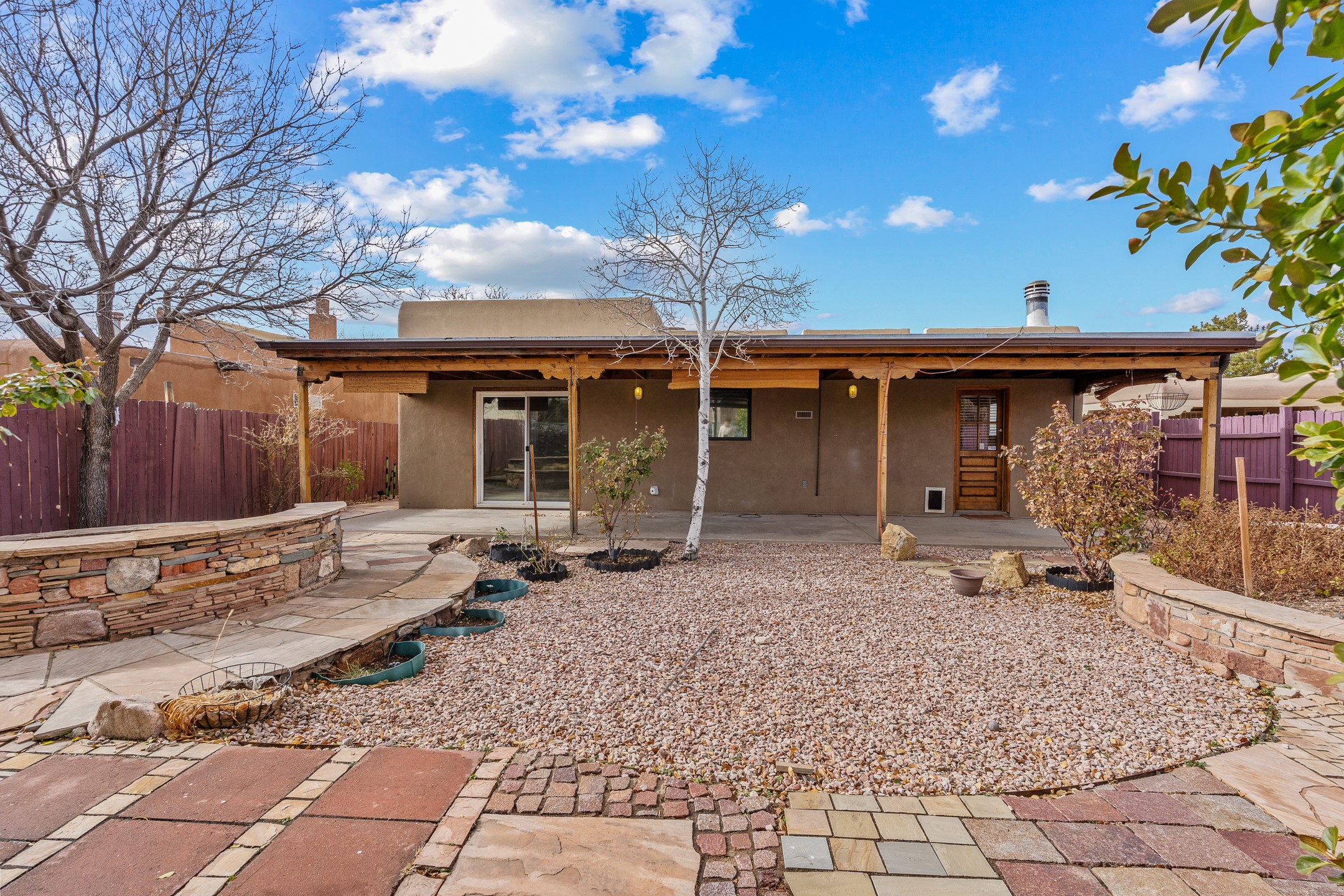 Ideally located just across from the Genoveva Chavez Center, this beautifully updated single-level home offers unbeatableconvenience with quick access to downtown Santa Fe and easy access to shopping, schools, including zoning in Pion Elementary school and everything the city has to offer. Boasting 1,794 sq ft, this thoughtfully designed 3-bedroom, 2-bath home features a modern open-concept layout perfect for comfortable living and effortless entertaining. The updated kitchen is a true showstopper, showcasing elegant waterfall granite countertops, a coordinating backsplash, and ample space for both counter seating and a dining table. The spacious living room is the heart of the home, offering soaring ceilings adorned with rich wood beams and tongue-and-groove detail, a cozy wood-burning fireplace, and a seamless flow. A sliding glass door opens to your private backyard retreat--perfect for indoor-outdoor living. Step outside to discover an enclosed, landscaped yard with mature gardens, a large covered portal ideal for year-round enjoyment, and exquisite hand-carved stonework throughout both the front and back yards. Additional highlights include a versatile mudroom/storage space/office or studio with direct outdoor access. This Santa Fe treasure blends timeless charm with modern updates in a location that truly can't be beat. Comeexperience it for yourself!