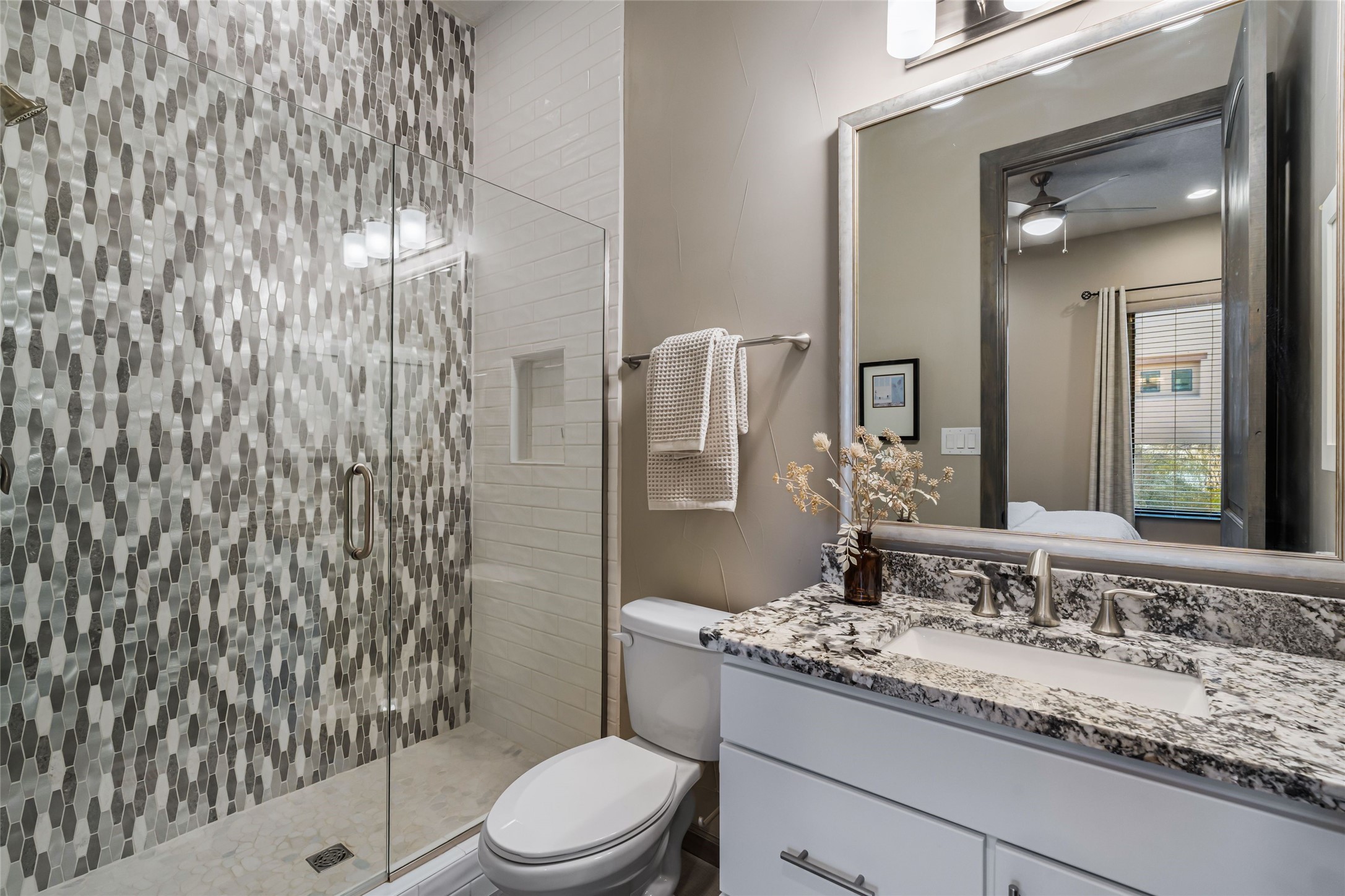Set within the coveted Las Terrazas enclave of Las Campanas, this exceptional residence captures the essence of refined Santa Fe living. Thoughtfully designed and impeccably maintained, the home offers approximately 3,900 square feet of sophisticated living space along with a 274 square foot detached casita. The primary residence offers three bedrooms with timeless Southwestern character and modern elegance. An expansive open floor plan unfolds around a gourmet kitchen appointed with generous granite countertops, custom cabinetry, and seamless connection to the surrounding living and dining areas, ideal for both intimate gatherings and grand entertaining. Walls of windows and carefully curated indoor-outdoor living spaces frame uninterrupted vistas of the Sangre de Cristo and Jemez mountain ranges, creating a constant connection to the natural beauty that defines Northern New Mexico. Built in 2019 with energy-efficient construction, the home features Pella windows and a four-zone heating and cooling system, ensuring year-round comfort and efficiency. Located minutes from the Las Campanas Hacienda and nearby walking paths, the property offers the convenience and security of Las Campanas Living. This residence offers a rare opportunity to experience elevated desert luxury in one of Santa Fe's most prestigious private communities.