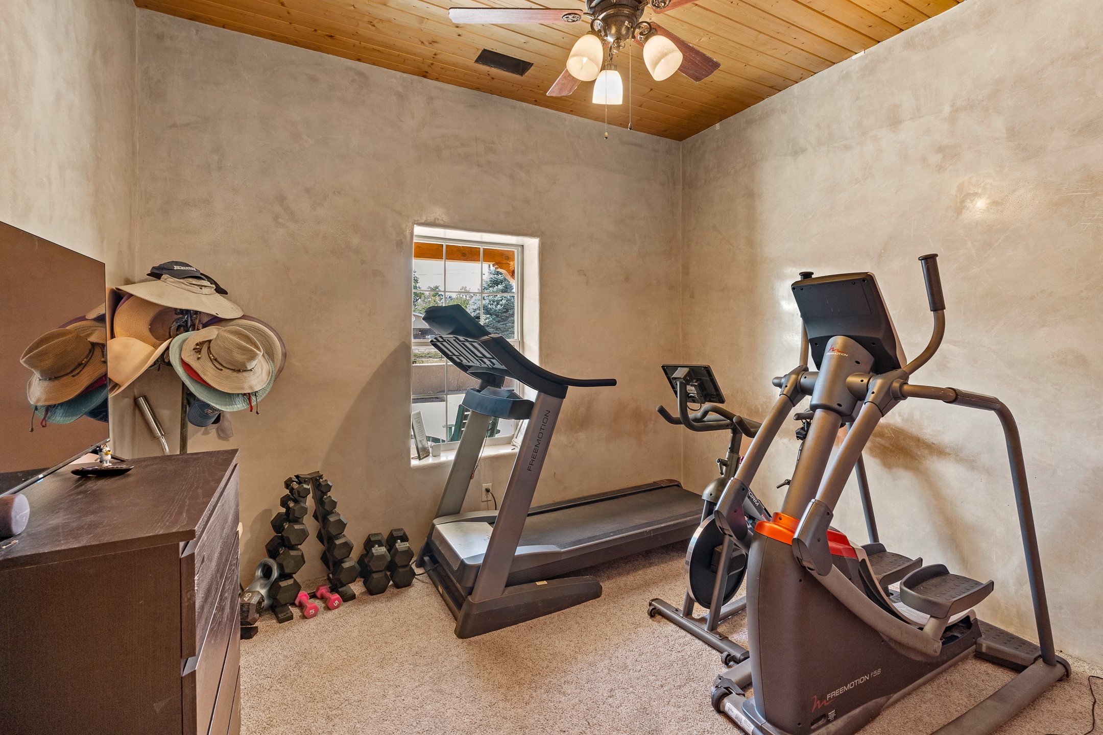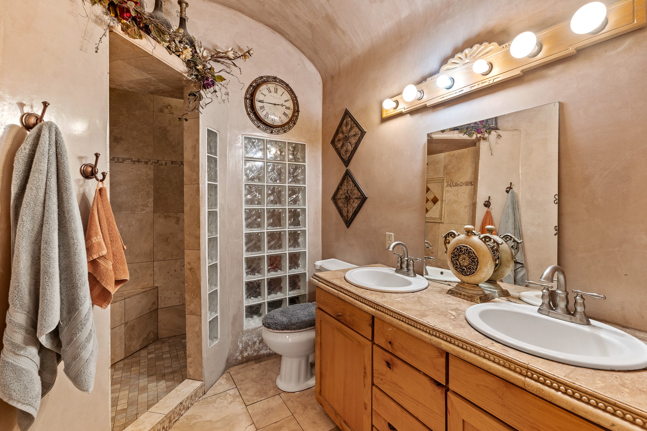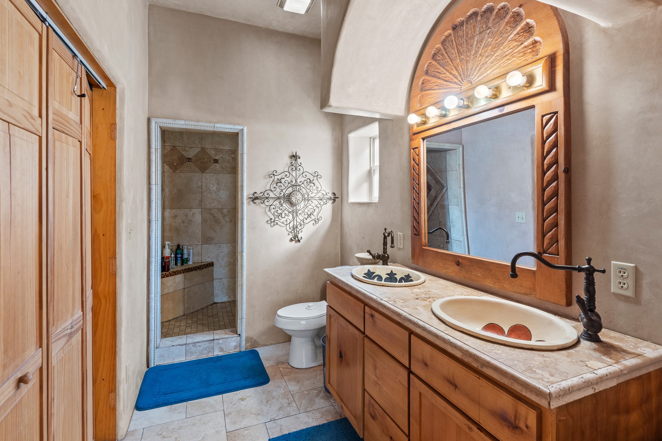 Charming Adobe Retreat with Guest House, Vineyard, Orchard & Lush Gardens! Completely rebuilt in 2009, this stunning adobe and frame construction home blends traditional Southwestern charm with modern luxury. Featuring 3 bedrooms and 2 bathrooms in the main home, these homes sit on a beautiful lot bursting with fruit trees--including chokecherry, plum, apple, and peach--as well as vibrant gardens with mature trees and your very own vineyard! Inside, you'll find diamond plaster walls, custom cabinets, granite countertops with a coordinating backsplash, and travertine tile floors. Thoughtful details like nichos, hand-carved woodwork, vigas with tongue-and-groove ceilings, and excellent bedroom separation create a warm, refined ambiance throughout. The detached guest house is light-filled and inviting, with wood floors, T&G ceilings, a wood stove, custom cabinetry, and intricate hand-carved accents. The guest house is perfect for visitors, rental income, or a creative studio space. Enjoy spacious front and side patios, ideal for entertaining or relaxing under the stars, plus a fabulous hot tub for year-round enjoyment. A rare opportunity to own a uniquely artistic and serene property--this home is a true oasis. Conveniently located in Espanola with a short 30 minute drive to LANL.