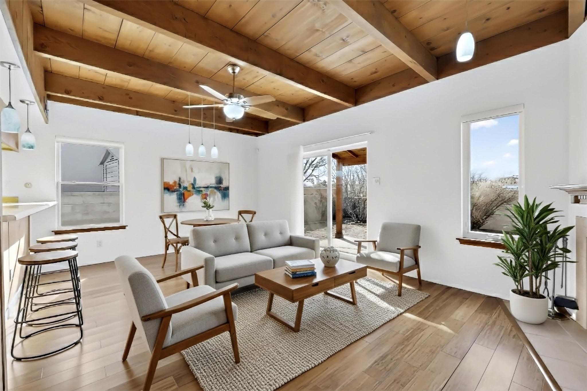 Charming, updated, freshly painted and super cute single level home offers 1325 +/- sqft, 3-bedroom, 2-bath, 1-car finished garage of comfortable living. The third bedroom would make a convenient and light office. Perfectly situated on a wonderful lot backing to open space/arroyo, this property offers a spacious feel. Inside, the entryway leads to the inviting living room featuring wood beams, wood built-in bookshelves, dining area, a wood-burning fireplace, and sliding glass doors -- adding warmth, light and character. The kitchen boasts abundant cabinets, generous counter space, a pantry, gas range, stainless-steel dishwasher, and breakfast bar--ideal for casual dining or entertaining. The primary suite offers two closets and a remodeled ensuite bath with a stunning, tiled walk-in shower. Step outside to enjoy the easy-care, walled backyard with a covered portal, perfect for relaxing. Additional highlights include: New stucco on most exterior walls-Ample storage closets throughout-Large capacity washer/dryer-Forced air heat-Ceiling fans-NEWER windows-NEWER pendant and can lighting light fixtures-Dimmer switches-NEWER tile and Bamboo wood floors, and NEW laminate flooring in 2 bedrooms (No carpet)-Top/down bottom-up Hunter Douglas blinds-and so much more. Located in the La Villa Serena subdivision, approximately 10-minute drive to the Santa Fe Plaza, a few minute walk to Ragle Park, the Arroyo Chamiso and Rail Trails. This move-in-ready home close to schools, restaurants, shopping and hospitals blends warmth, character, and modern updates--a perfect combination of comfort and style.