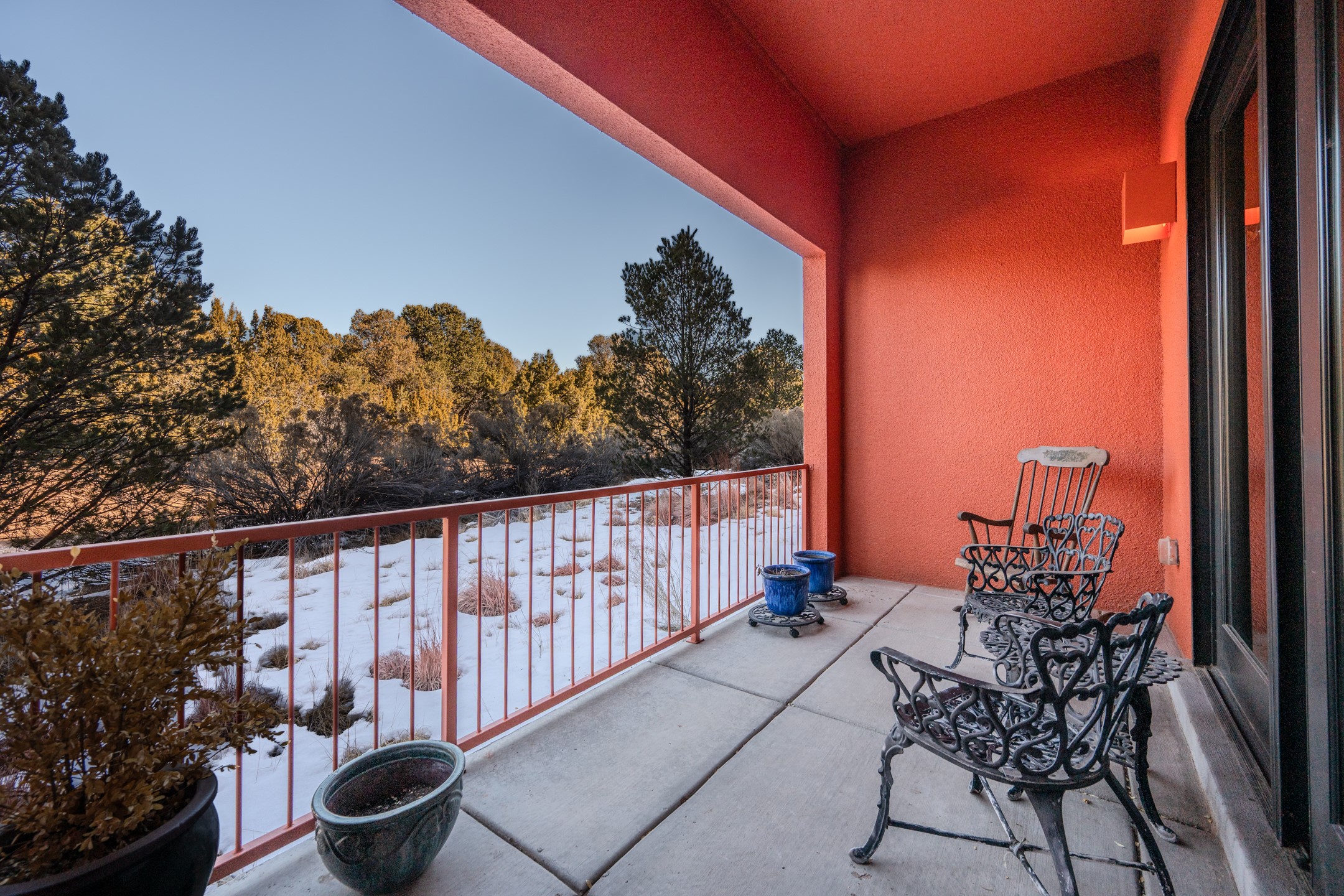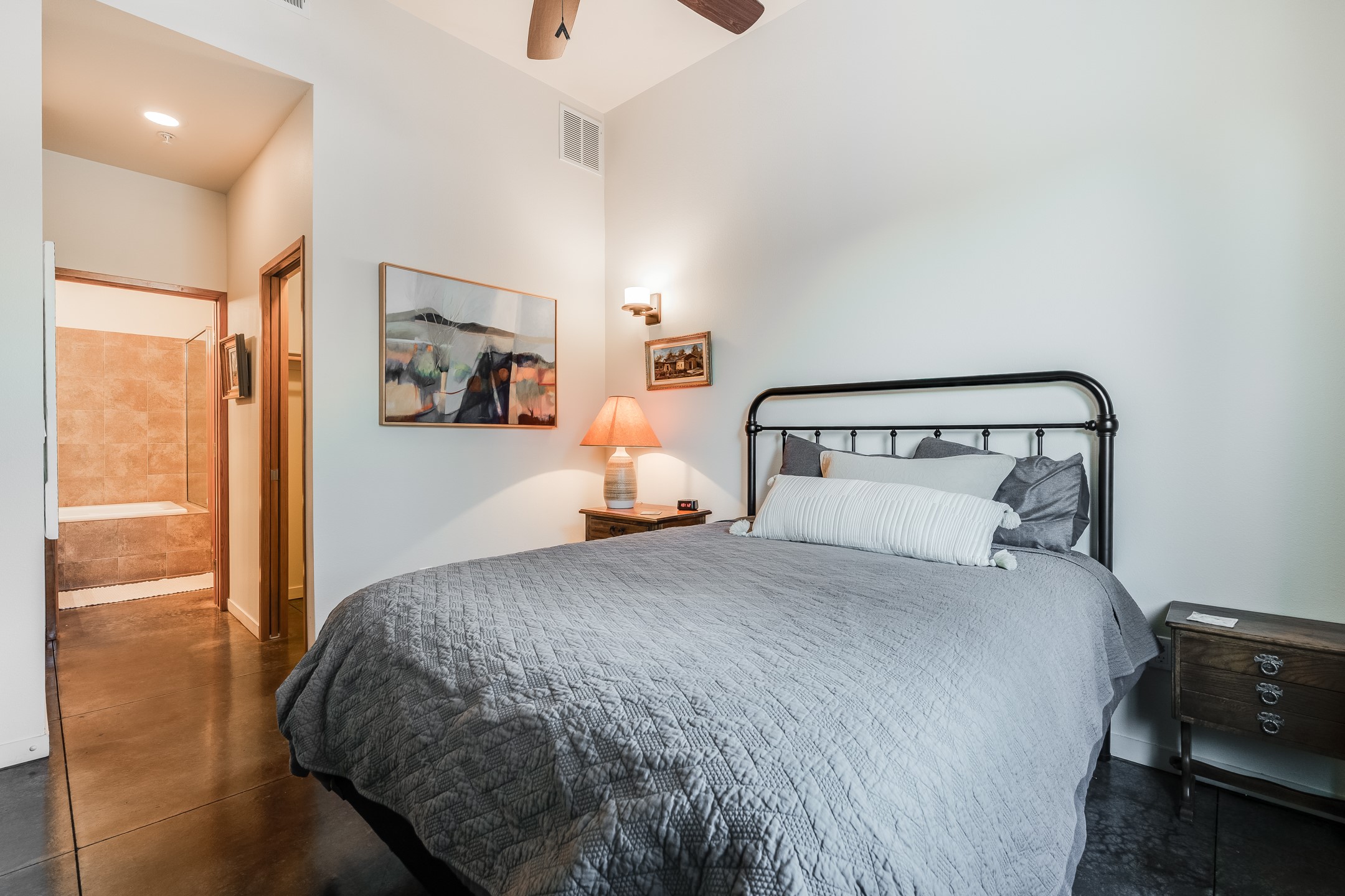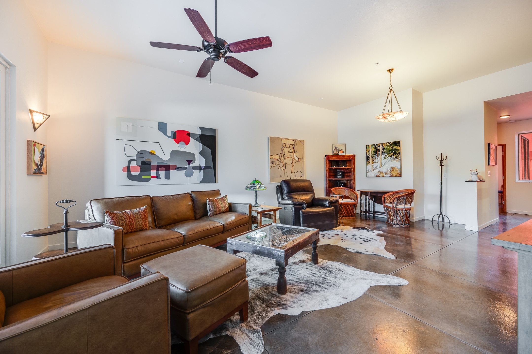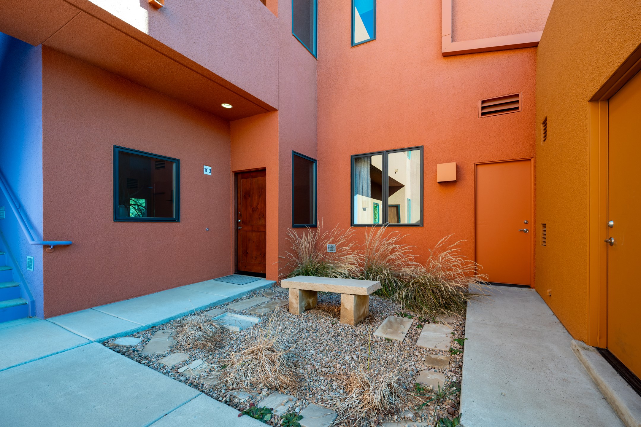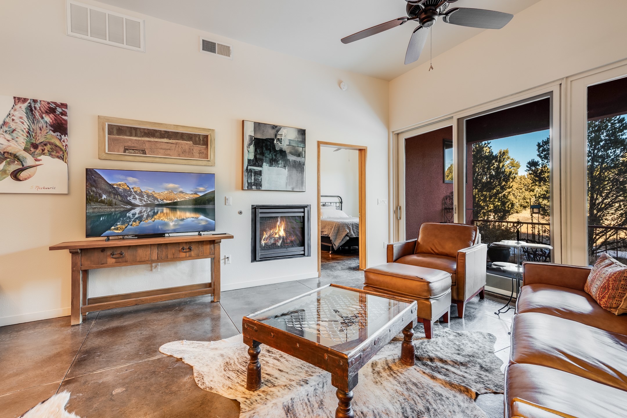Welcome to Zocalo, a Santa Fe Condominium development offering unmatched convenience and amenities including an outdoor pool and spa, two gyms, a barbecue area and clubhouse. This ground-level unit is a Plaza floor plan designed by Ricardo Legorreta and received multiple awards by the Haciendas Parade of Homes, including an award for best use of space. Featuring easy to care stained concrete flooring throughout, stainless steel appliances, Pella windows, and a well designed, efficient floor plan. The condo has a wonderful orientation with the living room directly accessing the covered north-facing patio. Other desirable features include refrigerated A/C, gas fireplace, and a one-car garage. All of this within a few short minutes to the Plaza, Opera and hiking trails.