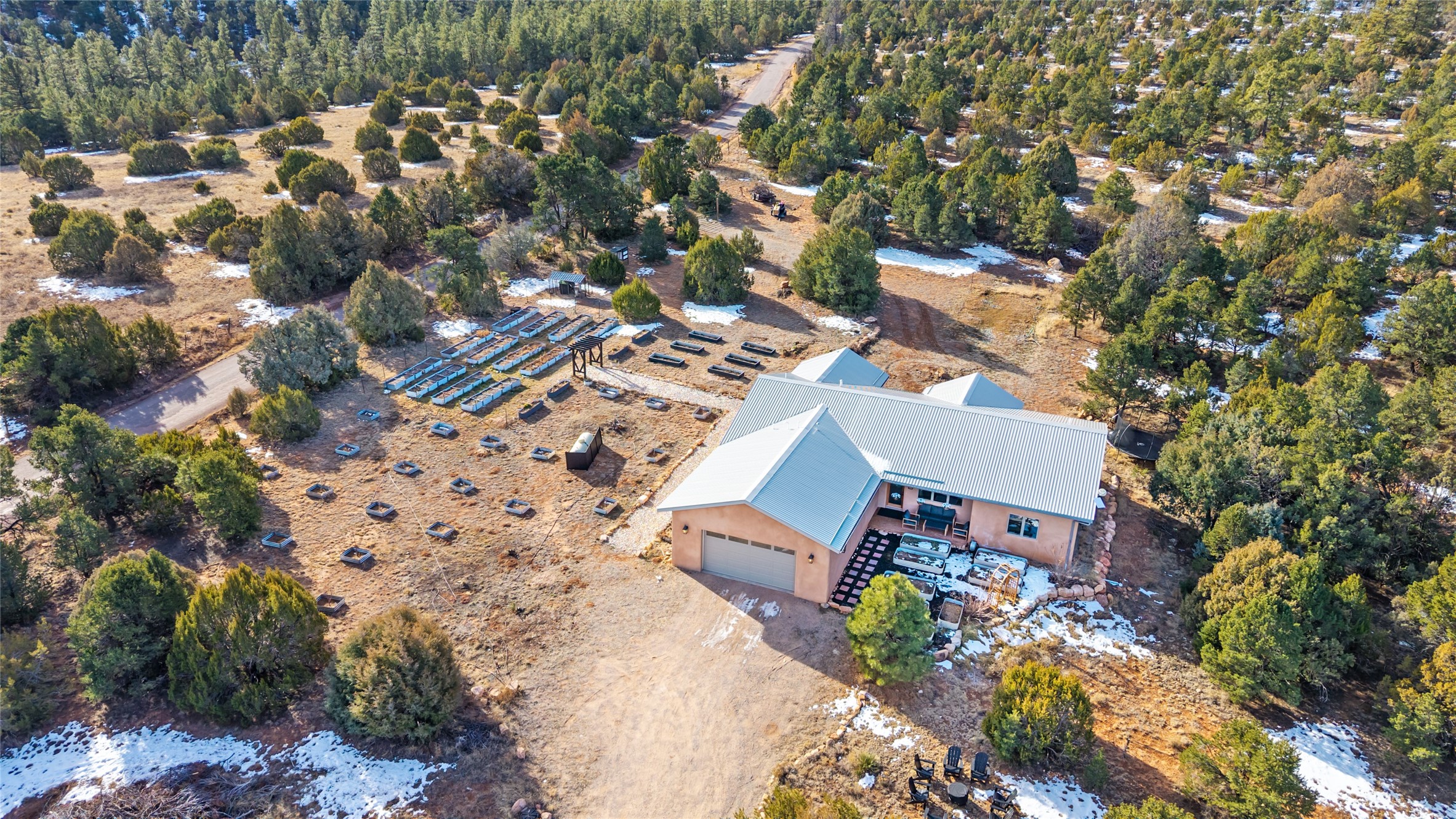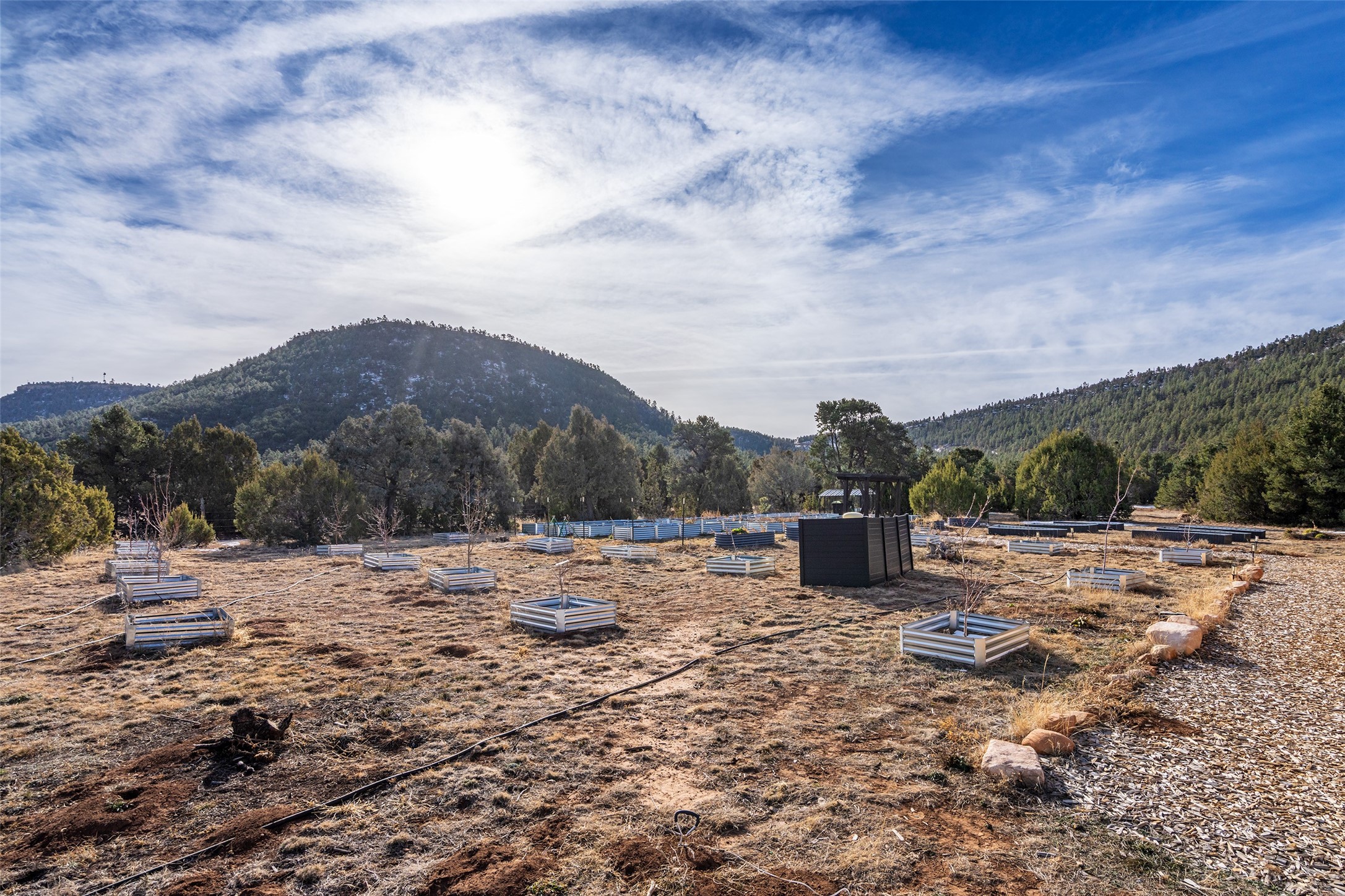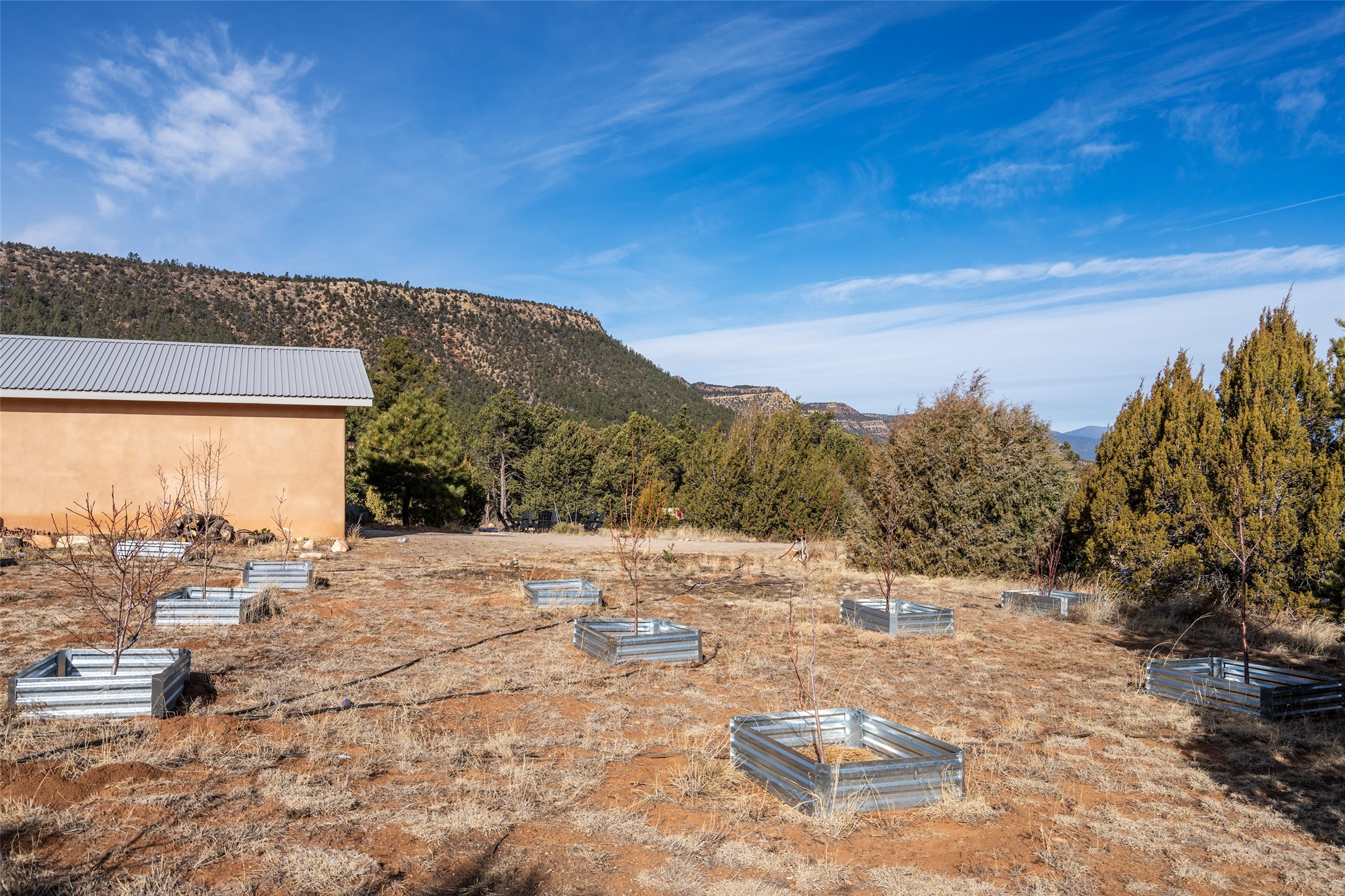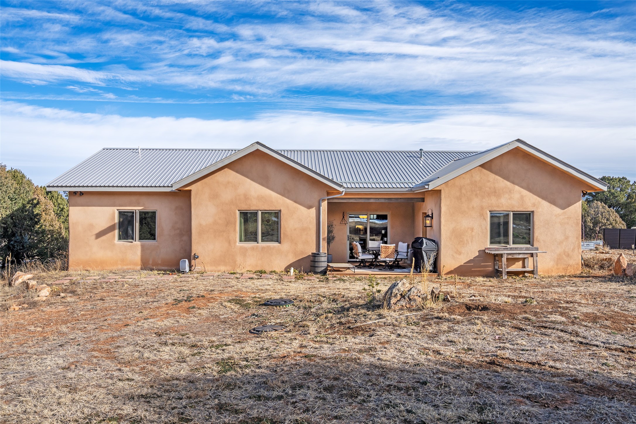 Located at the base of Rowe Mesa, this ranch-style home on nearly 4 Acres of flat useable land, offers wide skies, mountain views, and rural privacy all just 30 minutes from Santa Fe.Built in 2021, the custom residence provides exceptional comfort with a modern ranch style. A pitched propanel roof, classic stucco exterior, and warm natural finishes create an inviting, grounded feel throughout. Inside, the open-concept living and kitchen area is ideal for entertaining, with island seating, a pantry, and easy access to the attached two car garage. Brick floors, wood cabinetry, subway tile accents, and planked wood ceilings add texture and space, while three bedrooms and two baths provide flexible, comfortable living. Radiant heat and mini-splits ensure year-round comfort.Outside, the land truly shines. Mature fruit trees, thoughtfully tended garden beds, and two chicken coops support a slower, more self-sufficient lifestyle. Bordering the Santa Fe National Forest, the property offers direct access to nature, and unbounded recreation.With usable acreage and newer construction in a serene high-desert setting, this is a place to breathe deeply, spread out, and feel at home.