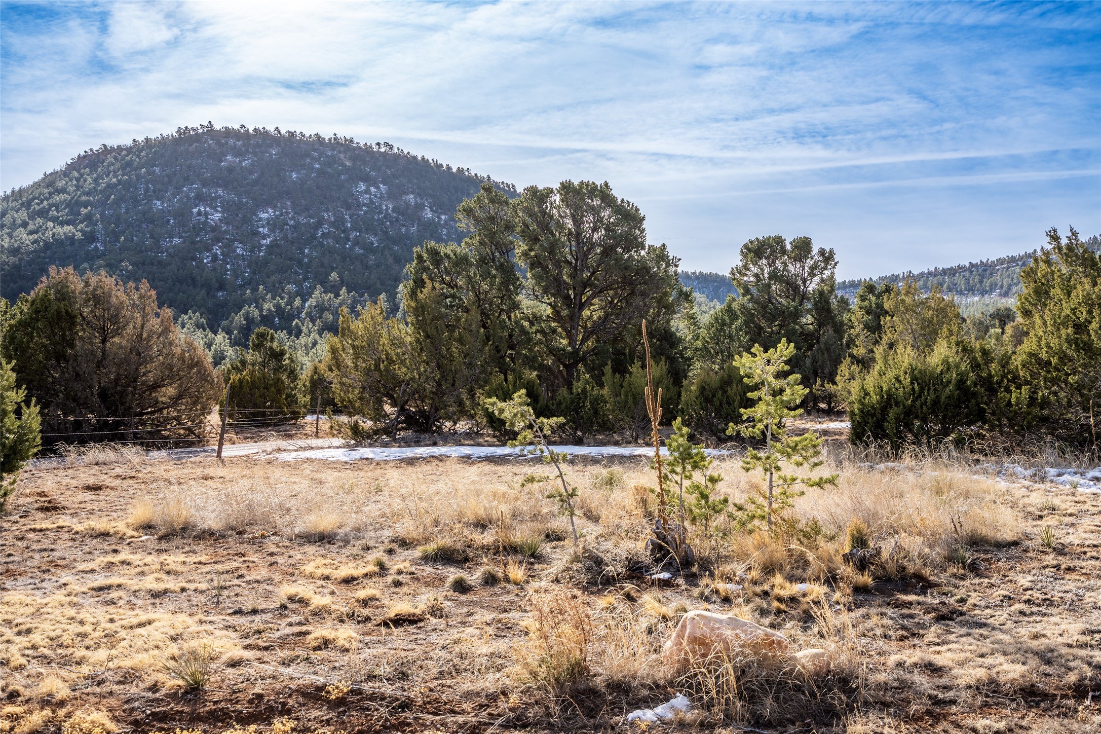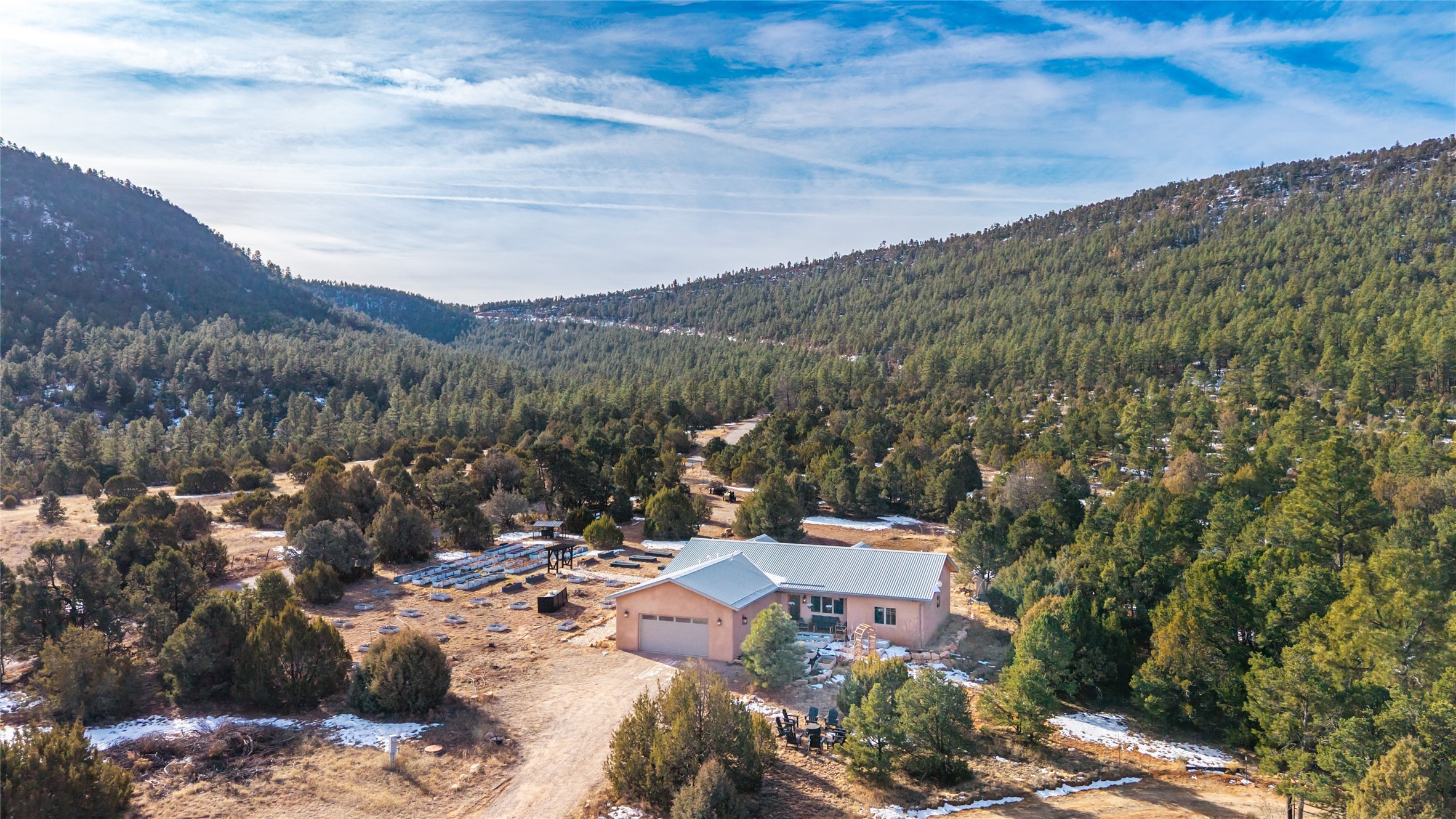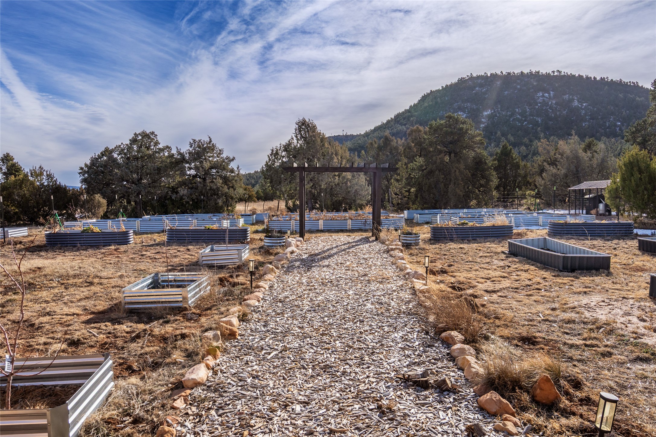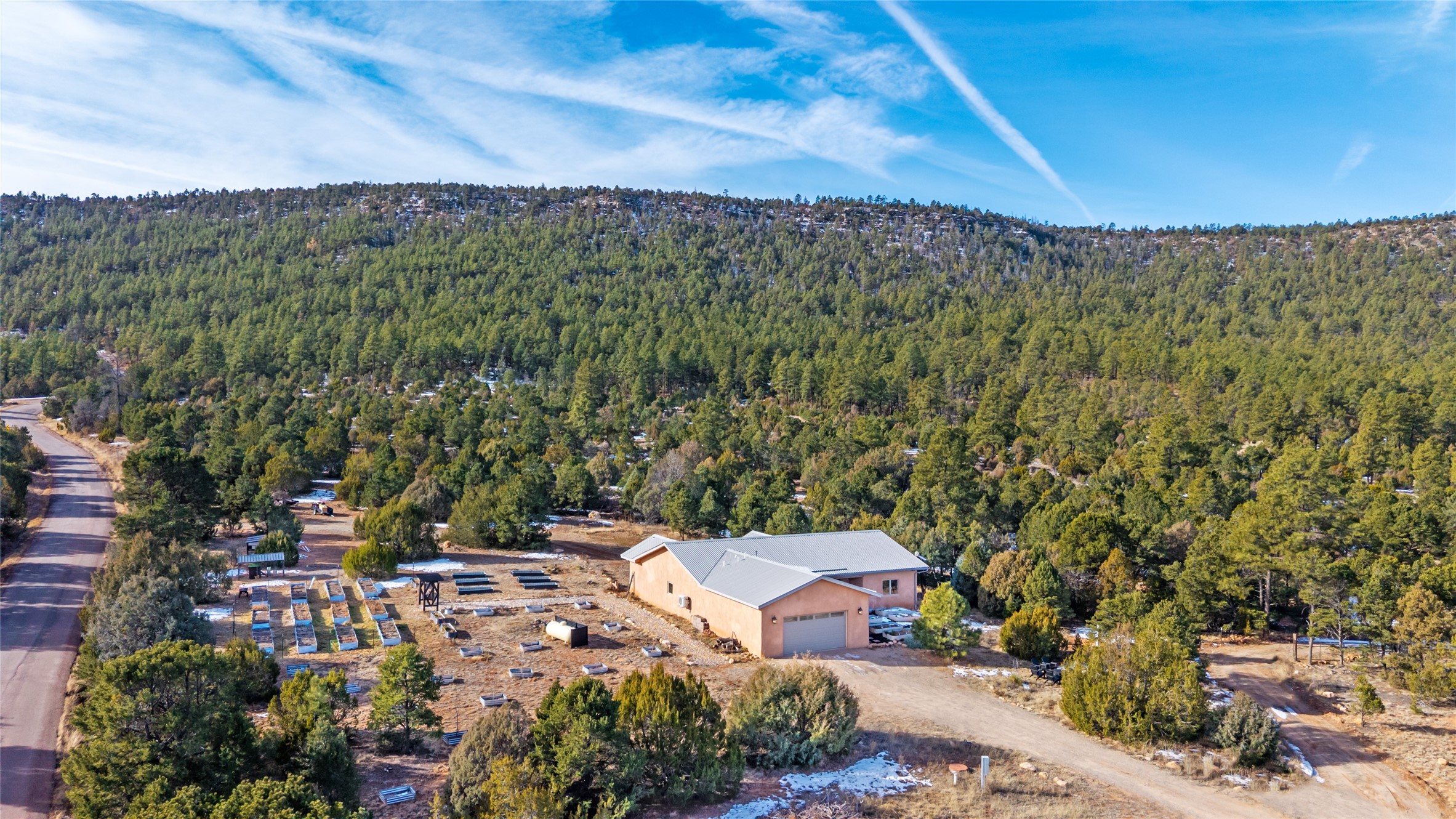 Located at the base of Rowe Mesa, this ranch-style home on nearly 4 Acres of flat useable land, offers wide skies, mountain views, and rural privacy all just 30 minutes from Santa Fe.Built in 2021, the custom residence provides exceptional comfort with a modern ranch style. A pitched propanel roof, classic stucco exterior, and warm natural finishes create an inviting, grounded feel throughout. Inside, the open-concept living and kitchen area is ideal for entertaining, with island seating, a pantry, and easy access to the attached two car garage. Brick floors, wood cabinetry, subway tile accents, and planked wood ceilings add texture and space, while three bedrooms and two baths provide flexible, comfortable living. Radiant heat and mini-splits ensure year-round comfort.Outside, the land truly shines. Mature fruit trees, thoughtfully tended garden beds, and two chicken coops support a slower, more self-sufficient lifestyle. Bordering the Santa Fe National Forest, the property offers direct access to nature, and unbounded recreation.With usable acreage and newer construction in a serene high-desert setting, this is a place to breathe deeply, spread out, and feel at home.