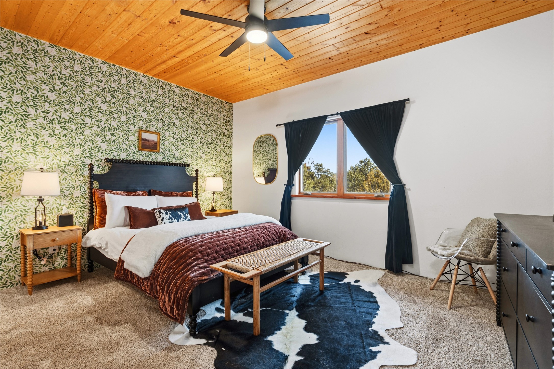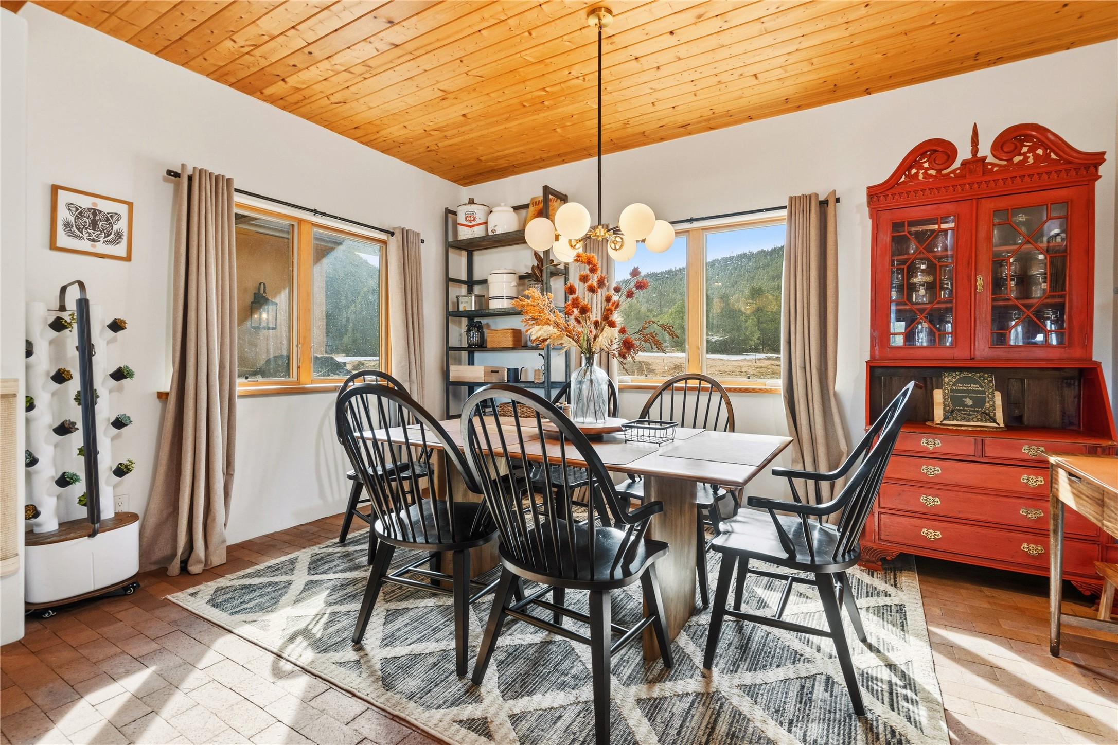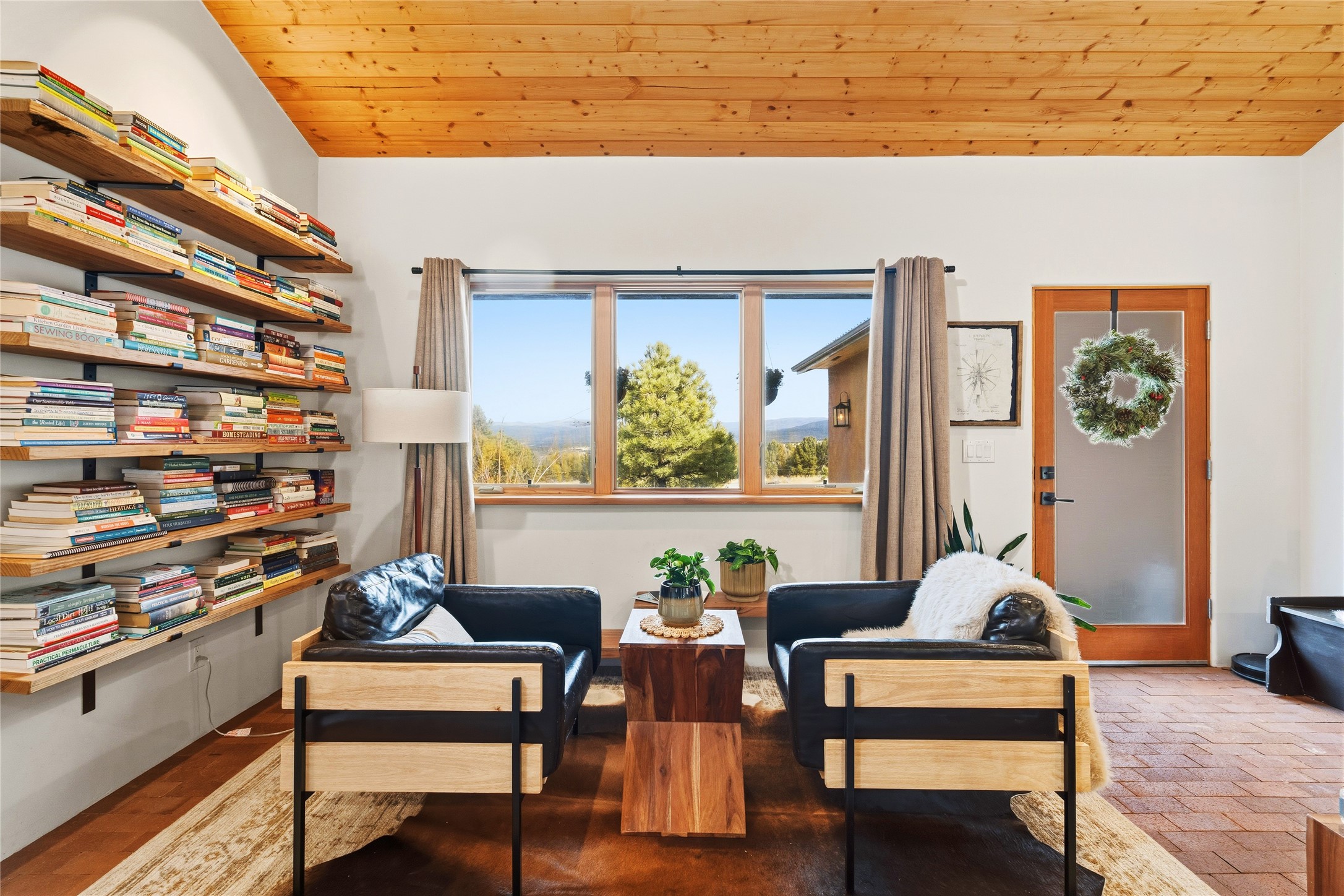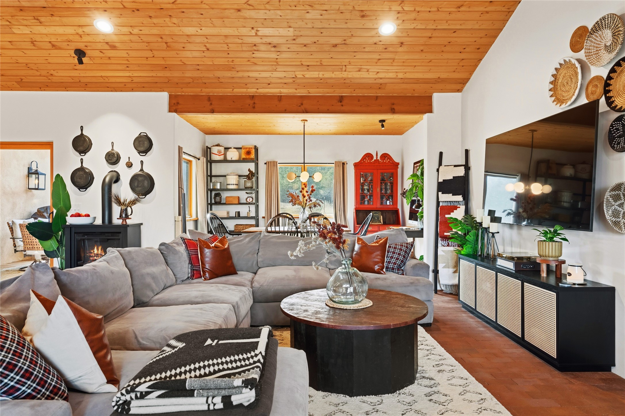 Located at the base of Rowe Mesa, this ranch-style home on nearly 4 Acres of flat useable land, offers wide skies, mountain views, and rural privacy all just 30 minutes from Santa Fe.Built in 2021, the custom residence provides exceptional comfort with a modern ranch style. A pitched propanel roof, classic stucco exterior, and warm natural finishes create an inviting, grounded feel throughout. Inside, the open-concept living and kitchen area is ideal for entertaining, with island seating, a pantry, and easy access to the attached two car garage. Brick floors, wood cabinetry, subway tile accents, and planked wood ceilings add texture and space, while three bedrooms and two baths provide flexible, comfortable living. Radiant heat and mini-splits ensure year-round comfort.Outside, the land truly shines. Mature fruit trees, thoughtfully tended garden beds, and two chicken coops support a slower, more self-sufficient lifestyle. Bordering the Santa Fe National Forest, the property offers direct access to nature, and unbounded recreation.With usable acreage and newer construction in a serene high-desert setting, this is a place to breathe deeply, spread out, and feel at home.