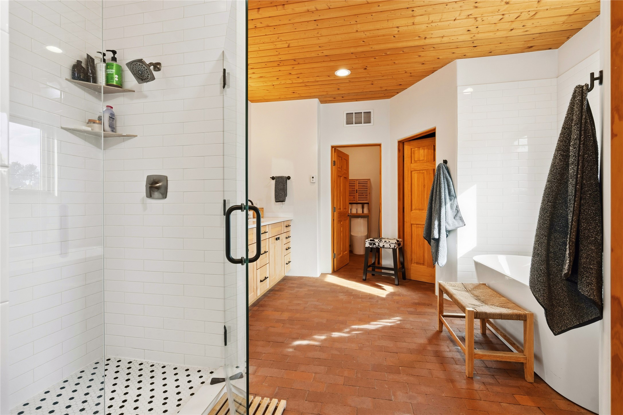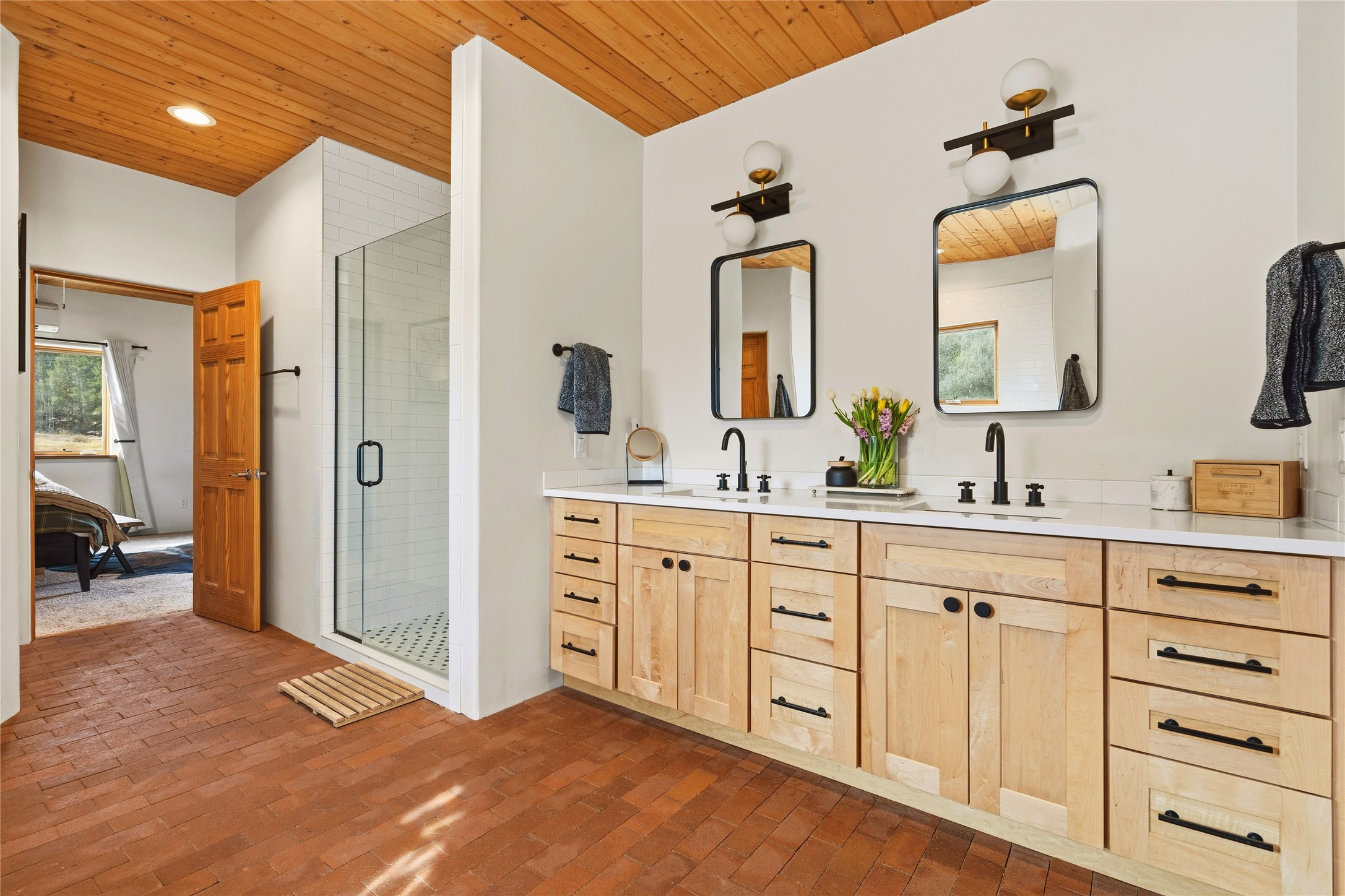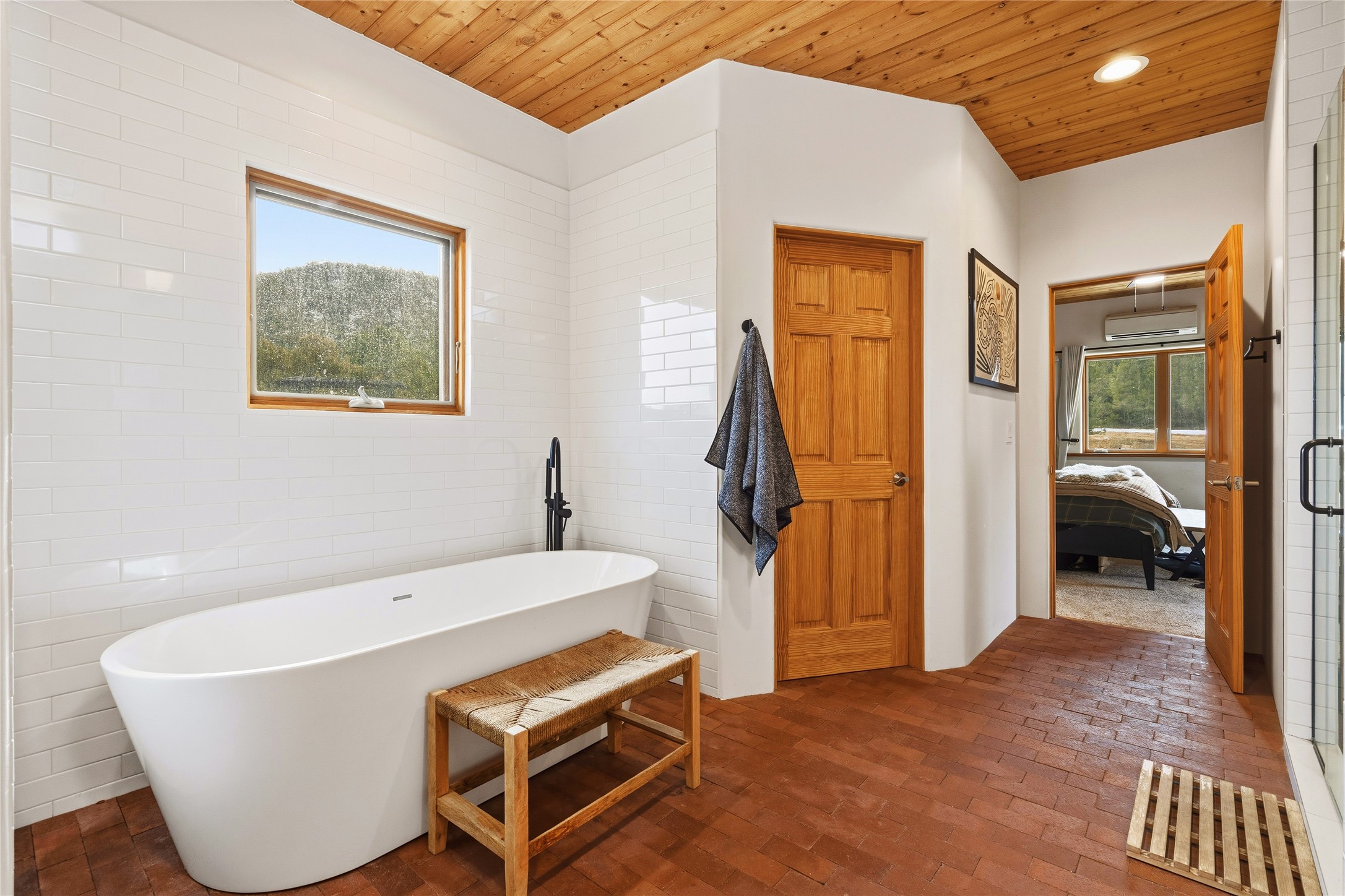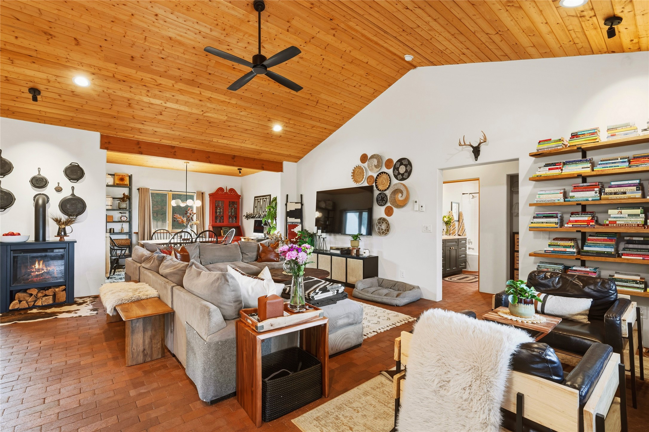 Located at the base of Rowe Mesa, this ranch-style home on nearly 4 Acres of flat useable land, offers wide skies, mountain views, and rural privacy all just 30 minutes from Santa Fe.Built in 2021, the custom residence provides exceptional comfort with a modern ranch style. A pitched propanel roof, classic stucco exterior, and warm natural finishes create an inviting, grounded feel throughout. Inside, the open-concept living and kitchen area is ideal for entertaining, with island seating, a pantry, and easy access to the attached two car garage. Brick floors, wood cabinetry, subway tile accents, and planked wood ceilings add texture and space, while three bedrooms and two baths provide flexible, comfortable living. Radiant heat and mini-splits ensure year-round comfort.Outside, the land truly shines. Mature fruit trees, thoughtfully tended garden beds, and two chicken coops support a slower, more self-sufficient lifestyle. Bordering the Santa Fe National Forest, the property offers direct access to nature, and unbounded recreation.With usable acreage and newer construction in a serene high-desert setting, this is a place to breathe deeply, spread out, and feel at home.
