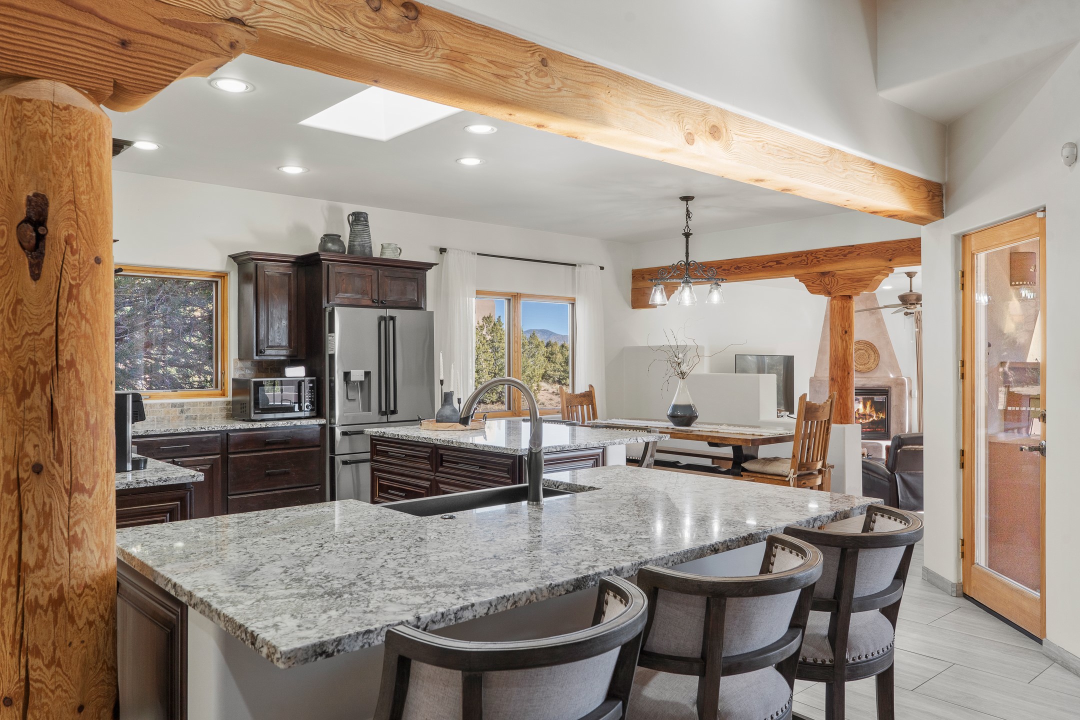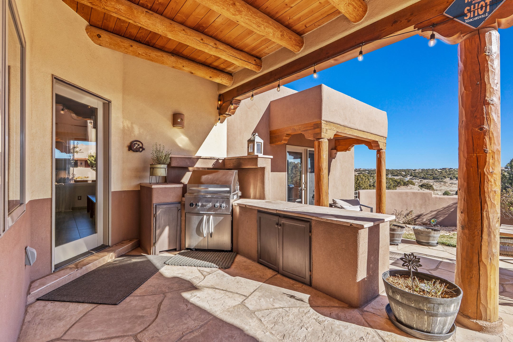 A rare opportunity in Rancho Viejo! This beautifully renovated single-level 4-bedroom, 3-bathroom home was built in 2002 and sits on 1.2 acres with sweeping views of the Sangre de Cristo foothills. Thoughtfully updated from top to bottom, every surface has been touched with care and high-quality craftsmanship.The open-concept floor plan offers effortless flow and versatility. A spacious living room with beautiful viga ceilings and a wood-burning kiva fireplace provides the perfect setting for entertaining. The fully reimagined kitchen features stone countertops, brand-new stainless steel appliances, and two islands--each with bar seating--while the adjacent dining area connects seamlessly to a cozy den with a gas fireplace, creating a warm and inviting gathering space.Step into the backyard and discover a private oasis: a large koi pond with water feature, covered portal with built-in grill, and a separate pergola with a gas firepit--perfect for relaxing or stargazing. The Rancho Viejo trail system is directly accessible from the yard.The primary suite enjoys stunning foothill views, a gas fireplace, direct access to the backyard portal, and the soothing sound of the water feature. The spa-like primary bath includes double vanities, a large walk-in shower, natural light, and garden views. Two guest bedrooms share a full bath in the South wing, while a third guest suite--located privately at the North end--shares a full bath that also serves as the guest powder room. A flexible bonus room near the living area functions beautifully as an office, hobby room, or reading nook.The show-stopper garage can be a 2-car garage with a very large storage area/workshop or a 3-car garage with storage/workshop! On the market for the first time, this home was custom built in 2002 for the current owners, who have lovingly maintained and recently renovated it with exceptional care. This is a rare find and a true Rancho Viejo treasure.