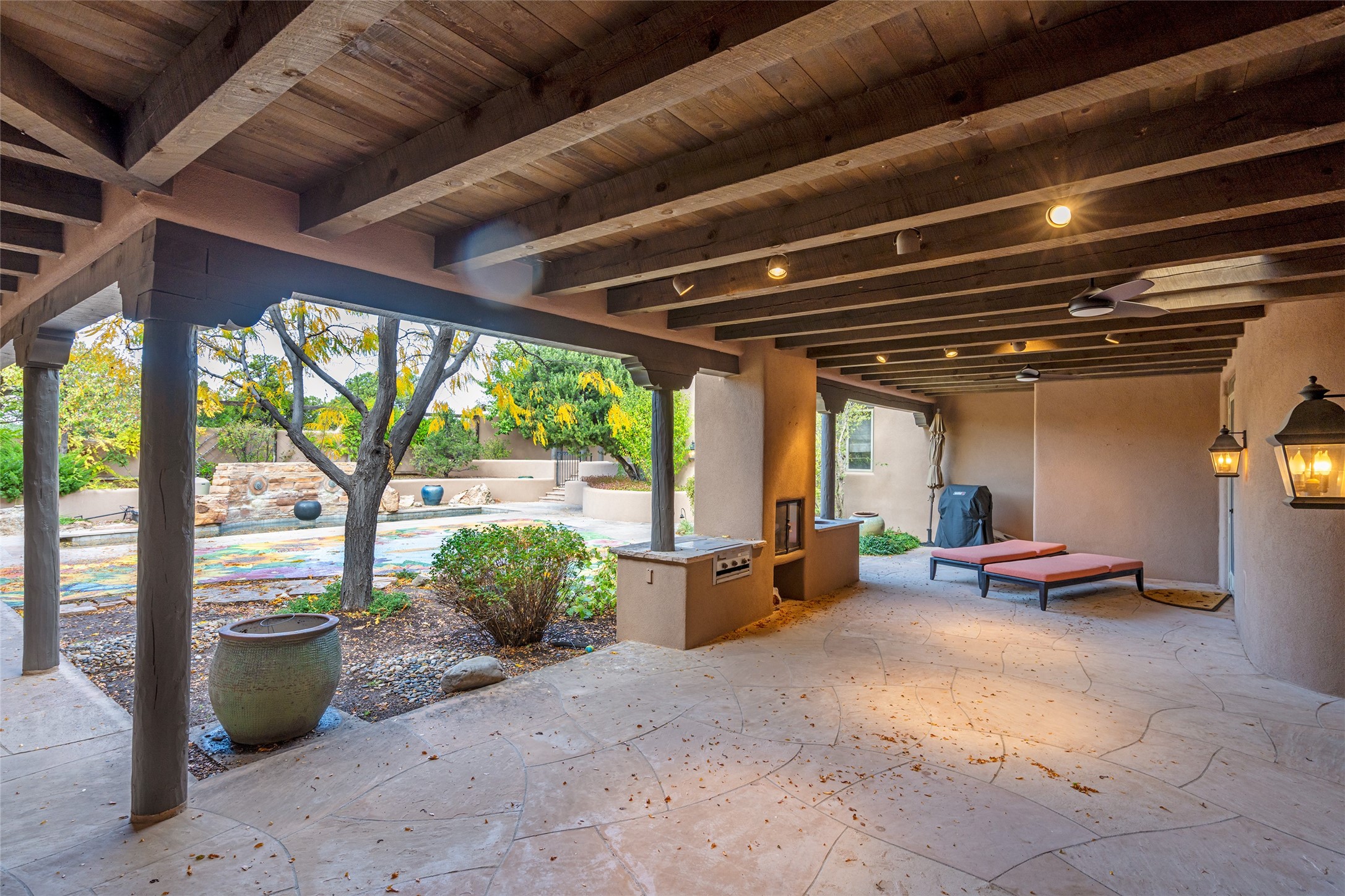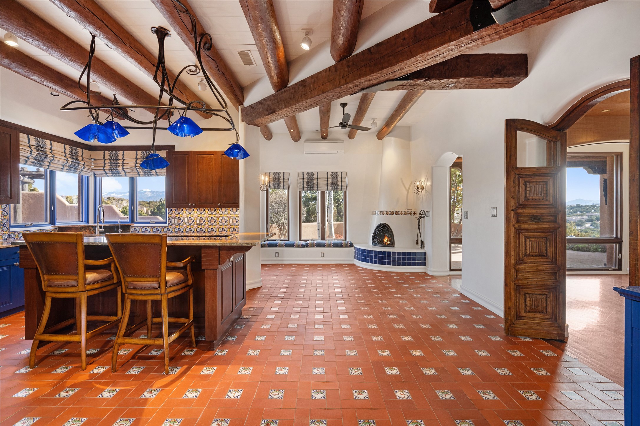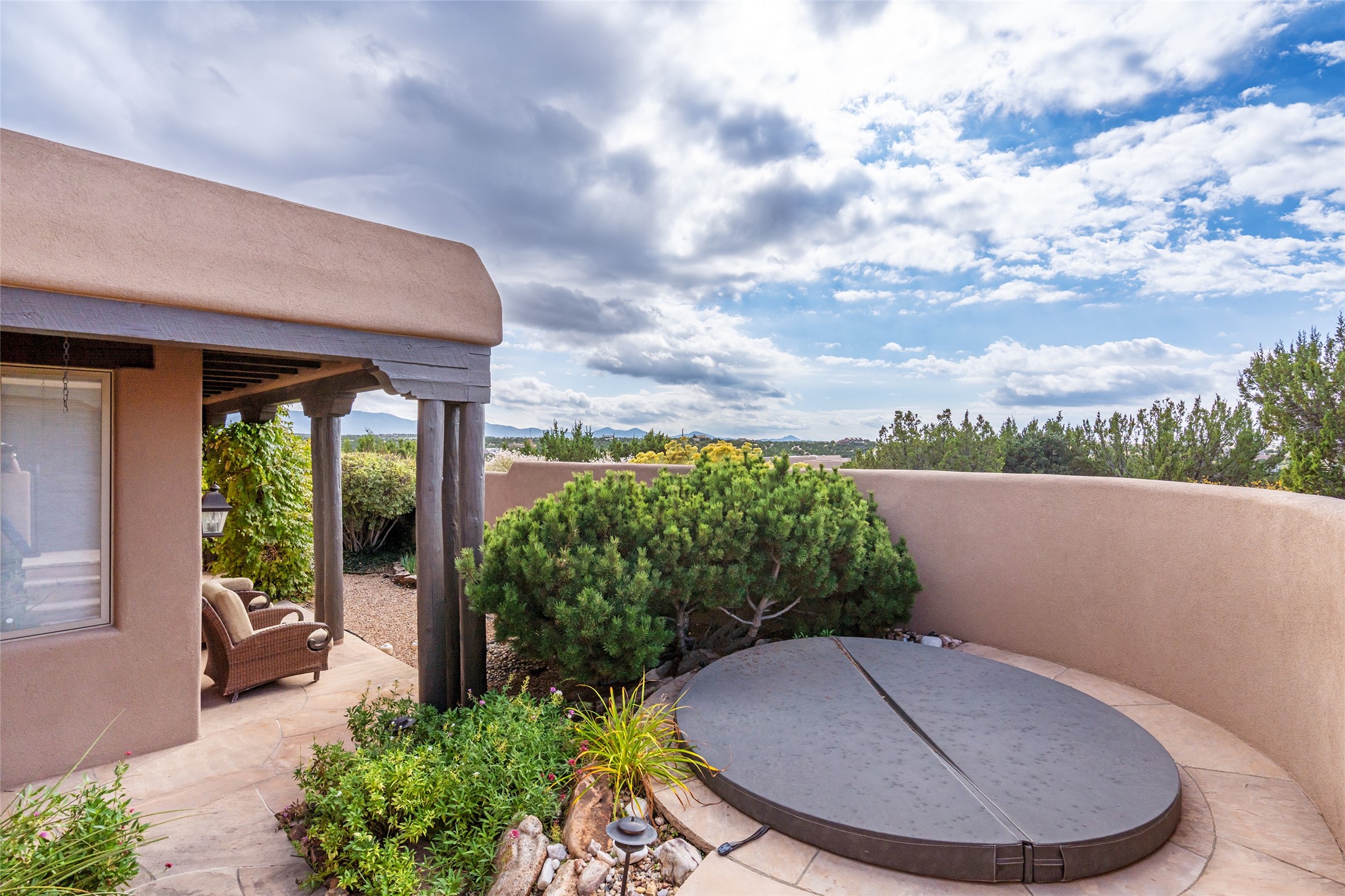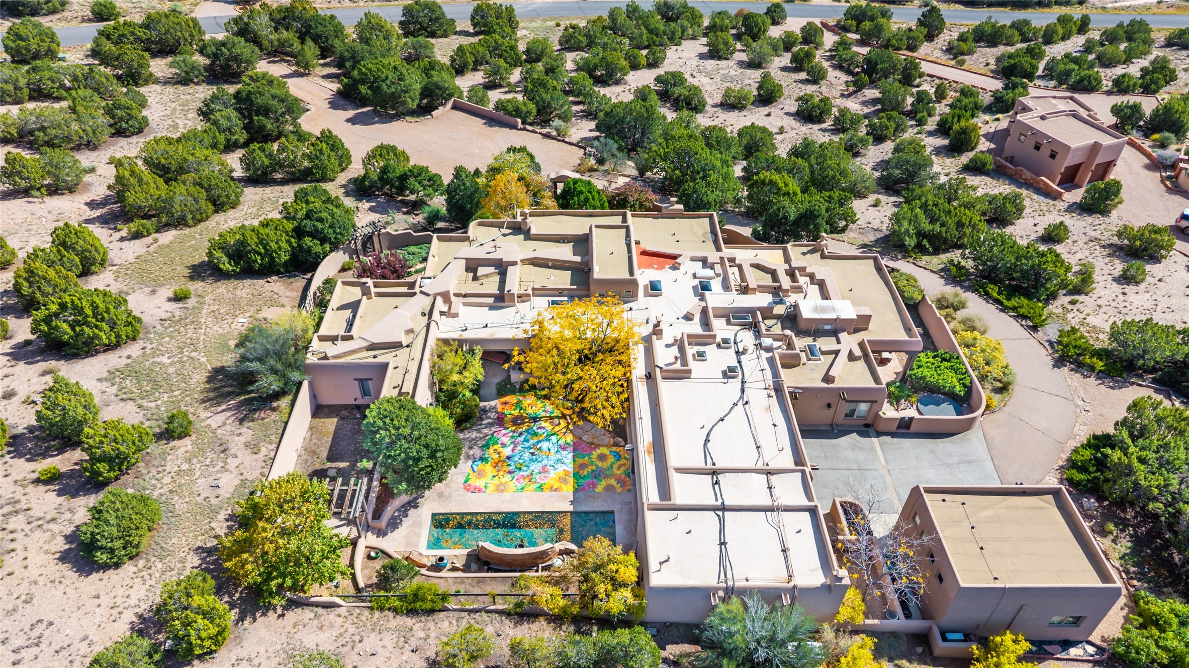 Expansive two bedroom home with guest house and studio. Exceptional views from your front porch and broad portal and large private back yard area perfect for entertaining. 230 square foot lap pool and hot tub for relaxing or entertaining. The main house has a grand foyer ready for art work with a back door showcasing the rear portal and back yard. The large kitchen has plenty of cabinet space, a butlers pantry, quartz counter tops, Wolf 5 burner stove, Cove Dishwasher, Subzero refrigerator, and a cozy banco/breakfast nook offset by a kiva fire place. Adjacent to the kitchen is a dining room that can easily seat 8 with nice views into the back courtyard and front yard. Down two steps past the office and large great room with fireplace to the massive main suite, full bathroom, soaking tub, two walk-in closets, sitting areas and easy access to the 8' hot tub. Guest house has a full kitchen and full bath. Detached studio ready for your endeavors. 2025 roof update with 5 year limited warranty on labor and materials. Must see this gem. Set up a showing today.