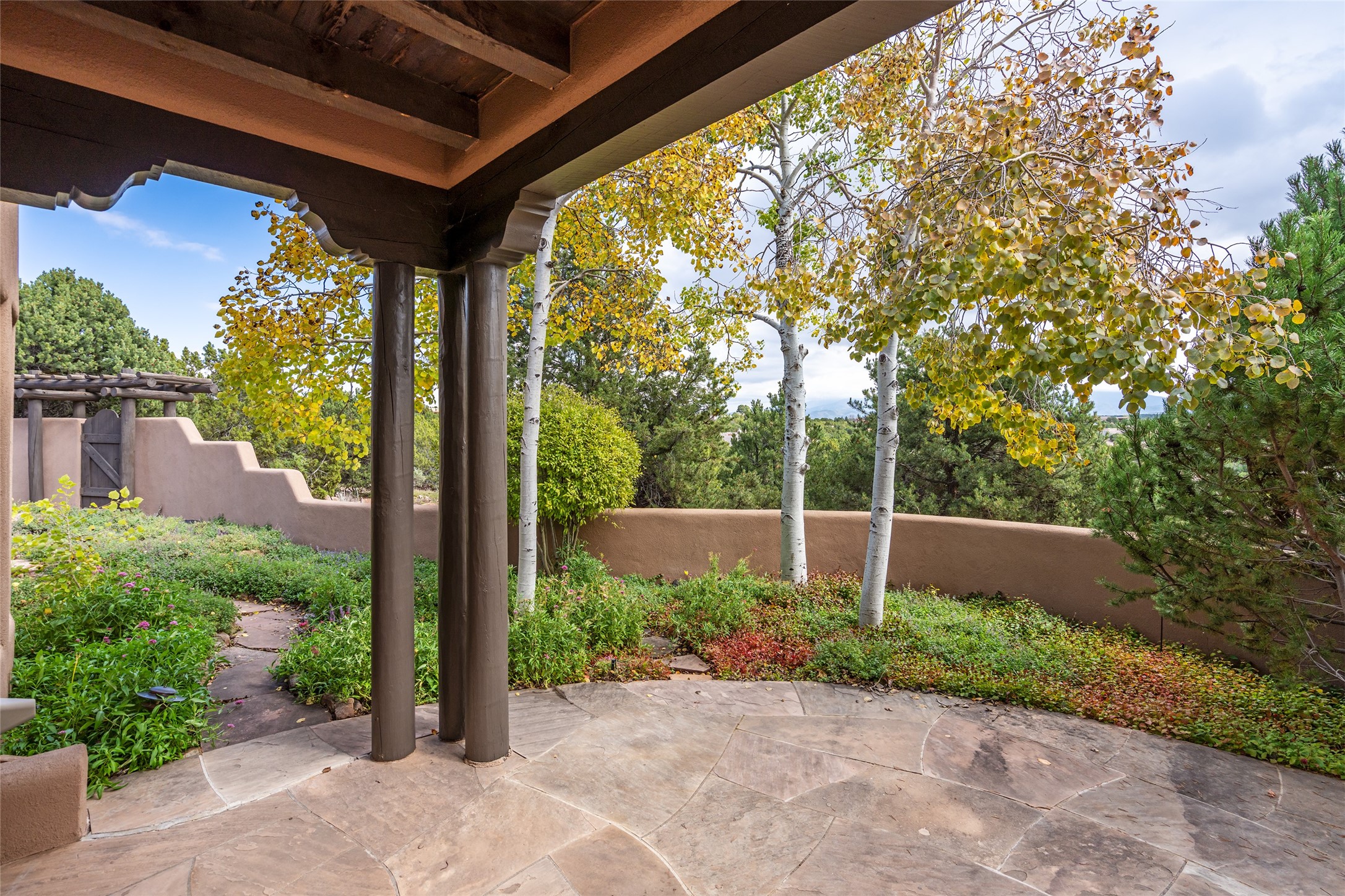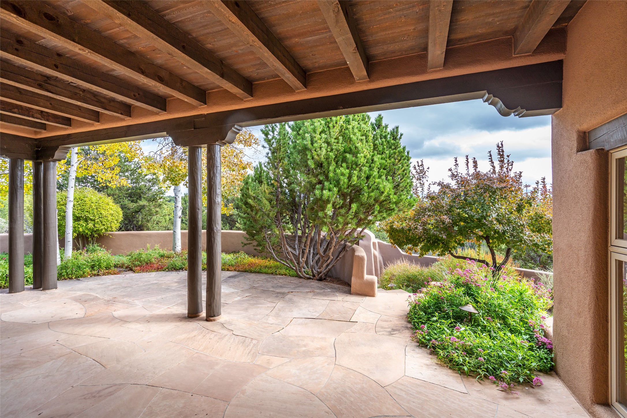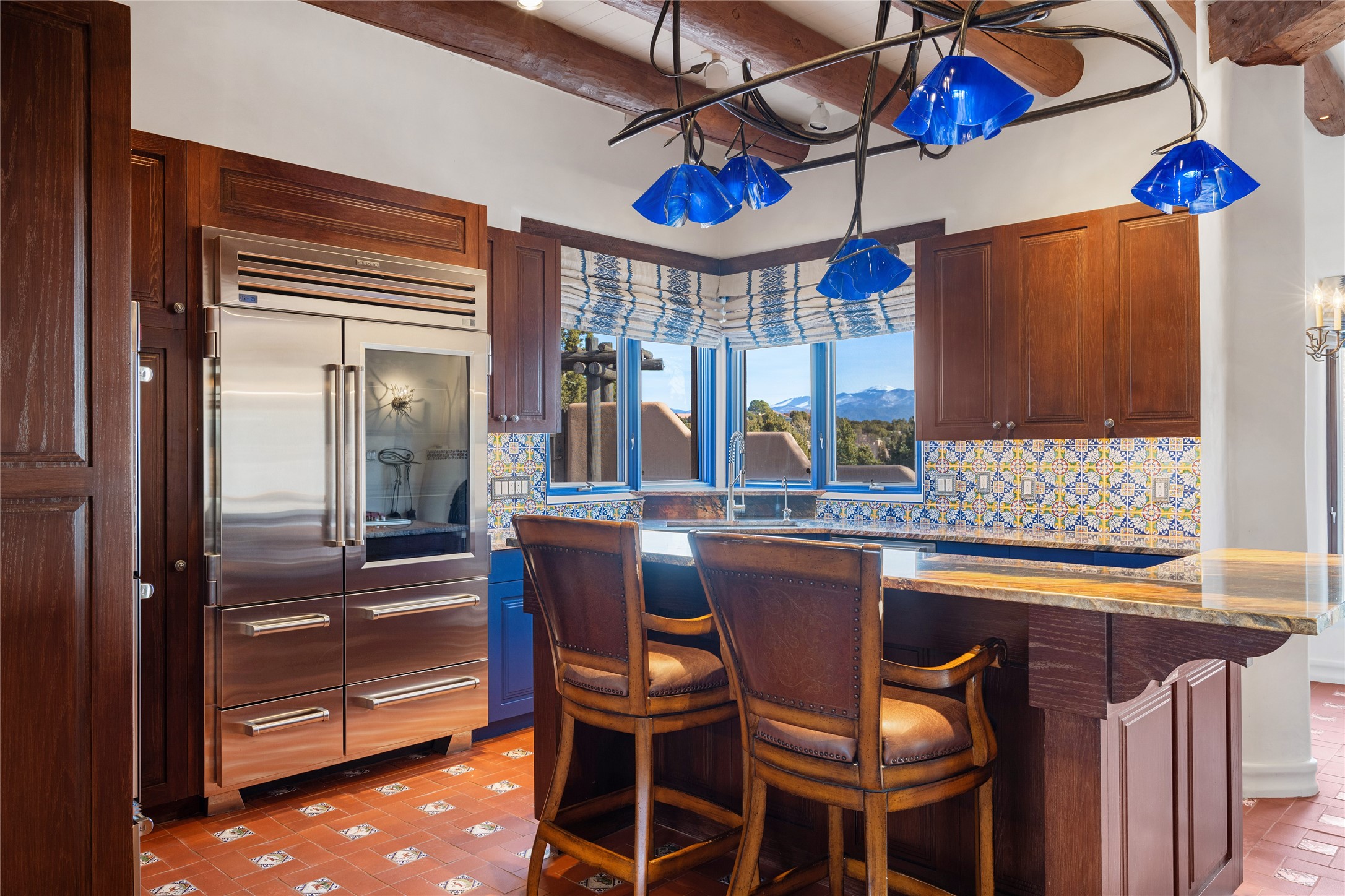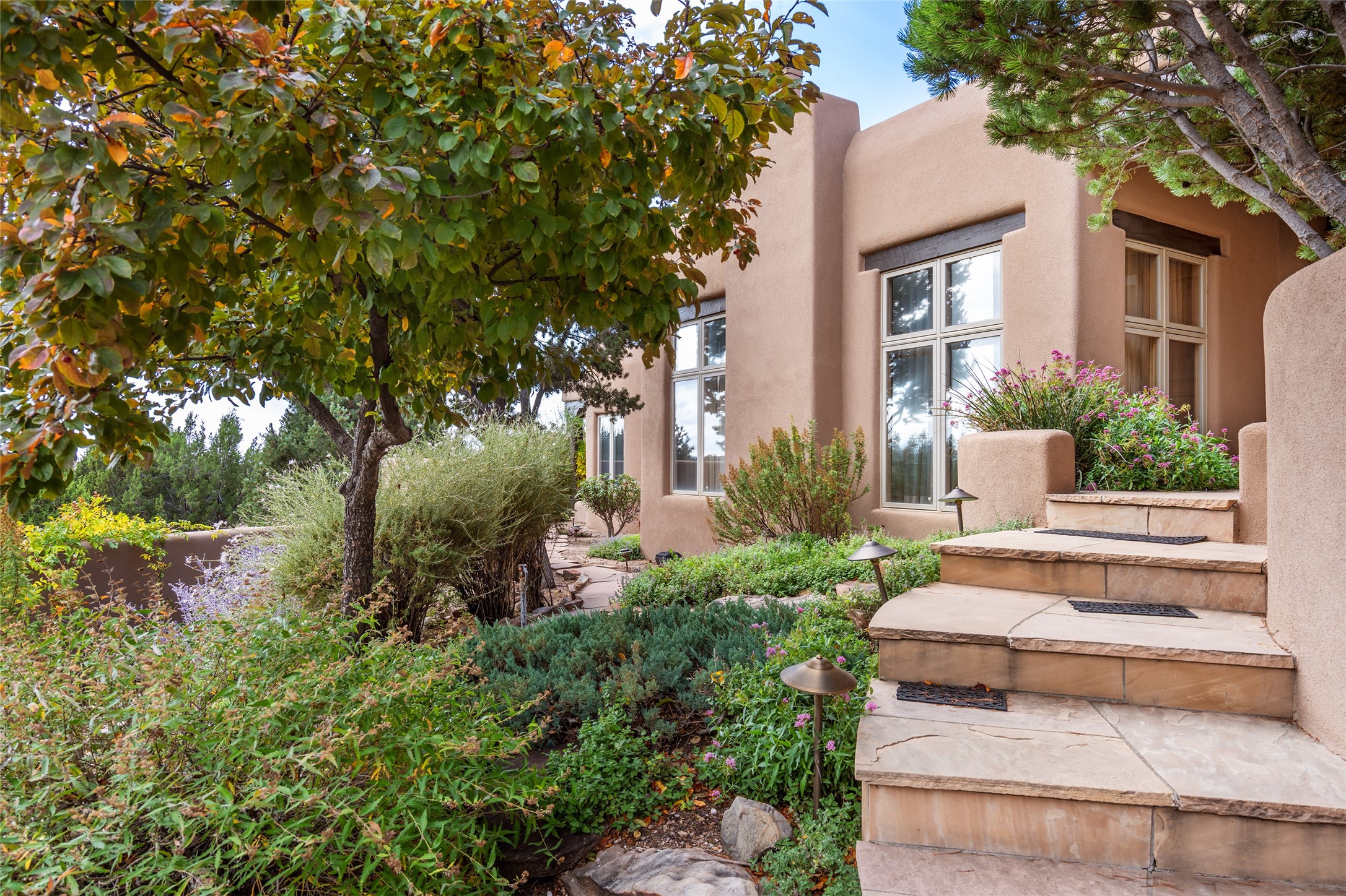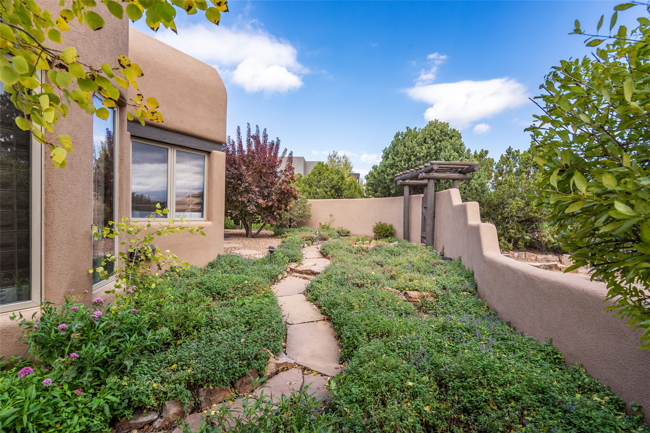 Expansive two bedroom home with guest house and studio. Exceptional views from your front porch and broad portal and large private back yard area perfect for entertaining. 230 square foot lap pool and hot tub for relaxing or entertaining. The main house has a grand foyer ready for art work with a back door showcasing the rear portal and back yard. The large kitchen has plenty of cabinet space, a butlers pantry, quartz counter tops, Wolf 5 burner stove, Cove Dishwasher, Subzero refrigerator, and a cozy banco/breakfast nook offset by a kiva fire place. Adjacent to the kitchen is a dining room that can easily seat 8 with nice views into the back courtyard and front yard. Down two steps past the office and large great room with fireplace to the massive main suite, full bathroom, soaking tub, two walk-in closets, sitting areas and easy access to the 8' hot tub. Guest house has a full kitchen and full bath. Detached studio ready for your endeavors. 2025 roof update with 5 year limited warranty on labor and materials. Must see this gem. Set up a showing today.