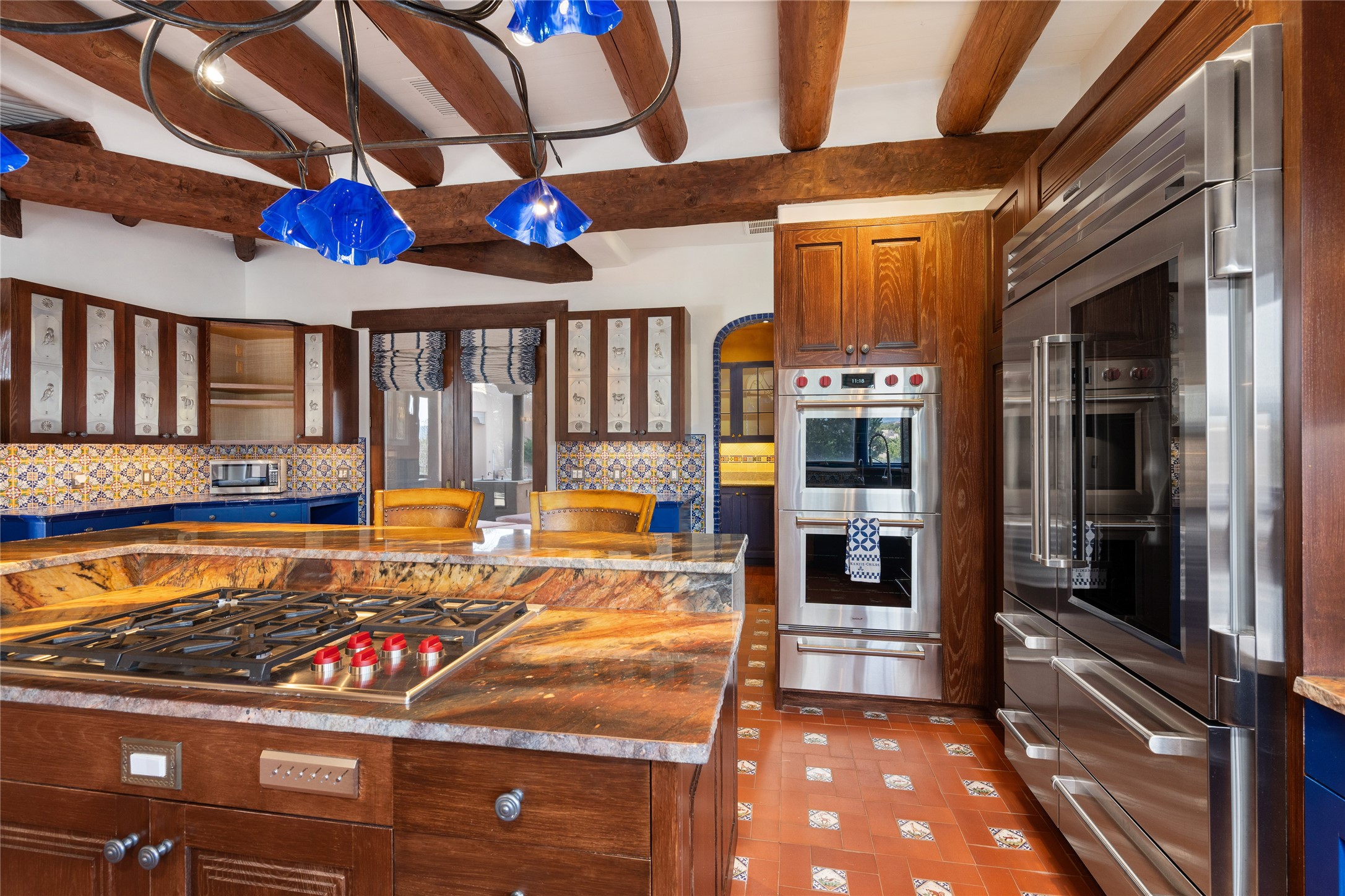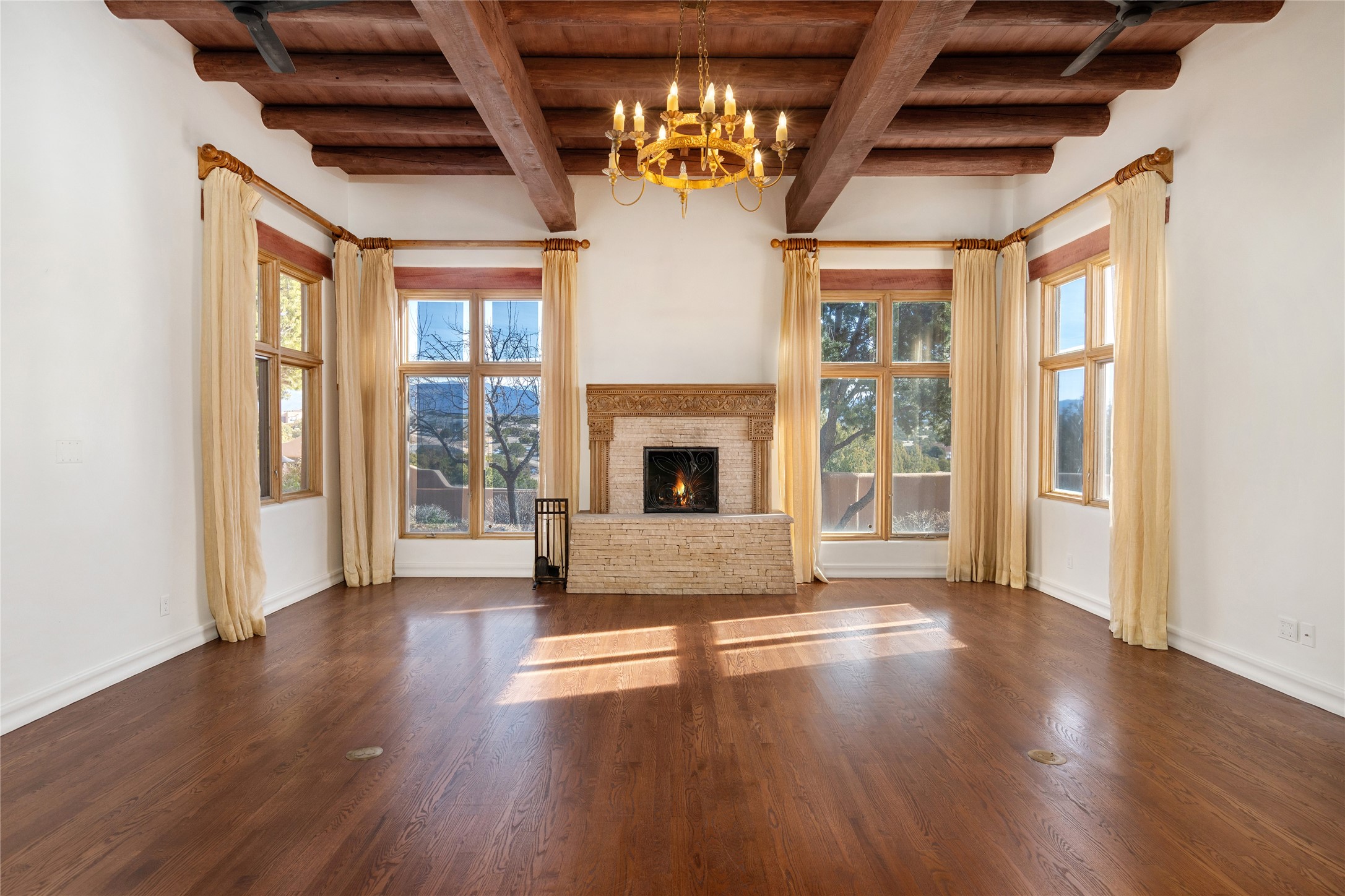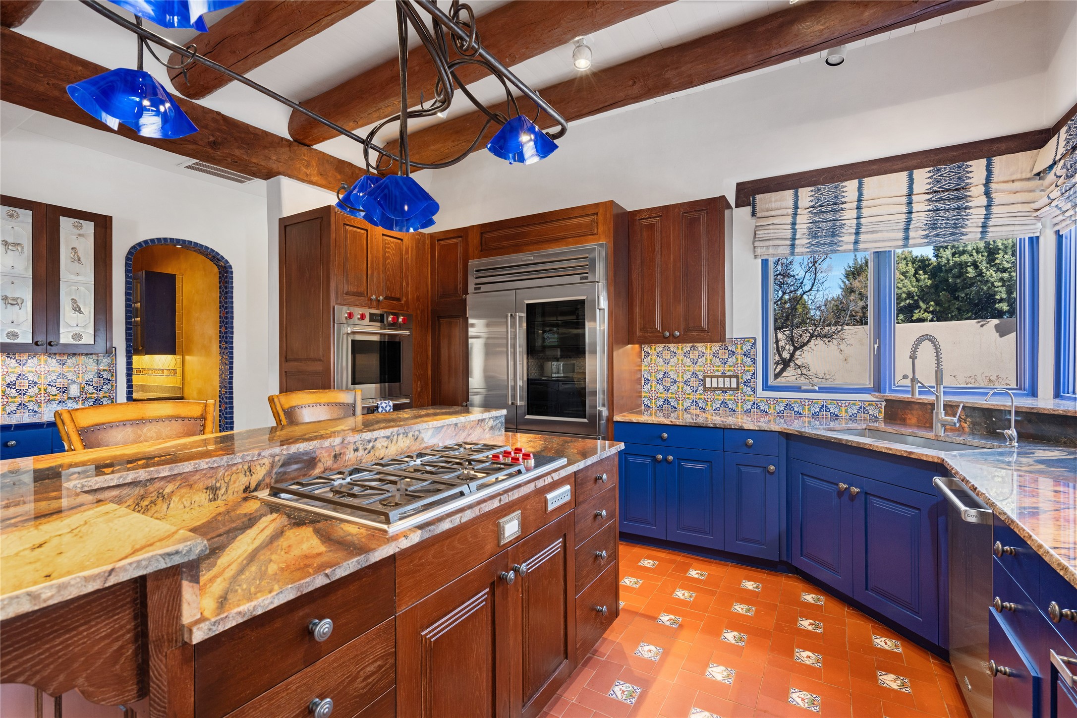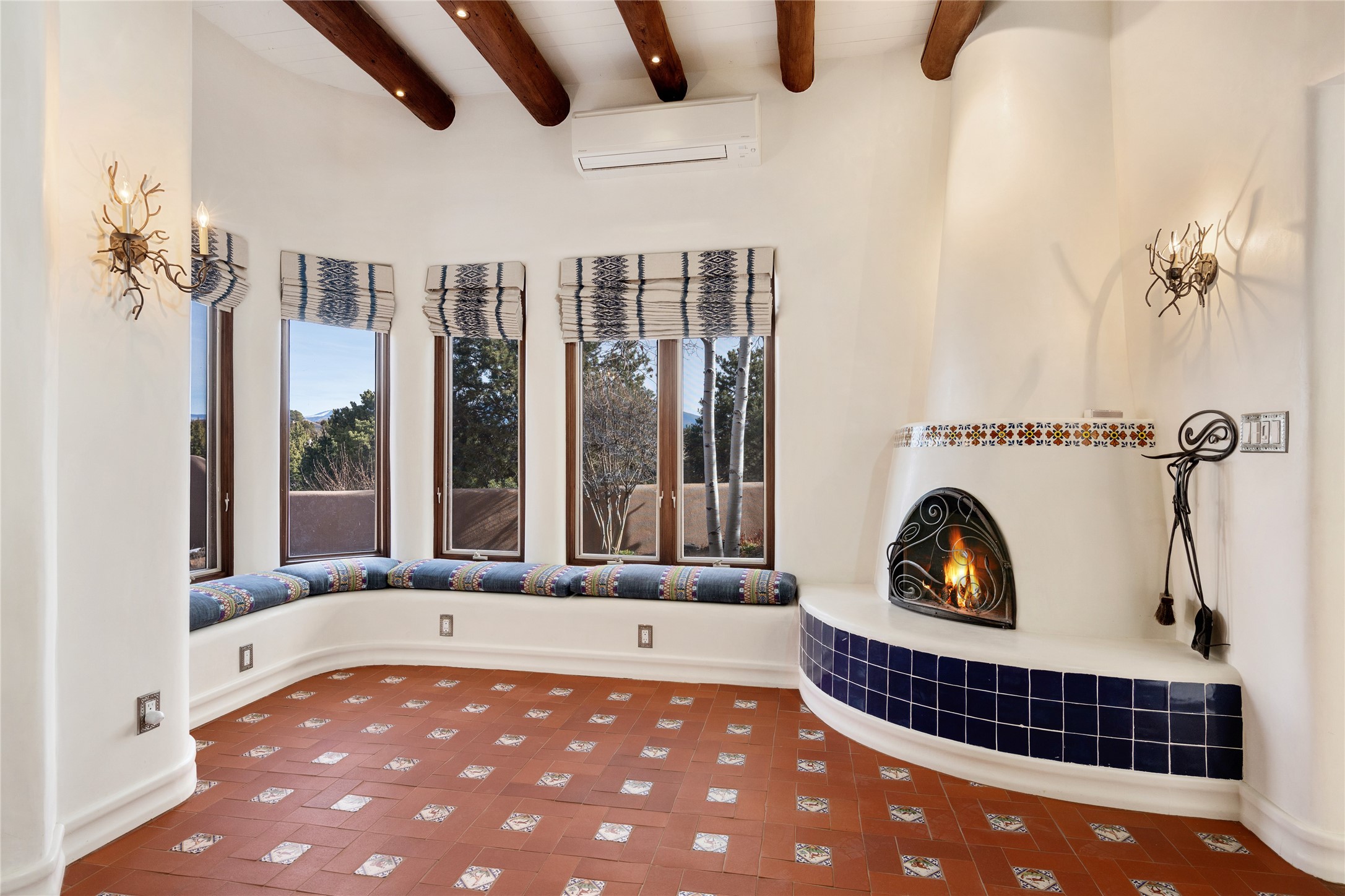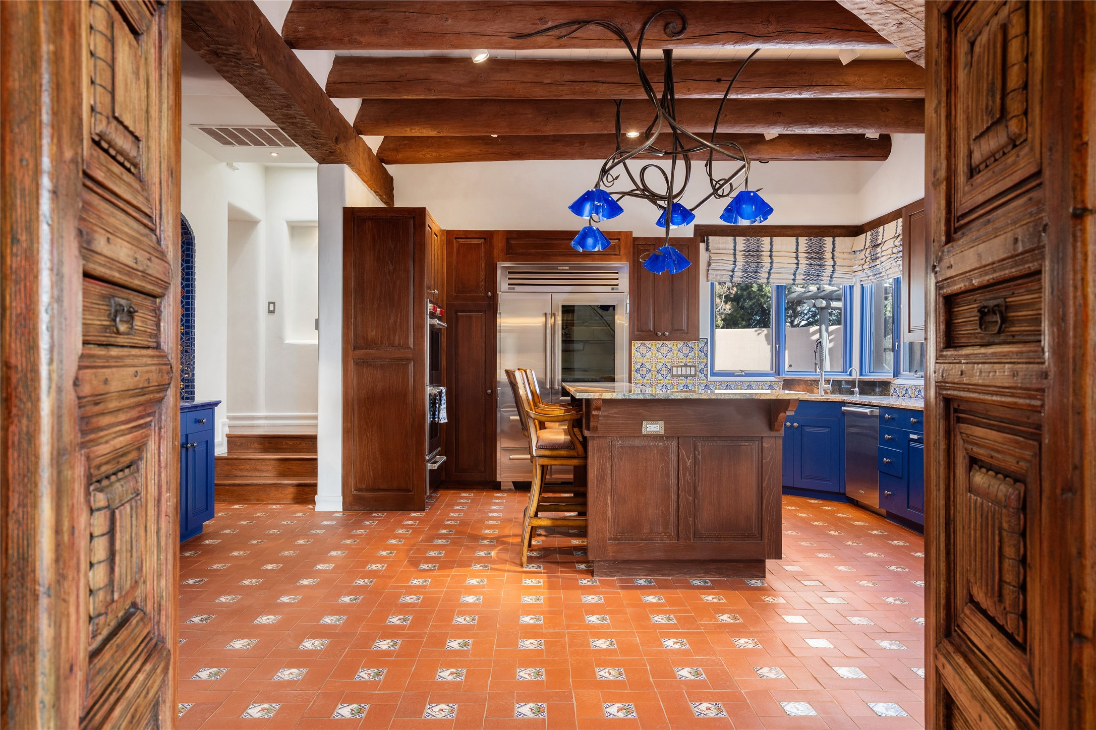 Expansive two bedroom home with guest house and studio. Exceptional views from your front porch and broad portal and large private back yard area perfect for entertaining. 230 square foot lap pool and hot tub for relaxing or entertaining. The main house has a grand foyer ready for art work with a back door showcasing the rear portal and back yard. The large kitchen has plenty of cabinet space, a butlers pantry, quartz counter tops, Wolf 5 burner stove, Cove Dishwasher, Subzero refrigerator, and a cozy banco/breakfast nook offset by a kiva fire place. Adjacent to the kitchen is a dining room that can easily seat 8 with nice views into the back courtyard and front yard. Down two steps past the office and large great room with fireplace to the massive main suite, full bathroom, soaking tub, two walk-in closets, sitting areas and easy access to the 8' hot tub. Guest house has a full kitchen and full bath. Detached studio ready for your endeavors. 2025 roof update with 5 year limited warranty on labor and materials. Must see this gem. Set up a showing today.