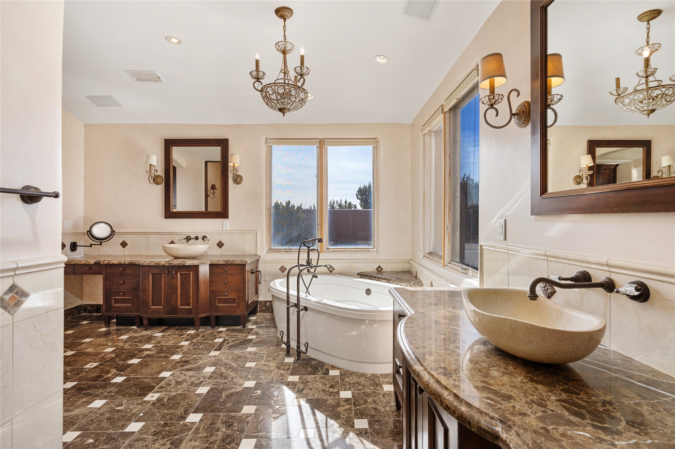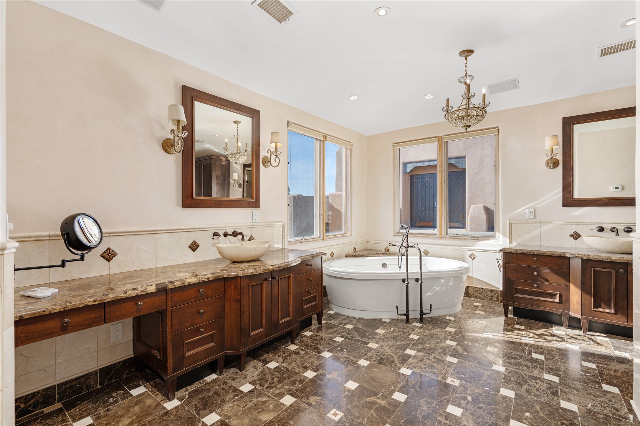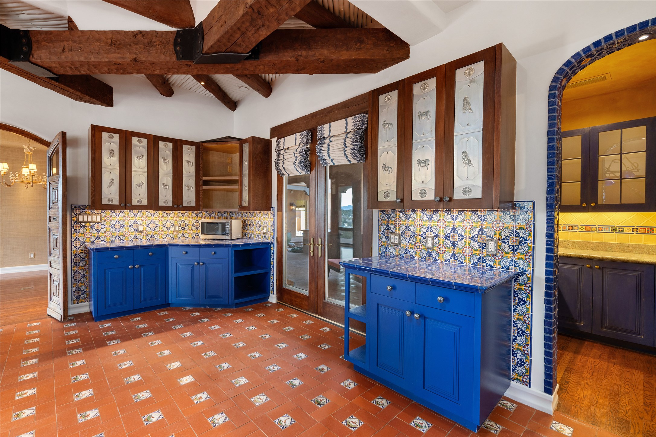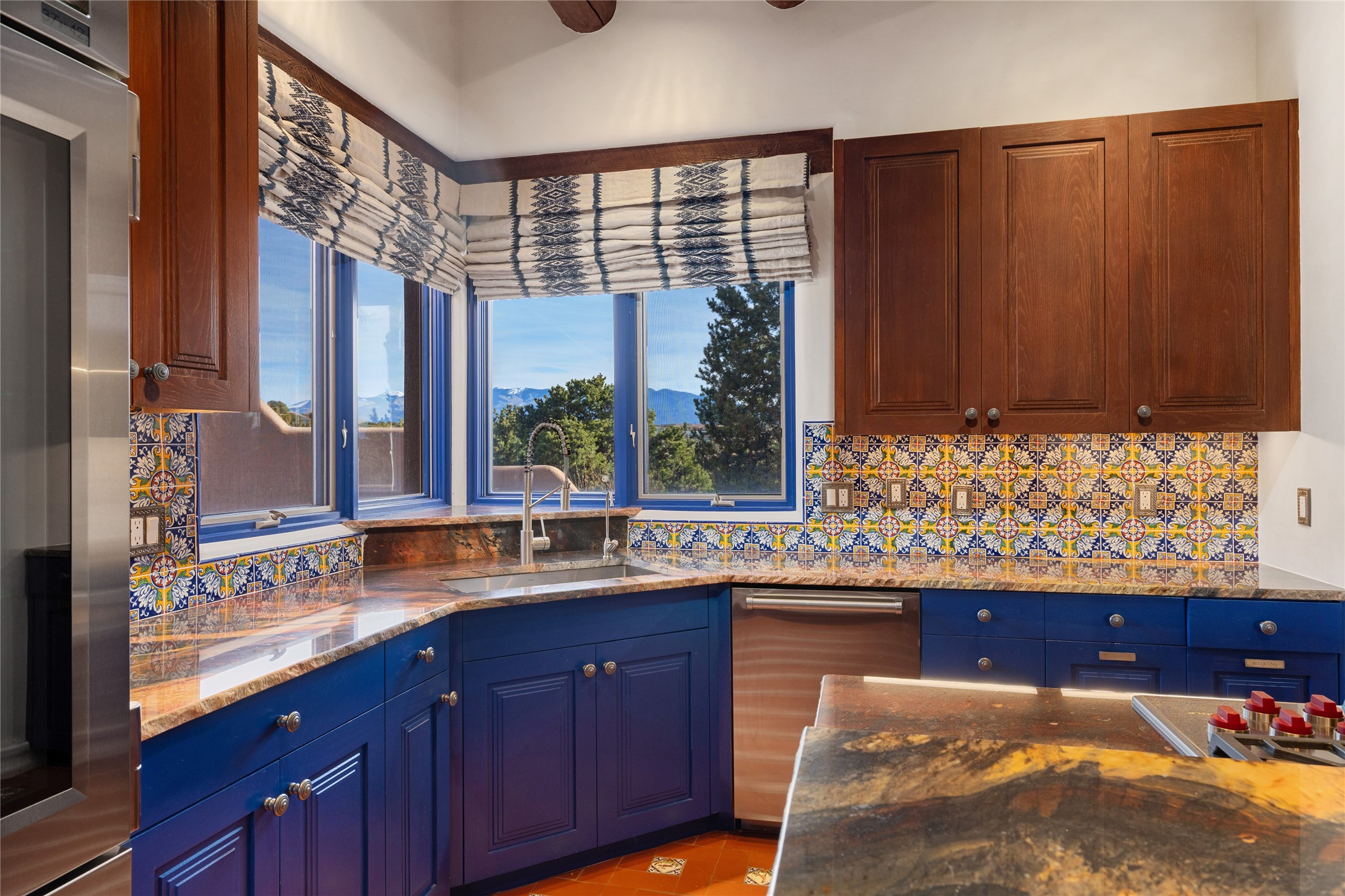 Expansive two bedroom home with guest house and studio. Exceptional views from your front porch and broad portal and large private back yard area perfect for entertaining. 230 square foot lap pool and hot tub for relaxing or entertaining. The main house has a grand foyer ready for art work with a back door showcasing the rear portal and back yard. The large kitchen has plenty of cabinet space, a butlers pantry, quartz counter tops, Wolf 5 burner stove, Cove Dishwasher, Subzero refrigerator, and a cozy banco/breakfast nook offset by a kiva fire place. Adjacent to the kitchen is a dining room that can easily seat 8 with nice views into the back courtyard and front yard. Down two steps past the office and large great room with fireplace to the massive main suite, full bathroom, soaking tub, two walk-in closets, sitting areas and easy access to the 8' hot tub. Guest house has a full kitchen and full bath. Detached studio ready for your endeavors. 2025 roof update with 5 year limited warranty on labor and materials. Must see this gem. Set up a showing today.