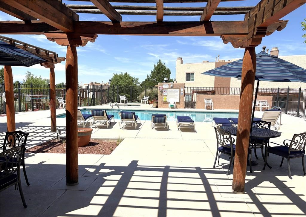 Welcome to the Dos Santos community a lovely town home end unit offering enhanced privacy and beautiful views of the mountains to the east and west. Located next to a greenbelt, this two-bedroom, two-bath home features approximately 950 square feet of well-designed living space, including an open-concept living and dining area with Saltillo tile floors, a wood-burning fireplace, and a kitchen ideal for entertaining. The upstairs includes a primary suite with an en suite bath, a walk-in closet, and attractive window treatments. Outside, the home offers a covered front patio and a fenced yard, with patio furniture included. Residents of Dos Santos enjoy access to a range of amenities, including a heated saltwater pool, hot tub, clubhouse, fitness center with exercise equipment, outdoor entertainment gazebos with gas grills, walking paths, and an expansive dog park. Located just minutes from downtown Santa Fe, close to shopping, St Vincent Hospital and direct access to Santa Fe's 'Rail Trail' for commuting, hiking and biking. The property also offers an easy commute throughout Santa Fe and to Los Alamos. Association fees cover community area maintenance, exterior building and roof maintenance, parking upkeep, recreational facilities, security, as well as water, sewer, and refuse services. E-Z to show.