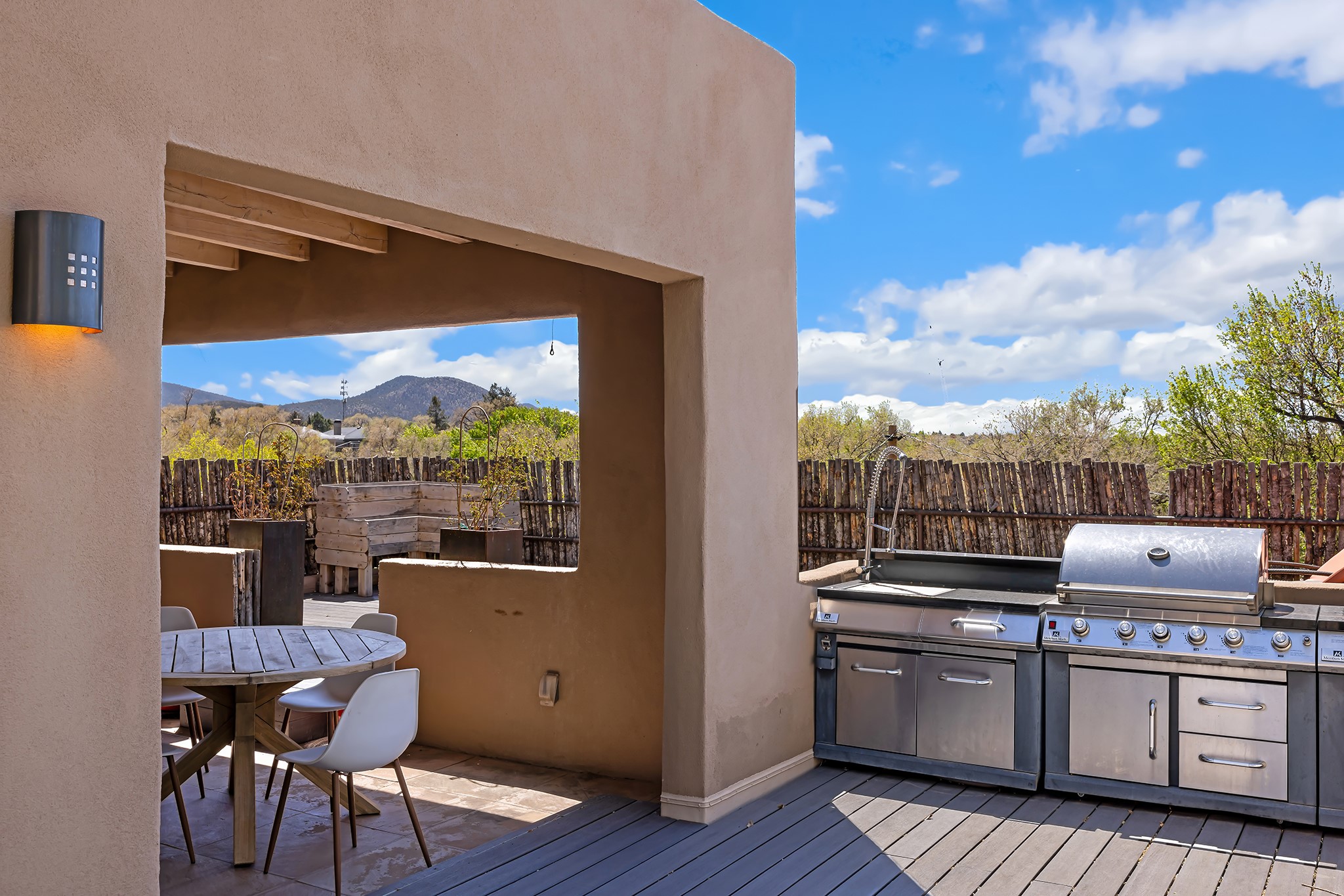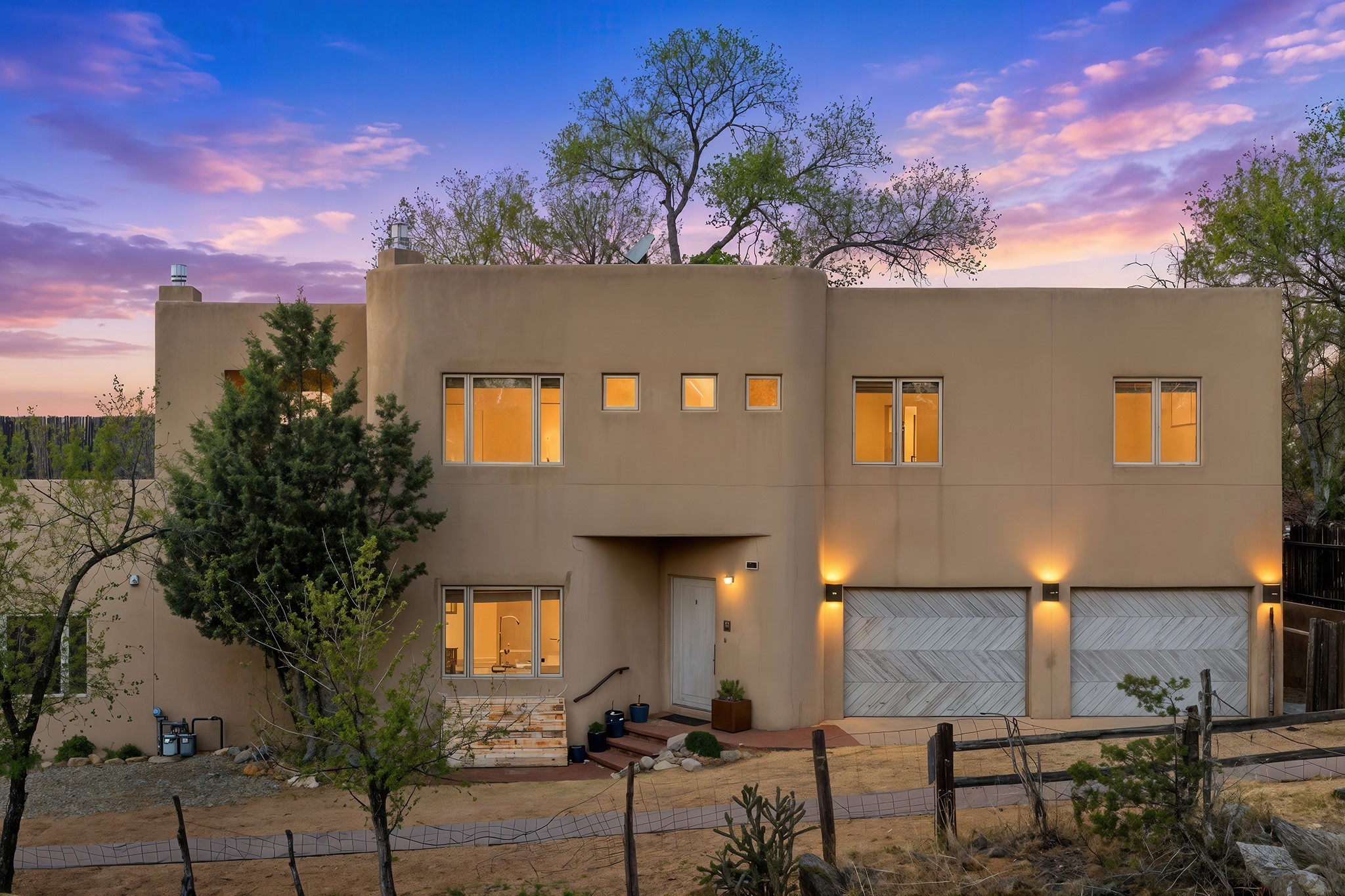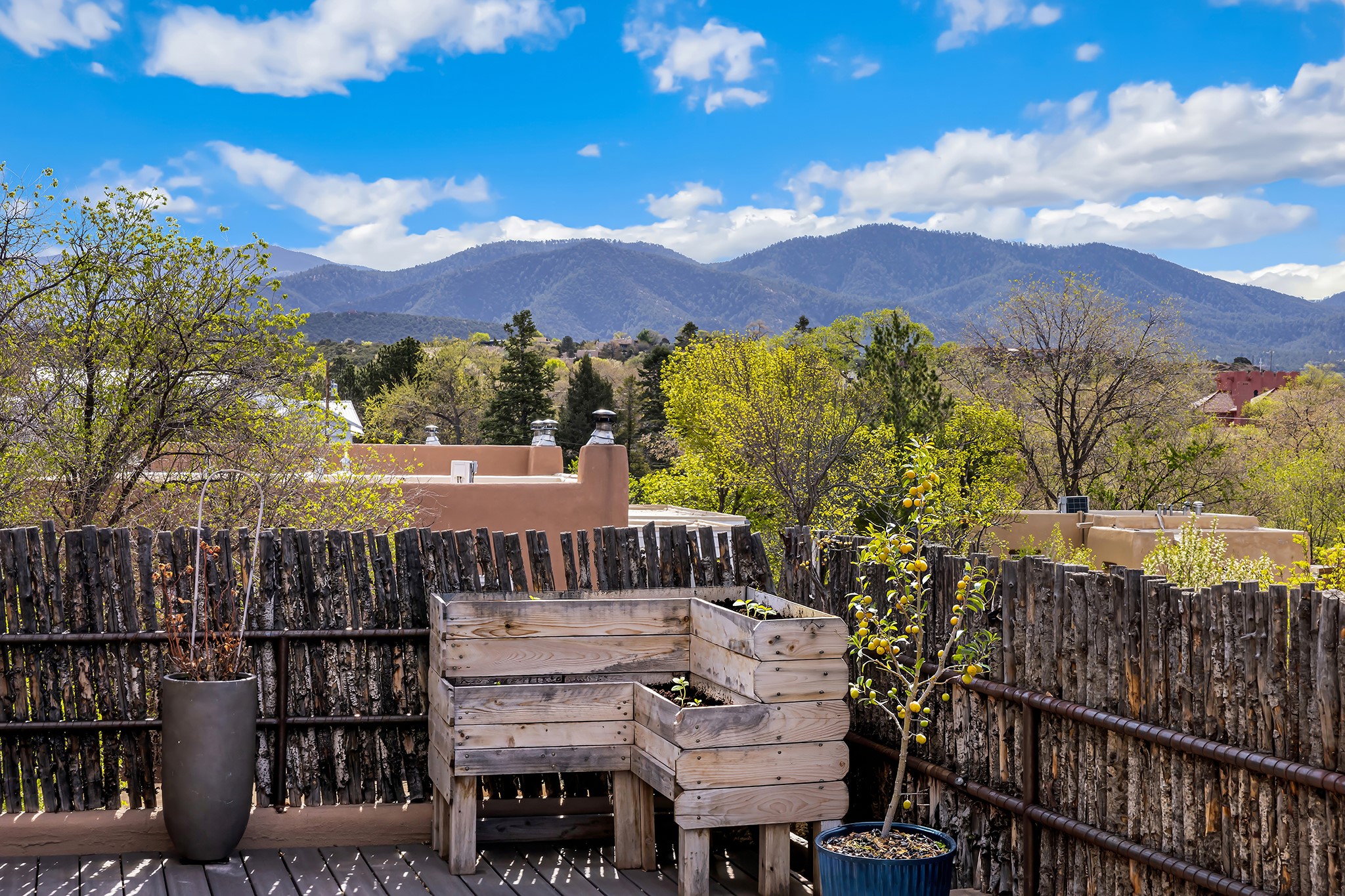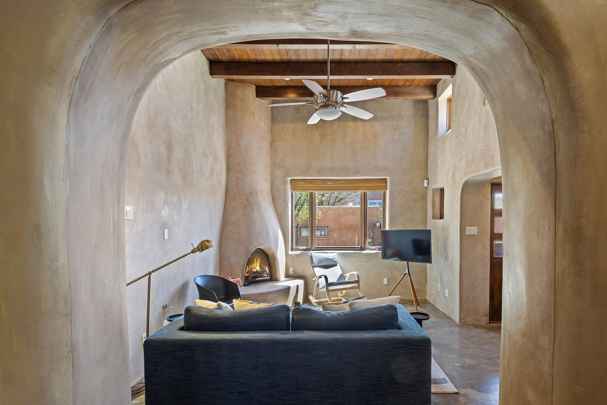 Rarely does a Downtown Santa Fe compound offer this level of versatility, character, and convenience. Just moments from the Historic Santa Fe Plaza, this exceptional property includes a 3-bedroom, 3-bath main residence, an attached 2-bedroom, 2-bath casita, and a coveted 2-car garage with oversized storage space -- a true luxury in the downtown area. The main residence offers a contemporary Pueblo feel with stained concrete floors, kiva fireplaces, and all bedrooms upstairs. A spacious, partially covered view deck with mountain vistas, city lights, sunset skies, and gardening beds creates an ideal setting for entertaining or unwinding. The separately metered casita, with high ceilings and generous space, is perfect for guests, extended family, or rental income. Close to renowned restaurants, art galleries, and boutique shopping, this rare in-town property is well suited as a primary residence, second home, or investment opportunity. Potential assumable financing with a 3.5% interest rate further enhances the offering.