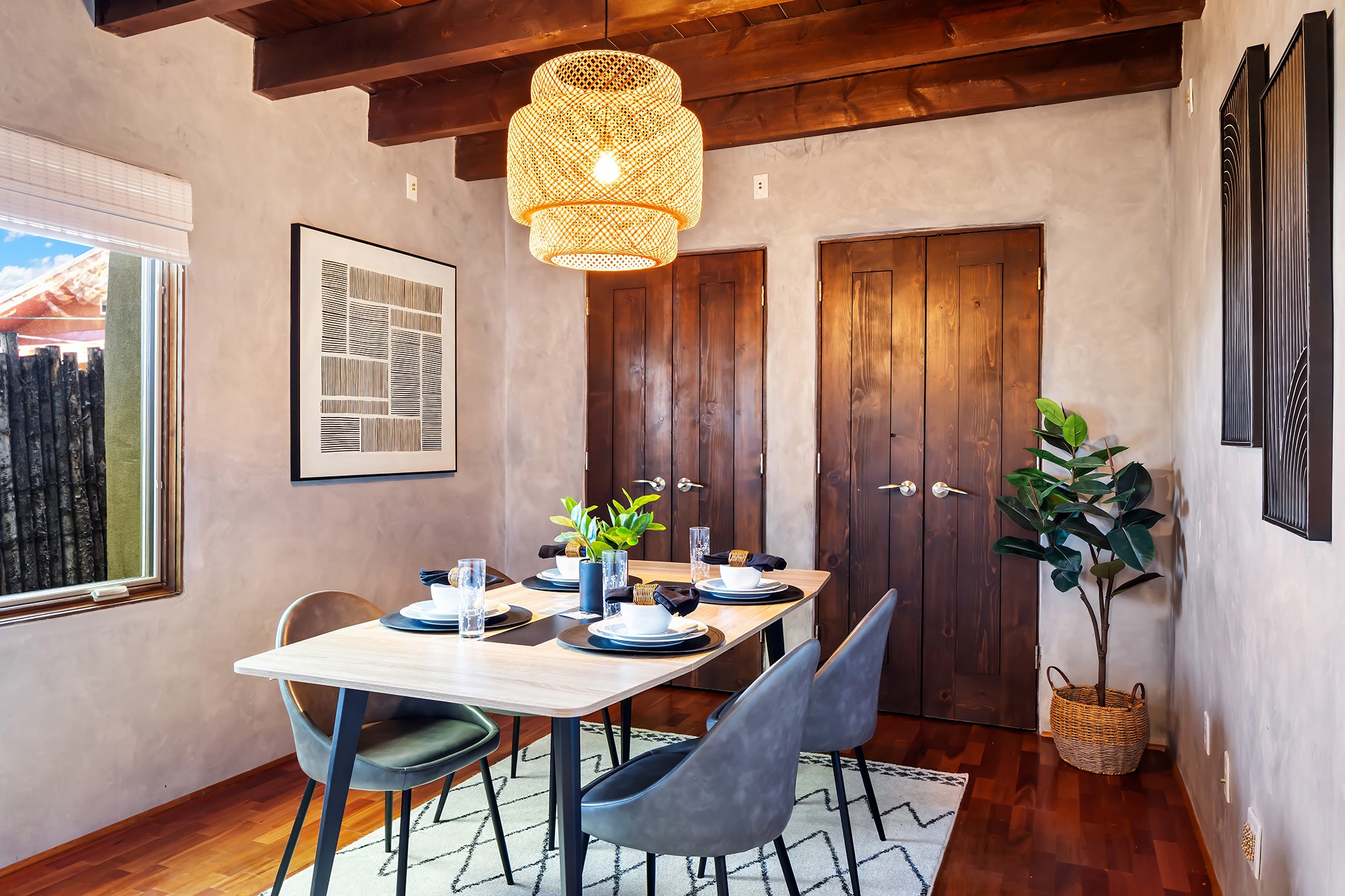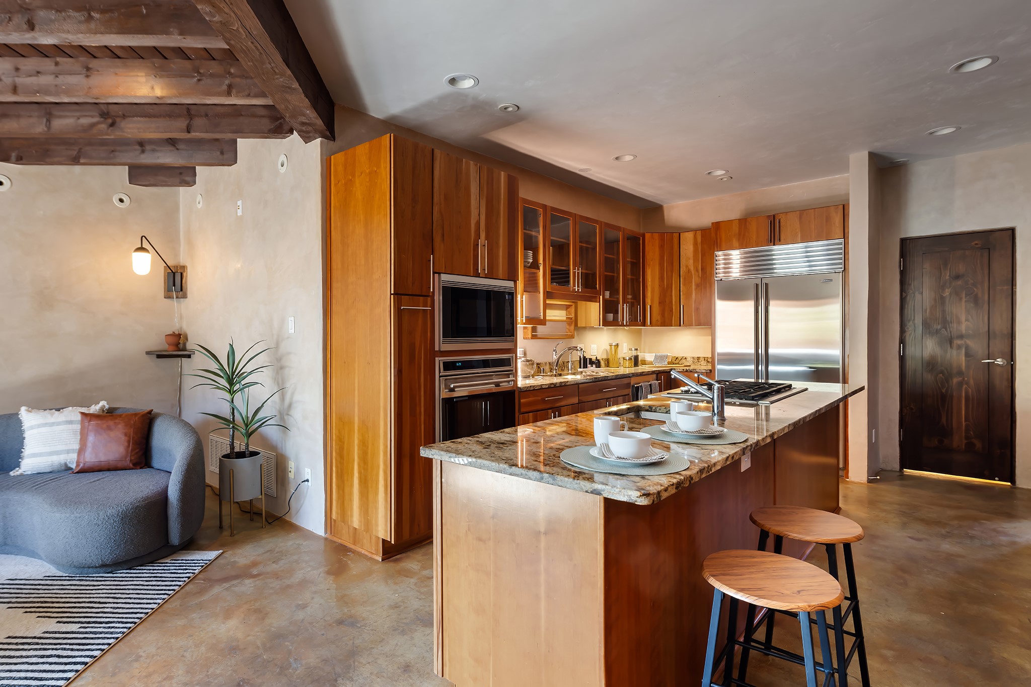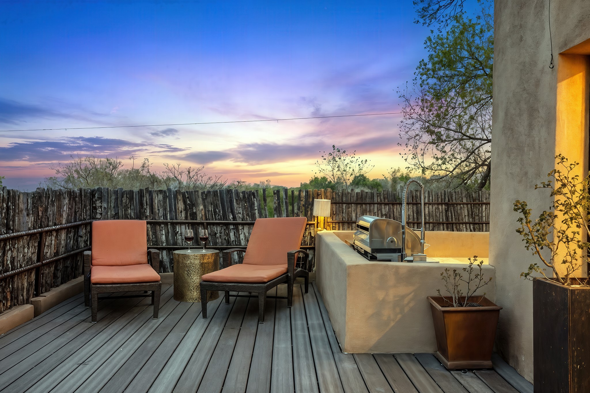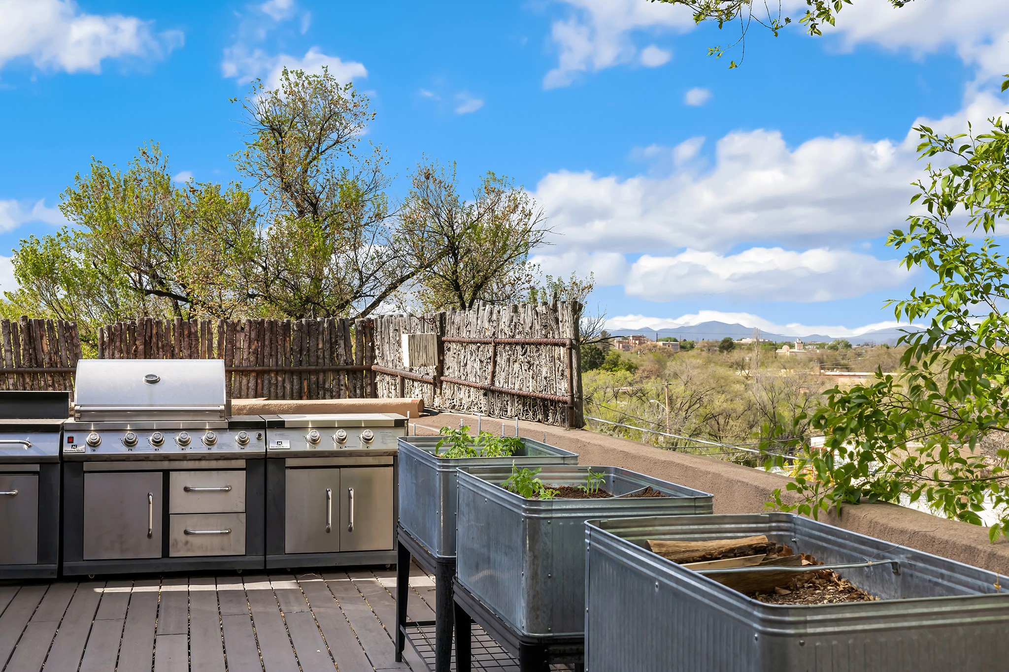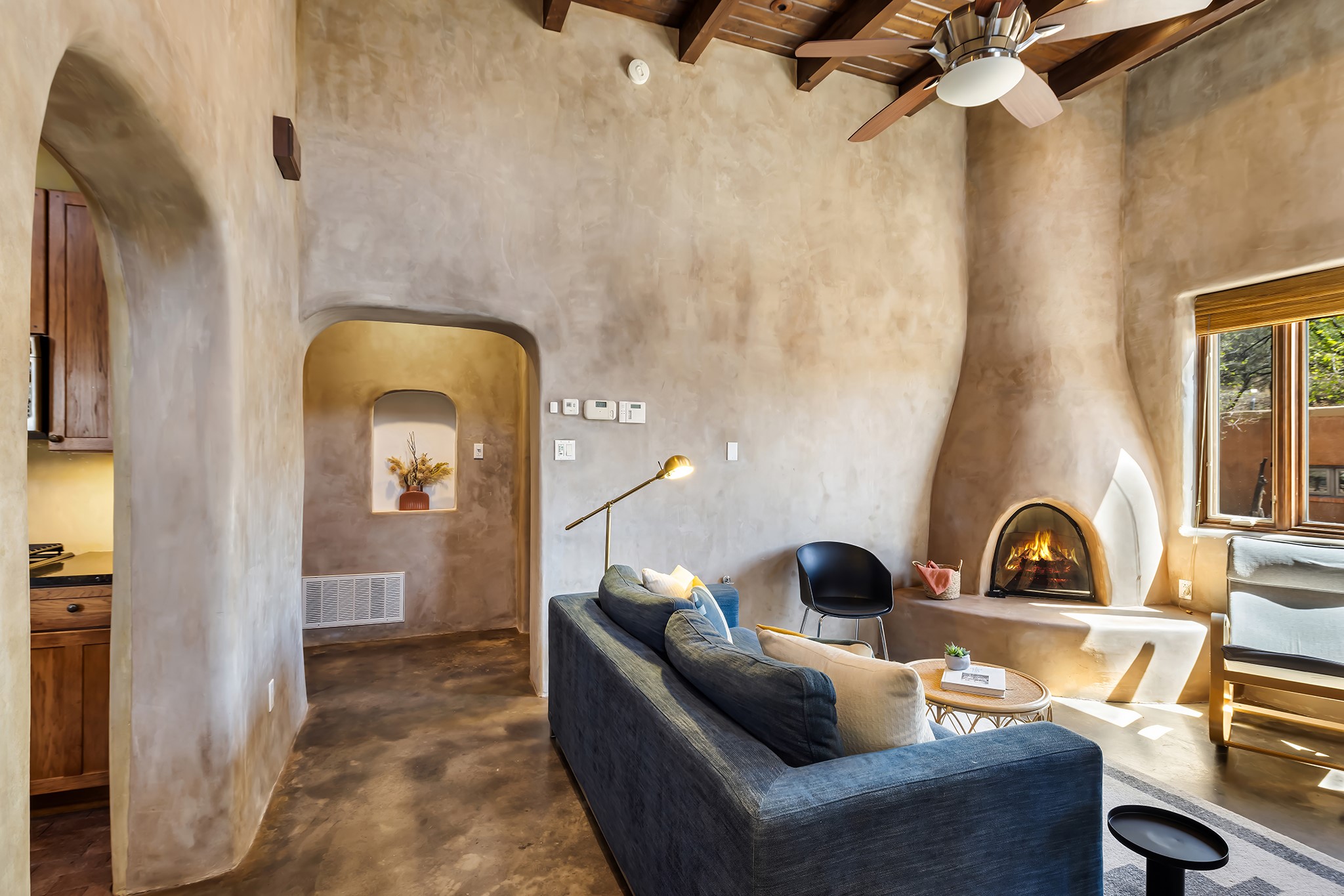 Rarely does a Downtown Santa Fe compound offer this level of versatility, character, and convenience. Just moments from the Historic Santa Fe Plaza, this exceptional property includes a 3-bedroom, 3-bath main residence, an attached 2-bedroom, 2-bath casita, and a coveted 2-car garage with oversized storage space -- a true luxury in the downtown area. The main residence offers a contemporary Pueblo feel with stained concrete floors, kiva fireplaces, and all bedrooms upstairs. A spacious, partially covered view deck with mountain vistas, city lights, sunset skies, and gardening beds creates an ideal setting for entertaining or unwinding. The separately metered casita, with high ceilings and generous space, is perfect for guests, extended family, or rental income. Close to renowned restaurants, art galleries, and boutique shopping, this rare in-town property is well suited as a primary residence, second home, or investment opportunity. Potential assumable financing with a 3.5% interest rate further enhances the offering.