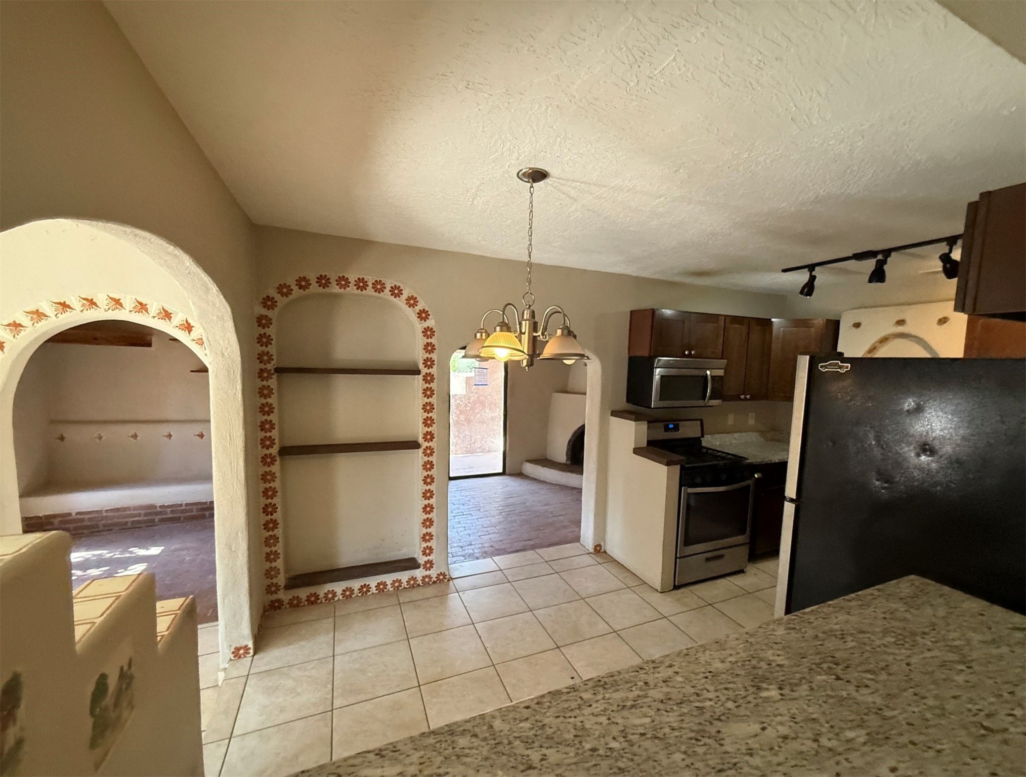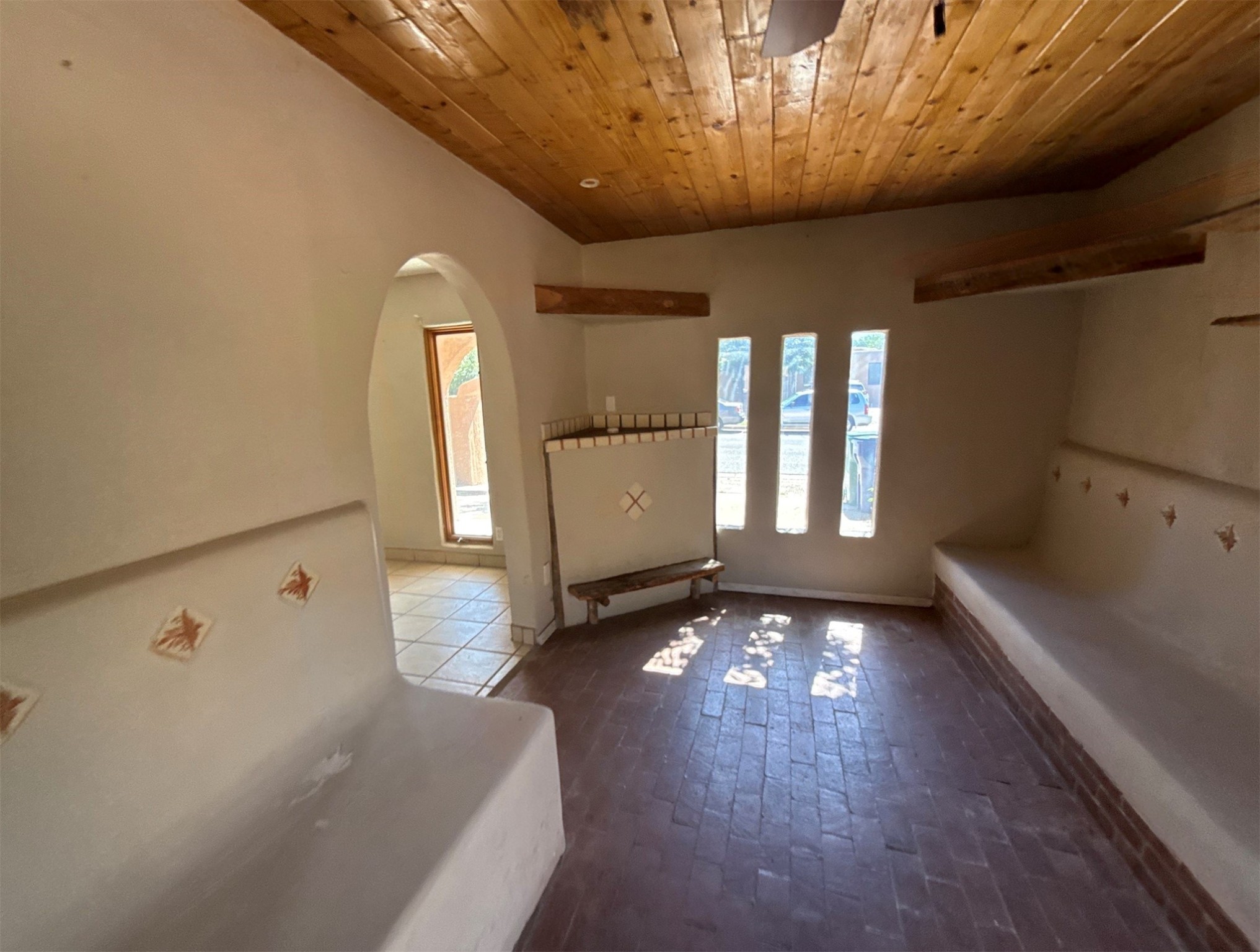 Authentic Pueblo-style home in Santa Fe showcasing traditional Southwestern design, including wood vigas and a classic kiva fireplace. This two-story residence offers 3 bedrooms and 2 baths with warmAuthentic Pueblo-style home in Santa Fe showcasing traditional Southwestern design, including wood vigas and a classic kiva fireplace. This two-story residence offers 3 bedrooms and 2 baths with warm architectural character and functional living spaces. A large garage/workshop provides excellent storage or workspace, complemented by ample street parking for guests. Owner-occupant buyers only for the first 20 days of marketing. Buyer must sign an owner-occupancy certification.