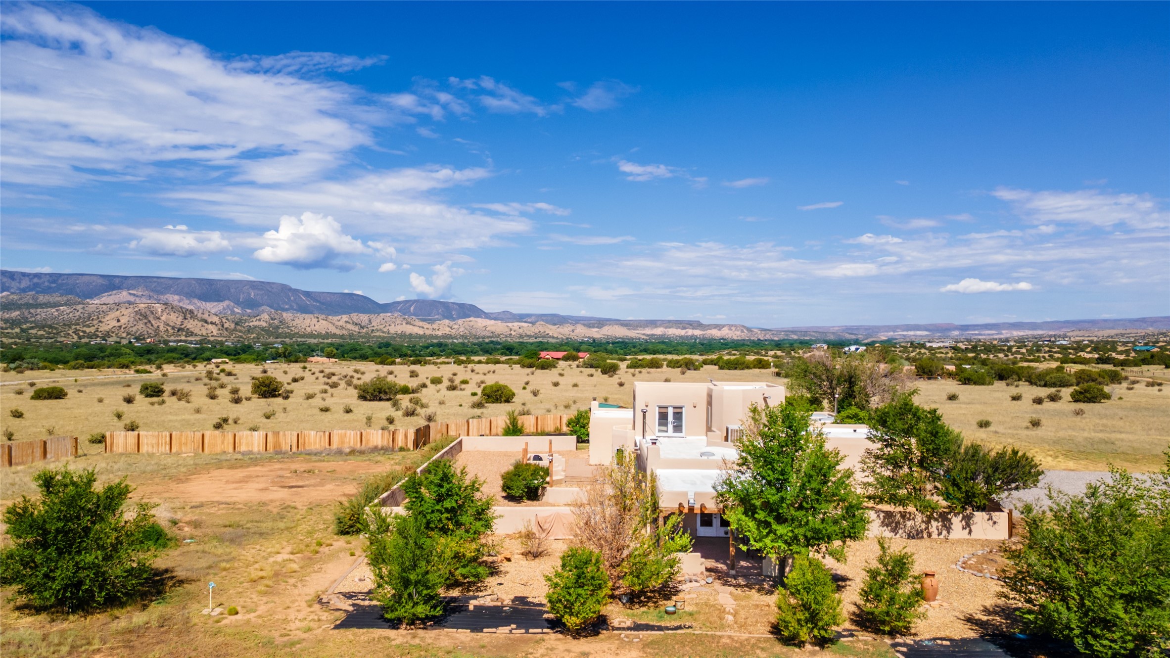Ideally located for an easy commute to Espanola, Los Alamos and Santa Fe, this classic New Mexico-style home in the Mesa's de Medanales subdivision with No HOA! offers timeless Southwestern character, sweeping mountain views, and exceptional indoor-outdoor living. Set on five peaceful acres with horses welcome and surrounded by open vistas in every direction, the property provides an ideal balance of privacy, space, and convenience just minutes from Abiqui Lake, national forest, and Ojo Caliente Mineral Springs and Spa. At just under 4,000 square feet this mostly single level home features three spacious ensuite bedrooms, a fourth bedroom and a fourth bathroom, making it well suited for multi-generational living, guests, or flexible lifestyle needs. The main-level fourth bedroom is a large, light-filled space complete with a wood stove and cedar closet, offering excellent versatility as a guest suite, studio, or secondary living area. Throughout the home, classic Southwestern details create warmth and authenticity, including brick floors, beamed ceilings, nichos, radiant heat, multiple wood stoves, and three traditional kiva fireplaces. A generous eat-in kitchen serves as the heart of the home and opens to a formal dining room, while a dedicated office or flex space supports remote work, hobbies, or creative pursuits. All bathrooms have been tastefully remodeled with custom finishes and walk-in showers, enhancing both comfort and luxury. Outdoor living is a true highlight, with multiple serene courtyards and expansive exterior spaces designed for year-round enjoyment. A substantial covered portal with a traditional kiva fireplace invites relaxing evenings, entertaining, or simply taking in the remarkable high-desert surroundings. Recent updates add peace of mind and modern convenience, including remodeled bathrooms throughout, new stucco, updated electrical and lighting, fresh driveway gravel, security system and a water filtration and softener system.