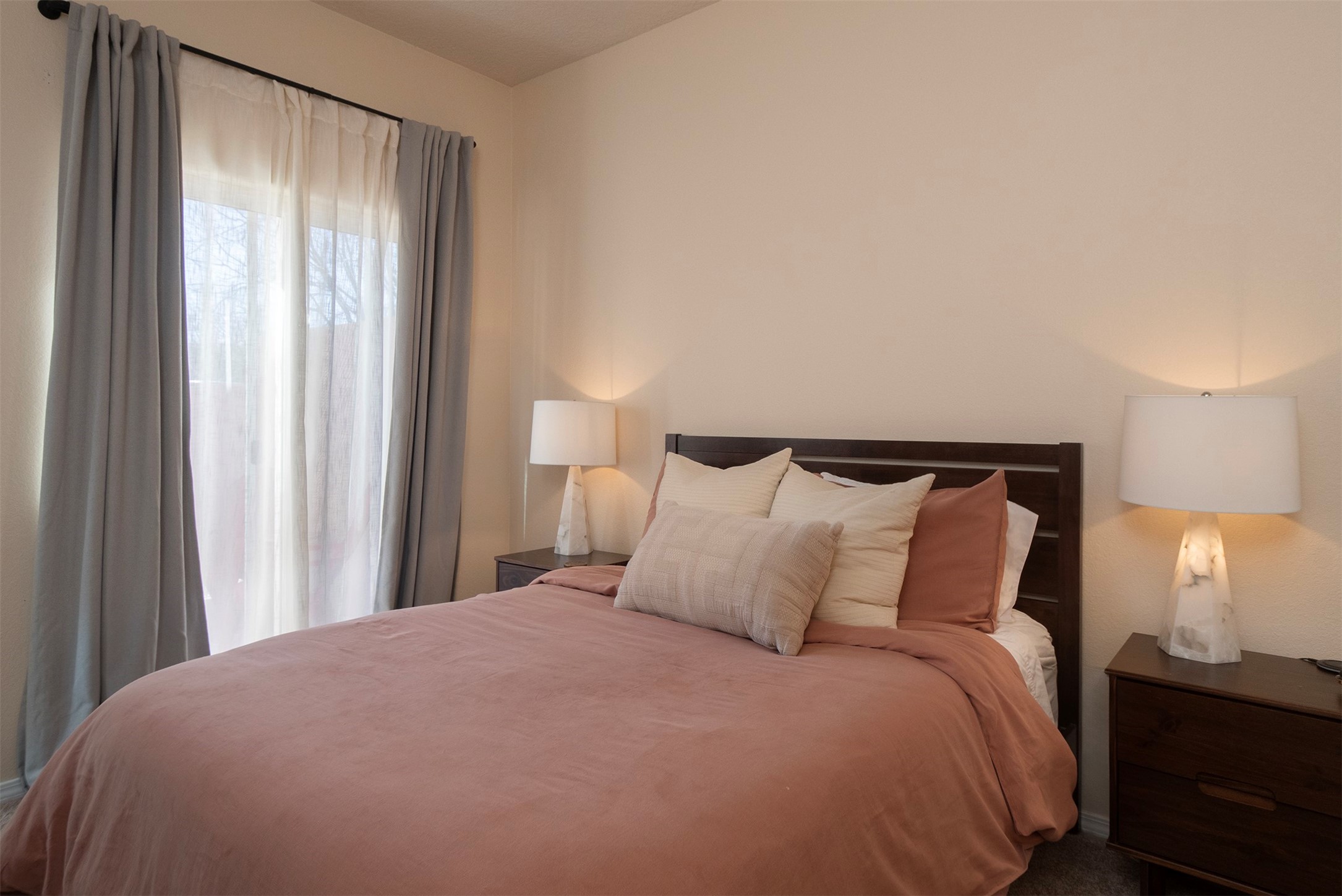 RANCHOS SANTOS MEDITERRANEAN MODERN. Modern Living in Ranchos Santos Condos of Santa Fe. Tucked away on a cul-de-sac, this Spanish Mediterranean style 2 Bed, 2 Bath, 2 Car garage condo has a convenient and beautiful lifestyle with nearby conveniences to grocery stores, restaurants, and shopping centers. This move-in ready two floor plan features with 18' ceilings in the Living Room that give an elevated and airy feel to the whole space. Great kitchen with modern appliances, wood cabinetry, matte black hardware, solid countertops. Open floor-plan with a first floor Bedroom Suite with private, enclosed patio, en-suite bath with separate shower, soaking tub and walk-in-closet. Upstairs is a second bedroom, full bath, laundry room and a fantastic open loft. The large loft space is ideal for home office, flex and remote workers space, - ideal for office, yoga workout area, or second living area. The garage offers great space for storage. Features include refrigerated air conditioning, 2 car direct entry garage, solid surface kitchen countertops, upgraded cabinets, Dish Washer, and Range, microwave, tile flooring, ceiling fan. Built in 2009 by Centex Homes.