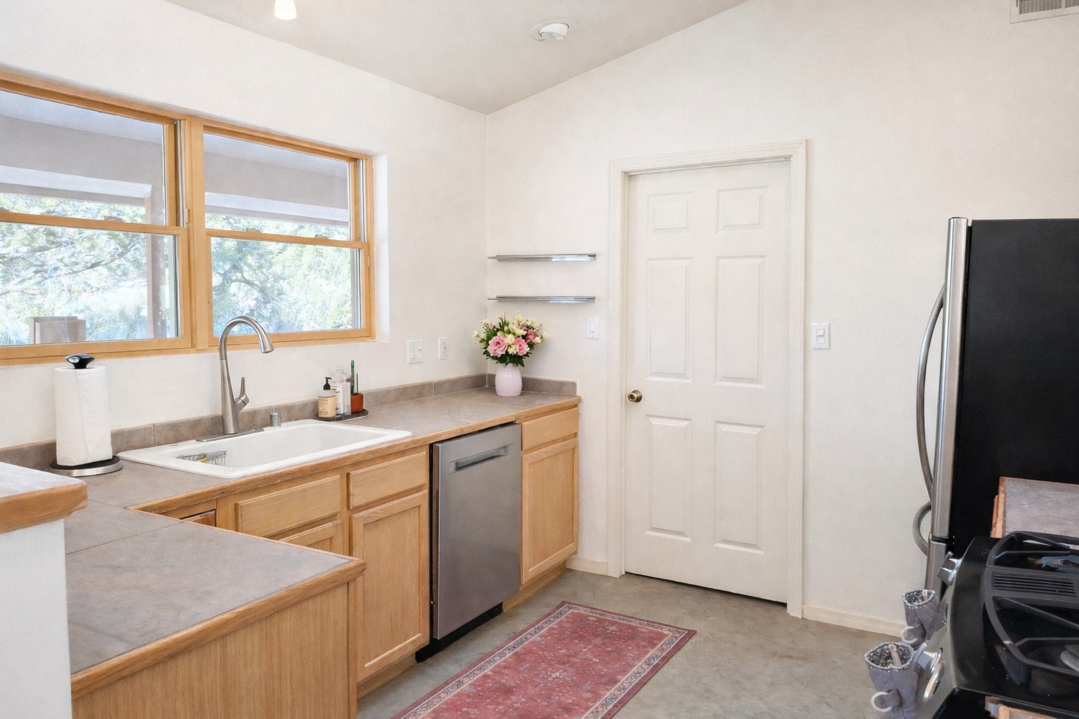 Escape to this enchanting 3-bedroom, 2-bathroom country retreat on 2.6 private acres in Lower Canoncito, just 20 minutes from the Historic Santa Fe Plaza. This sanctuary is defined by its dramatic rock formations and sweeping 360-degree views, offering a rare combination of absolute privacy and immediate access to the 4,100-acre Eldorado Preserve and the Galisteo Basin.The home's interior features an open-concept living area under soaring cathedral ceilings, leading to a large, fully fenced front perennial garden and a back portal with unobstructed "forever views" and no other properties in sight. The layout emphasizes privacy and functionality; the Owner's Suite, complete with an ensuite bathroom and walk-in closet, is situated away from the guest wing. A refreshed gallery kitchen offers ample counter space and a spacious walk-in pantry, complemented by new paint and a brand-new dish washing machine.Infrastructure and lifestyle upgrades are at the forefront of this property. A state-of-the-art NAVIEN system provides both instant hot water and efficient radiant heat, while Starlink is already installed for high-speed connectivity. The land is perfectly equipped for a homestead lifestyle, featuring a massive new livestock corral with a 10x12 barn shed and attached chicken coop. The property is fully fenced with strategic entry gates at the far end for easy access. To support the lush surroundings and water conservancy, the home utilizes a shared 12,000 gallon well with a brand new well pump and 2,000-gallon cistern/grey water systems connected to the roof of the home for rainwater catchment. This is the ultimate refuge for an artist, writer, or family to enjoy the enchanting open skies and inspiration of Northern New Mexico.