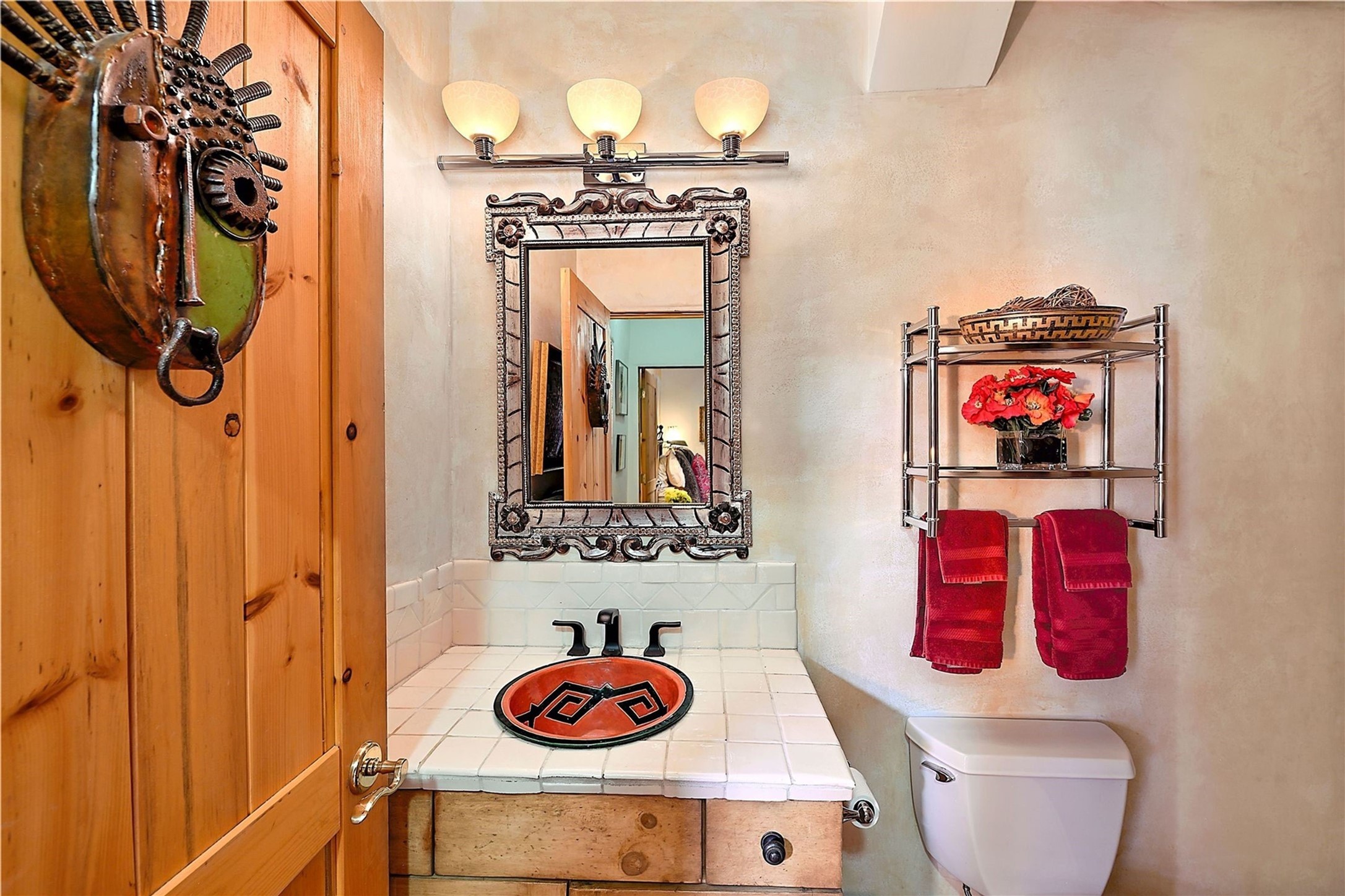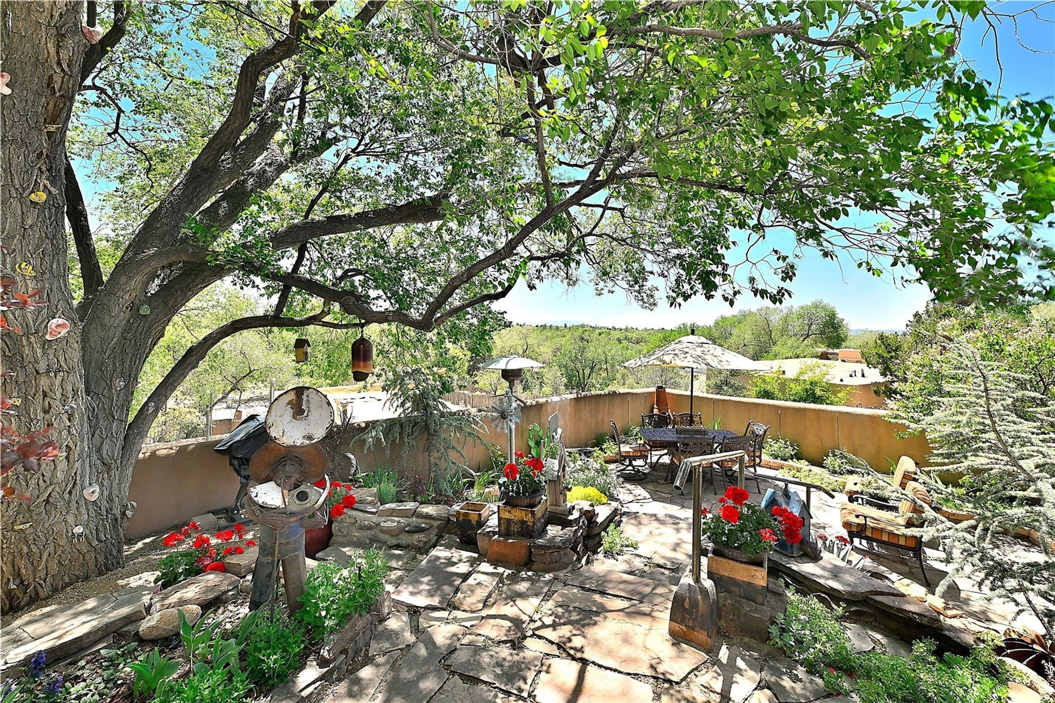 This historic and charming adobe split level home is nestled in the hills of Santa Fe's historic East Side, set just above Palace Avenue, offering views and walking distance to both Canyon Road and the historic Plaza. Portions of the home reflect its 100-year history. The kitchen is a dream for any cook; it has been updated with granite countertops, a generous gas range, and high-end appliances. Wide plank pine floors run through the kitchen, dining and living area. The living room features a high-pitched ceiling with exposed vigas and beams, abundant natural light, plaster walls and a custom, wood-burning fireplace. The primary bedroom located downstairs features a pitched ceiling, cobblestone floors, an en suite bathroom, vigas and a loft that is well suited for a reading nook or home office. The guest bedroom is nicely separated from the primary bedroom and living area to allow for comfort and privacy with a full bathroom nearby. A set of stairs takes you down to an additional bedroom/den/family room with cobblestone floors and a wood burning fireplace. The two fireplaces and baseboard heat will keep you warm as you relax and enjoy the views of town. The Corten steel roof adds durability and reflects the quality of this distinctive home. This three-bedroom, two bath home, plus office is 1,807 square feet. Relax, dine, and enjoy mountain views on the extensive tiered outdoor patio that has been beautifully landscaped. Convenient access to dining, galleries, and your Santa Fe lifestyle! Short-term rental possibility, please verify. Private showings available.