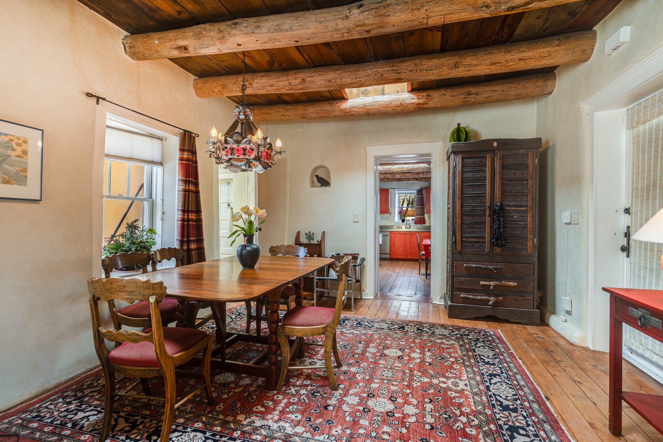 Historically Significant Home in The Don Gaspar Historic District! Step through the gate and discover a piece of Santa Fe history waiting to become your next chapter. This enchanting two-bedroom residence captures the authentic spirit of the Southwest. Traditional vigas stretch across the ceiling, skylights paint golden patterns across wide plank wood flooring, deep window sills hint at adobe behind the polished plaster walls, and a central wood burning fireplace summons you to sit and stay a while. The thoughtfully updated kitchen and bathroom blend modern convenience with timeless character, honoring the home's heritage while embracing contemporary comfort. Every corner whispers stories of generations past. Outside, a private courtyard beckons with sturdy brick pavers and tall walls creating your personal sanctuary. With 2 off-street parking spots and PV solar, this jewel nestled into a corner lot in the charming South Capital neighborhood, this retreat offers the peaceful solitude you crave while keeping downtown's galleries, restaurants, and cultural treasures within easy reach. This is more than a home; it is a lifestyle rooted in artistic tradition and Southwestern soul.